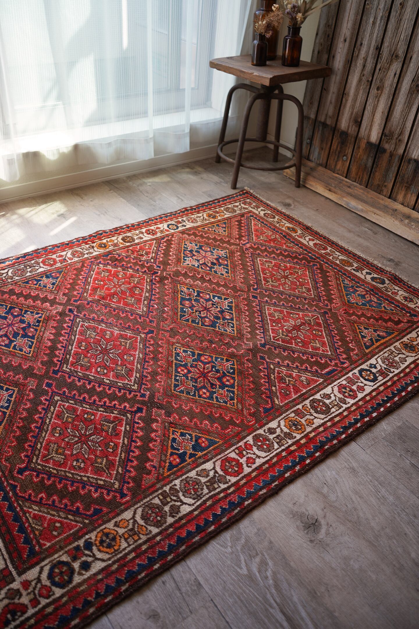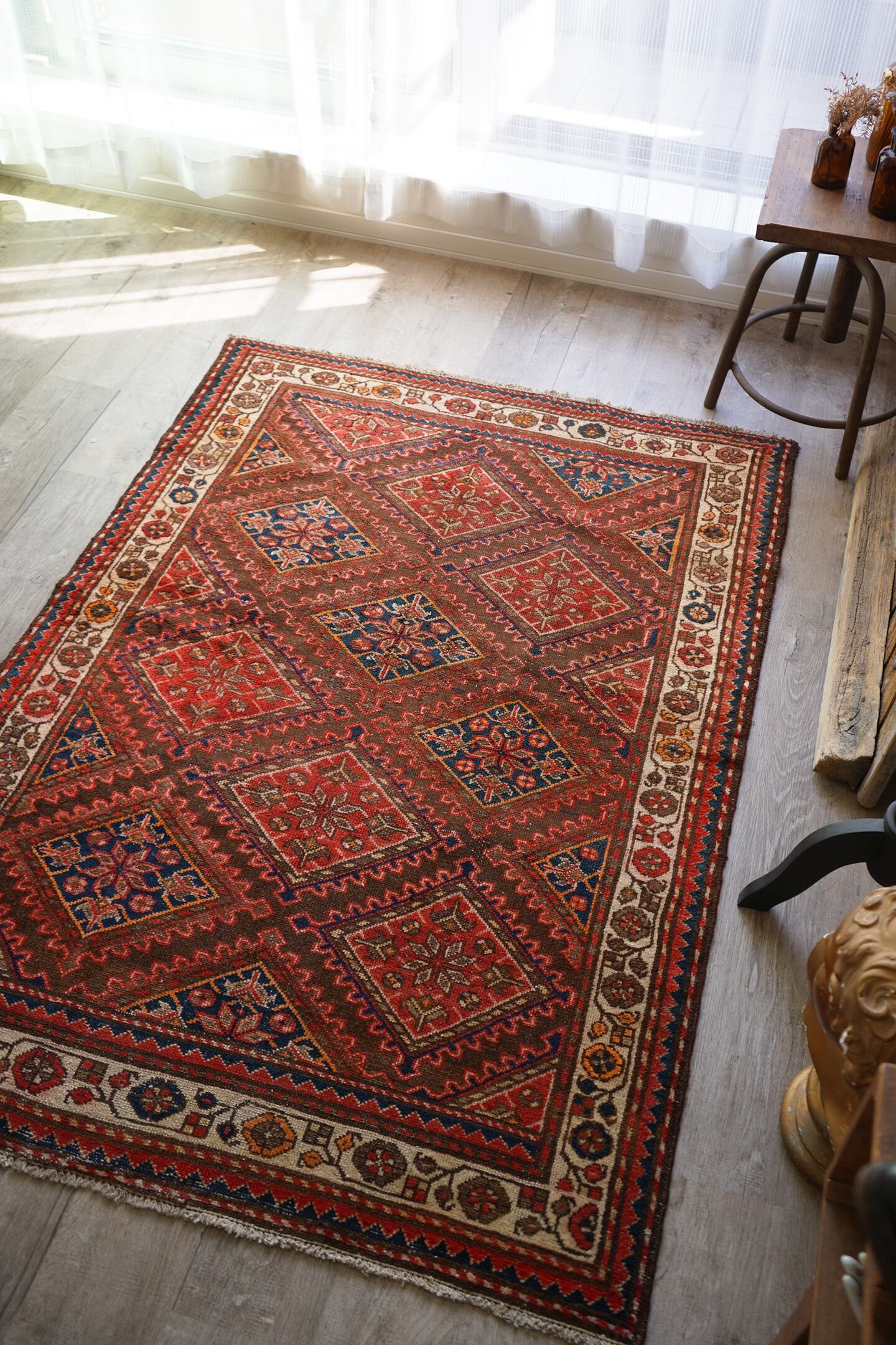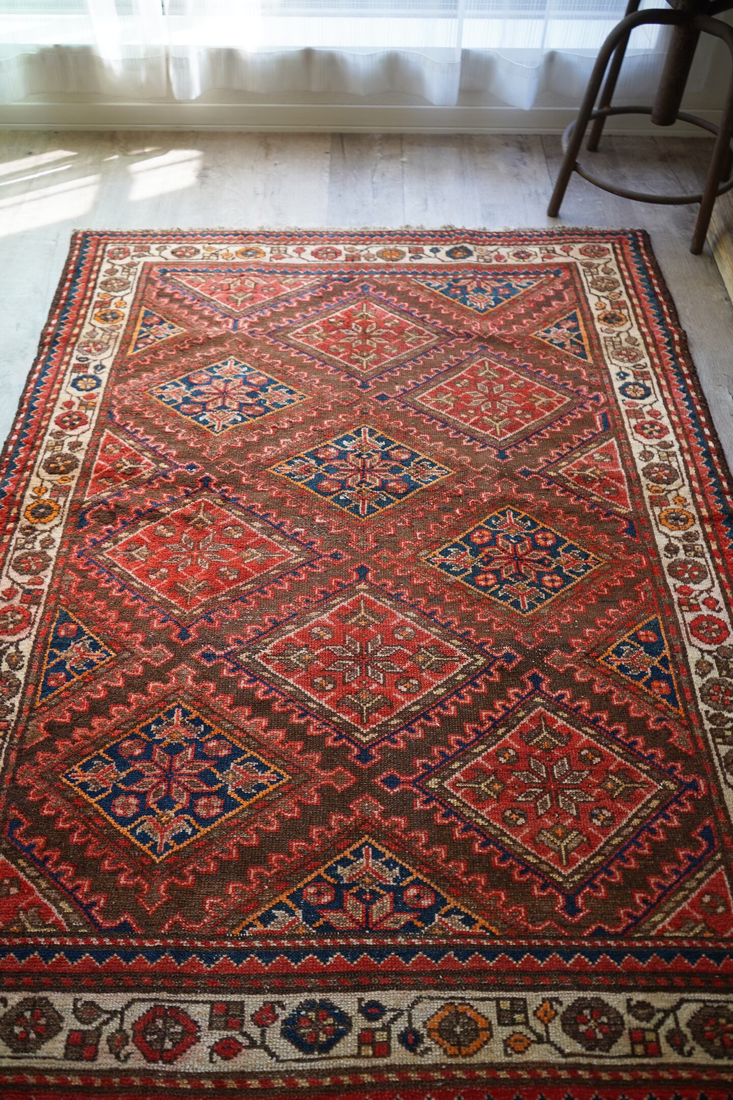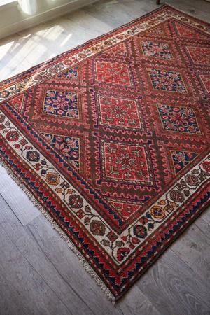 イラン西部地域に位置するマラーイェルで織られたセミアンティークラグ。赤とネイビーの菱形紋様が美しい配列で織り込まれたデザイン。経年によりパイルも低くなっており、サラサラと乾いた質感ですのです。目立った補修跡はなく、コンディションも良好。1人掛け用のラウンジチェアの下に敷いたりしても素敵そうですね♫
