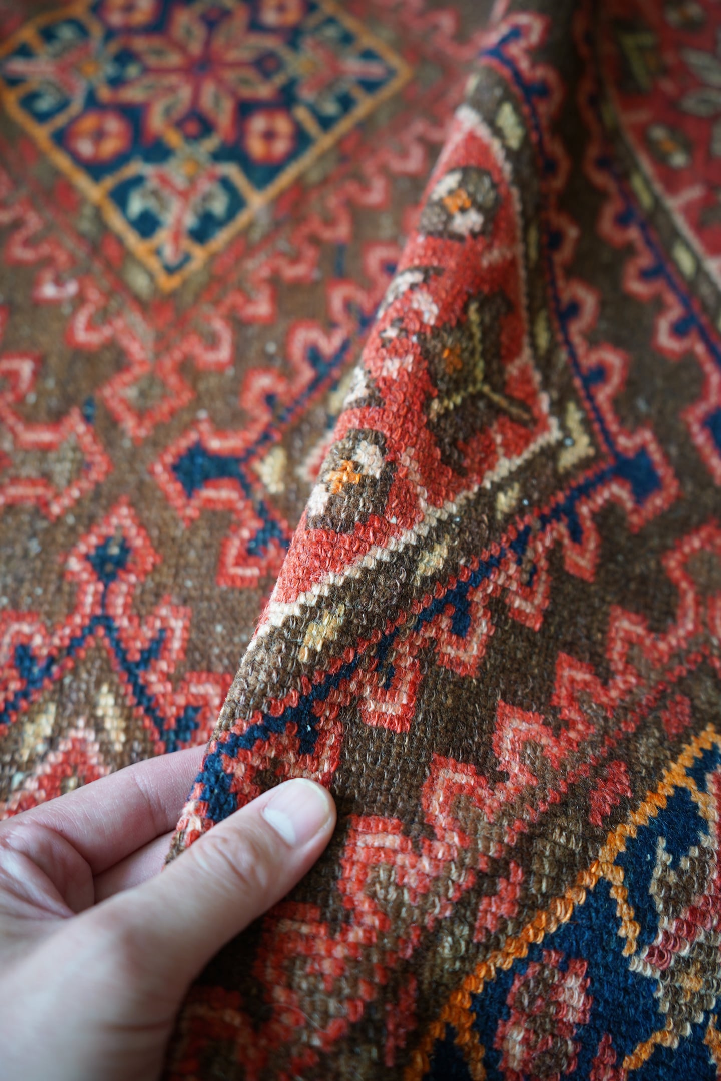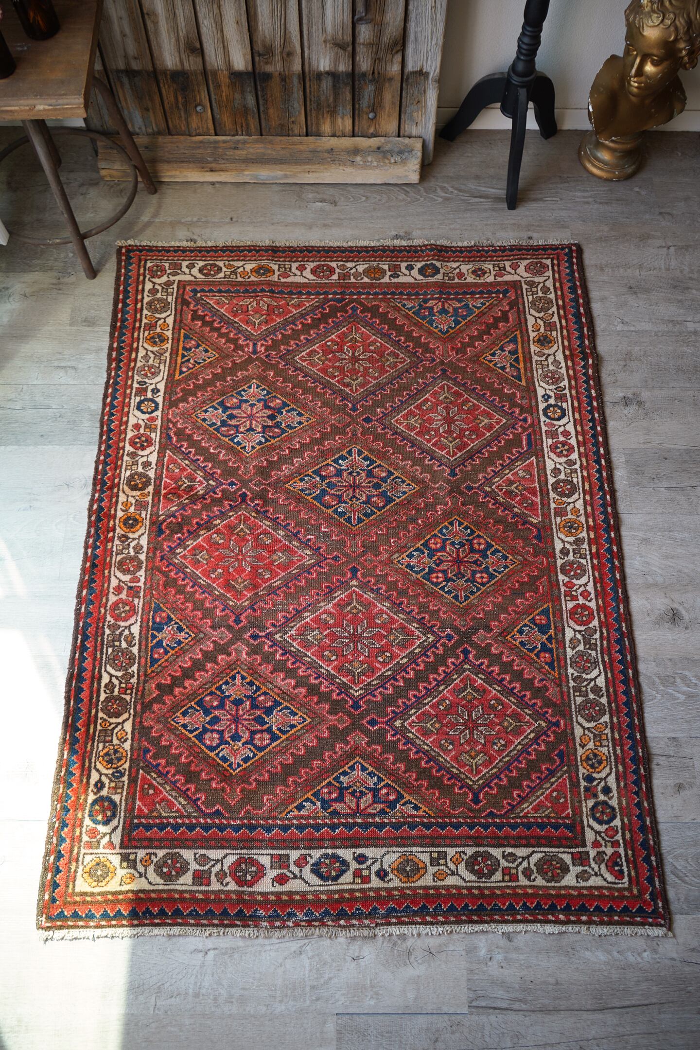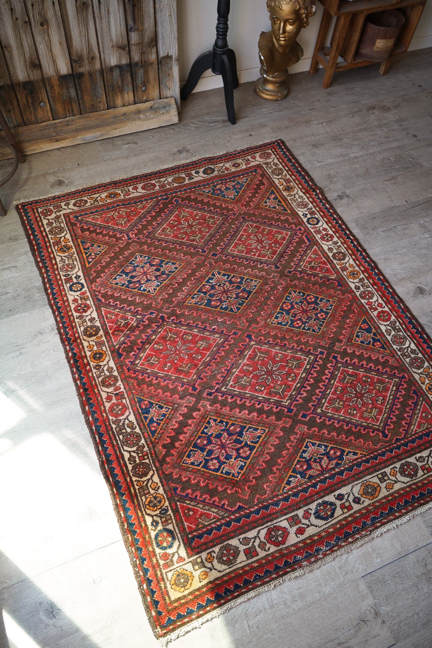 イラン西部地域に位置するマラーイェルで織られたセミアンティークラグ。赤とネイビーの菱形紋様が美しい配列で織り込まれたデザイン。経年によりパイルも低くなっており、サラサラと乾いた質感ですのです。目立った補修跡はなく、コンディションも良好。1人掛け用のラウンジチェアの下に敷いたりしても素敵そうですね♫