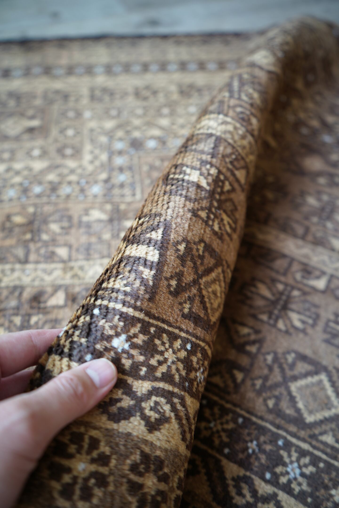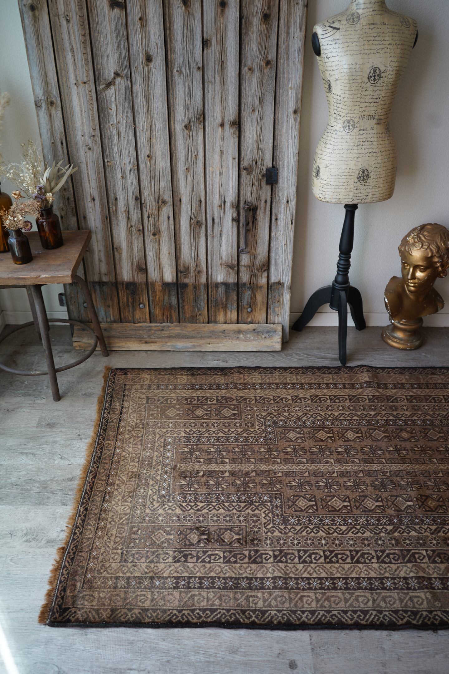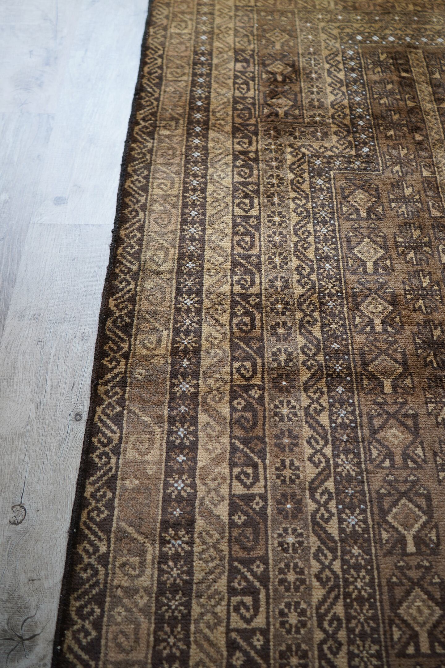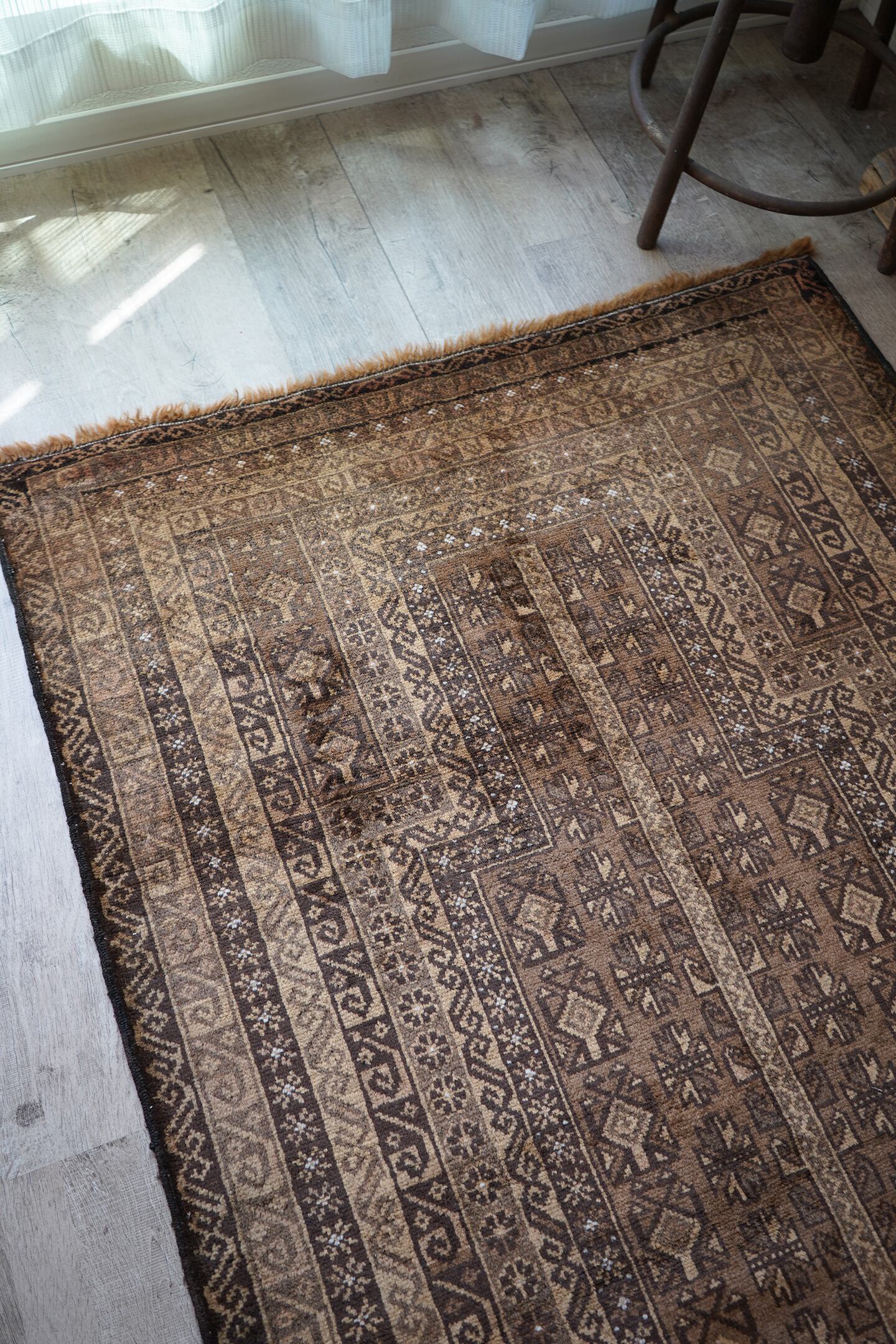 統一感のあるブラウンとベージュカラーの落ち着いた配色が素敵なバルーチラグ。パイルに太陽光が差し込むと艶も見受けられ、大変美しいです。ふわサラッとした肌触りで、厚みは5mm程度。状態は補修跡もなく、グッドコンディション。どこの場所にもスッと馴染んでくれて、雰囲気をアップしてくれるオールマイティな一枚です♫
