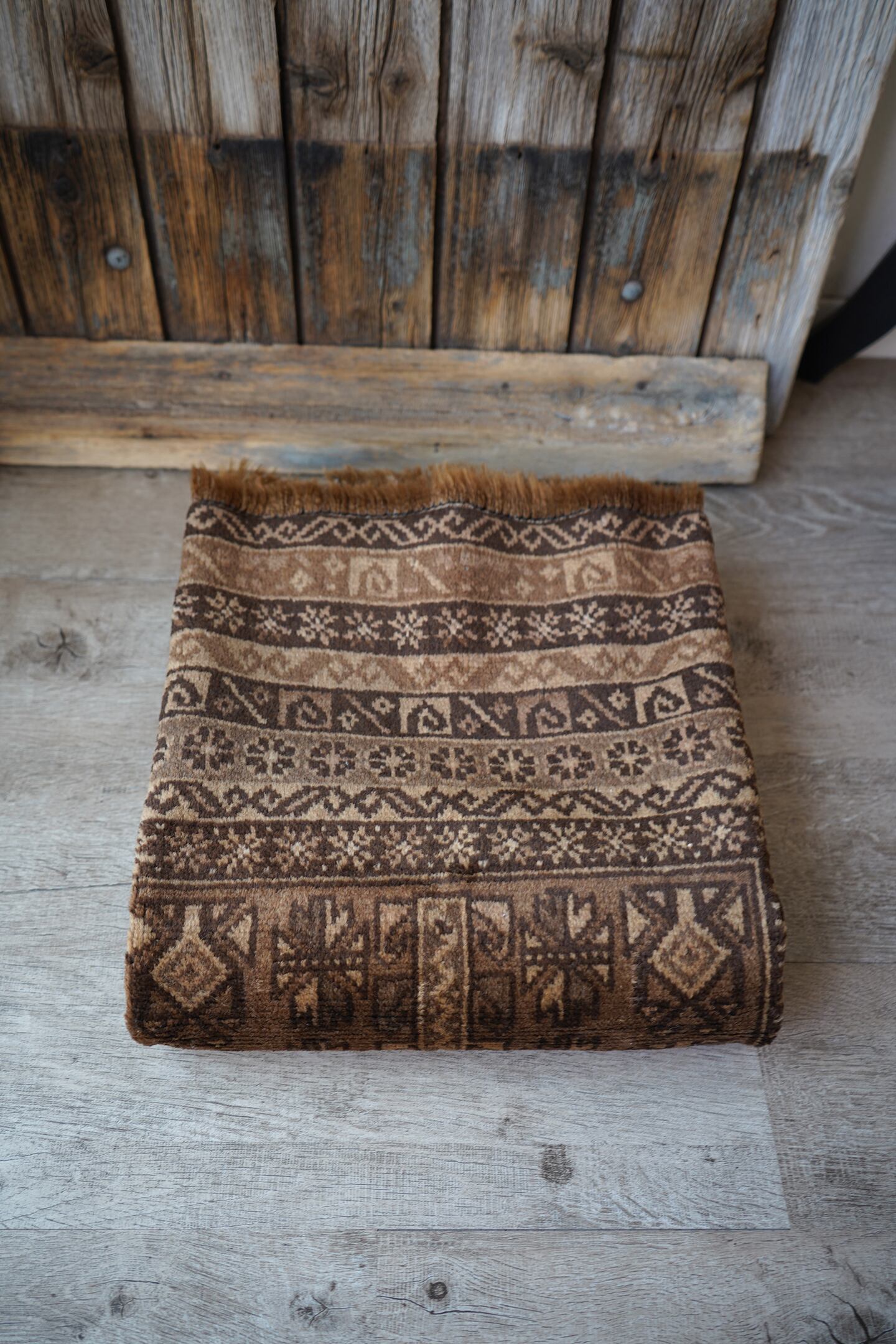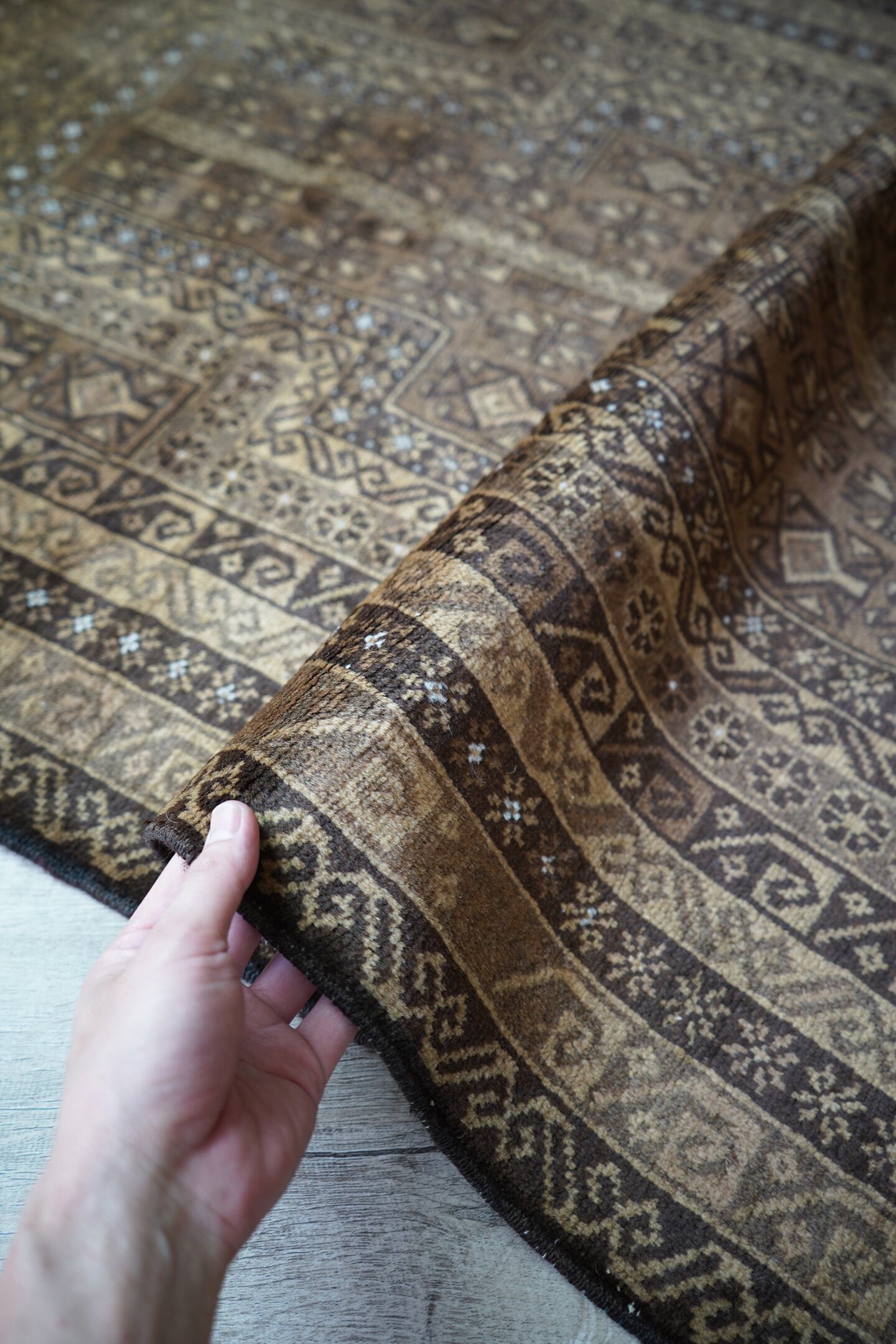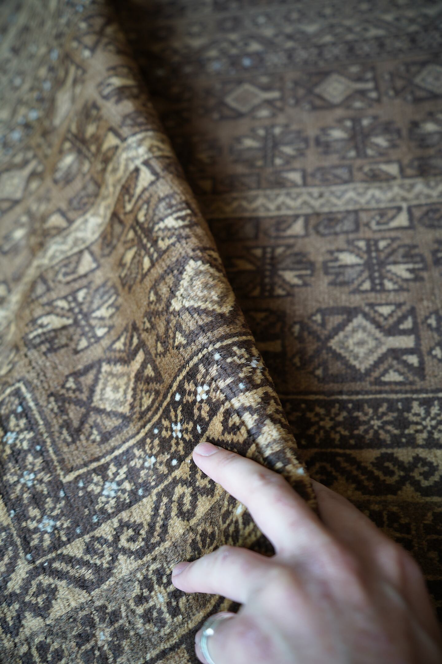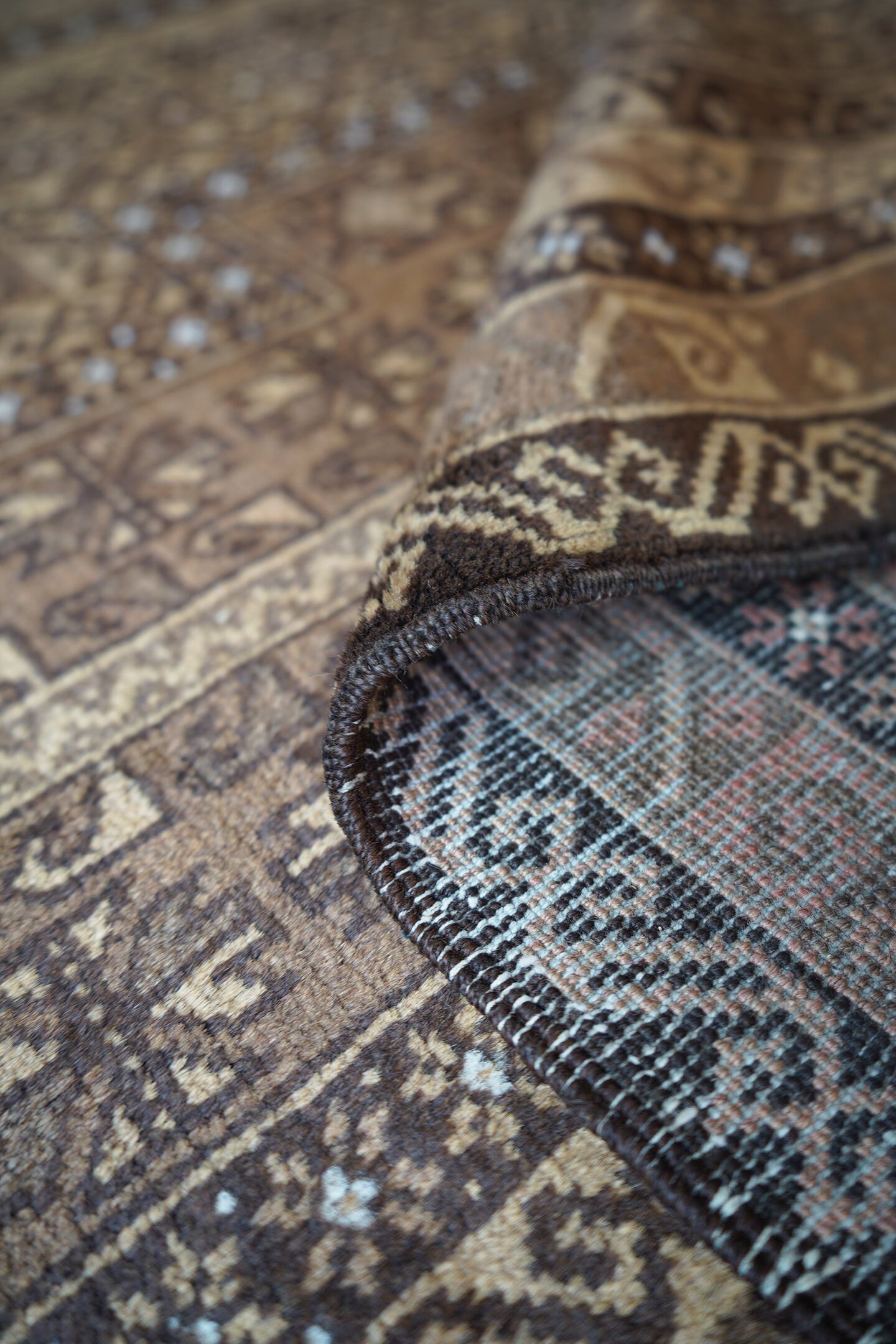 統一感のあるブラウンとベージュカラーの落ち着いた配色が素敵なバルーチラグ。パイルに太陽光が差し込むと艶も見受けられ、大変美しいです。ふわサラッとした肌触りで、厚みは5mm程度。状態は補修跡もなく、グッドコンディション。どこの場所にもスッと馴染んでくれて、雰囲気をアップしてくれるオールマイティな一枚です♫
