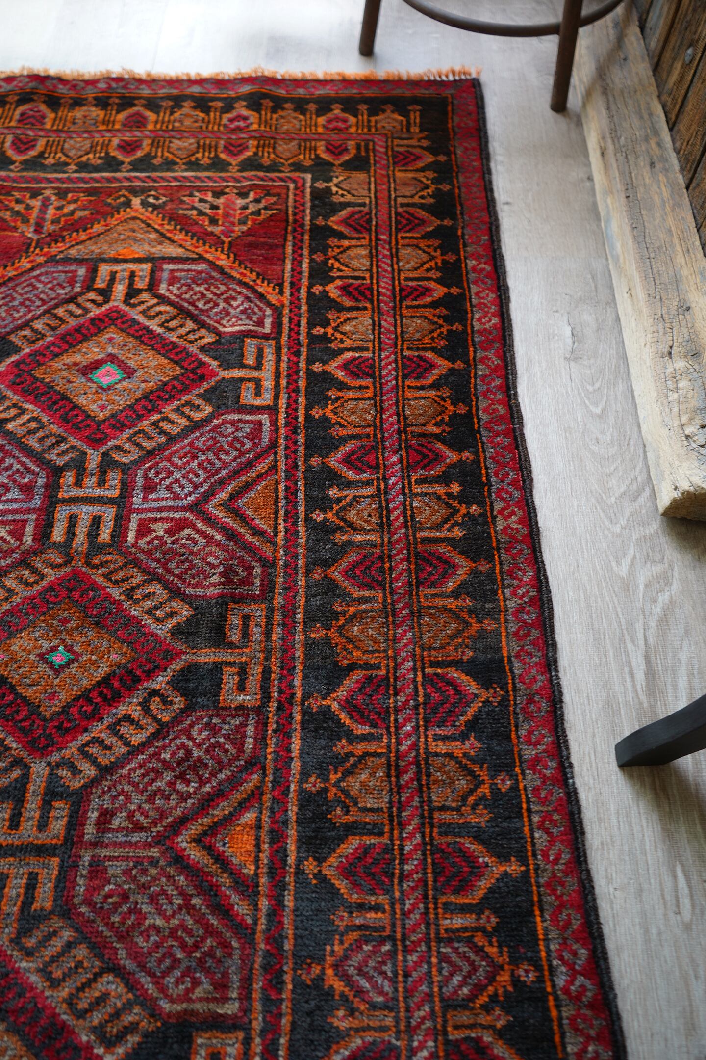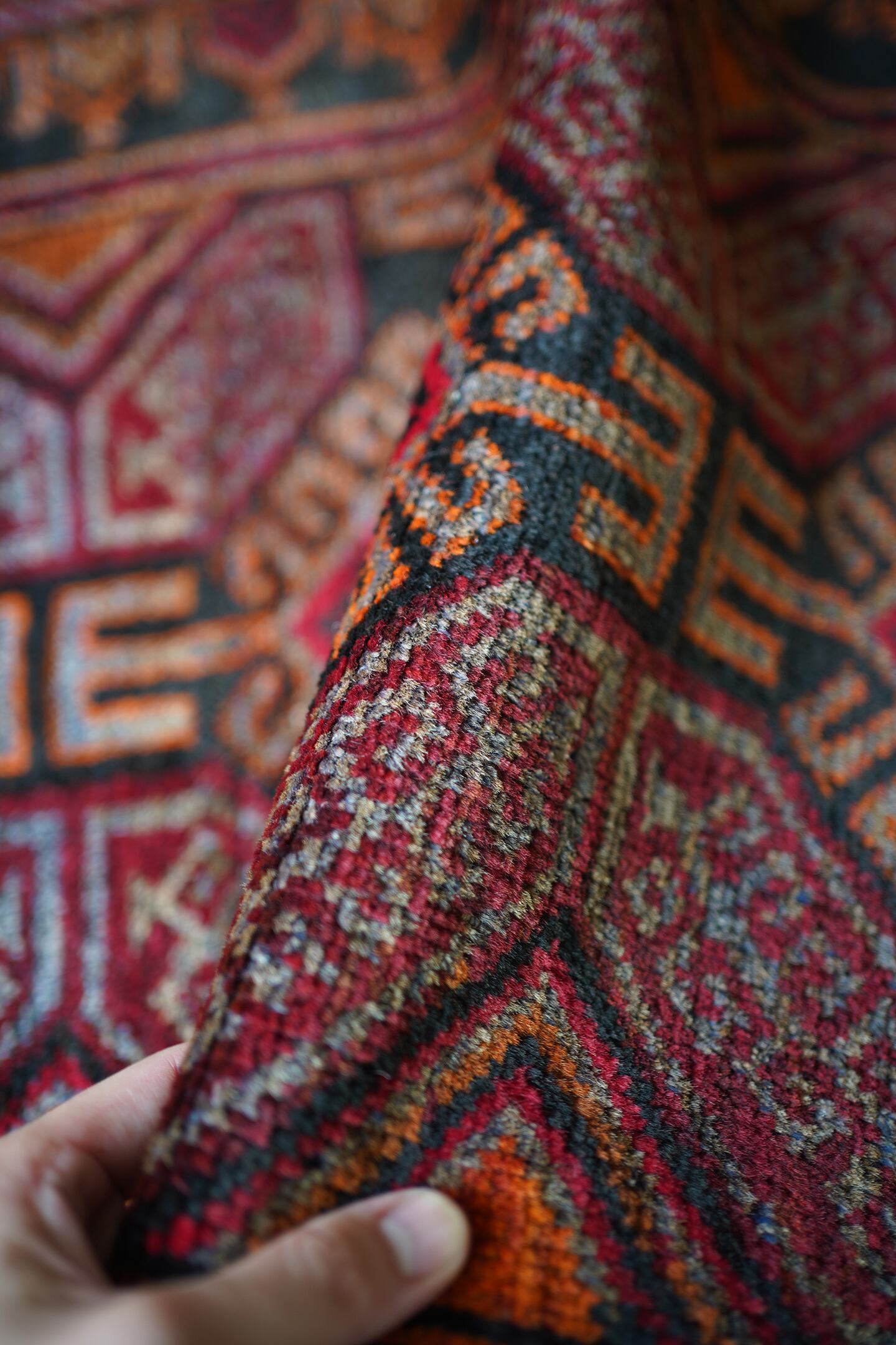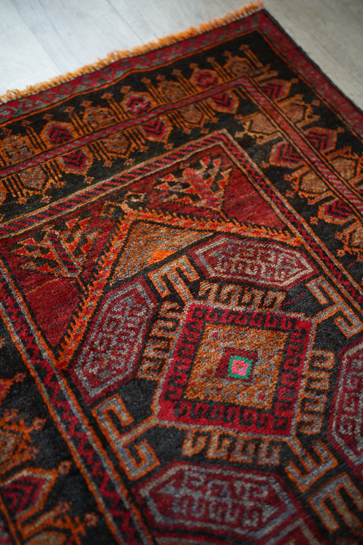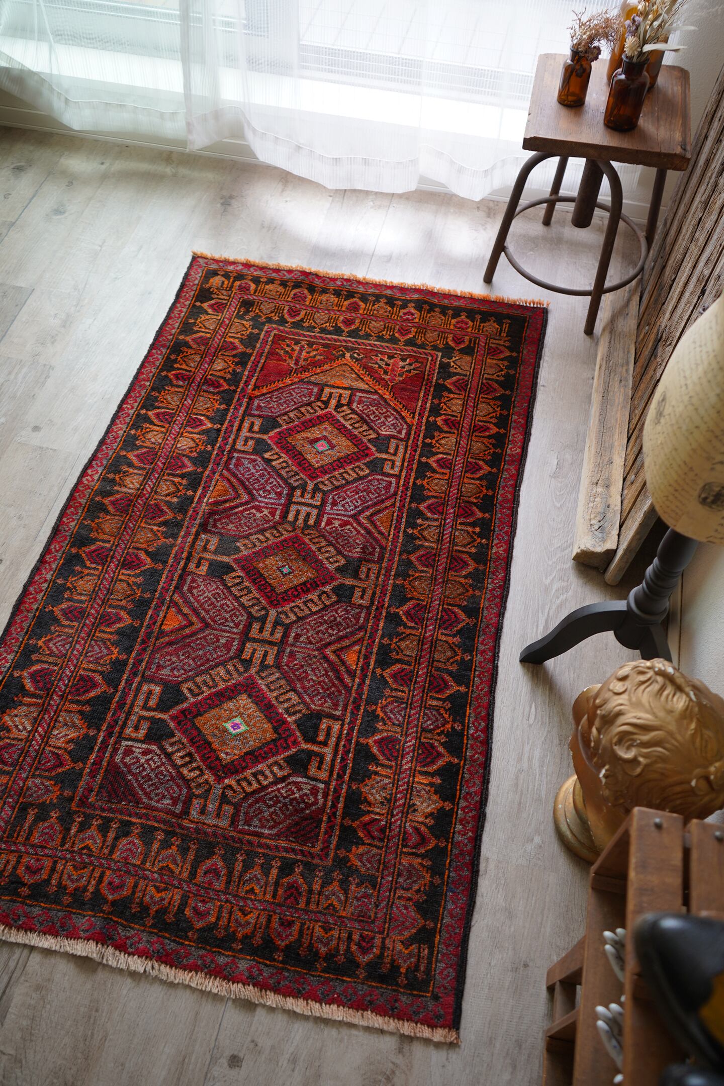 ふわっと滑らかな気持ちの良い肌触りのアフガニスタン産のバルーチラグ。暗めの赤やオレンジ、黒やグレーなどのシックな色合いで、カッコ良い雰囲気の一枚です。フックドメダリオンの中心は蛍光色で緑とピンクが使われていて素敵なアクセントになっています。またパイルに太陽光が差し込むと艶も見受けられ美しいです。厚みは5mm〜6mm程度。目立った補修跡もなく、グッドコンディション。廊下や窓際など素敵に彩ってくれると思います♫