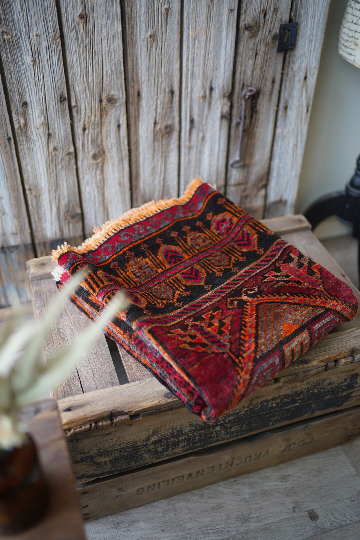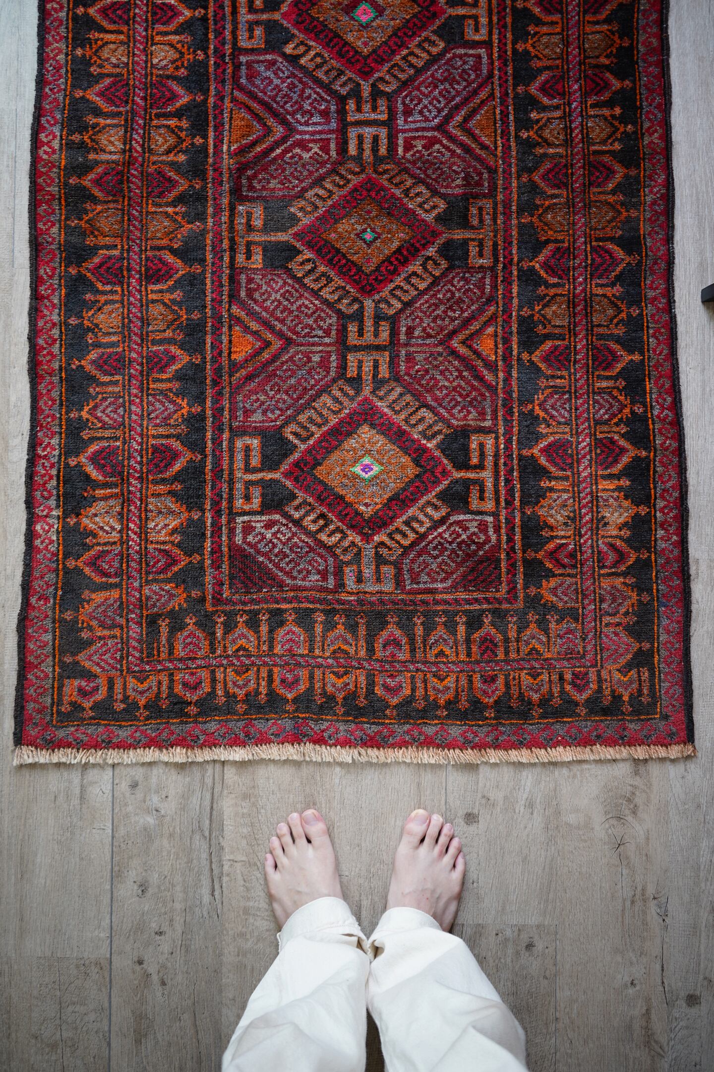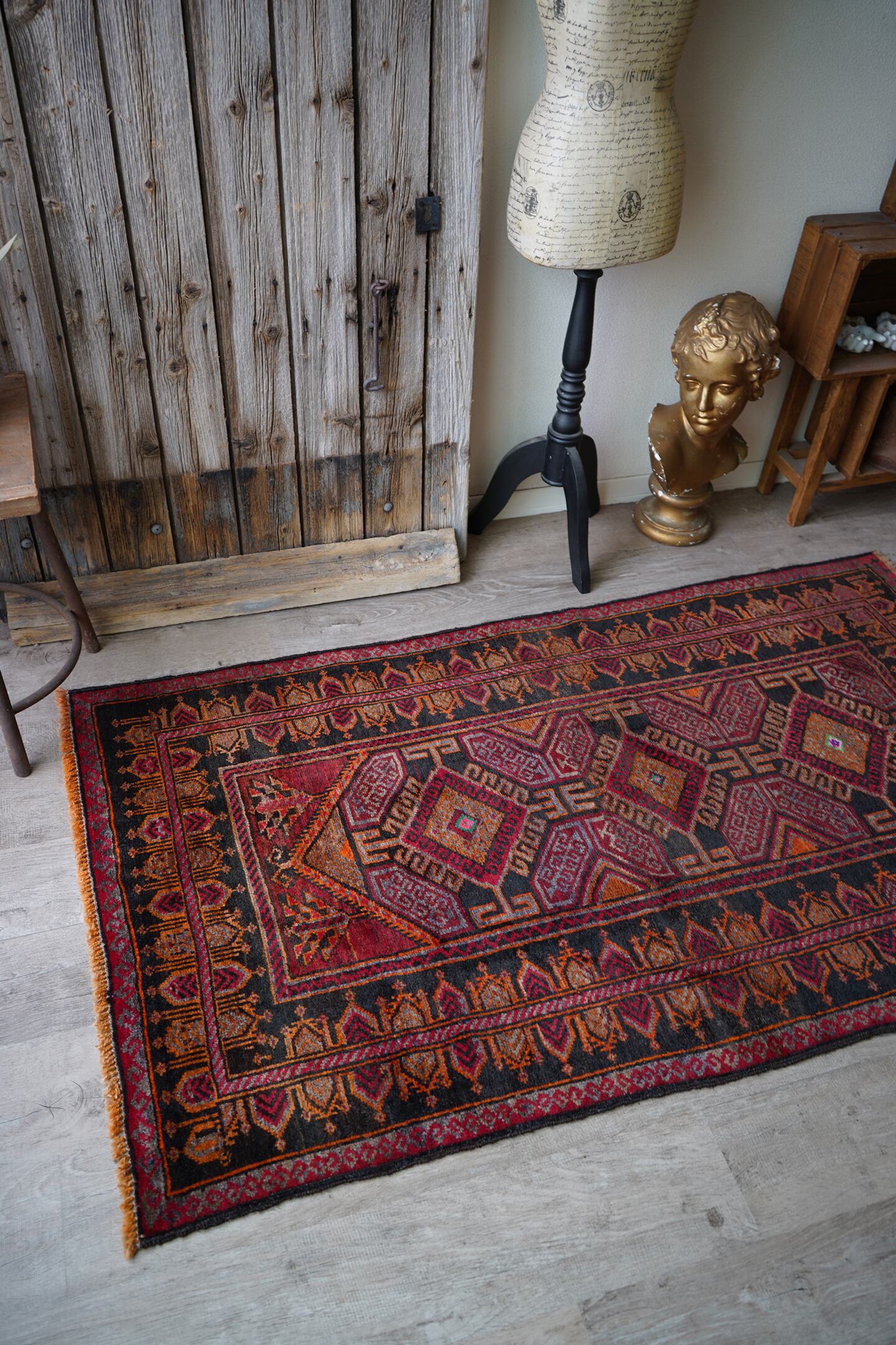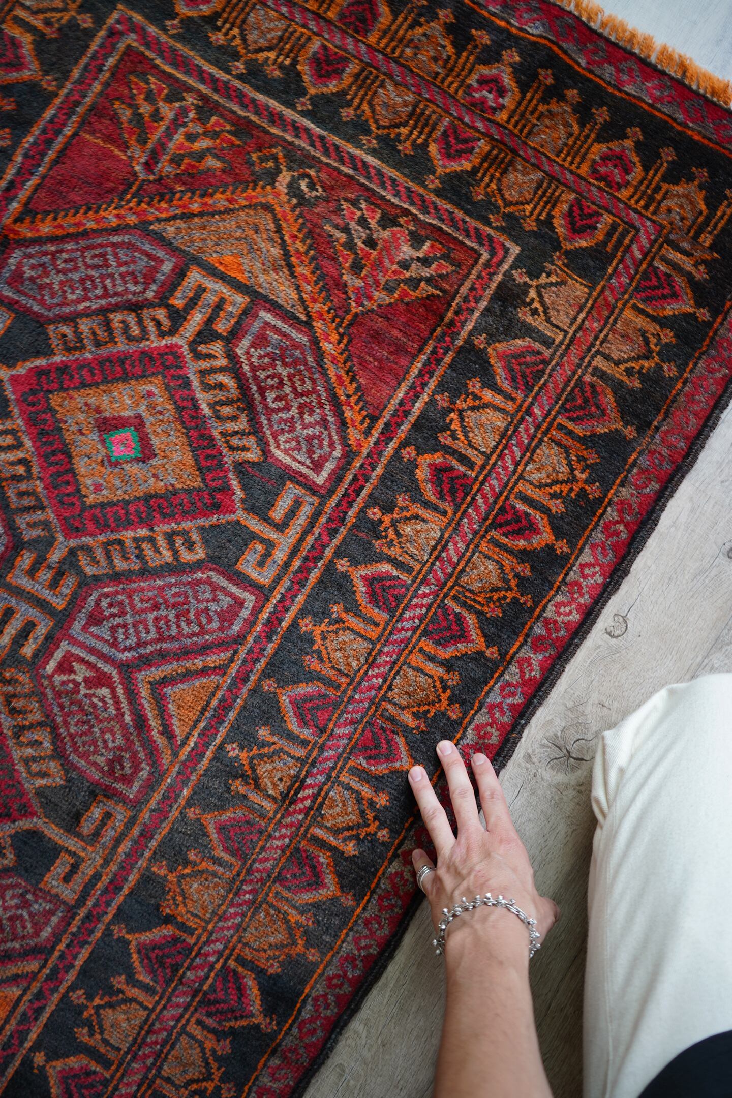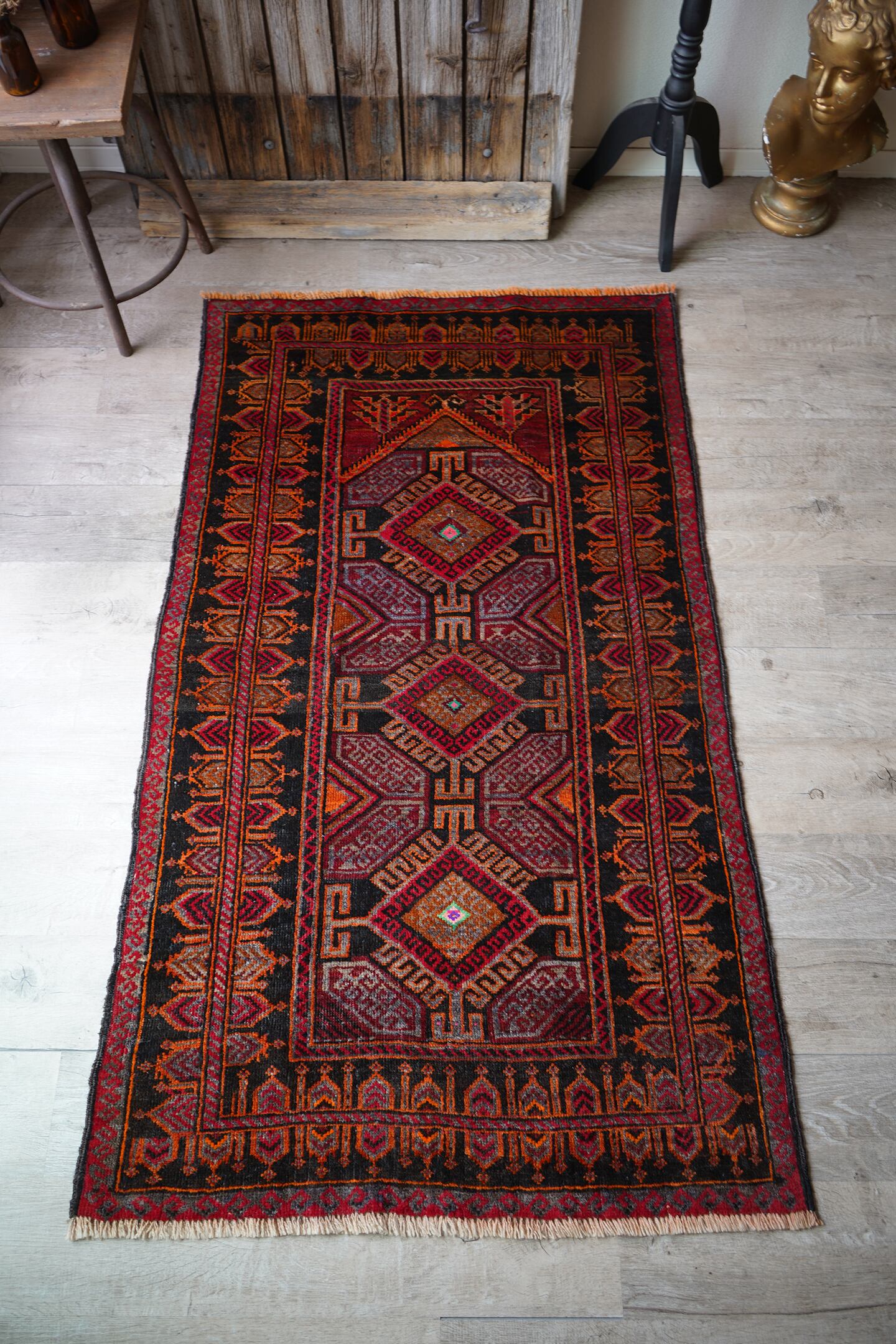 ふわっと滑らかな気持ちの良い肌触りのアフガニスタン産のバルーチラグ。暗めの赤やオレンジ、黒やグレーなどのシックな色合いで、カッコ良い雰囲気の一枚です。フックドメダリオンの中心は蛍光色で緑とピンクが使われていて素敵なアクセントになっています。またパイルに太陽光が差し込むと艶も見受けられ美しいです。厚みは5mm〜6mm程度。目立った補修跡もなく、グッドコンディション。廊下や窓際など素敵に彩ってくれると思います♫