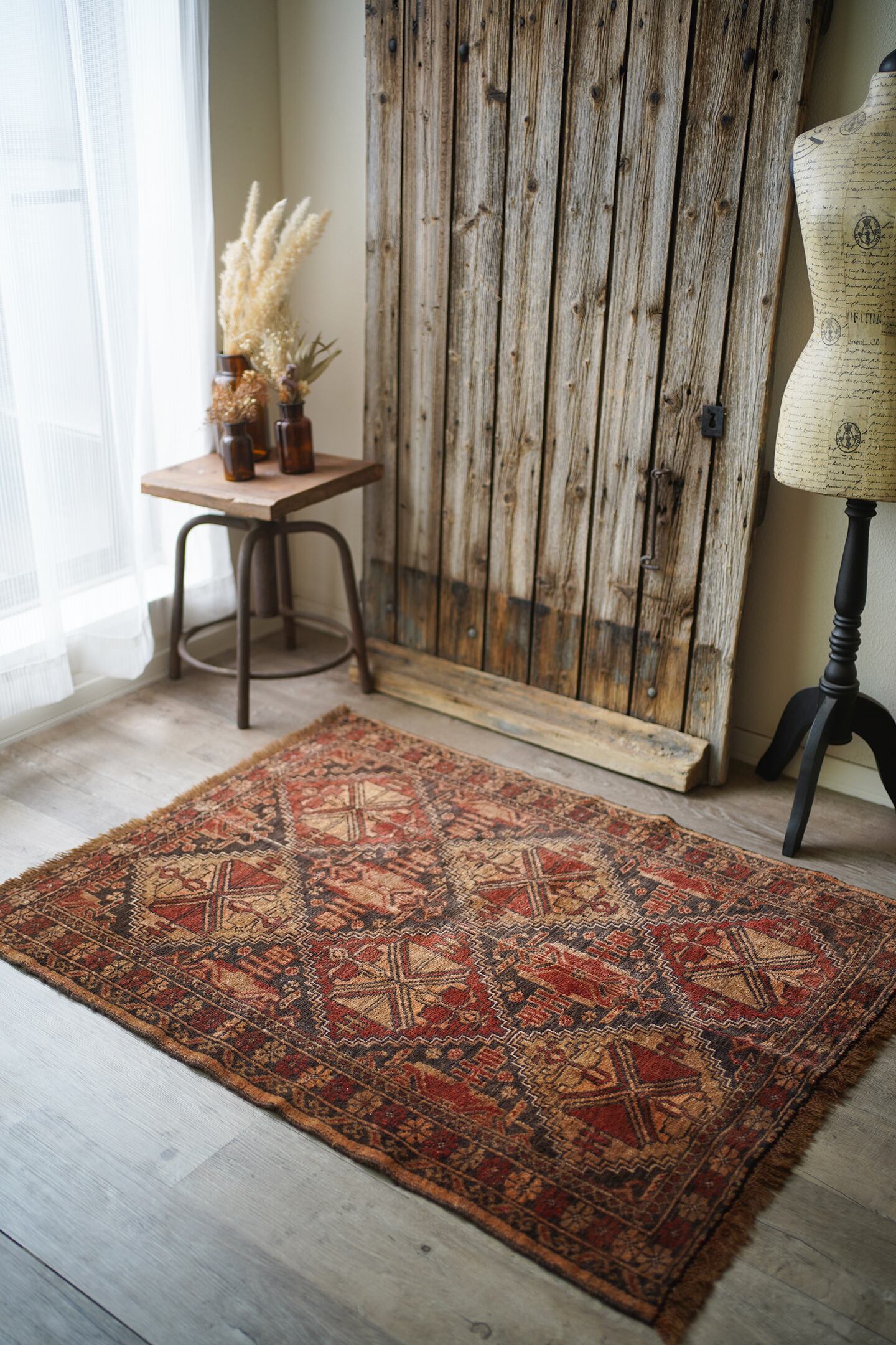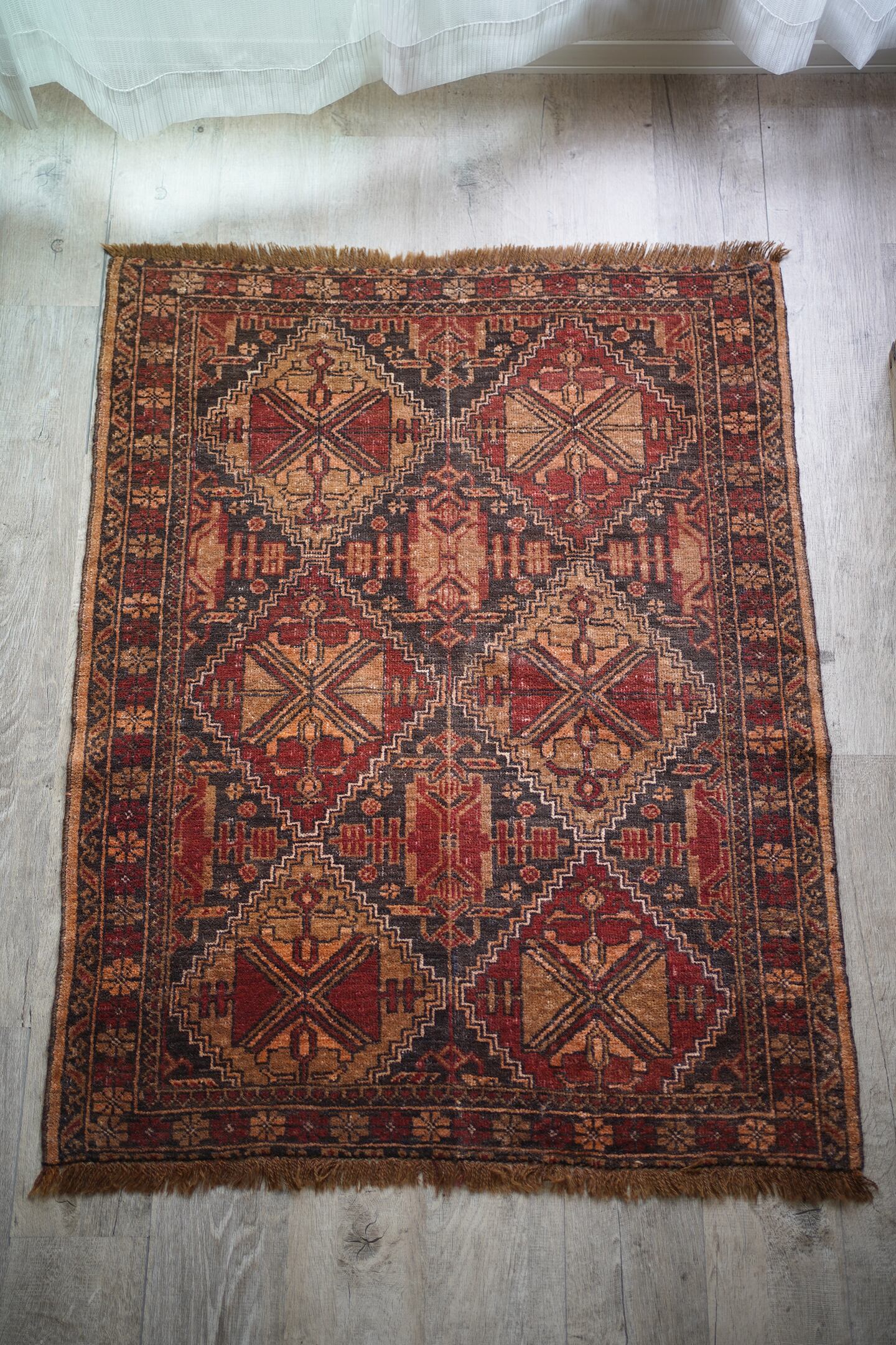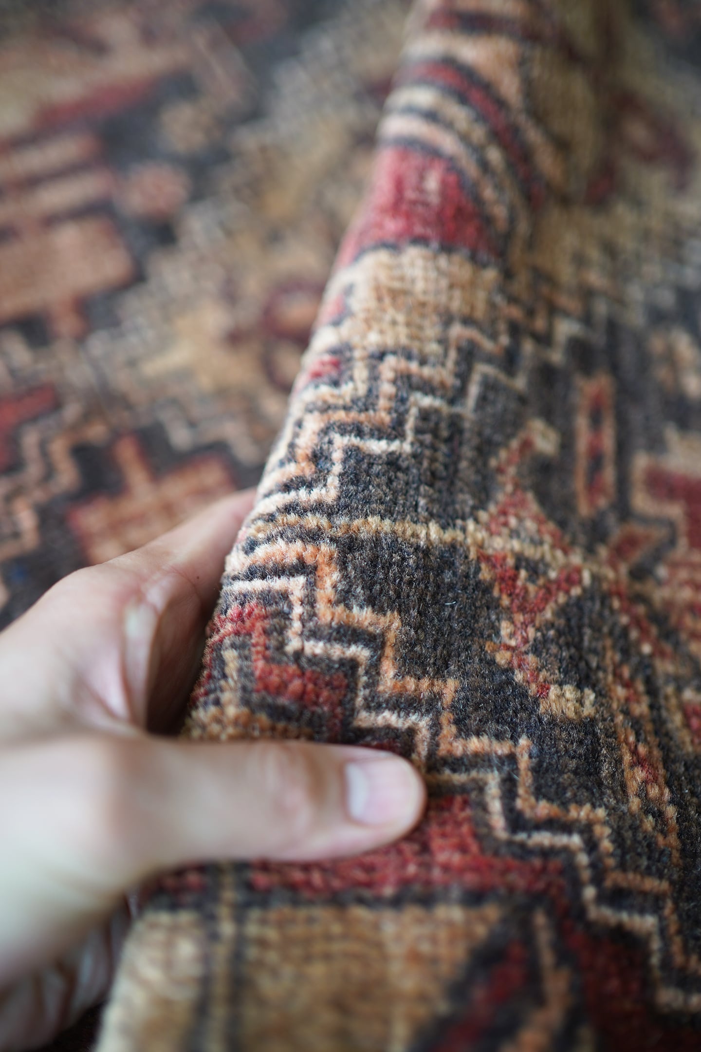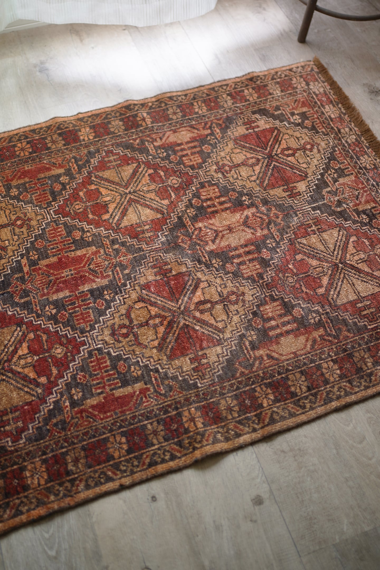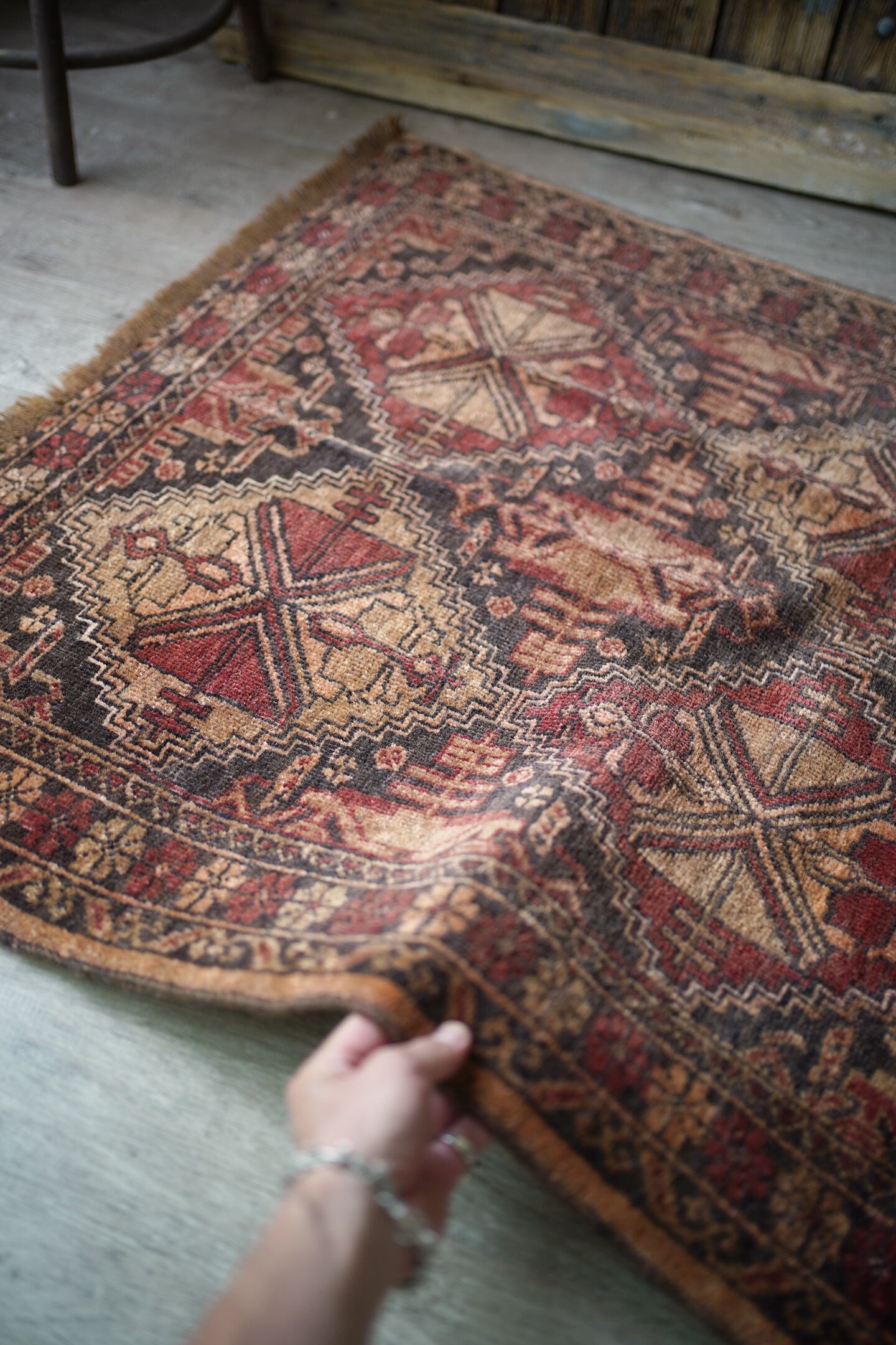 おおよそ約40年前にアフガニスタンのトルクメン族によって織られたアリホジャラグです。赤茶、ブラウン、薄い黒のカラーリングで、色褪せた風合いもあり、味のある一枚です。5mm〜6mm程度の厚みで、ふわっとした優しい肌触り。目立った補修跡なく、状態も良好です。スクエアに近いサイズ感ですので、衣装棚の下に敷いたりといろんな場所で活躍してくれそう♫