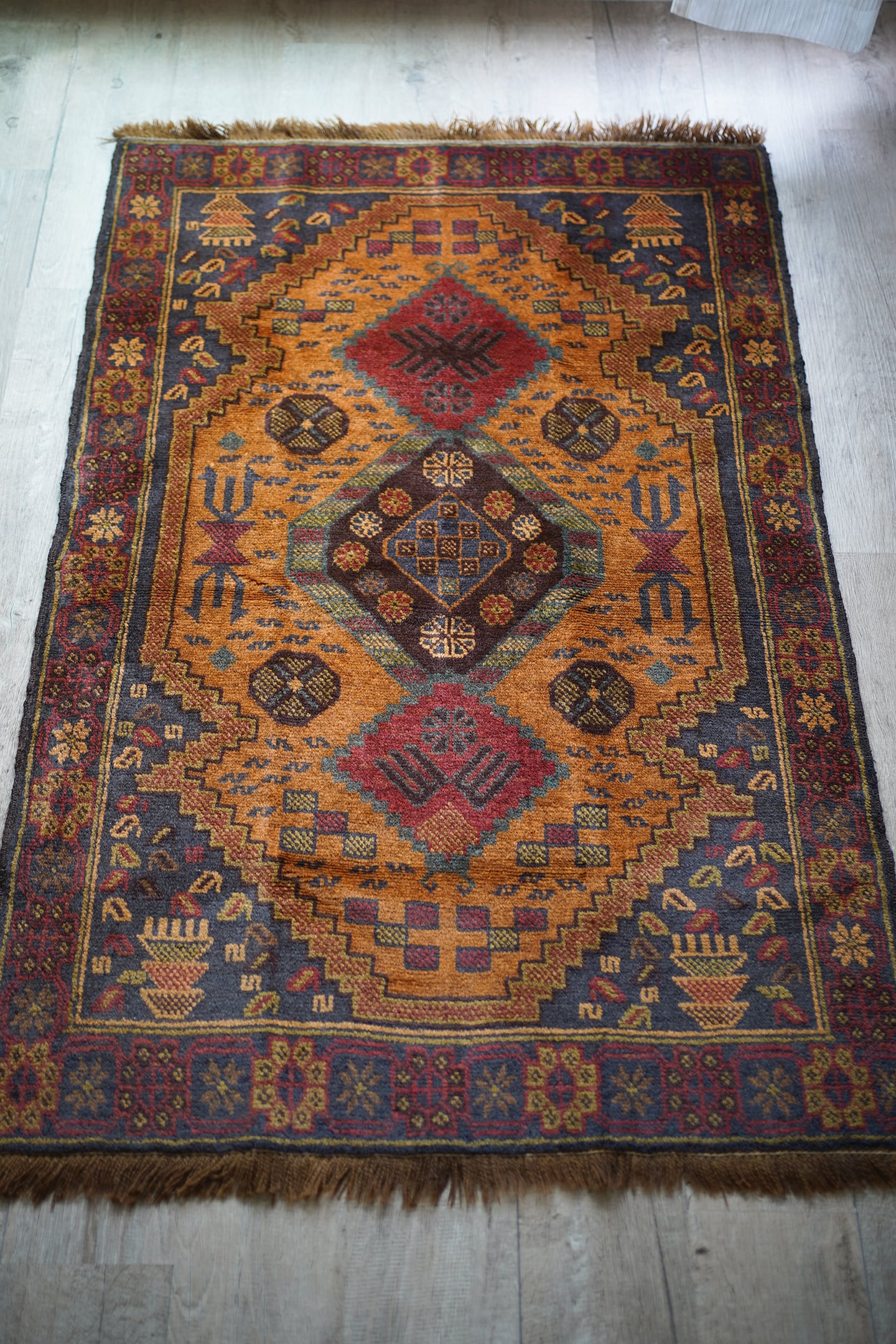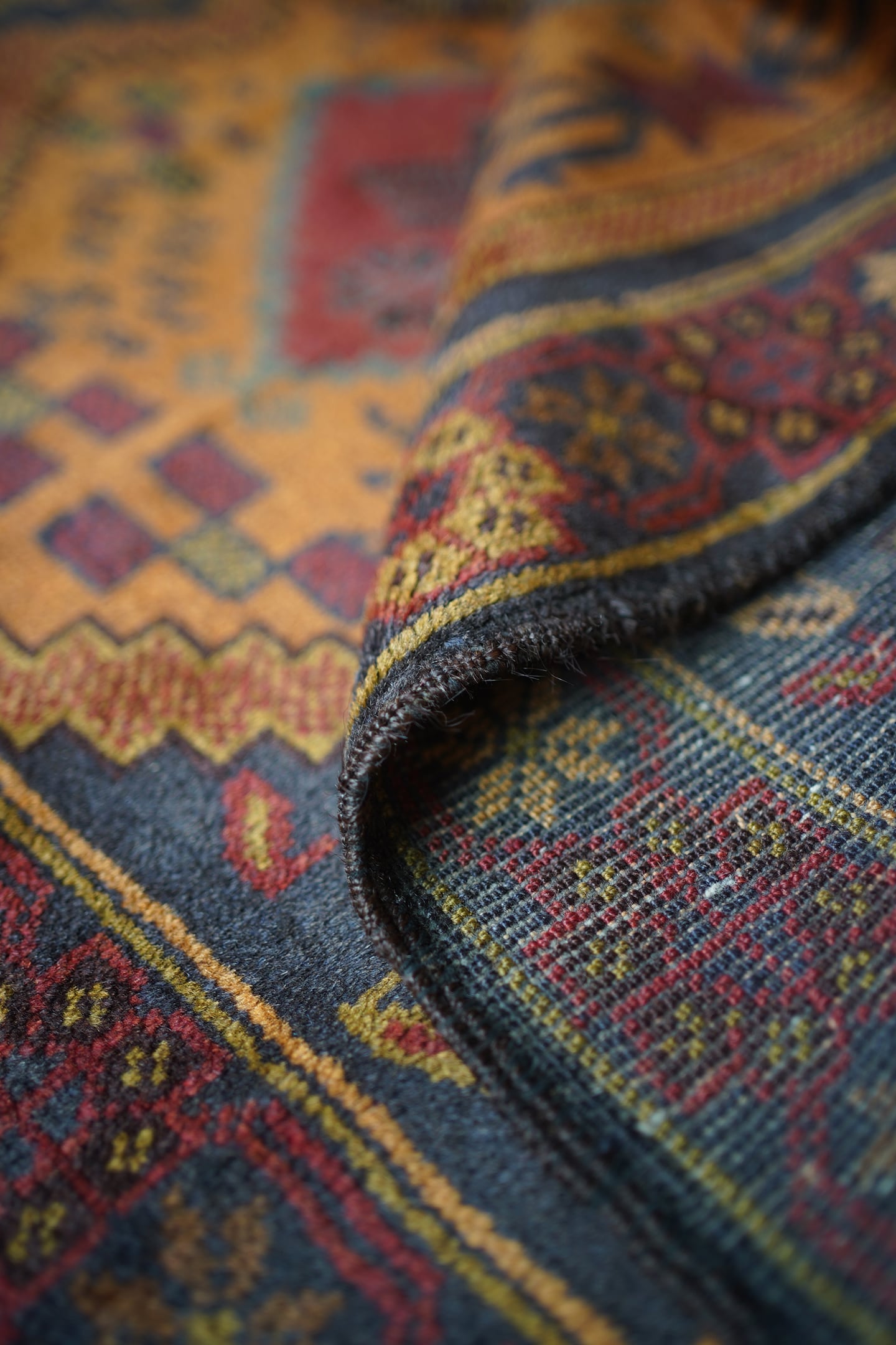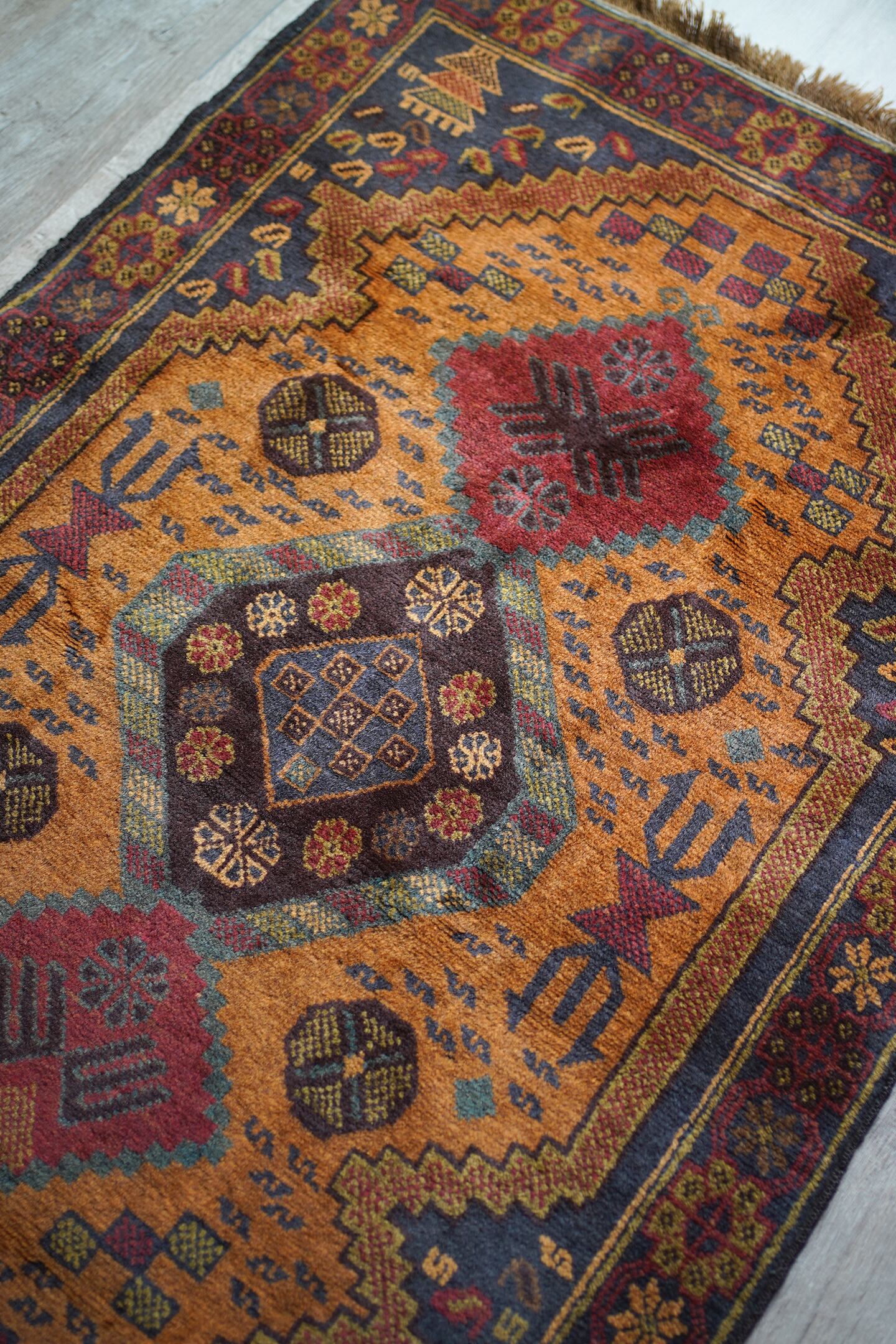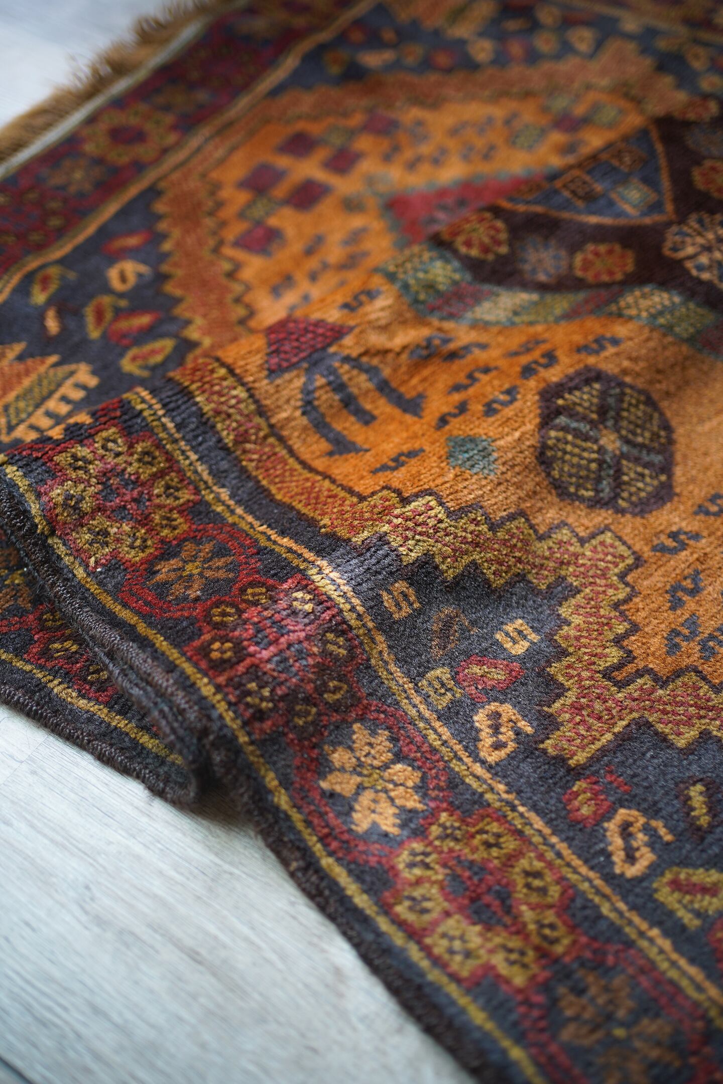 ふわっと滑らかで優しい肌触りで、パイル全体的に艶がある美しいアフガンバルーチ。フィールドは少しオレンジが入ったようなブラウン、中央メダリオンは薄いモスグリーン、コーナーは褪せた薄めのブラック、ボーダーは赤茶の配色です。渋い色合いでありながら、優しい雰囲気の紋様デザインが素敵な一枚。6mm程度の厚みとなります。セルベッジにお写真最後のような補修した箇所が数カ所ございますが、それ以外は状態も大変良好です。