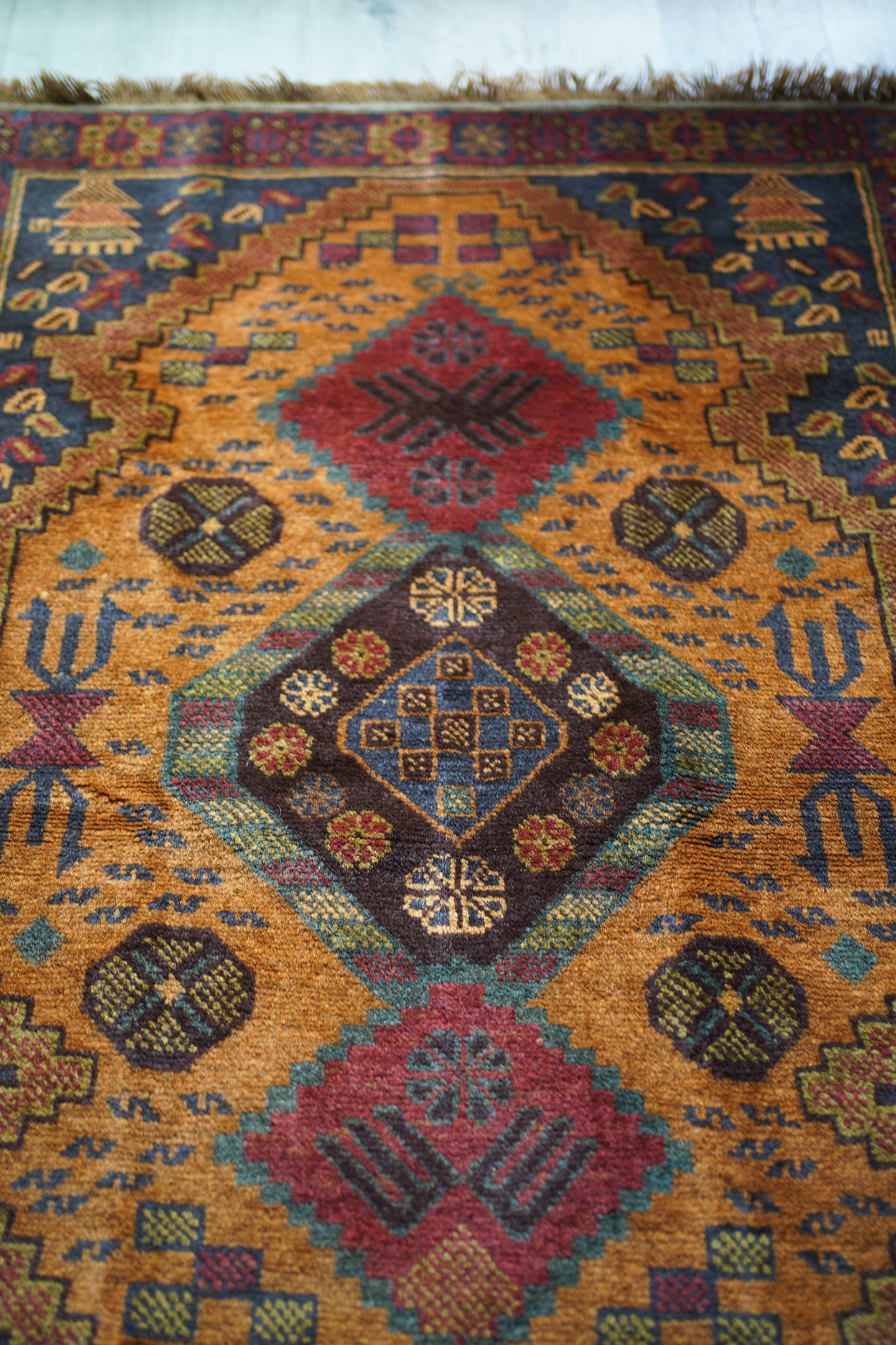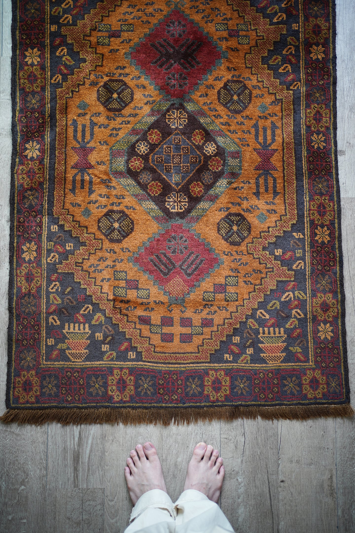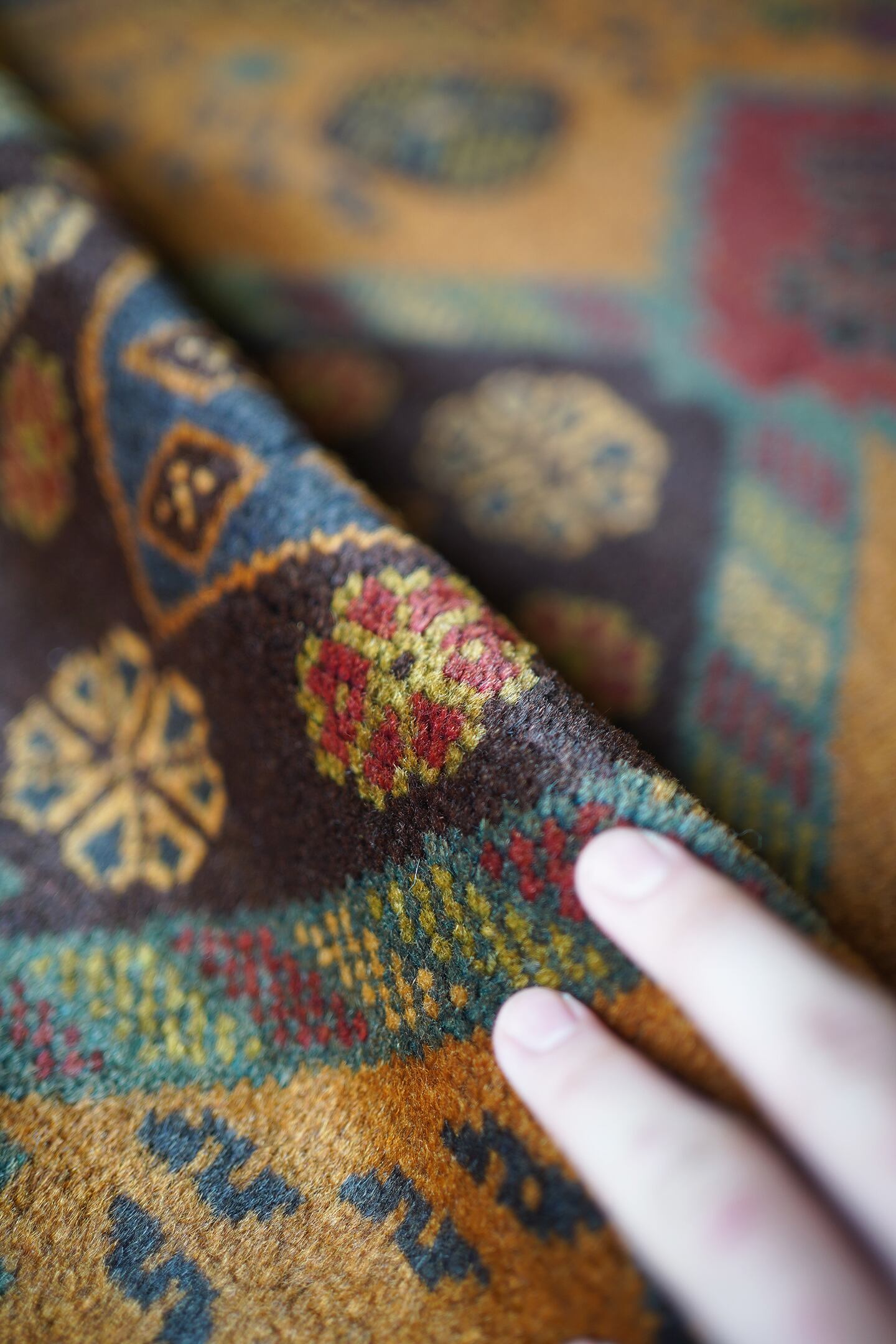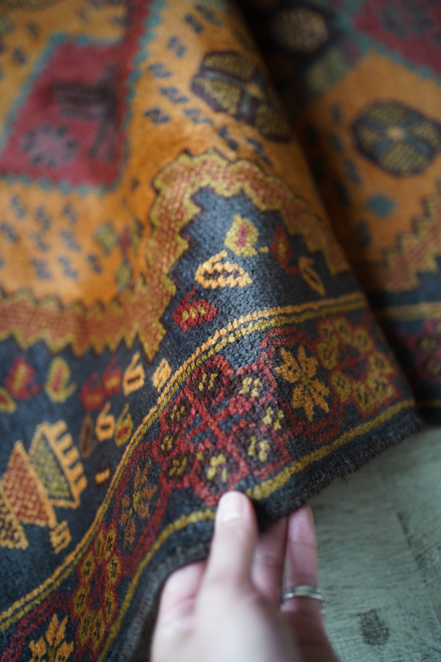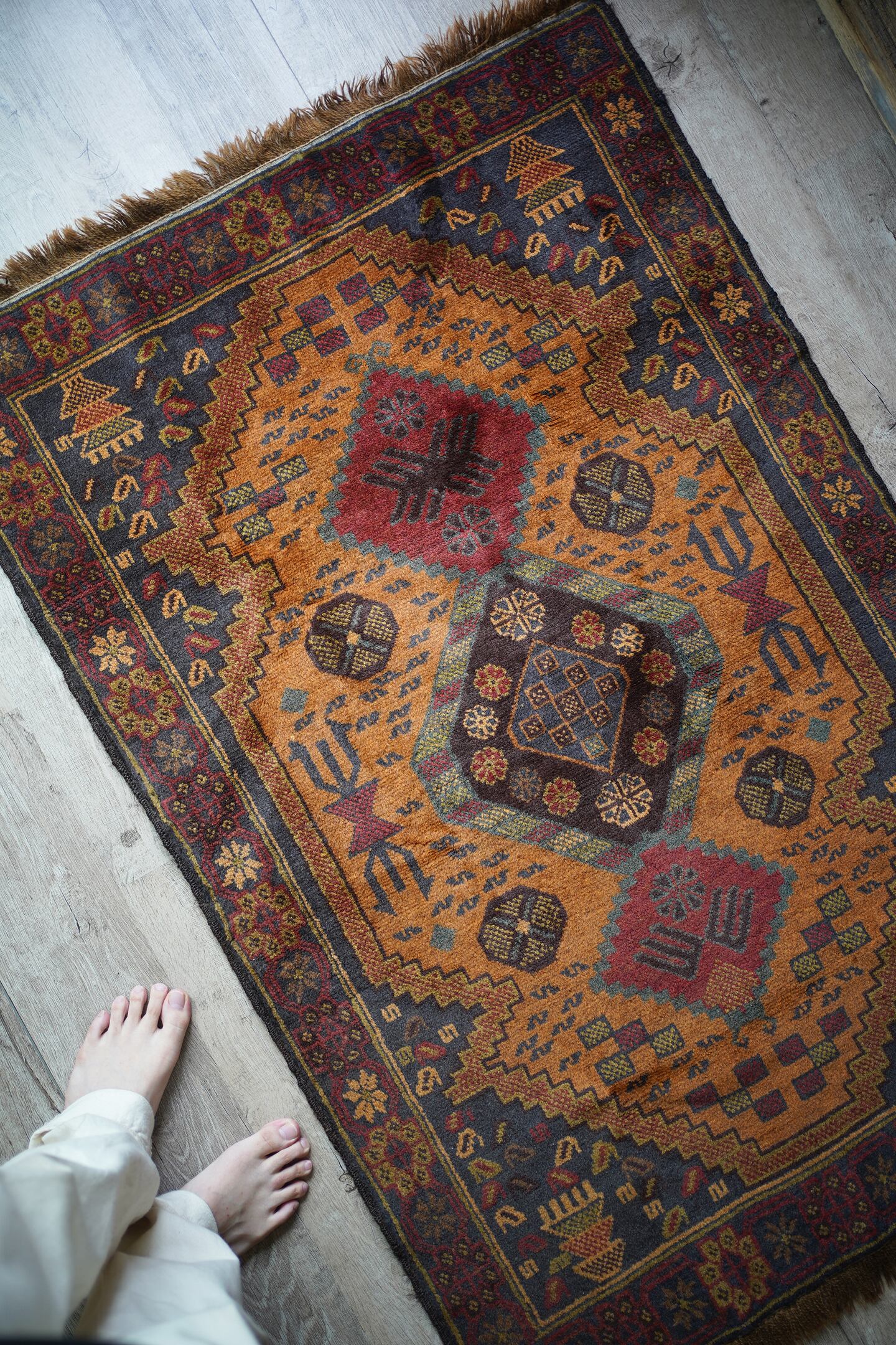 ふわっと滑らかで優しい肌触りで、パイル全体的に艶がある美しいアフガンバルーチ。フィールドは少しオレンジが入ったようなブラウン、中央メダリオンは薄いモスグリーン、コーナーは褪せた薄めのブラック、ボーダーは赤茶の配色です。渋い色合いでありながら、優しい雰囲気の紋様デザインが素敵な一枚。6mm程度の厚みとなります。セルベッジにお写真最後のような補修した箇所が数カ所ございますが、それ以外は状態も大変良好です。