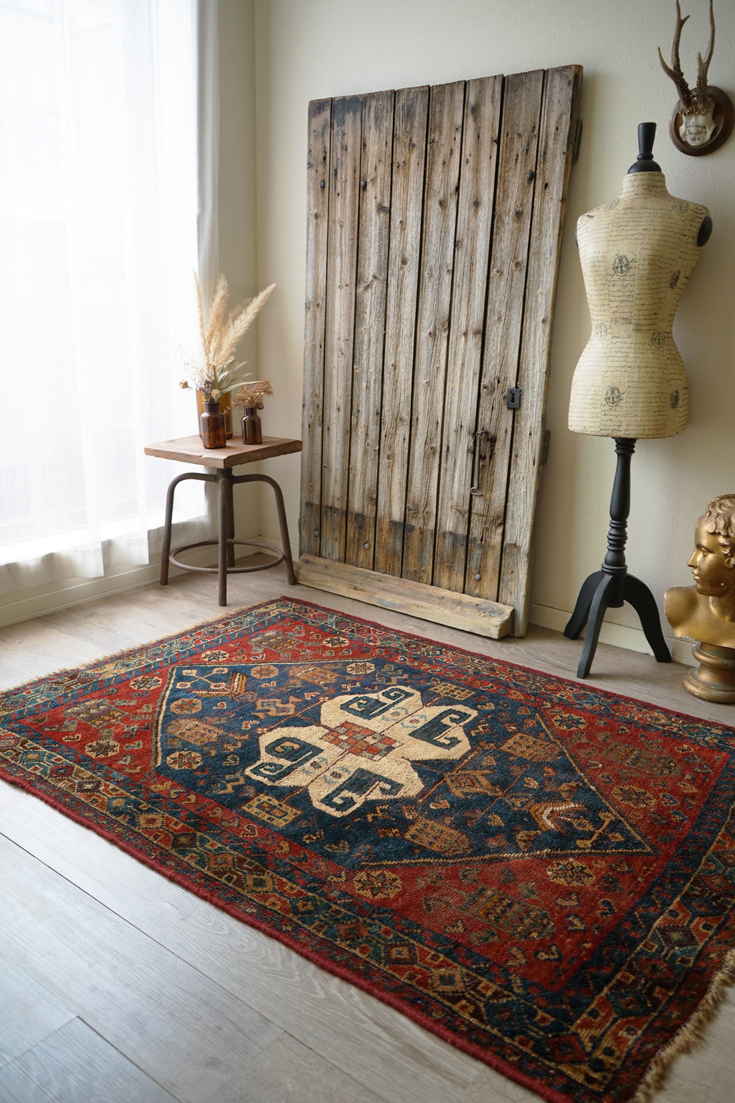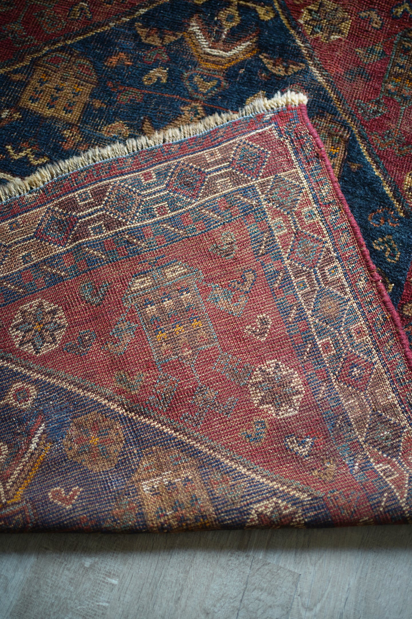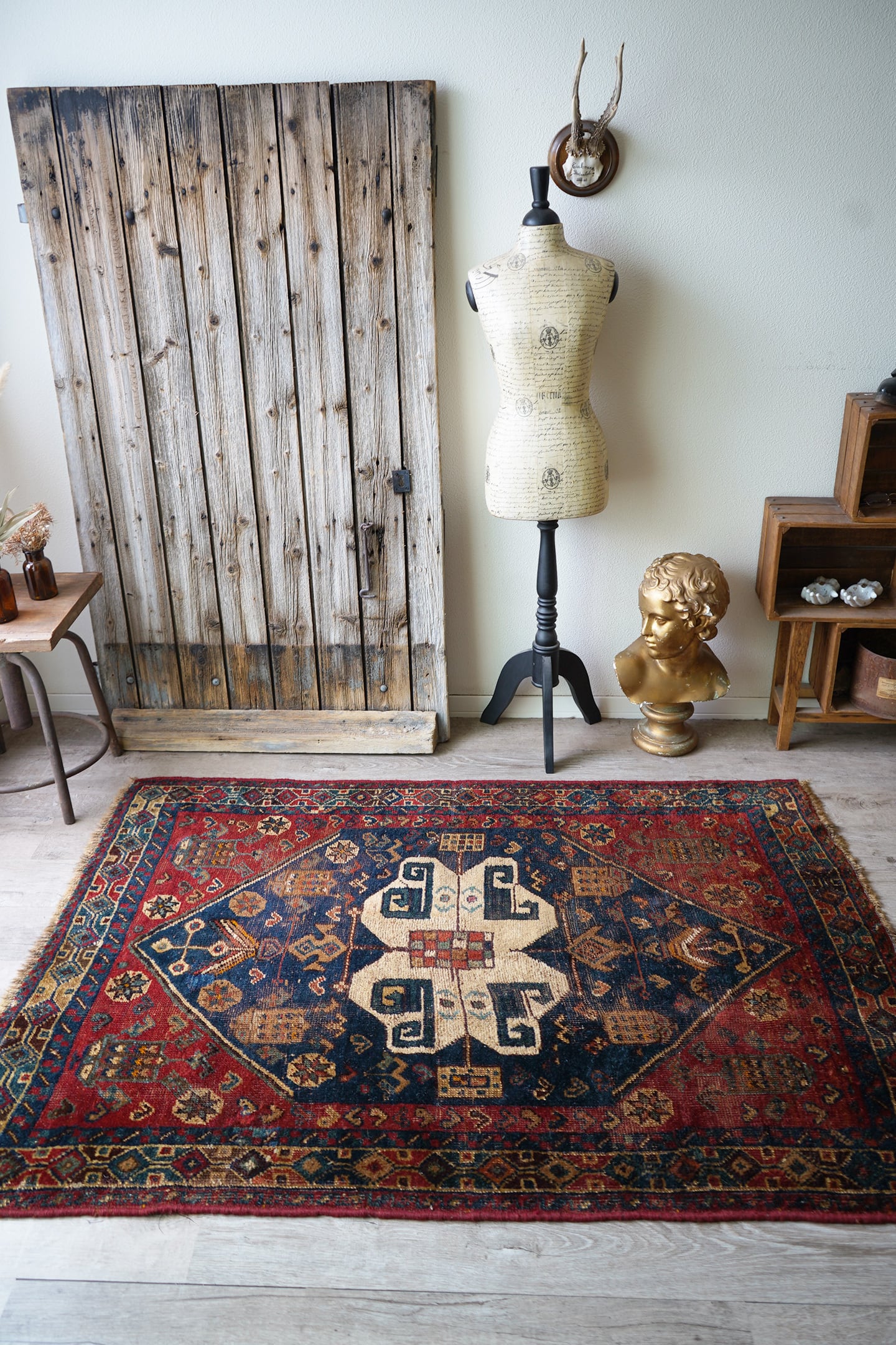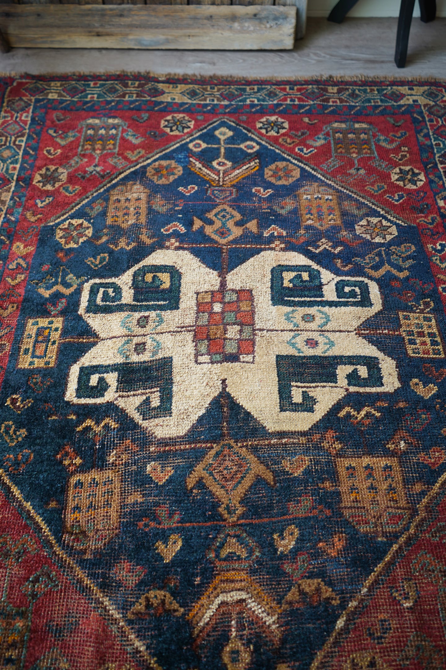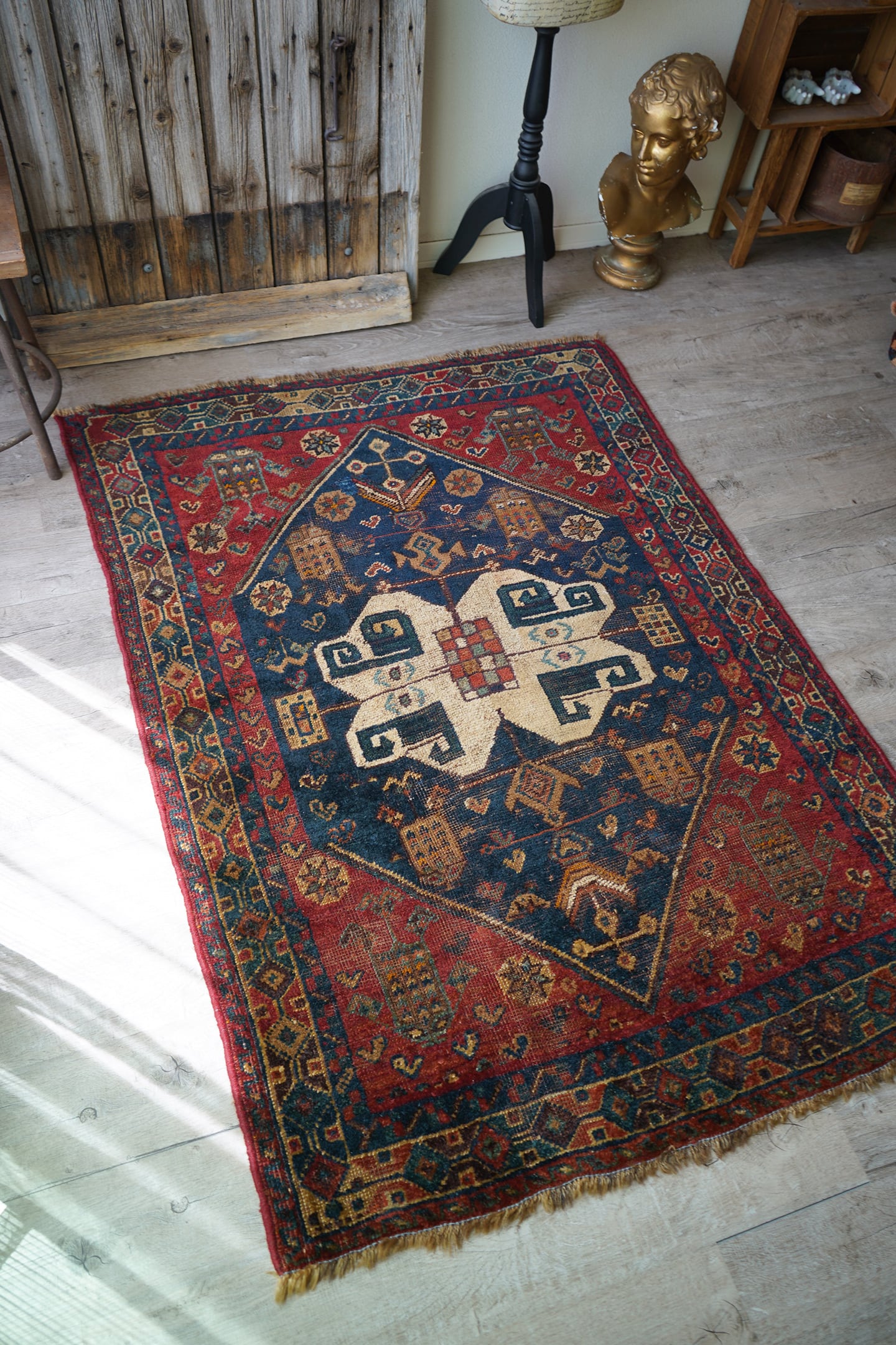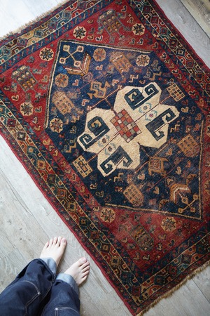 落ち着いた深い赤にブルーグリーンの色合いが美しいセミアンティークのカシュガイラグ。中央に織り込まれた大きなカシュガイメダリオンが特徴的で、マルチカラーの四角いデザインが可愛らしい一枚です。経年により擦れている箇所も多いのですが、パイルもほんのり残っているため、ふわサラッとした優しい肌触りです。修理跡がいくつかありますので、お写真最後の3枚にてご確認ください。厚みは5mm程度となります。ぜひ歴史を感じさせる素晴らしい風合いのラグを楽しんでください♫