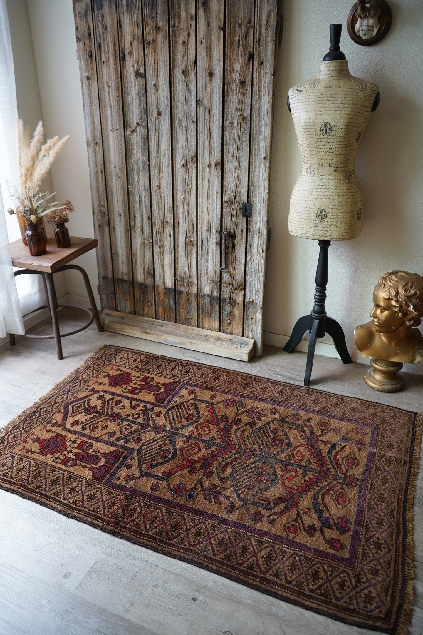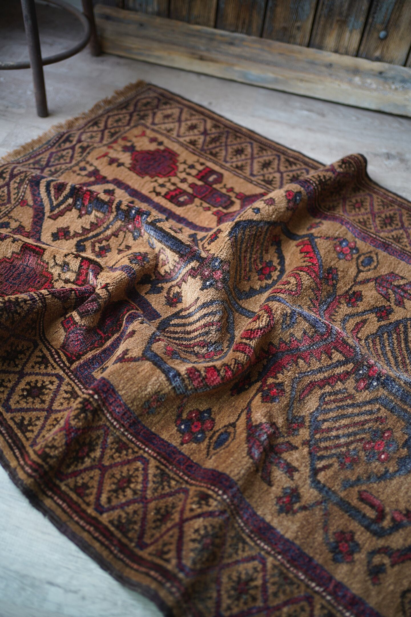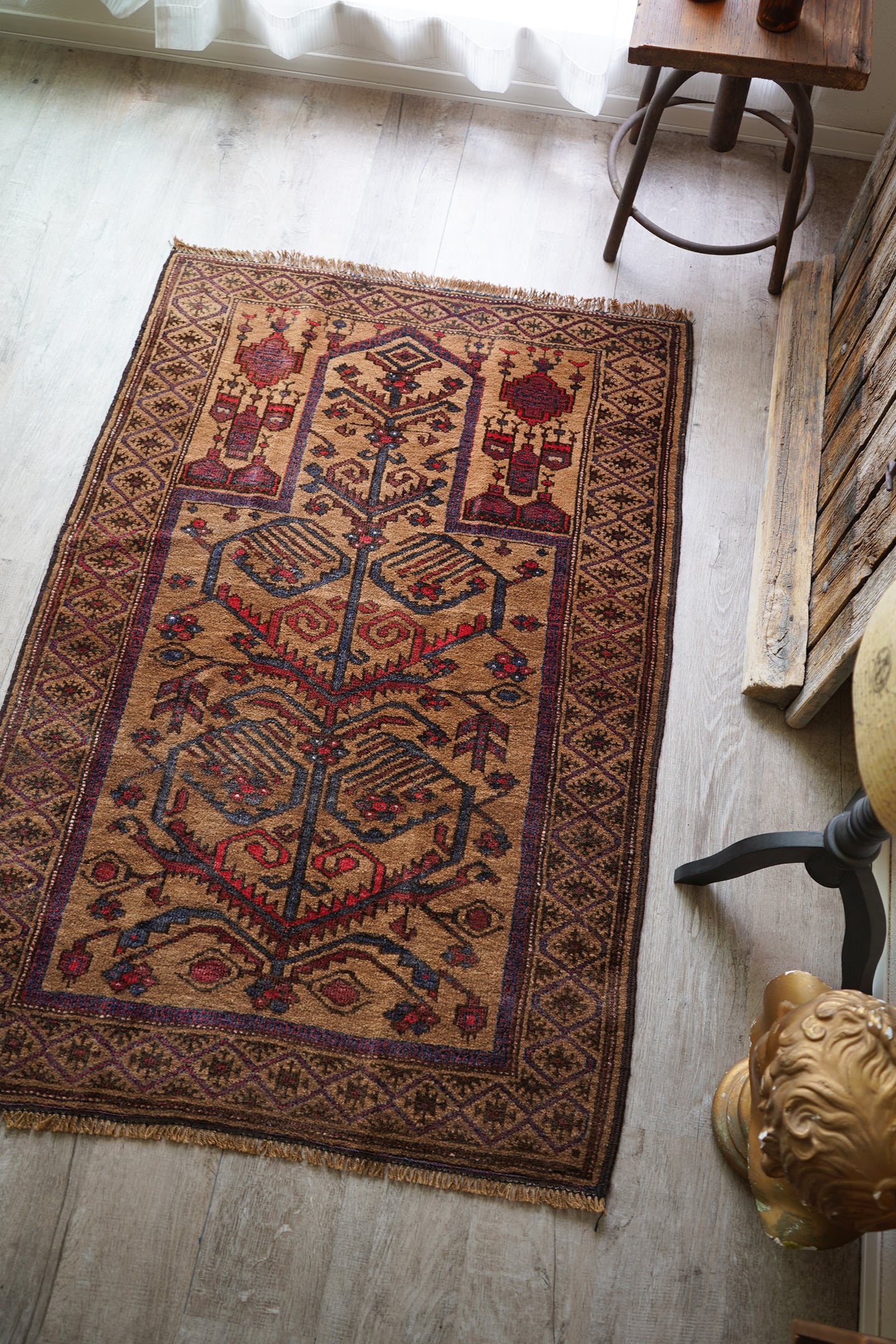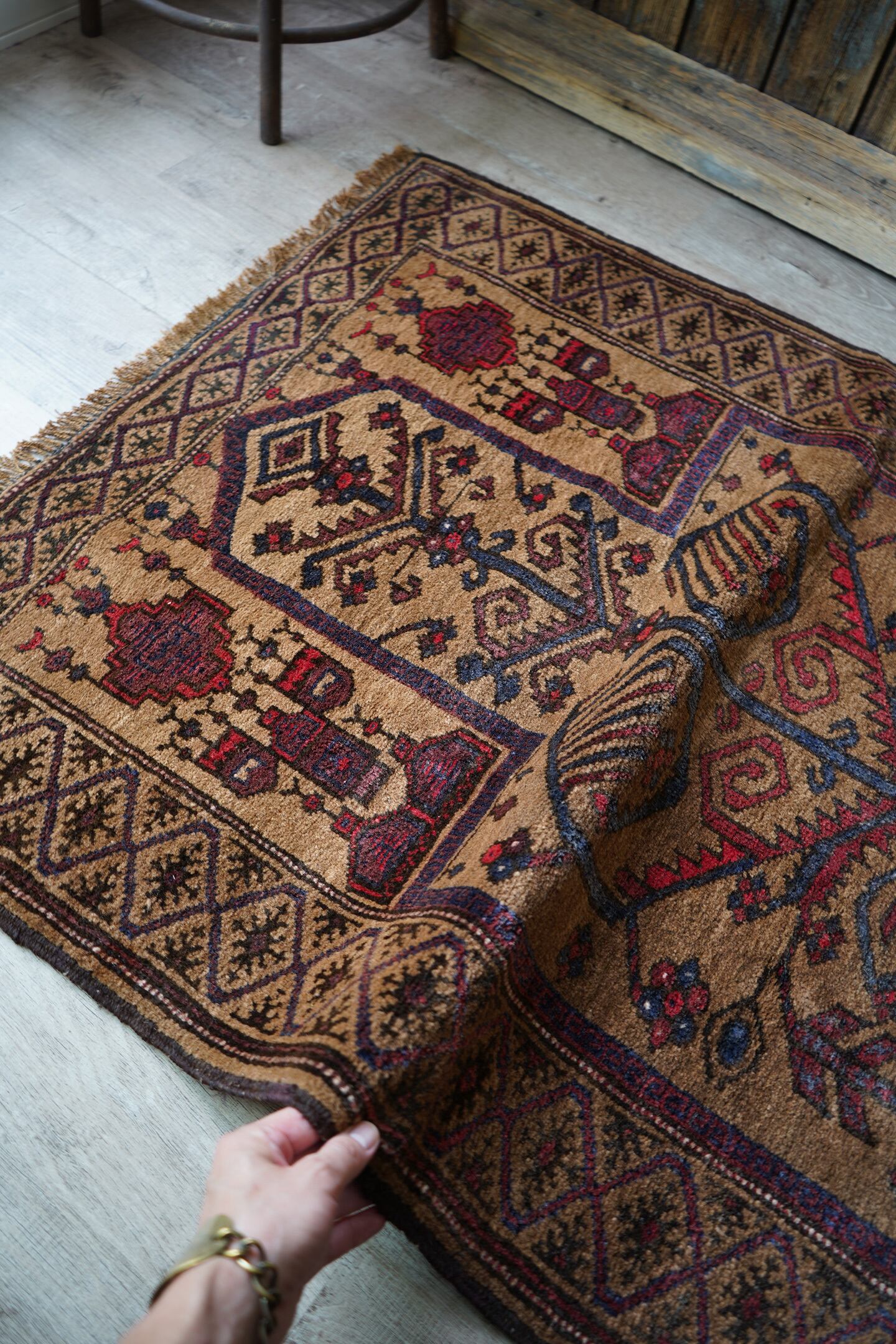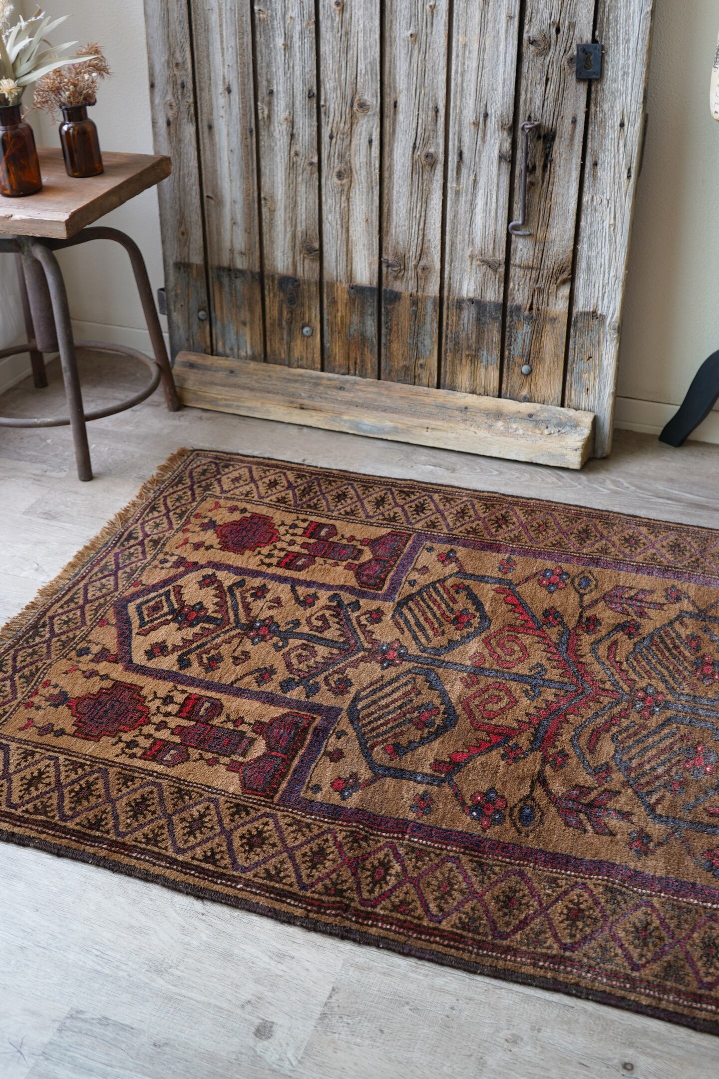 ふわふわとした柔らかく気持ちの肌触りのアフガニスタン産のバルーチラグ。草花モチーフのデザインで、キャメルとブラウンをベースにした配色に赤がアクセントカラーになった素敵な一枚です。厚みは8mm程度。目立ったダメージもなく、状態も良好です。リビングをはじめ、お好きなスペースにどうぞ♫