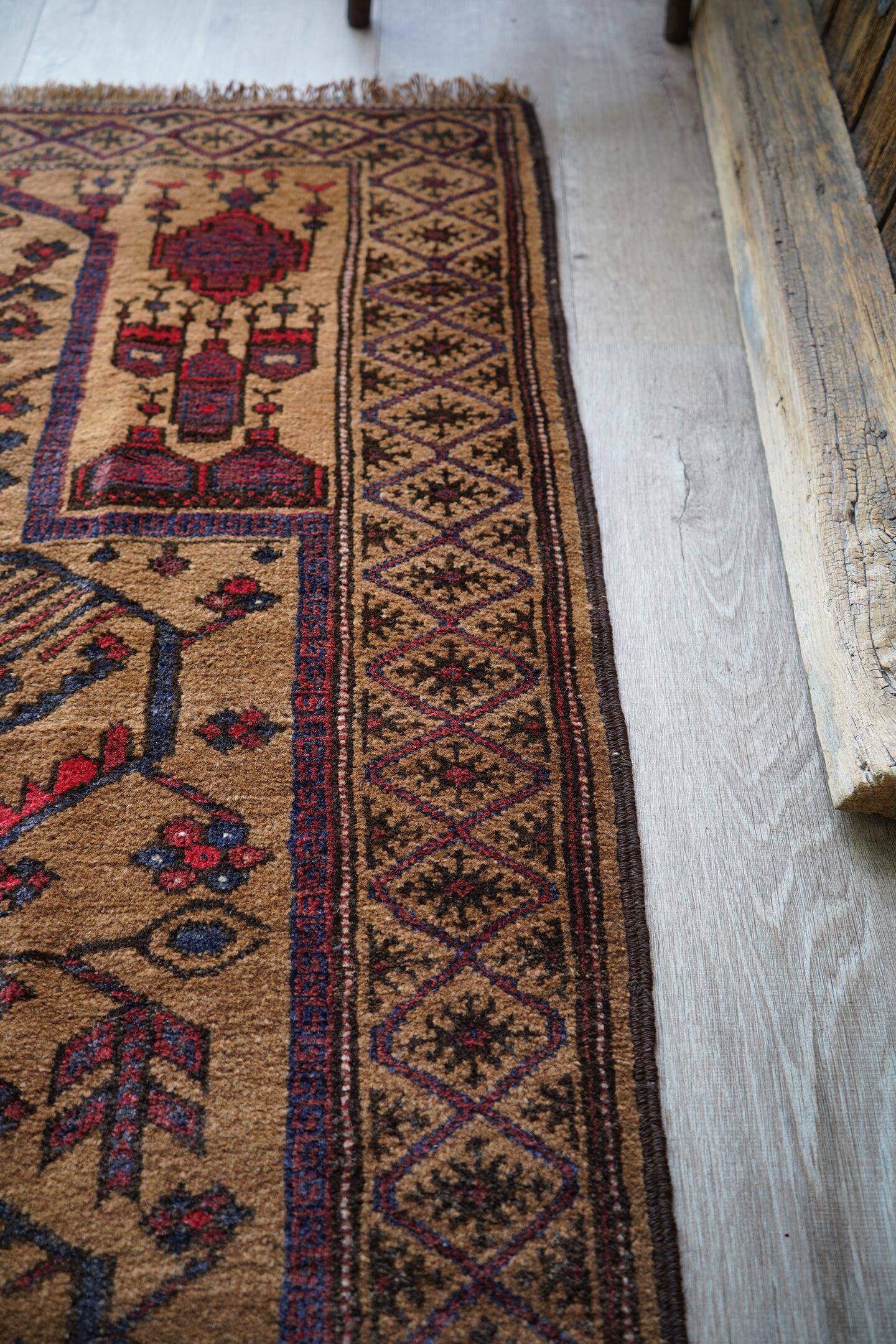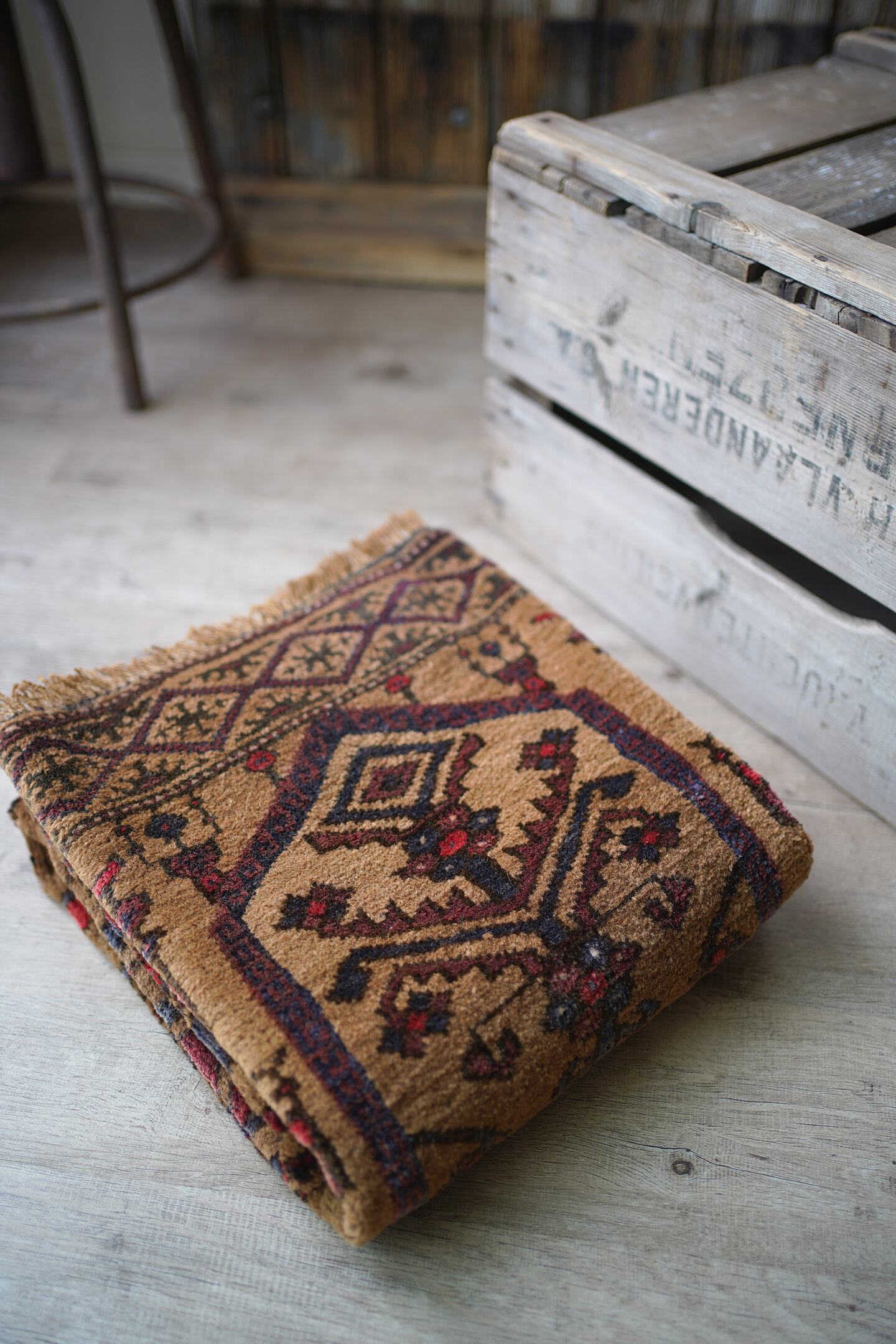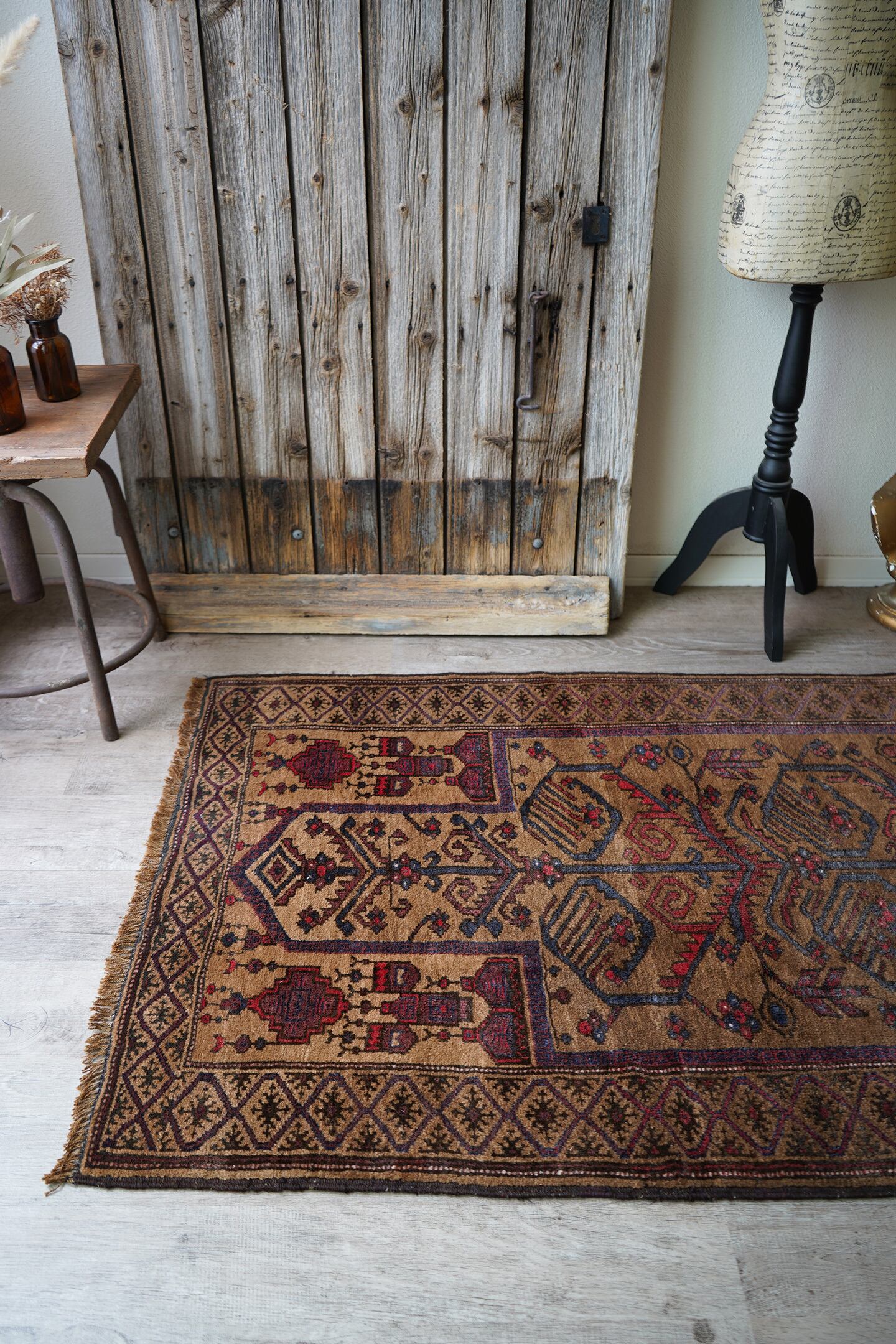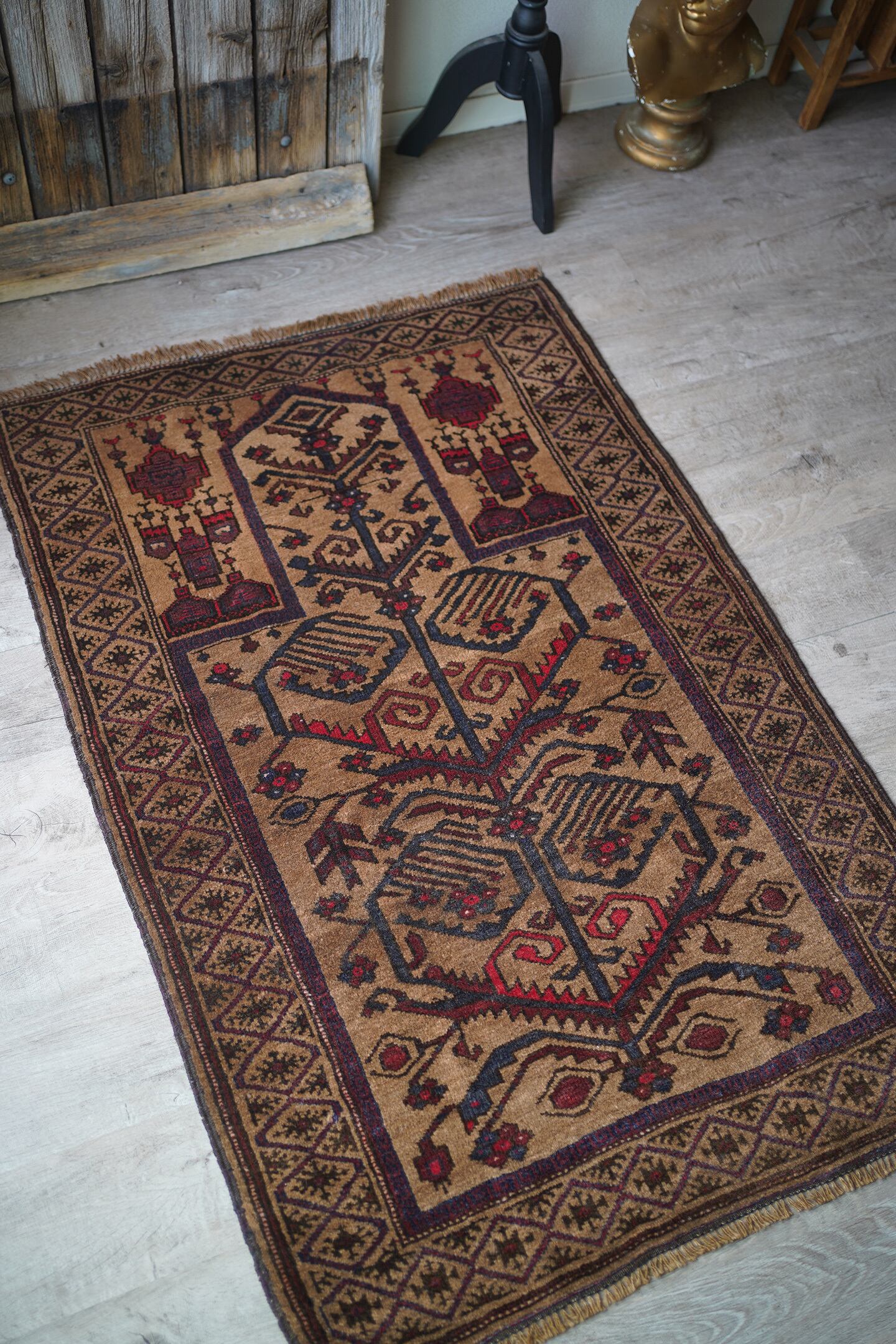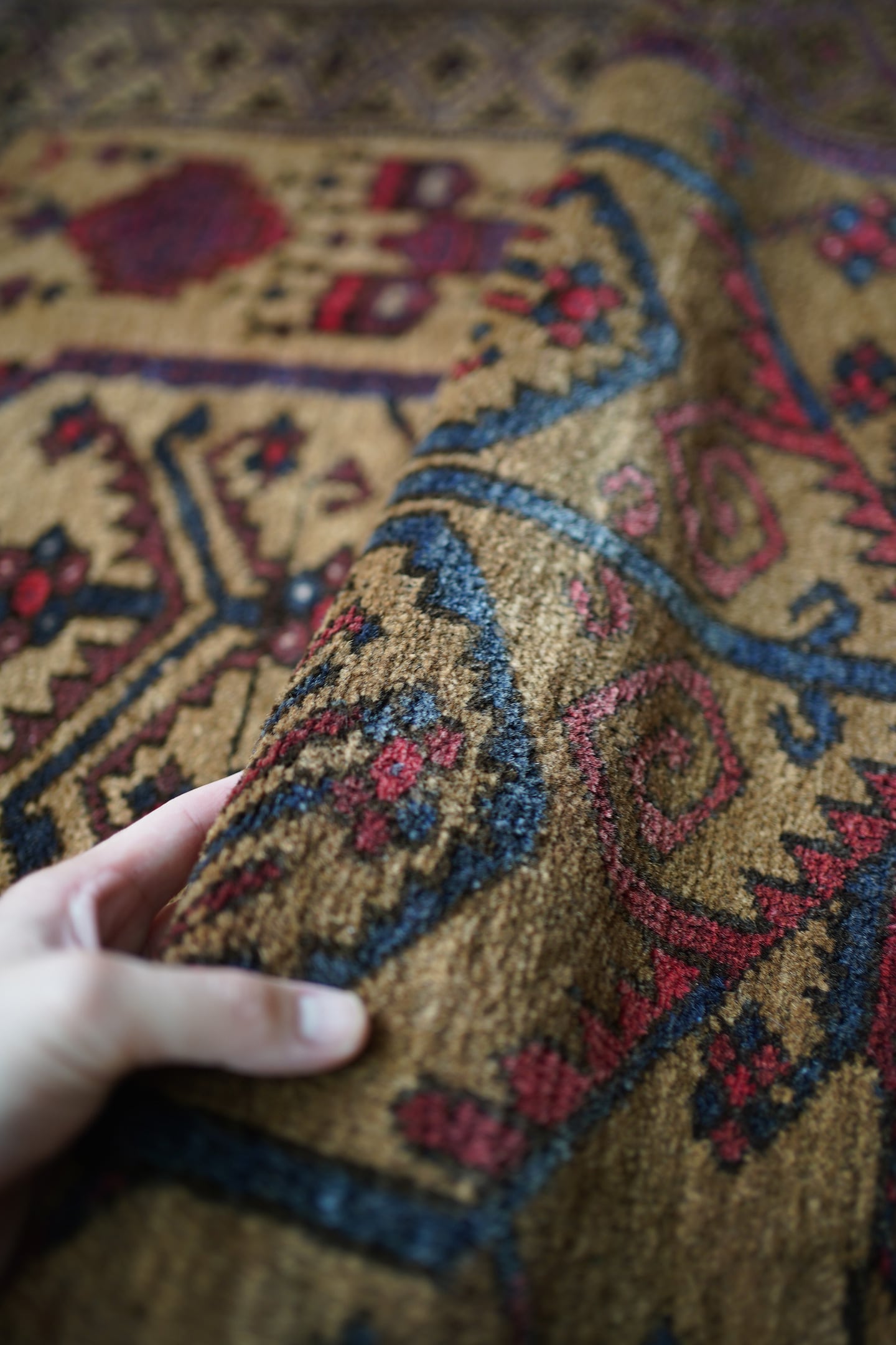 ふわふわとした柔らかく気持ちの肌触りのアフガニスタン産のバルーチラグ。草花モチーフのデザインで、キャメルとブラウンをベースにした配色に赤がアクセントカラーになった素敵な一枚です。厚みは8mm程度。目立ったダメージもなく、状態も良好です。リビングをはじめ、お好きなスペースにどうぞ♫