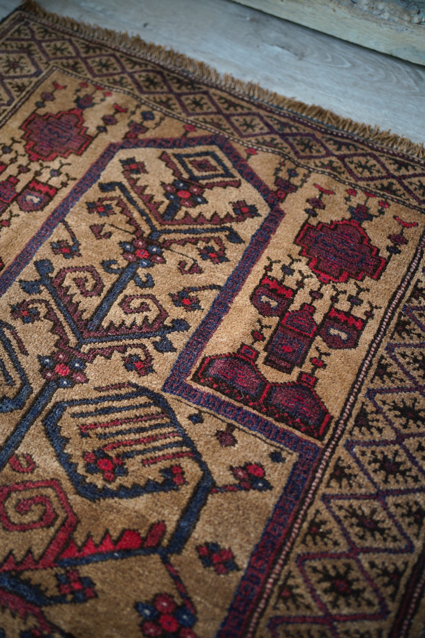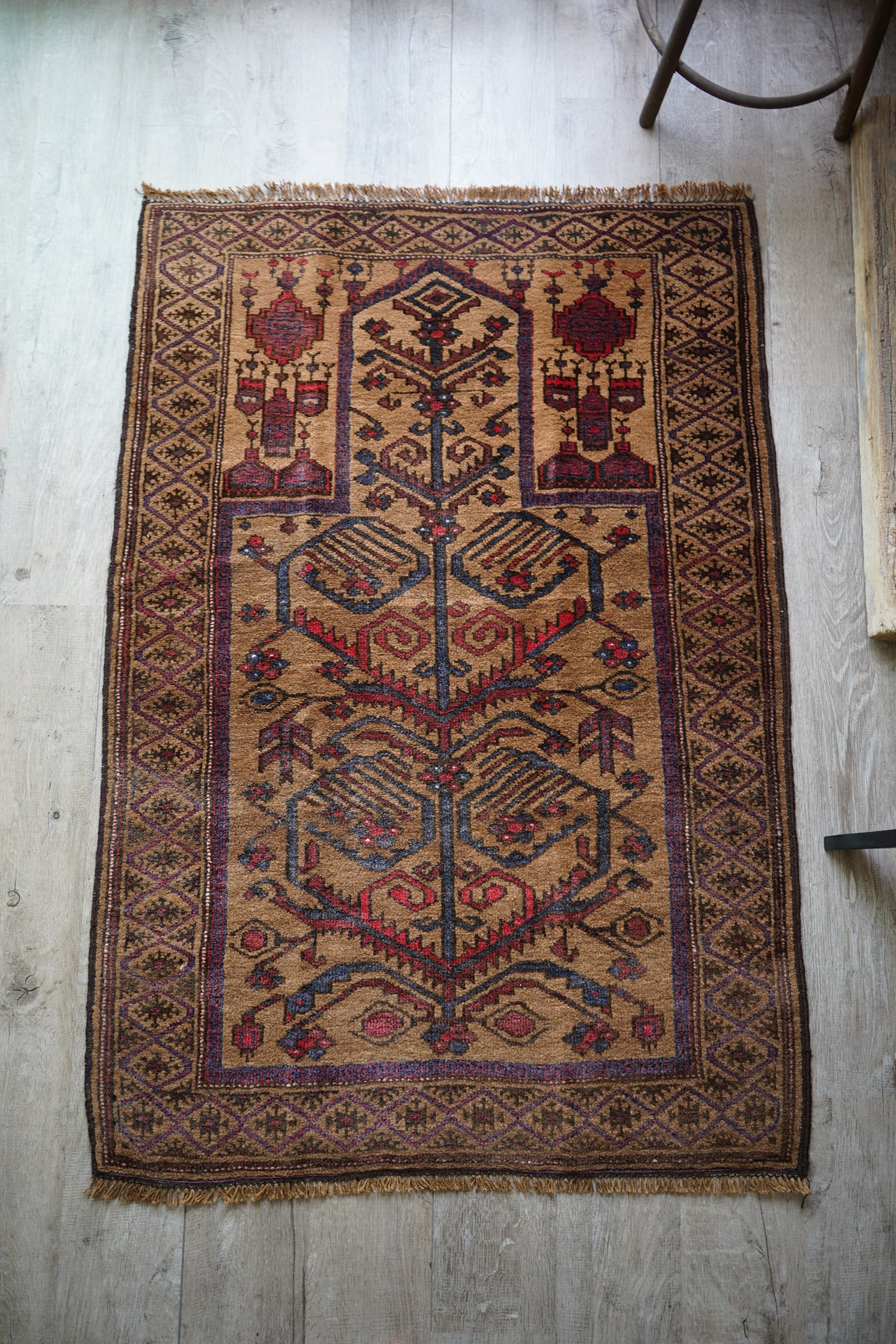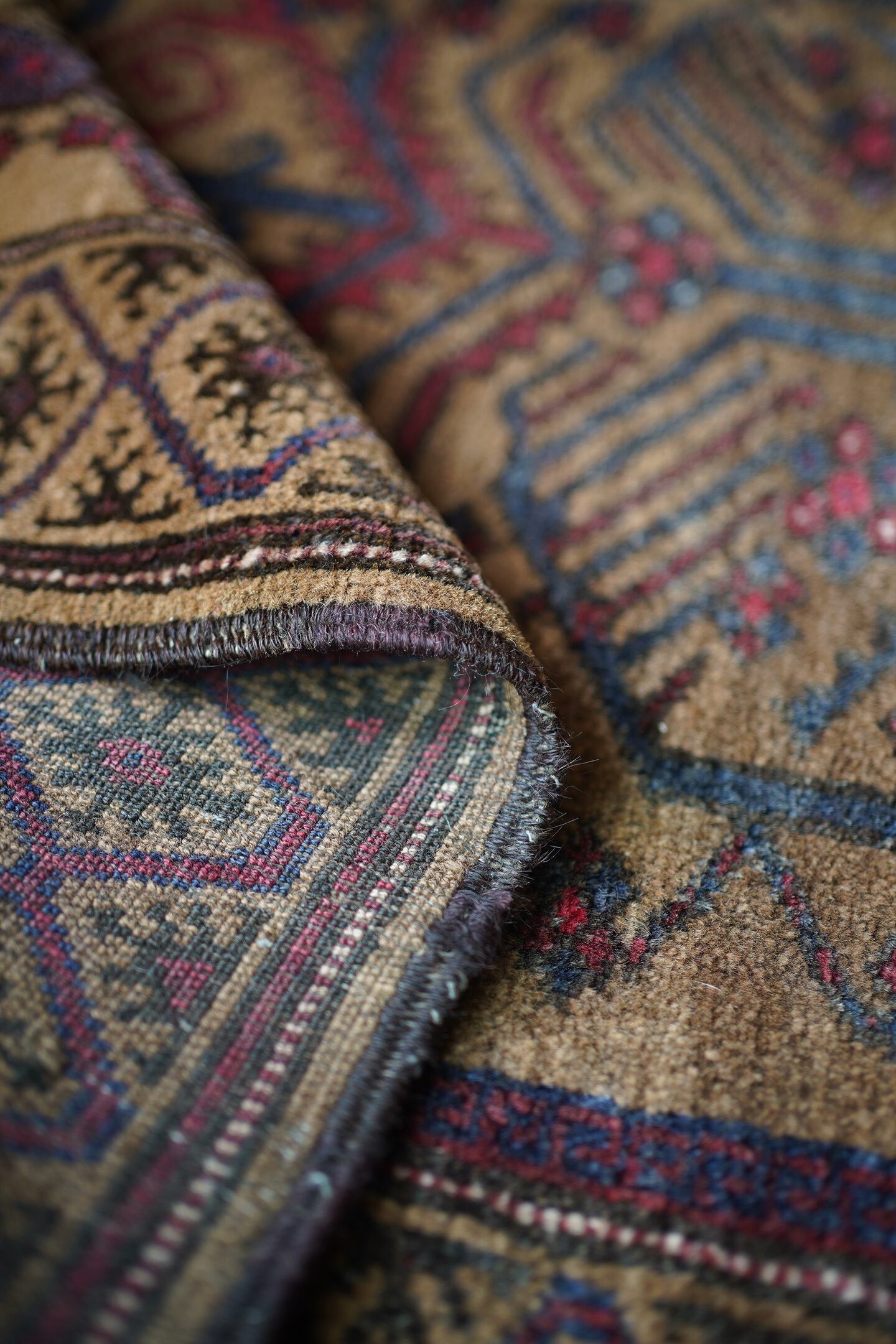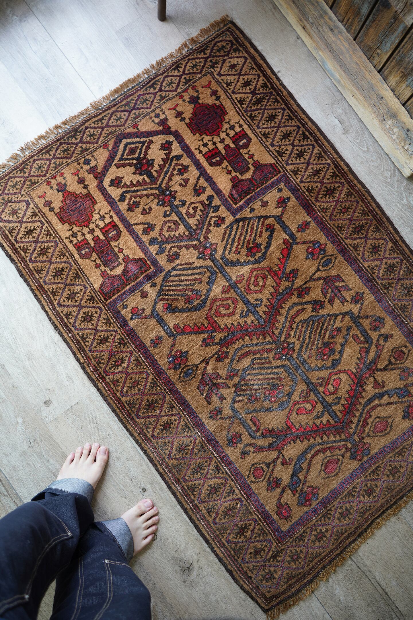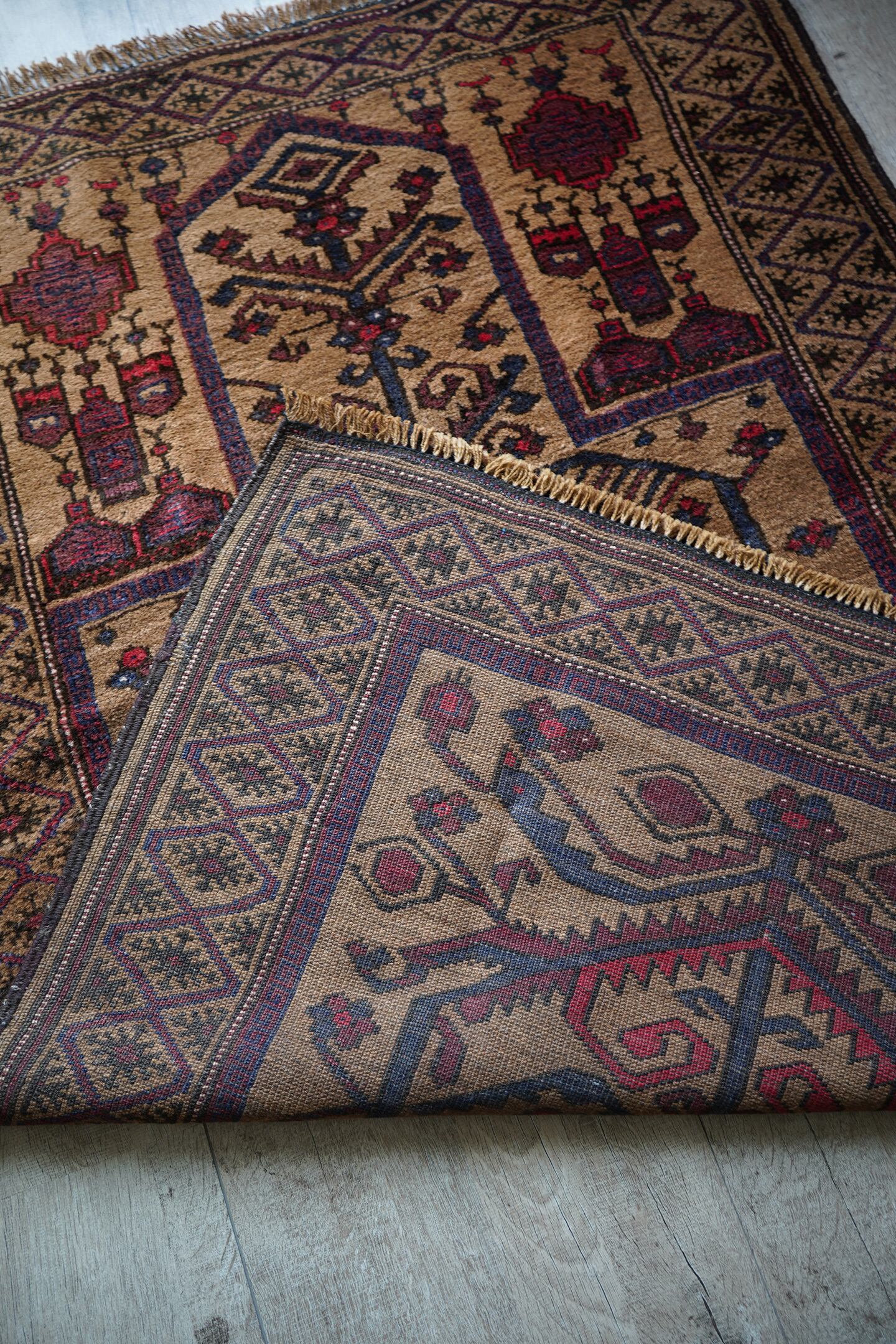 ふわふわとした柔らかく気持ちの肌触りのアフガニスタン産のバルーチラグ。草花モチーフのデザインで、キャメルとブラウンをベースにした配色に赤がアクセントカラーになった素敵な一枚です。厚みは8mm程度。目立ったダメージもなく、状態も良好です。リビングをはじめ、お好きなスペースにどうぞ♫