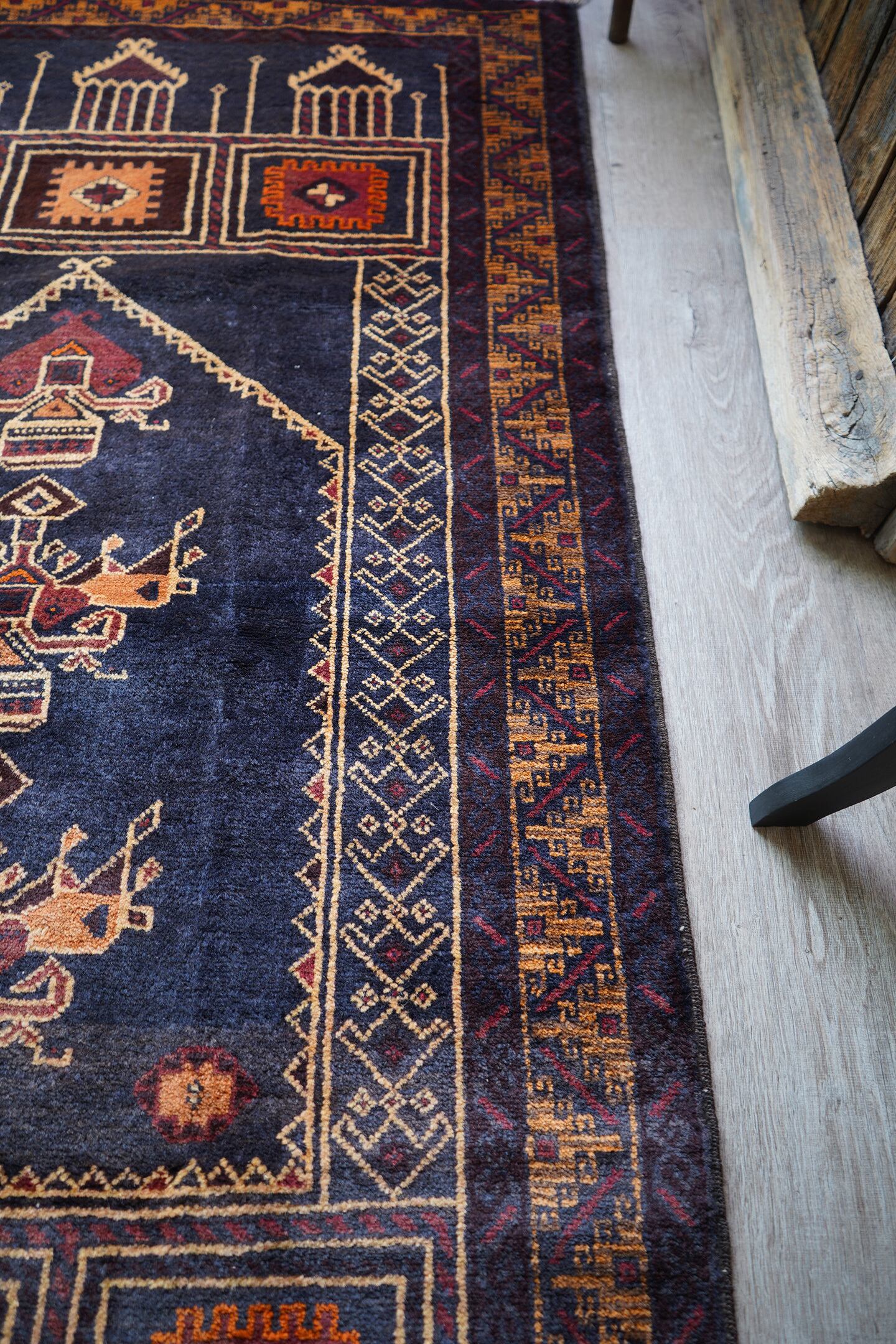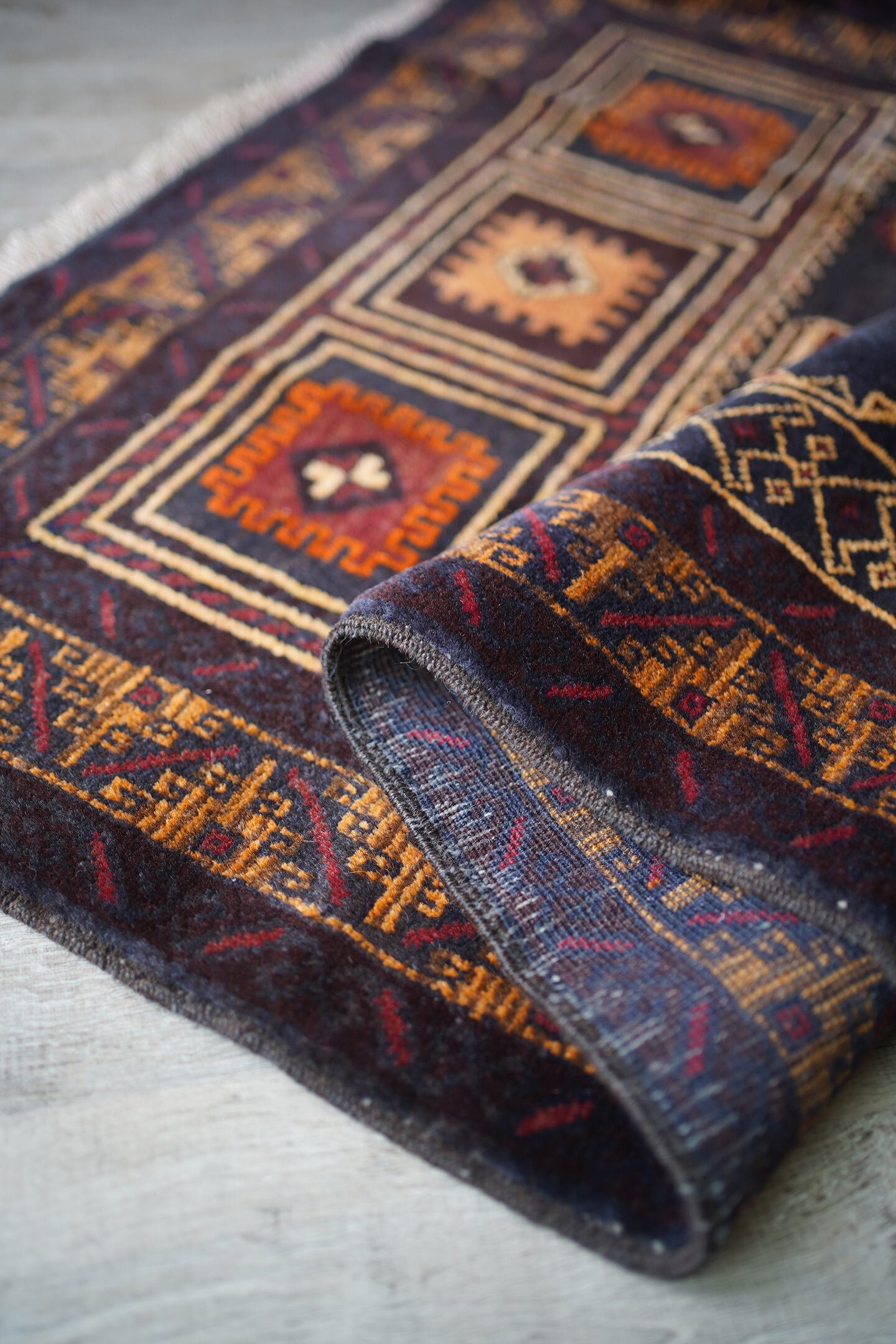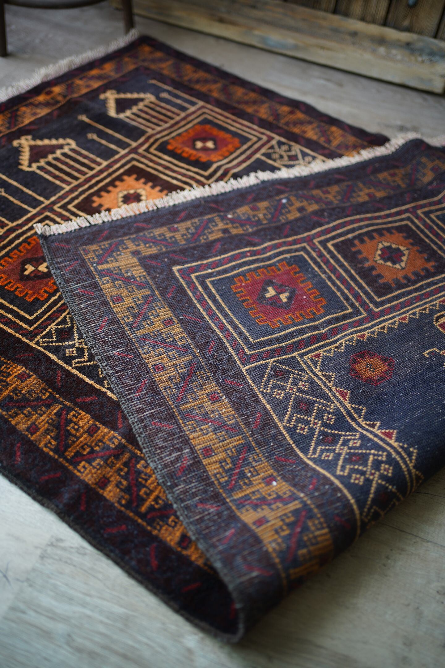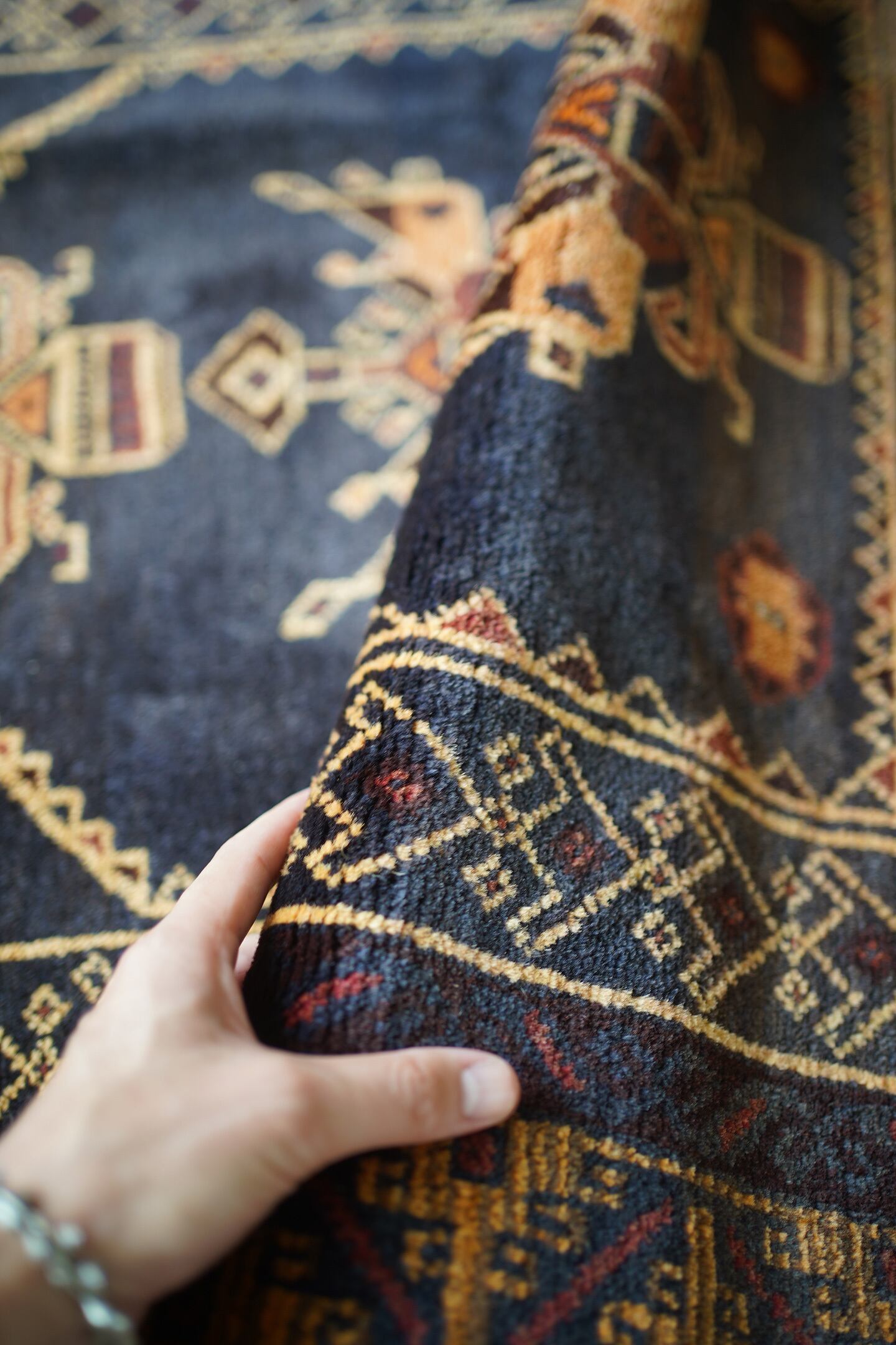 ふわっと柔らかく気持ちの良い優しい肌触りのアフガンバルーチ。コントラストがはっきりしたデザインに惹かれて仕入れを決めた一枚です。"ミフラーブ"と呼ばれるイスラム建築由来の紋様のデザインで、中には花瓶のような模様が織り込まれています。配色は濃紺をベースに焦茶、ブラウン、赤茶、オレンジが使われています。厚みは8mm〜9mm程度。ほとんど目立ちませんが、一部セルベッジで薄くなっている箇所がありますので、お写真最後をご参照ください。ベッドサイドなどに1枚サッと敷くだけでカッコよくなりそうですね♫
