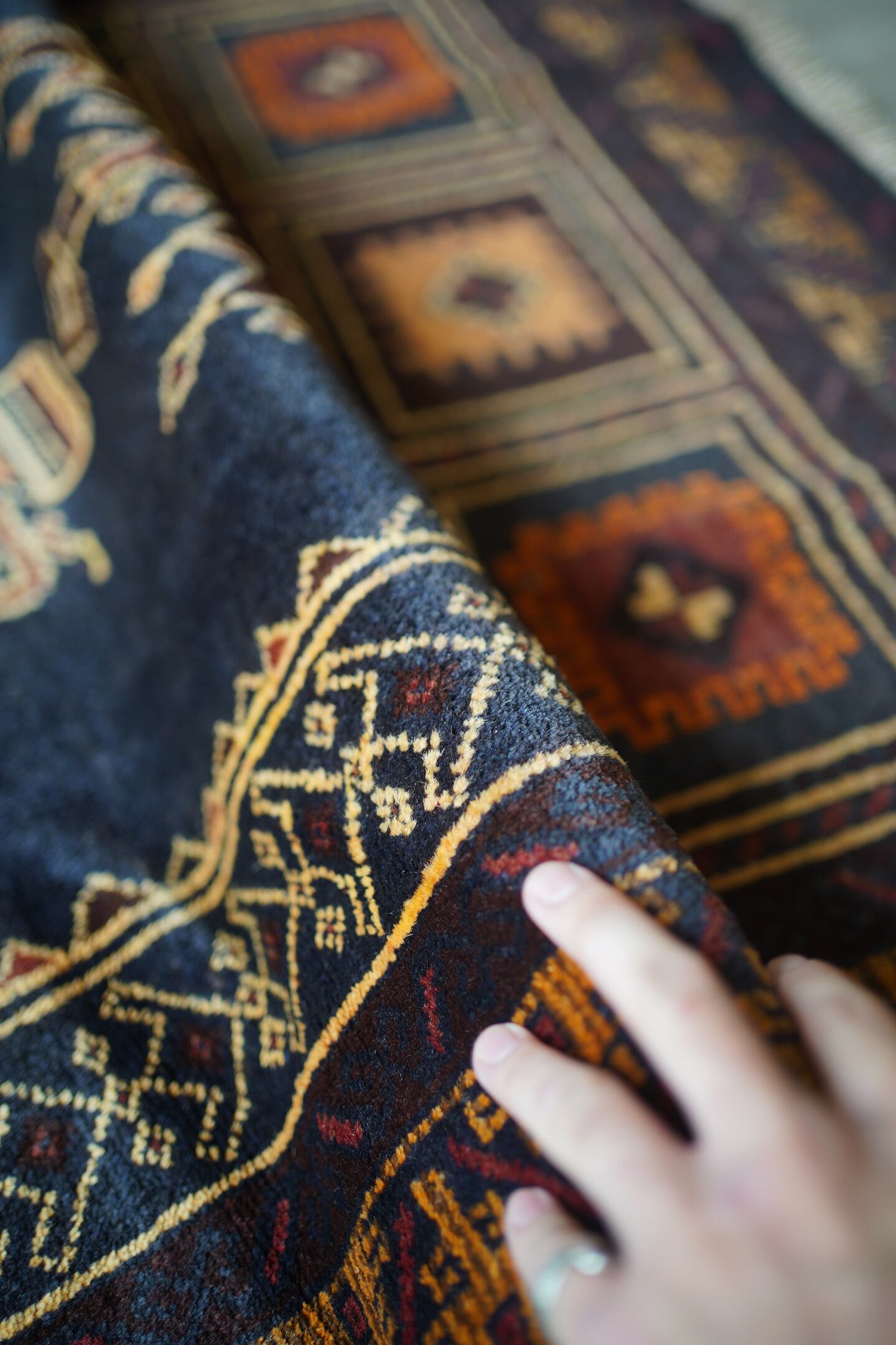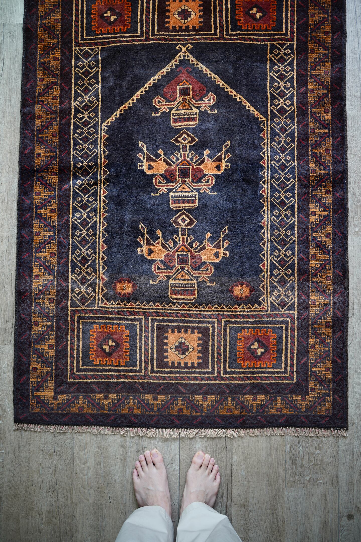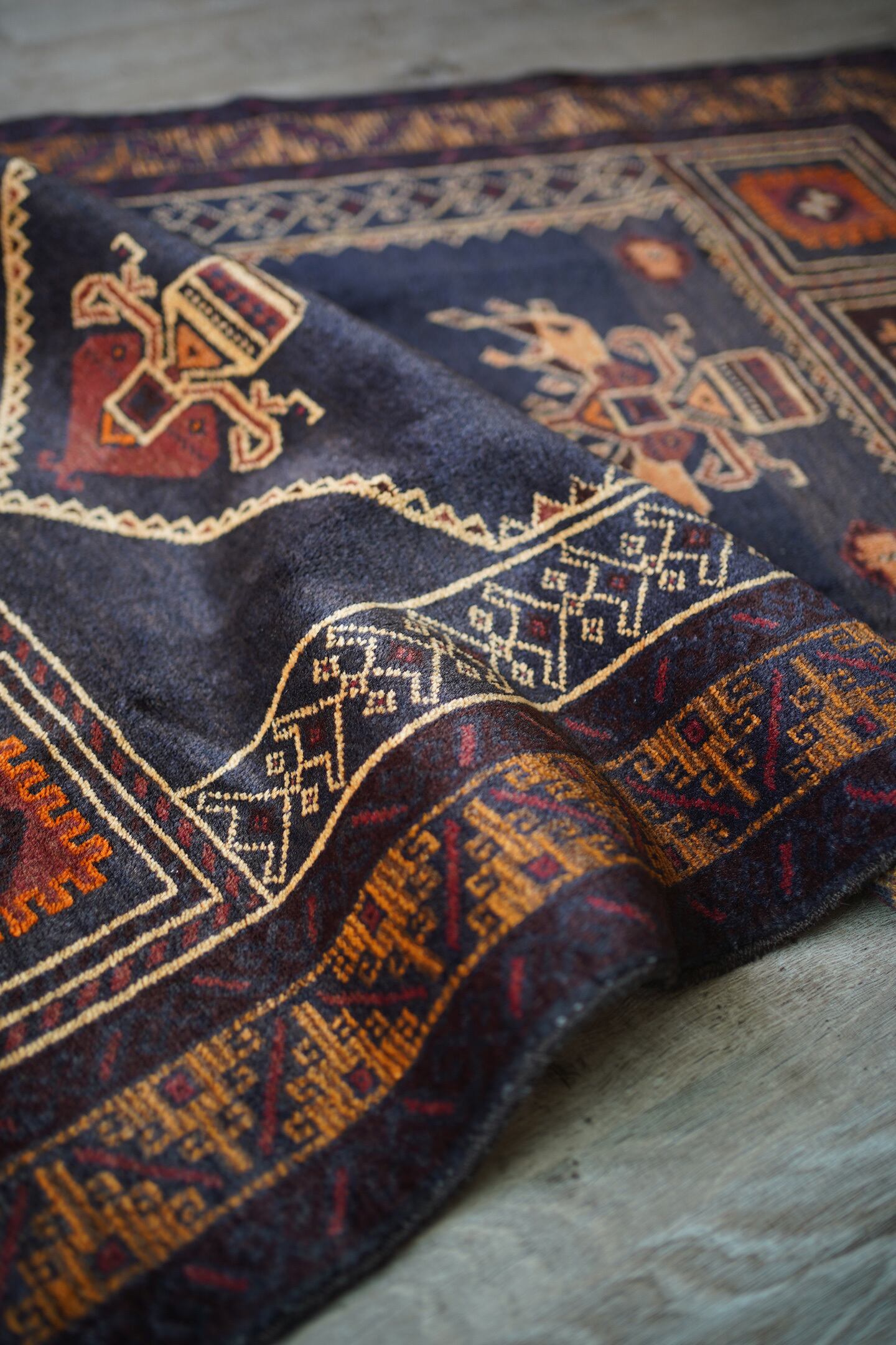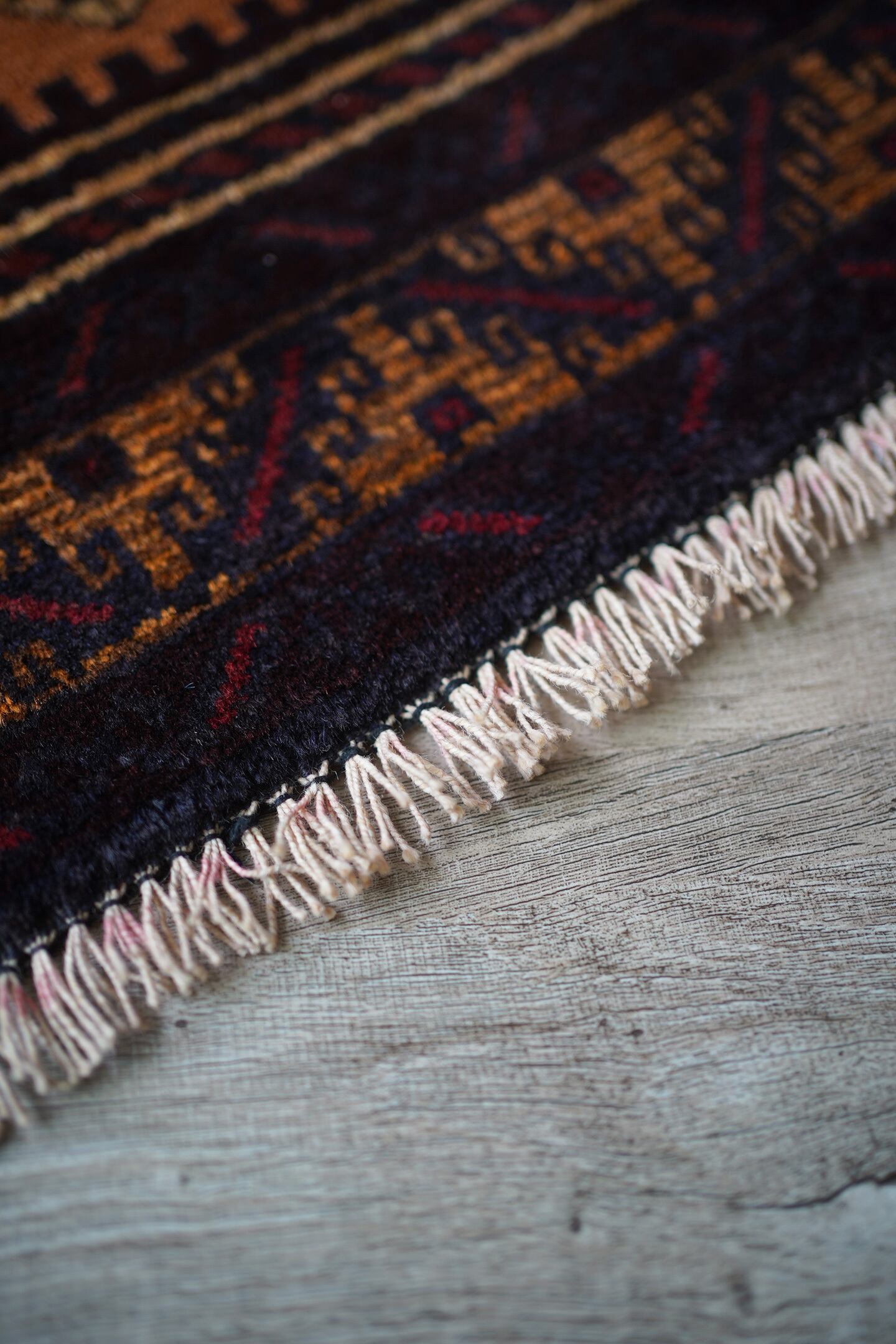 ふわっと柔らかく気持ちの良い優しい肌触りのアフガンバルーチ。コントラストがはっきりしたデザインに惹かれて仕入れを決めた一枚です。"ミフラーブ"と呼ばれるイスラム建築由来の紋様のデザインで、中には花瓶のような模様が織り込まれています。配色は濃紺をベースに焦茶、ブラウン、赤茶、オレンジが使われています。厚みは8mm〜9mm程度。ほとんど目立ちませんが、一部セルベッジで薄くなっている箇所がありますので、お写真最後をご参照ください。ベッドサイドなどに1枚サッと敷くだけでカッコよくなりそうですね♫