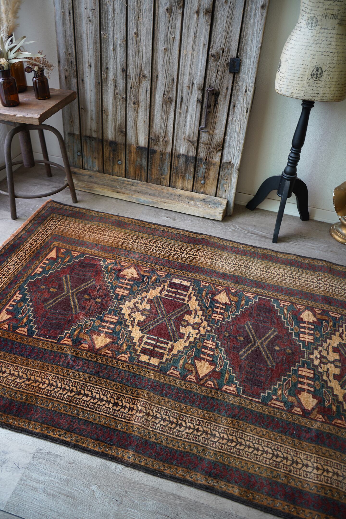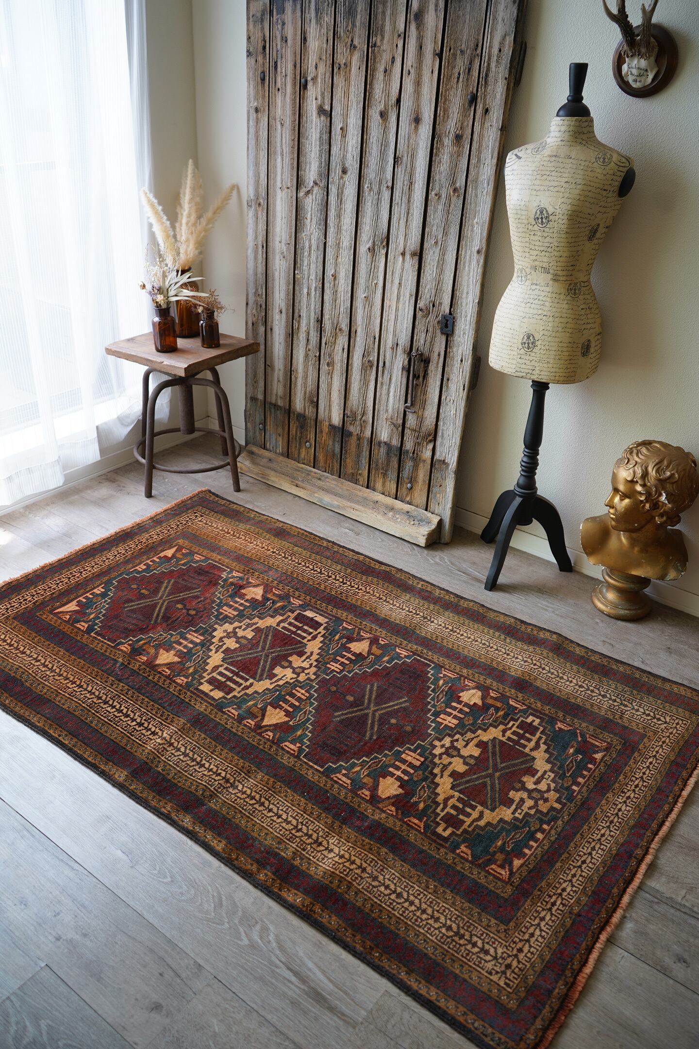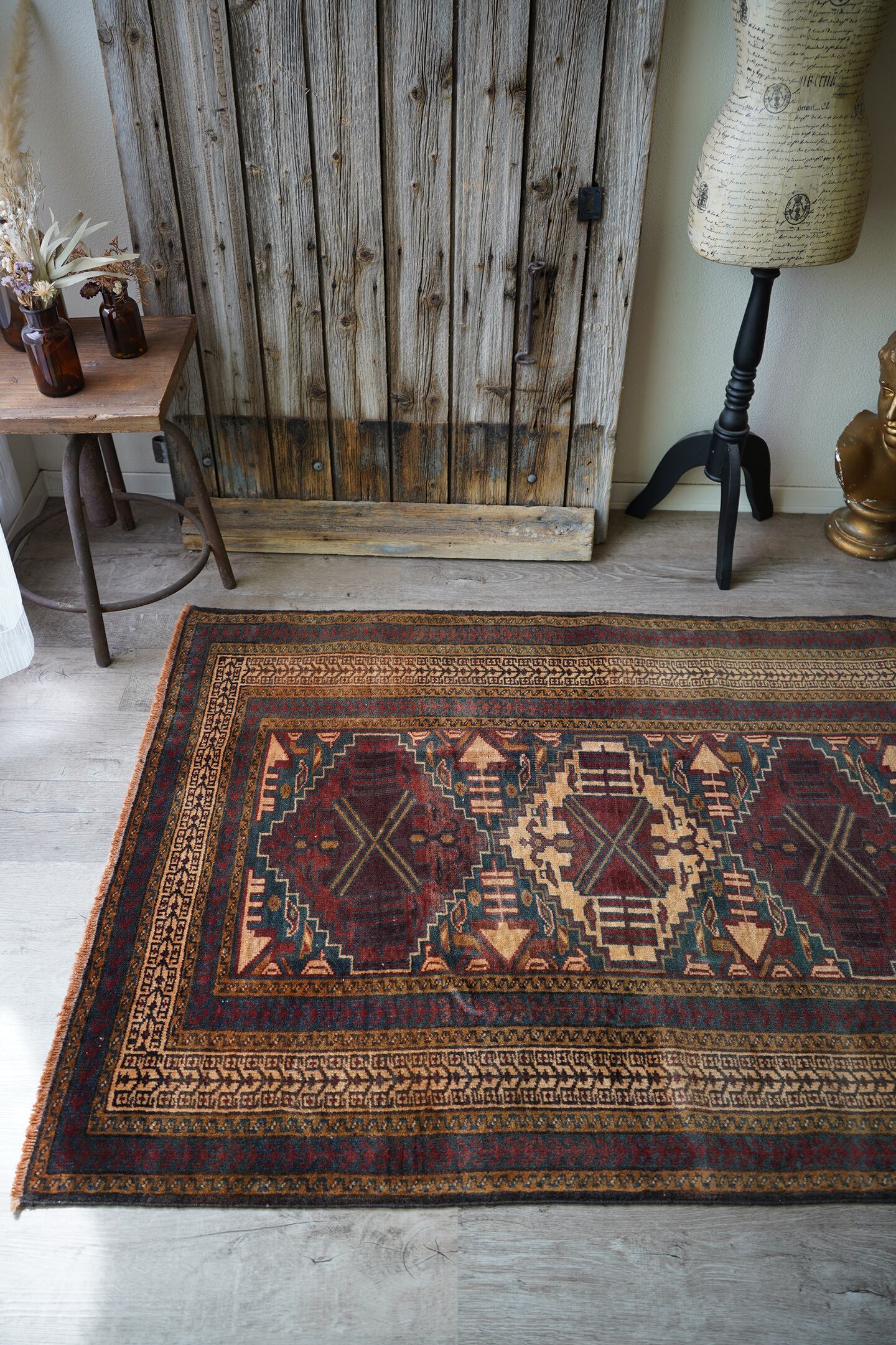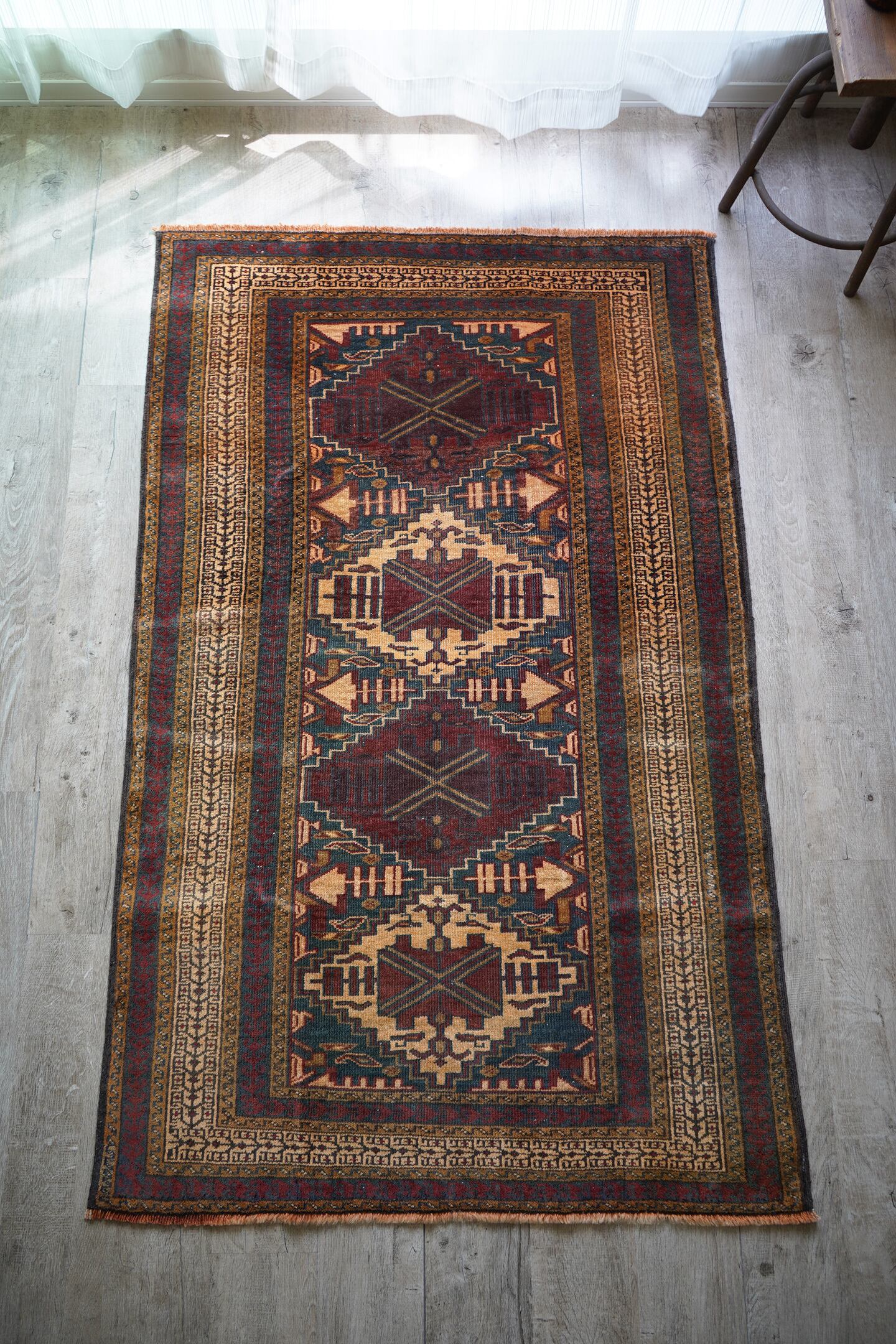 おおよそ60年前に織られたアフガニスタン産のバルーチラグ。菱形紋様とボーダーの細かい連続模様で全体のバランスが取れたデザインが美しいです。焦茶、ブラウン、オレンジベージュ、ブルーグリーンと落ち着いた色合いで様々なインテリアに馴染みやすいカラーリングかと思います。表面のパイルは短めで、サラッとしなやかな肌触り。張りのある質感のラグで、厚みは5mm〜6mm程度。ダメージもなく、状態も大変良好です。渋い色味がアンティーク家具とも相性が良さそうですね♫