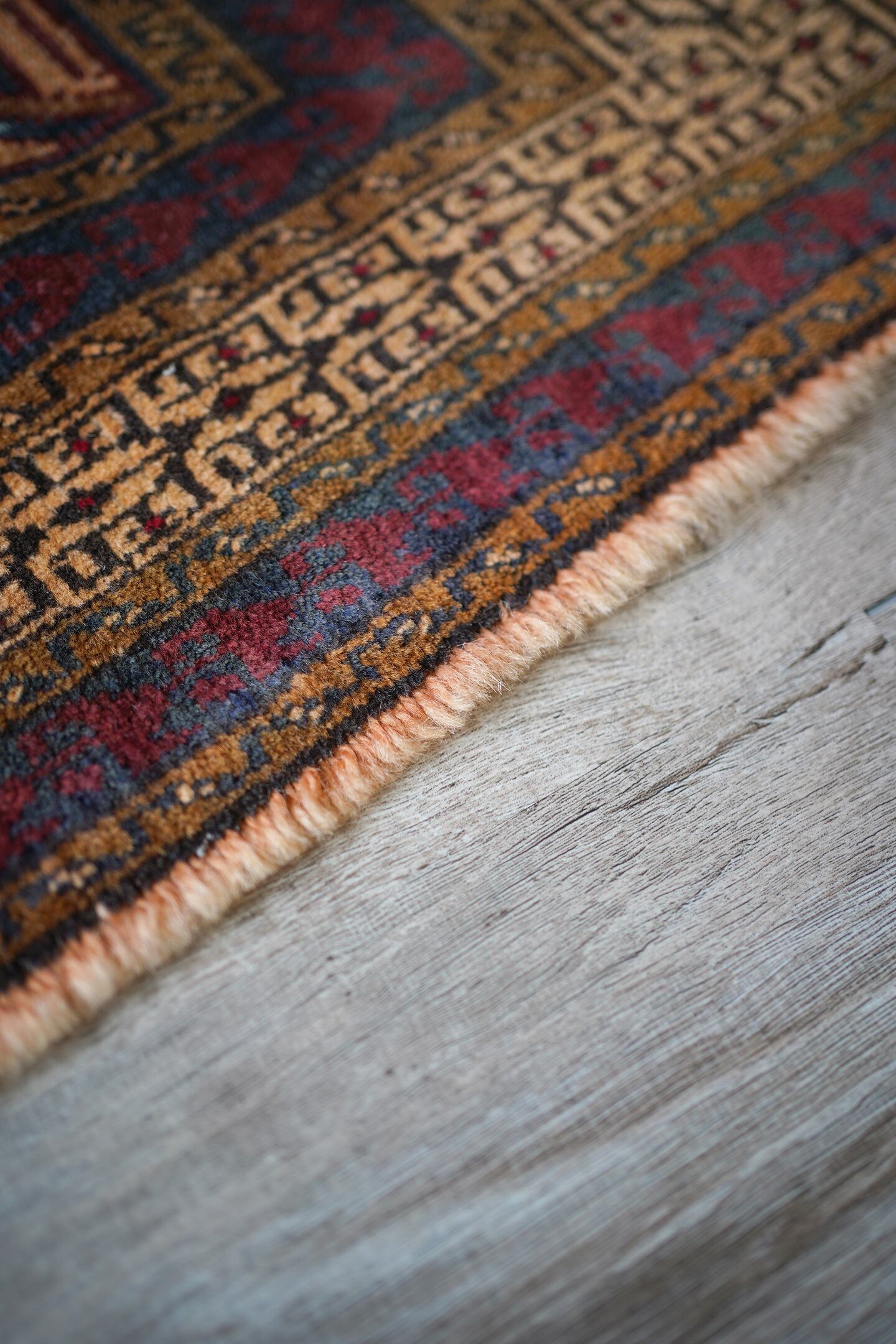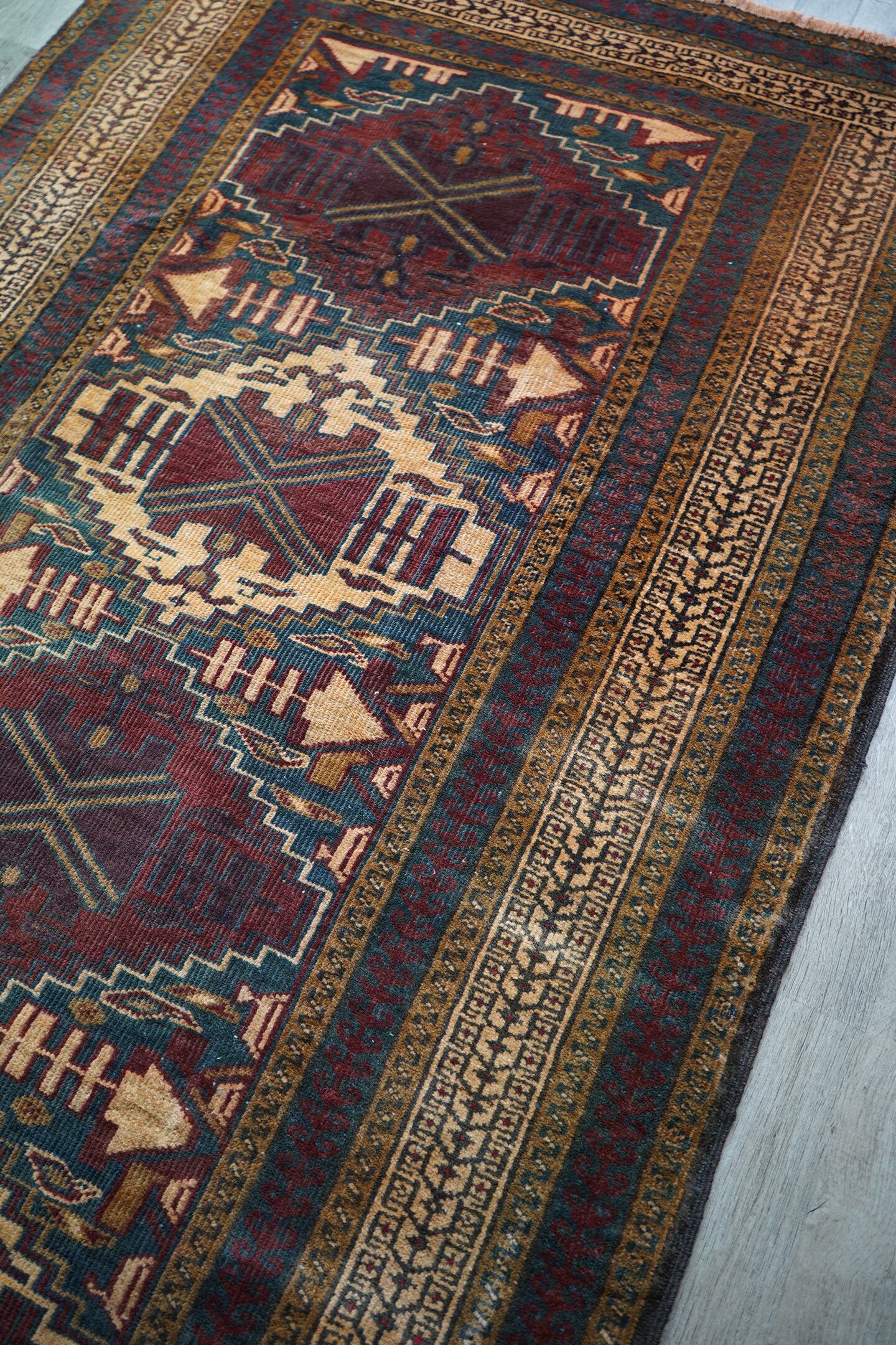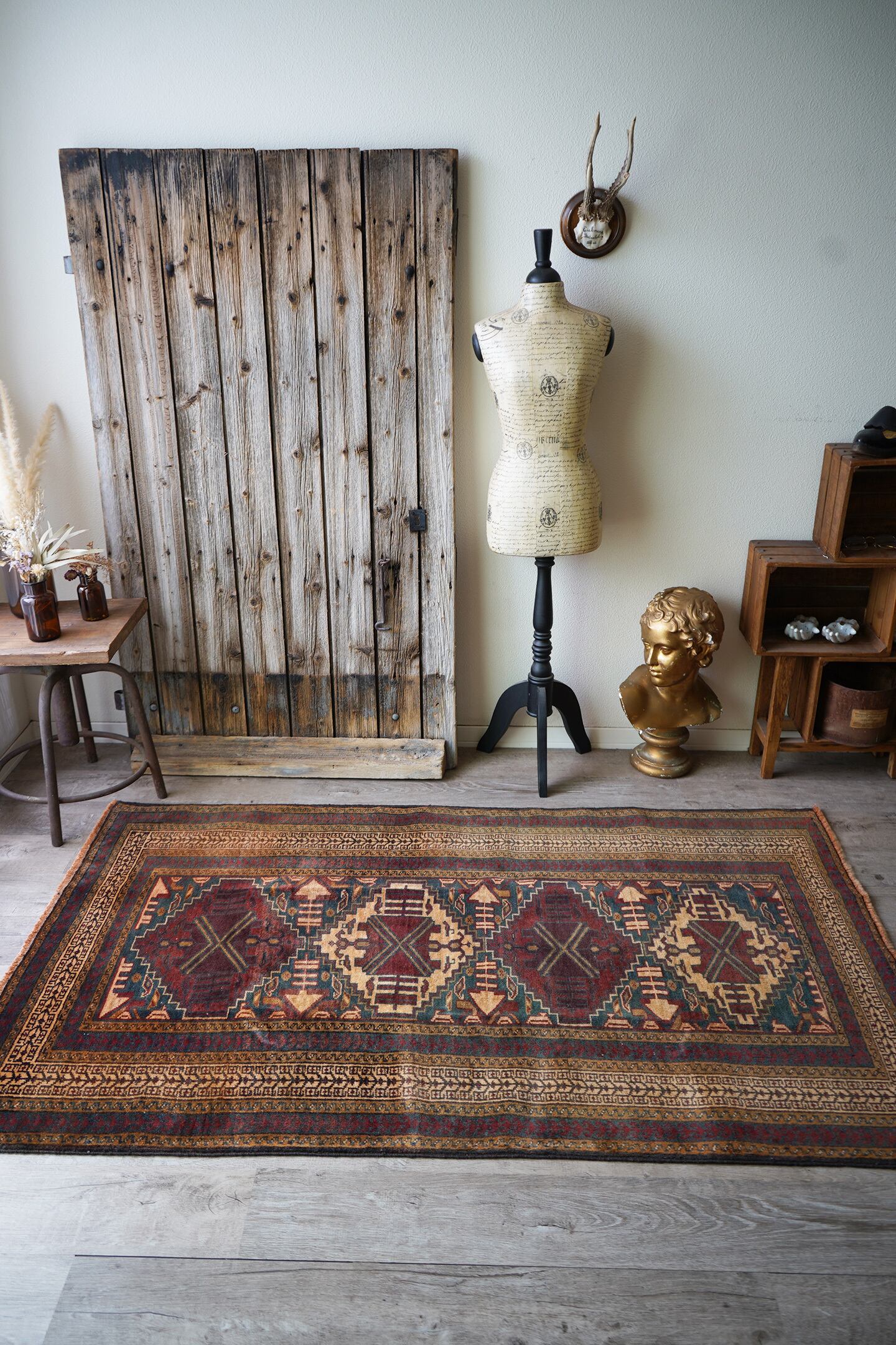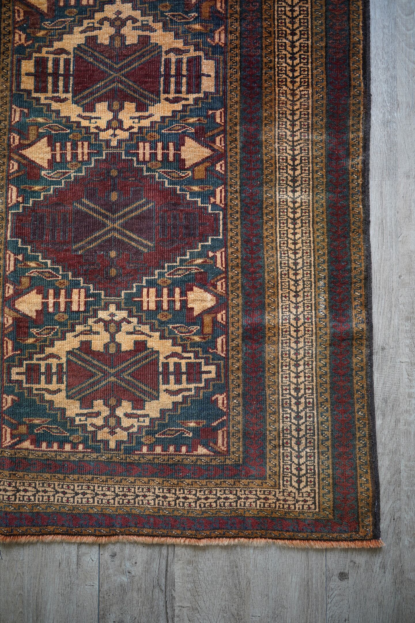 おおよそ60年前に織られたアフガニスタン産のバルーチラグ。菱形紋様とボーダーの細かい連続模様で全体のバランスが取れたデザインが美しいです。焦茶、ブラウン、オレンジベージュ、ブルーグリーンと落ち着いた色合いで様々なインテリアに馴染みやすいカラーリングかと思います。表面のパイルは短めで、サラッとしなやかな肌触り。張りのある質感のラグで、厚みは5mm〜6mm程度。ダメージもなく、状態も大変良好です。渋い色味がアンティーク家具とも相性が良さそうですね♫