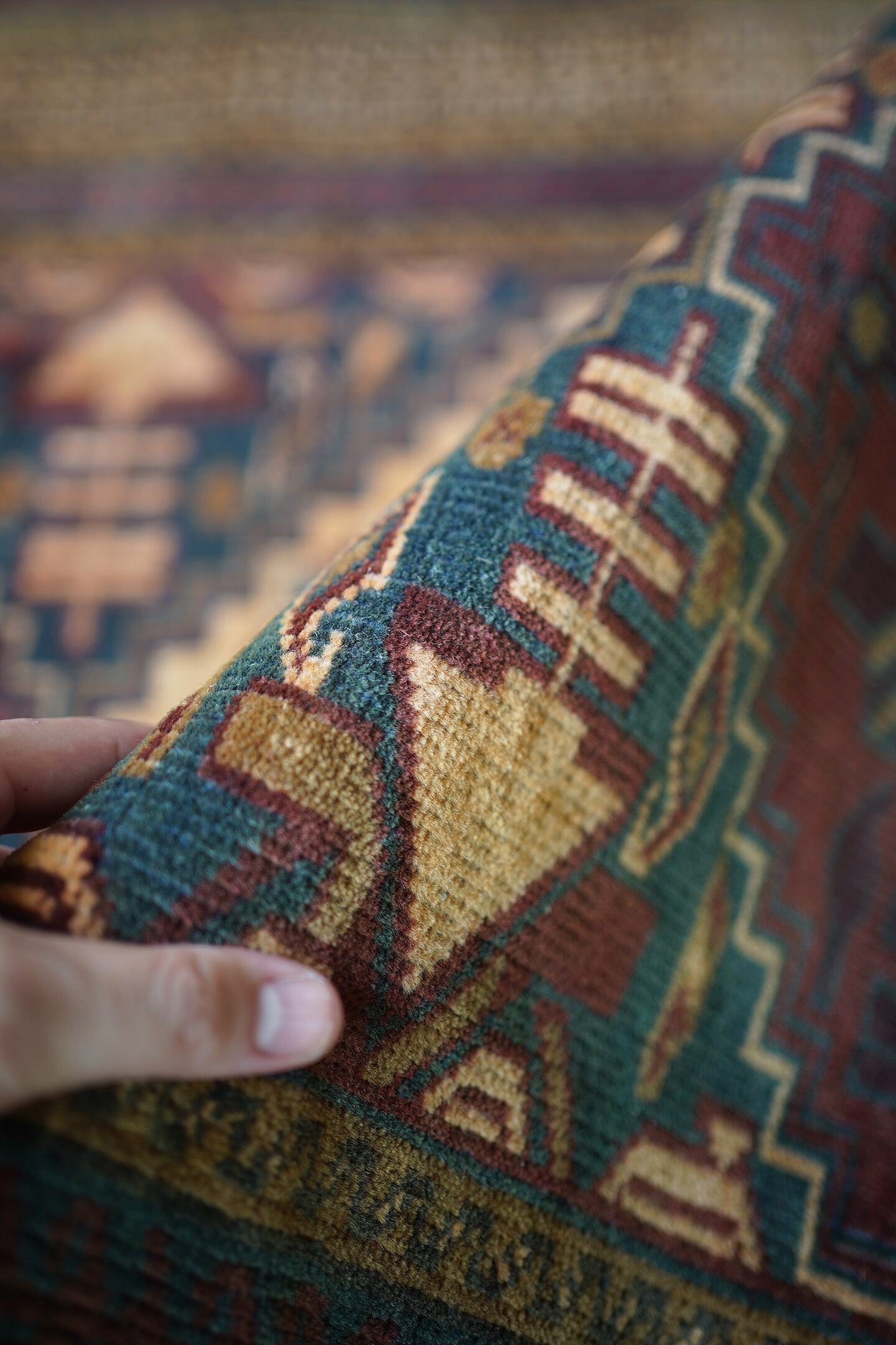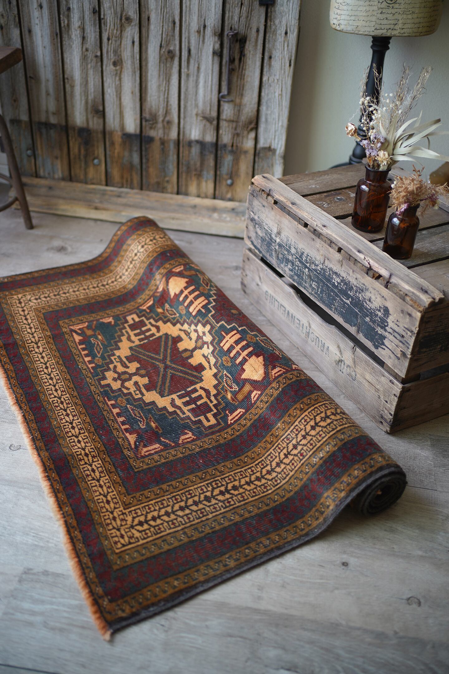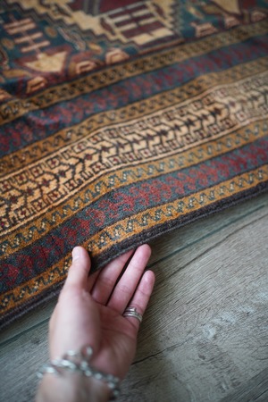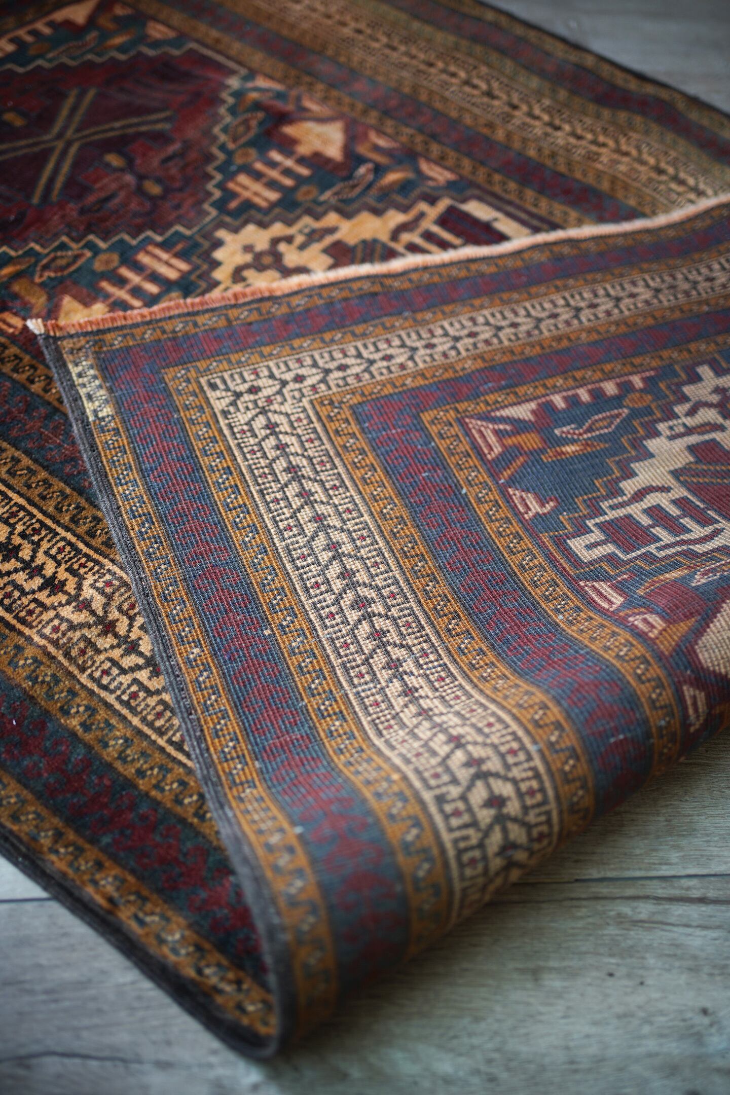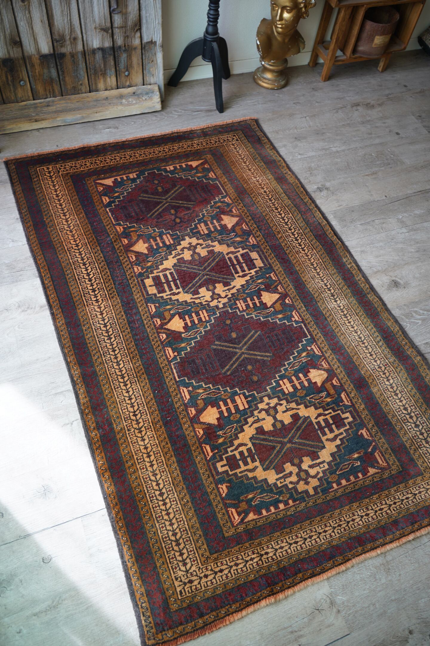 おおよそ60年前に織られたアフガニスタン産のバルーチラグ。菱形紋様とボーダーの細かい連続模様で全体のバランスが取れたデザインが美しいです。焦茶、ブラウン、オレンジベージュ、ブルーグリーンと落ち着いた色合いで様々なインテリアに馴染みやすいカラーリングかと思います。表面のパイルは短めで、サラッとしなやかな肌触り。張りのある質感のラグで、厚みは5mm〜6mm程度。ダメージもなく、状態も大変良好です。渋い色味がアンティーク家具とも相性が良さそうですね♫