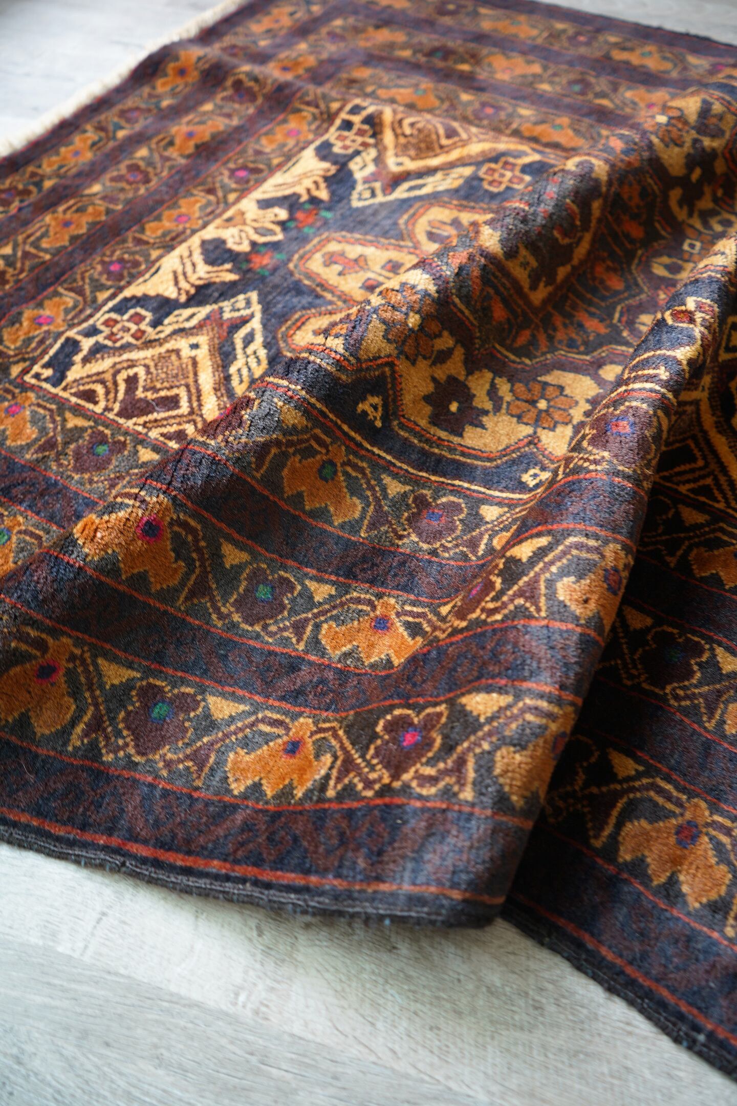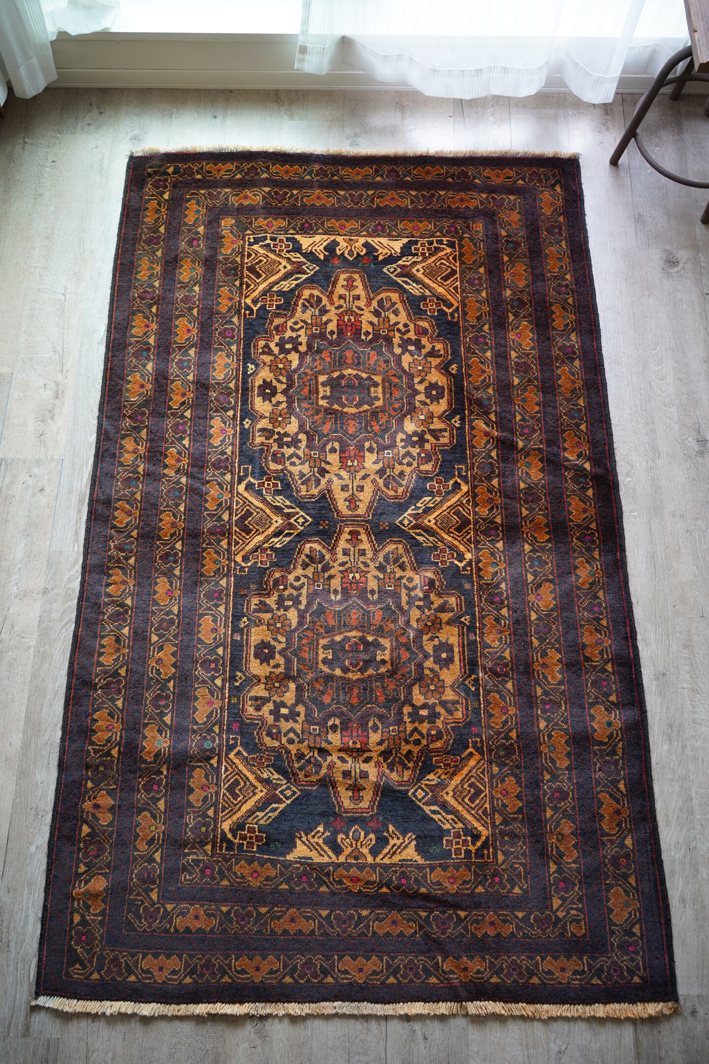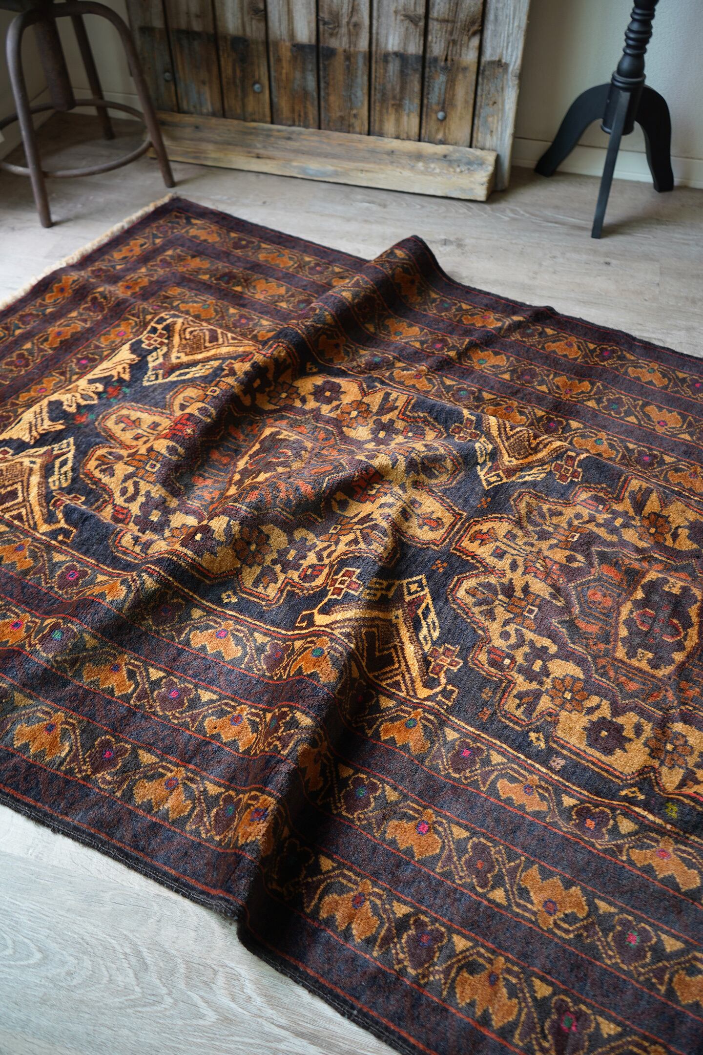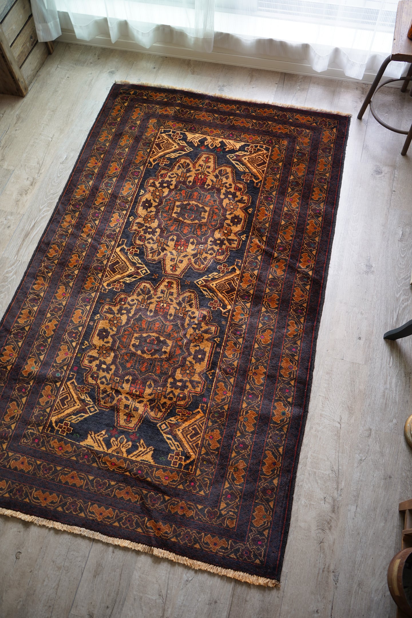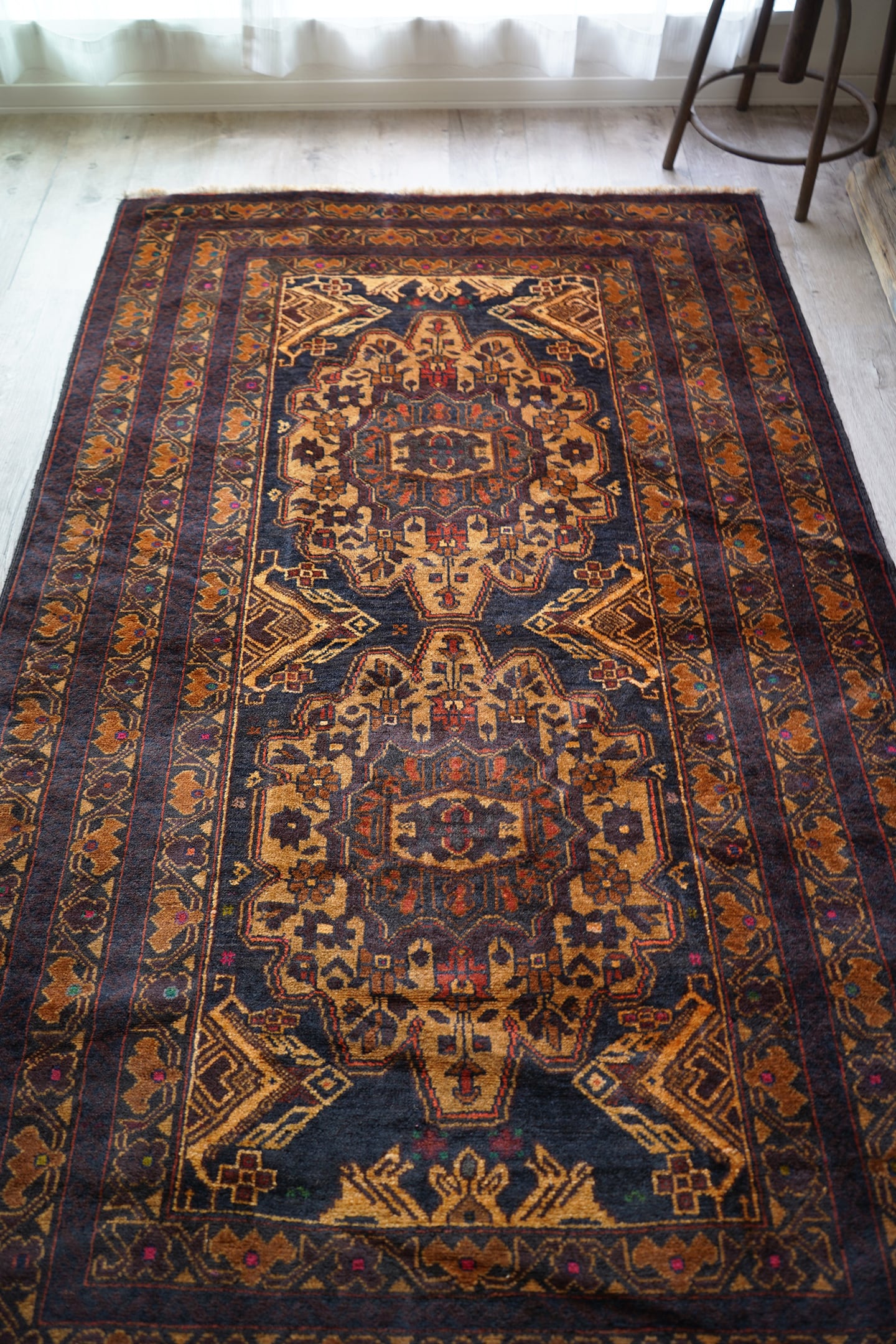 シャンデリアのような2つの大きなメダリオンが特徴的なアフガニスタン産のバルーチラグ。濃紺、ブラウン、焦茶べースのシックな配色で、パイル全体に艶があり大変美しい一枚です。ボーダーには差し色でダークグリーンや暗めのピンクなどが使われており、素敵なアクセントカラーになっています。厚みは6mm程度で、表面の毛並みはふわっと滑らかな気持ちの良い肌触り。目立ったダメージもなく、コンディションも良好です。リビングをはじめ、ソファ前やベッドサイドなどに敷くだけでバチッとカッコよくなりそうな、間違いない一枚。