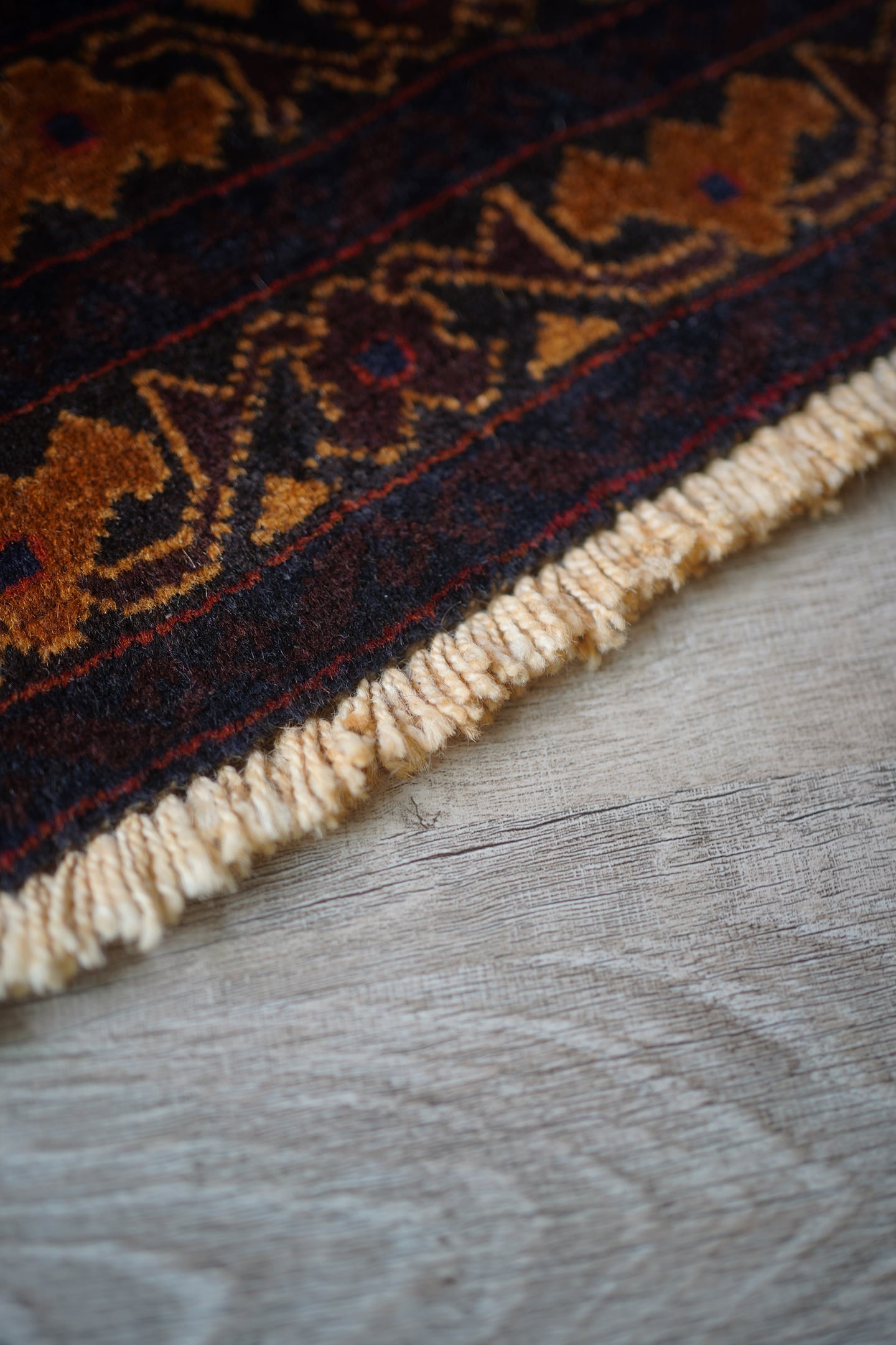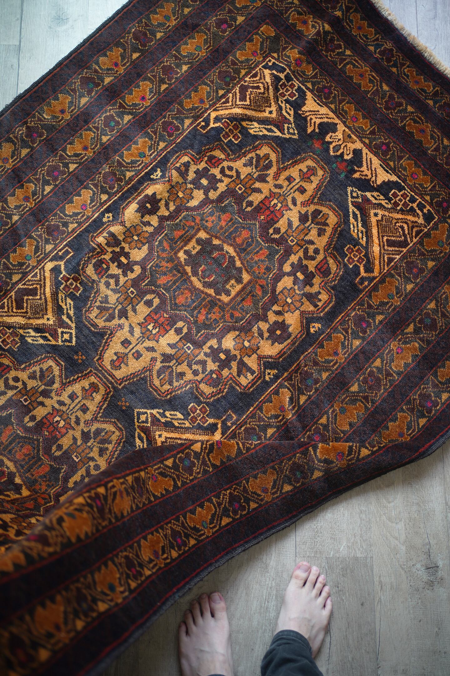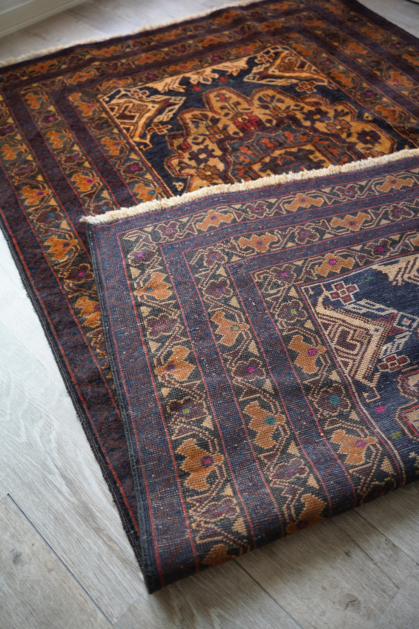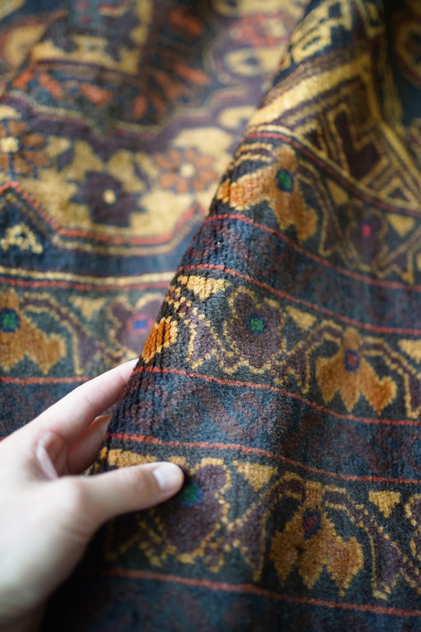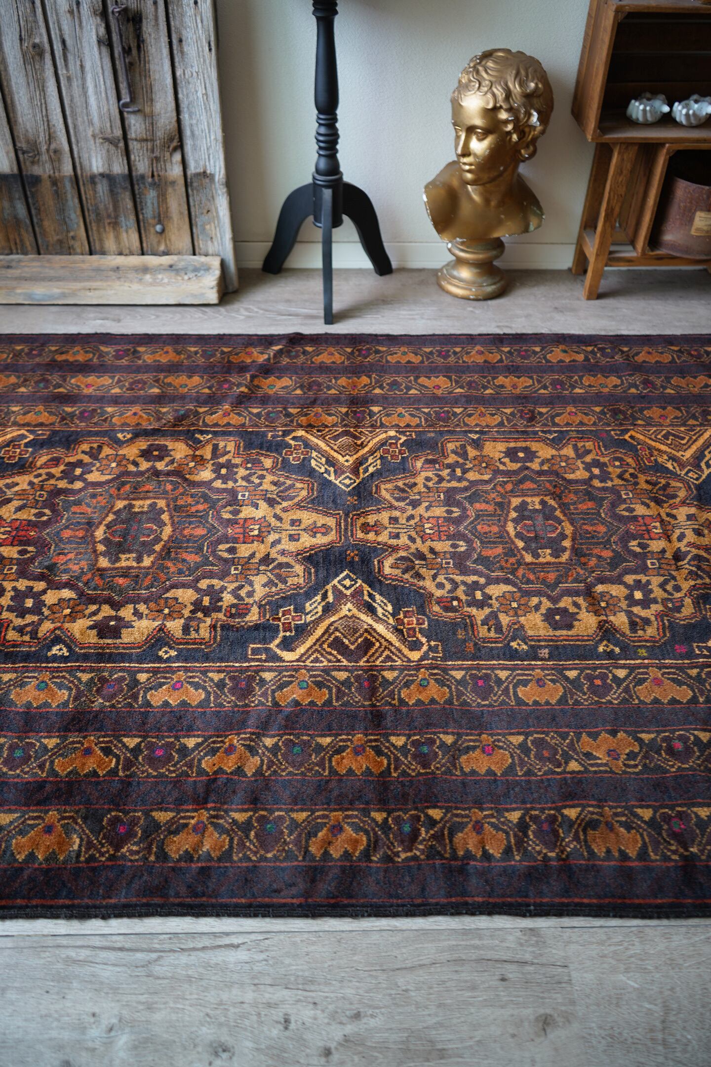 シャンデリアのような2つの大きなメダリオンが特徴的なアフガニスタン産のバルーチラグ。濃紺、ブラウン、焦茶べースのシックな配色で、パイル全体に艶があり大変美しい一枚です。ボーダーには差し色でダークグリーンや暗めのピンクなどが使われており、素敵なアクセントカラーになっています。厚みは6mm程度で、表面の毛並みはふわっと滑らかな気持ちの良い肌触り。目立ったダメージもなく、コンディションも良好です。リビングをはじめ、ソファ前やベッドサイドなどに敷くだけでバチッとカッコよくなりそうな、間違いない一枚。