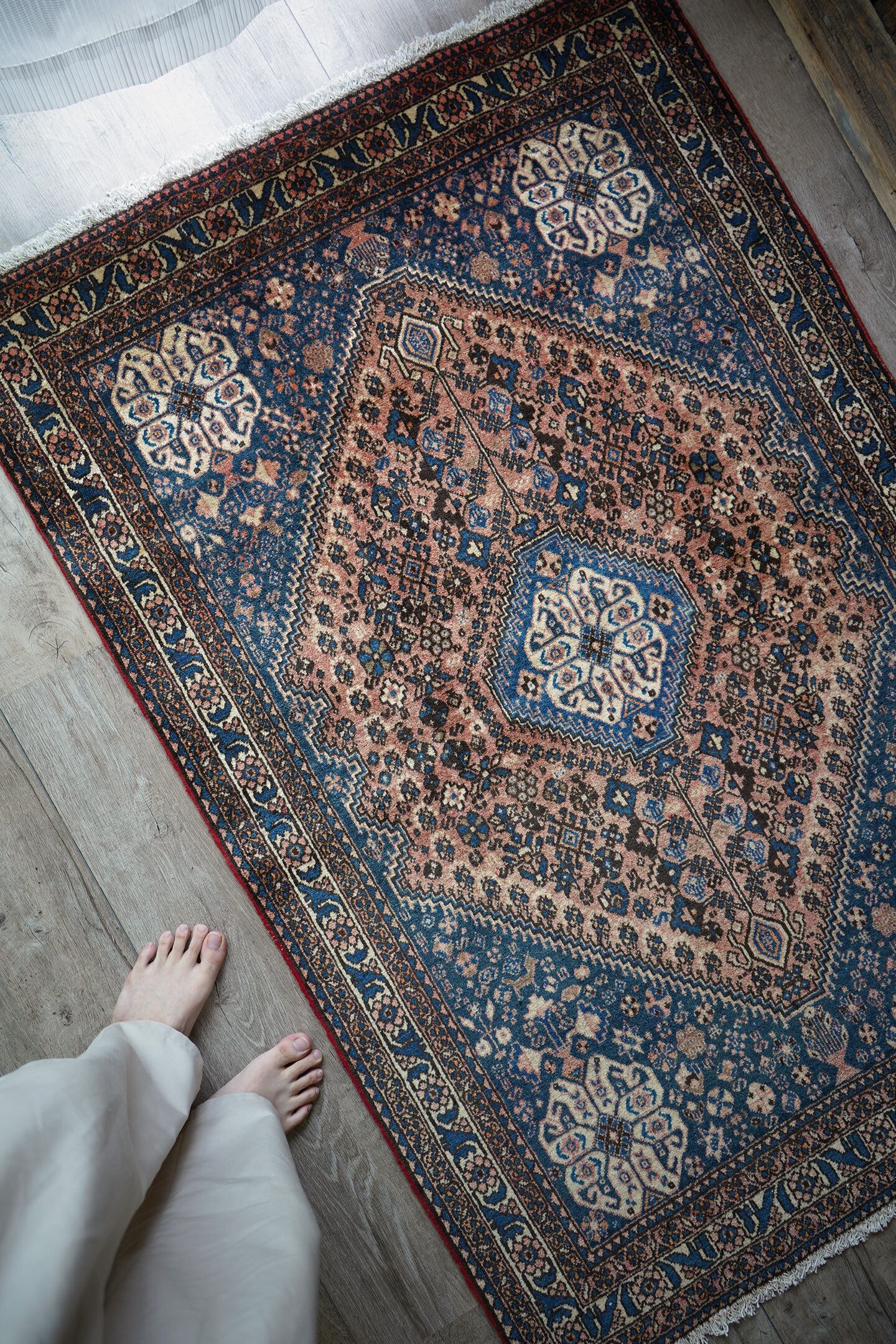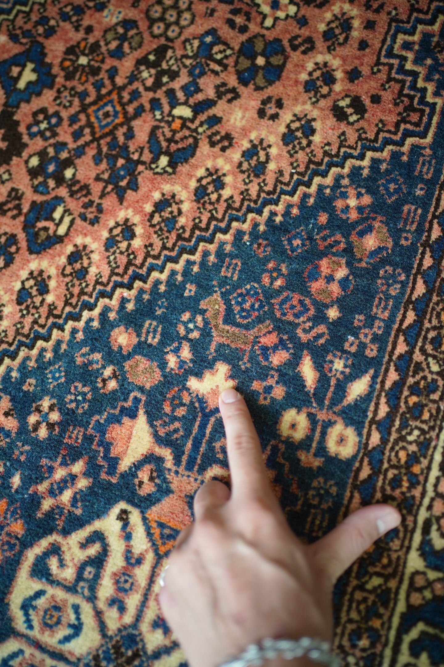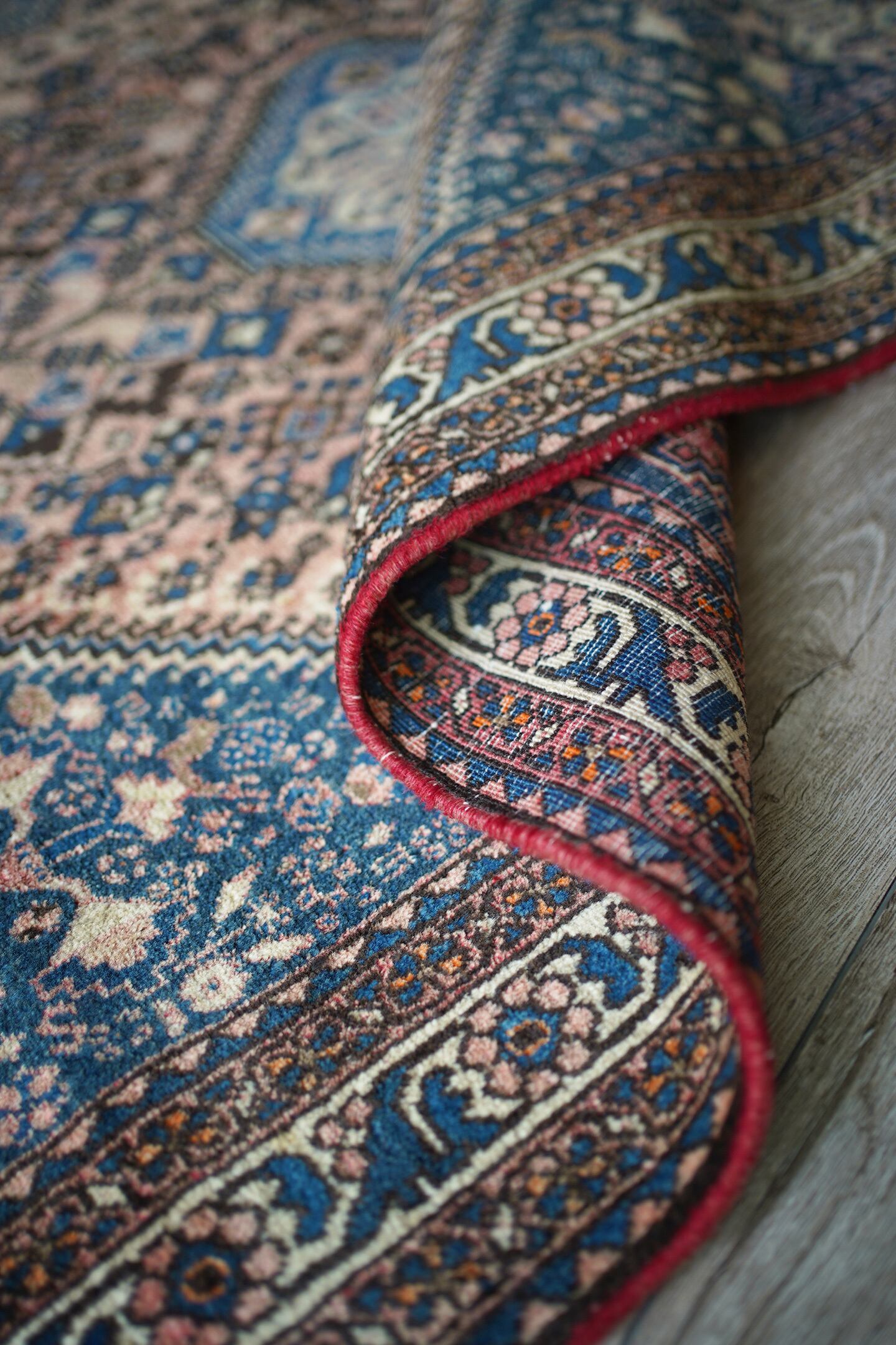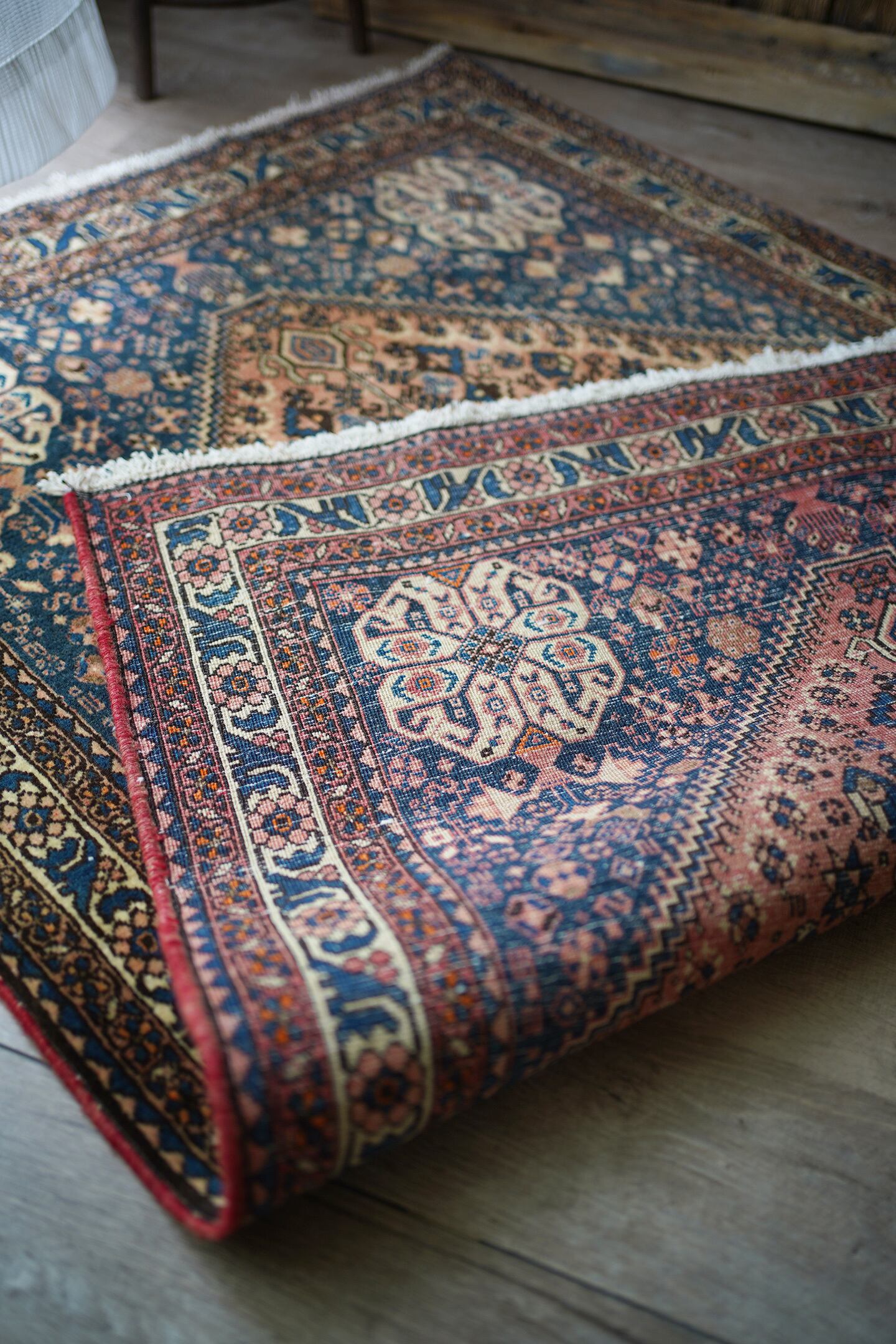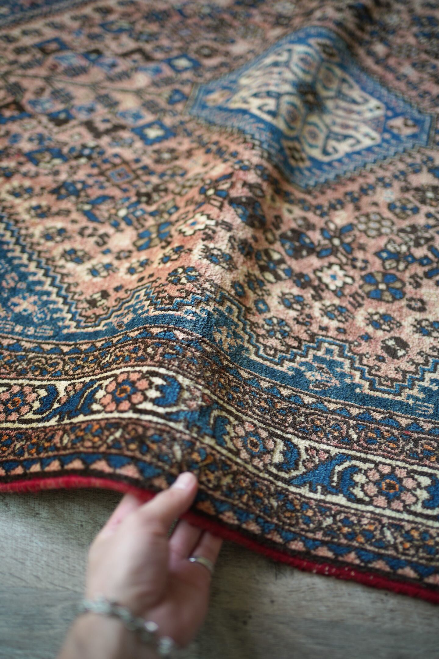 イラン北西部セネ産のクルド族によって織られたセミアンティークラグです。まるで宝石箱をひっくり返したような美しさのこのラグには花紋様をはじめ、八角星や狼の足跡などの繊細な紋様の数々が織り込まれています。可愛い動物も見受けられ、眺めているだけでワクワクするデザイン。配色はオレンジからコーラルピンクへのグラデーションに、ブルーグリーンの美しい色合いが大変素敵です。目の詰まった耐久性のある質感で、毛並みの長さの統一感含めて大変高品質な印象を受けます。ふわサラッとした滑らかな肌触りで、7mmほどの厚みとなります。コンディションも大変良好。毎日目に入る位置にぜひ敷いていただきたい素晴らしいラグです♫