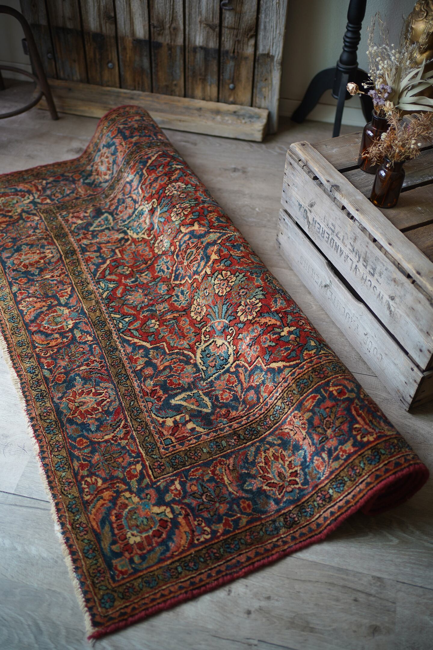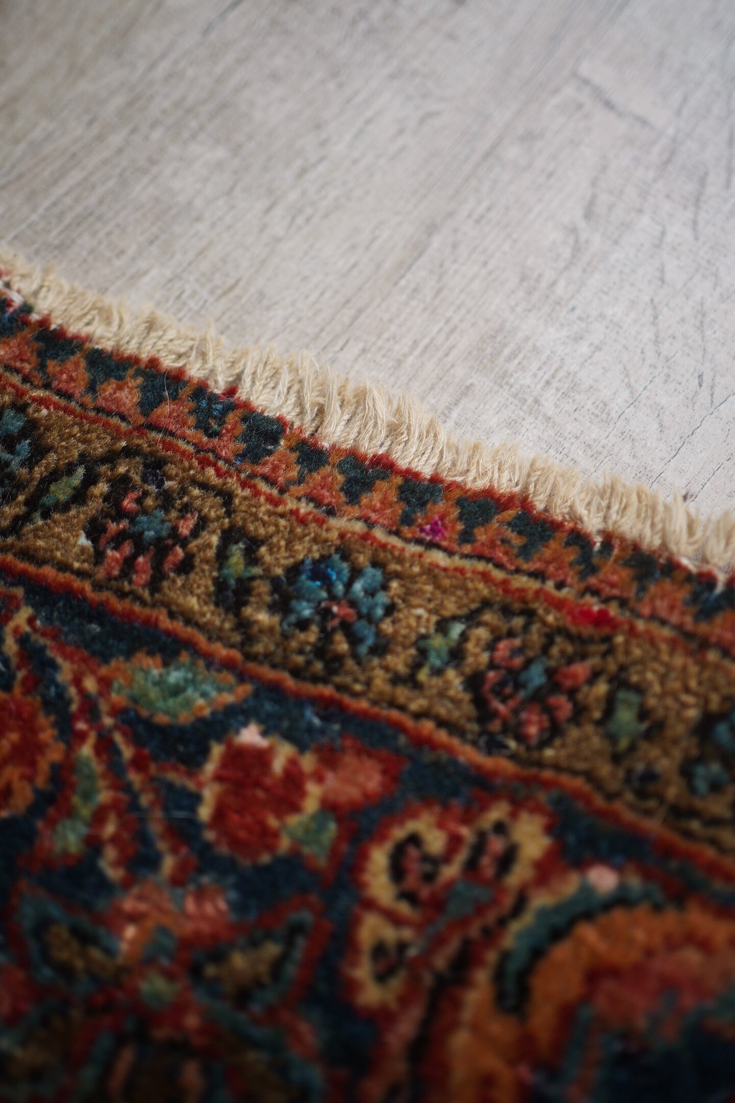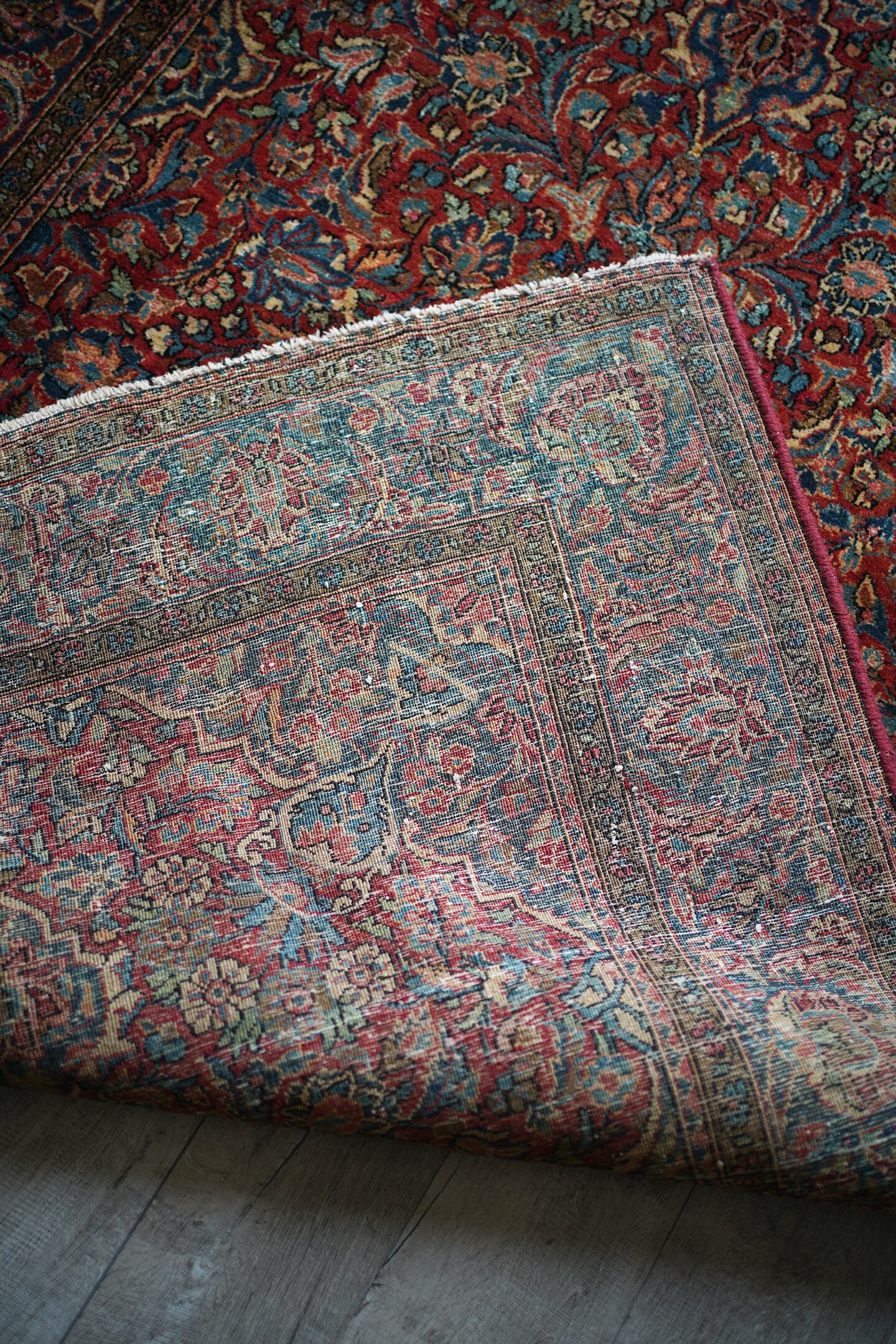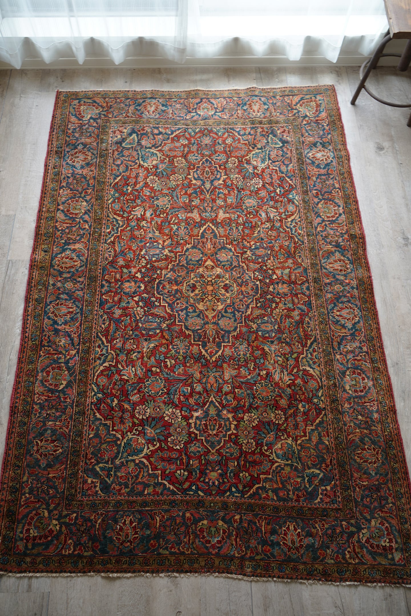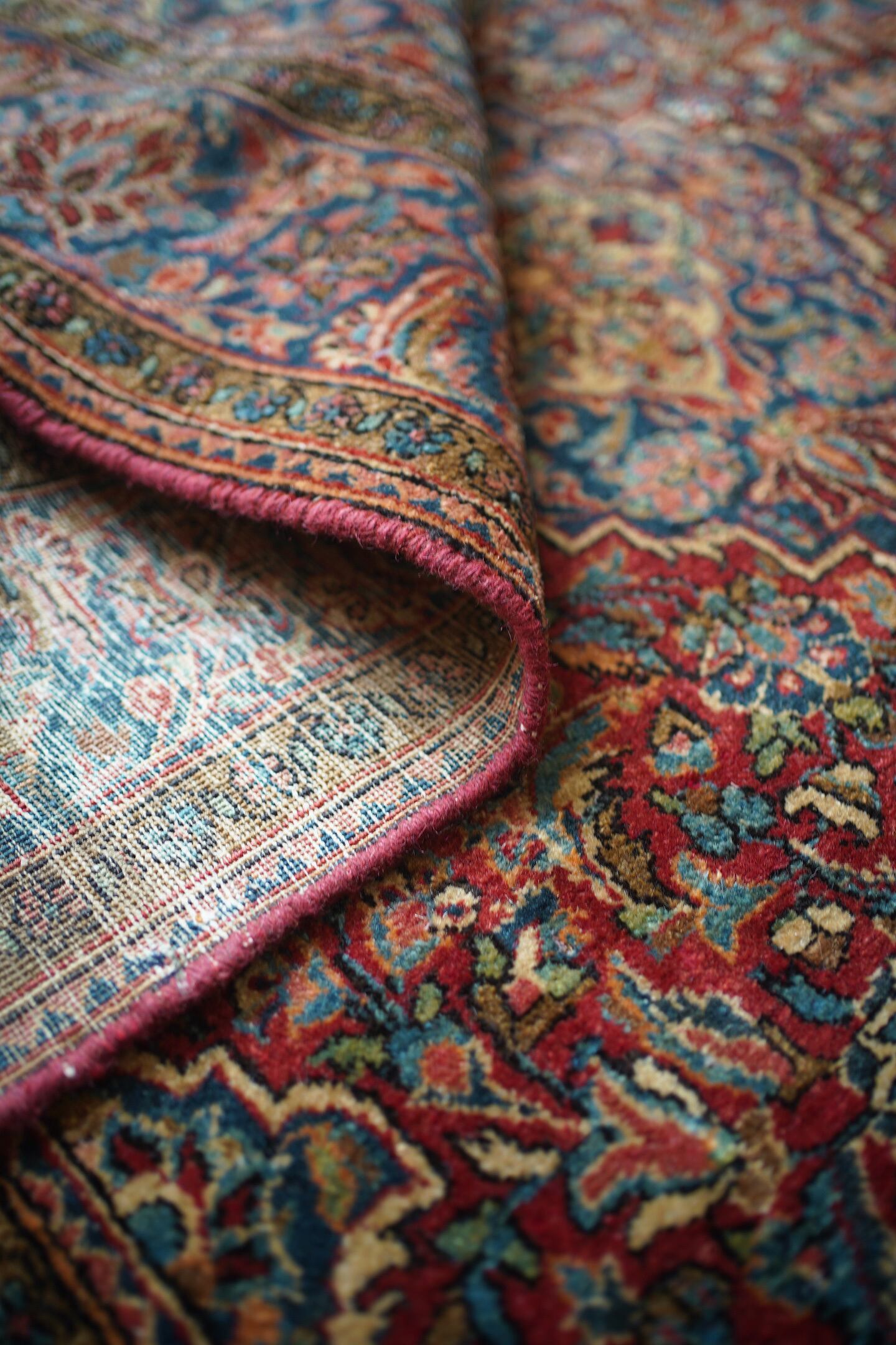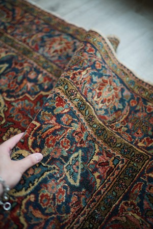 イランの北中央に位置するイスファハン州の都市カシャーンで織られたセミアンティークのラグです。このラグを広げた瞬間、クラシカルなTHE・ペルシャ絨毯感がありながらも統一感のある落ち着いた色味と、品のある花模様のデザインに一目惚れしました。ダークレッド × 深いブルーグリーンをベースカラーにベージュ、淡いピンク、ブラウンが使われた素晴らしい配色、パイルに艶もあり大変美しいです。ふわっと柔らかく気持ちの良い優しい肌触りで、通年で気持ちよく敷くことができる質感です。厚みは8mm程度、細い糸を使用した織りの詰まった作りで、耐久性にも優れています。ほとんど目立ちませんが、一部パイルが少し薄くなっている箇所がありますのでお写真最後をご参照ください。