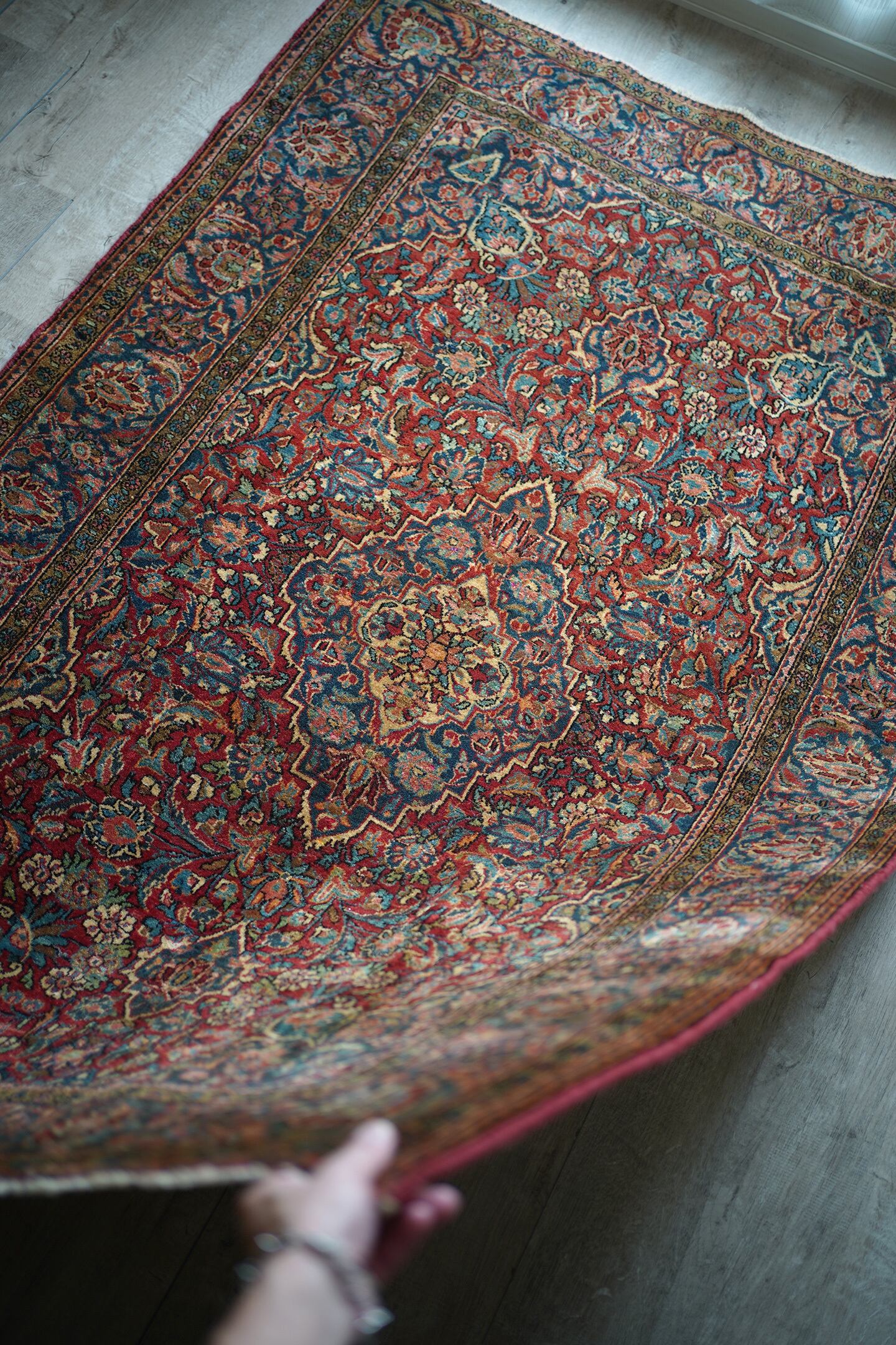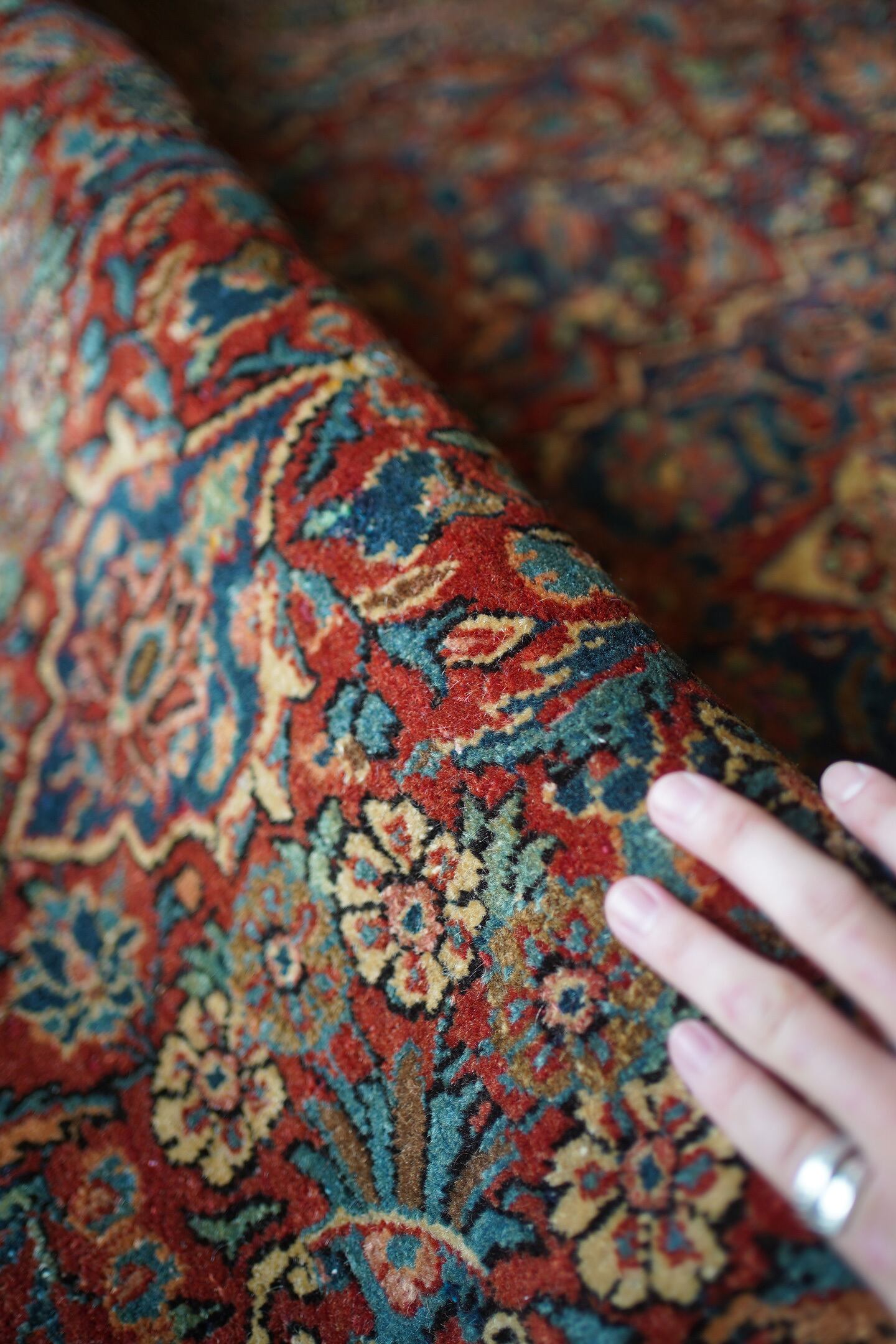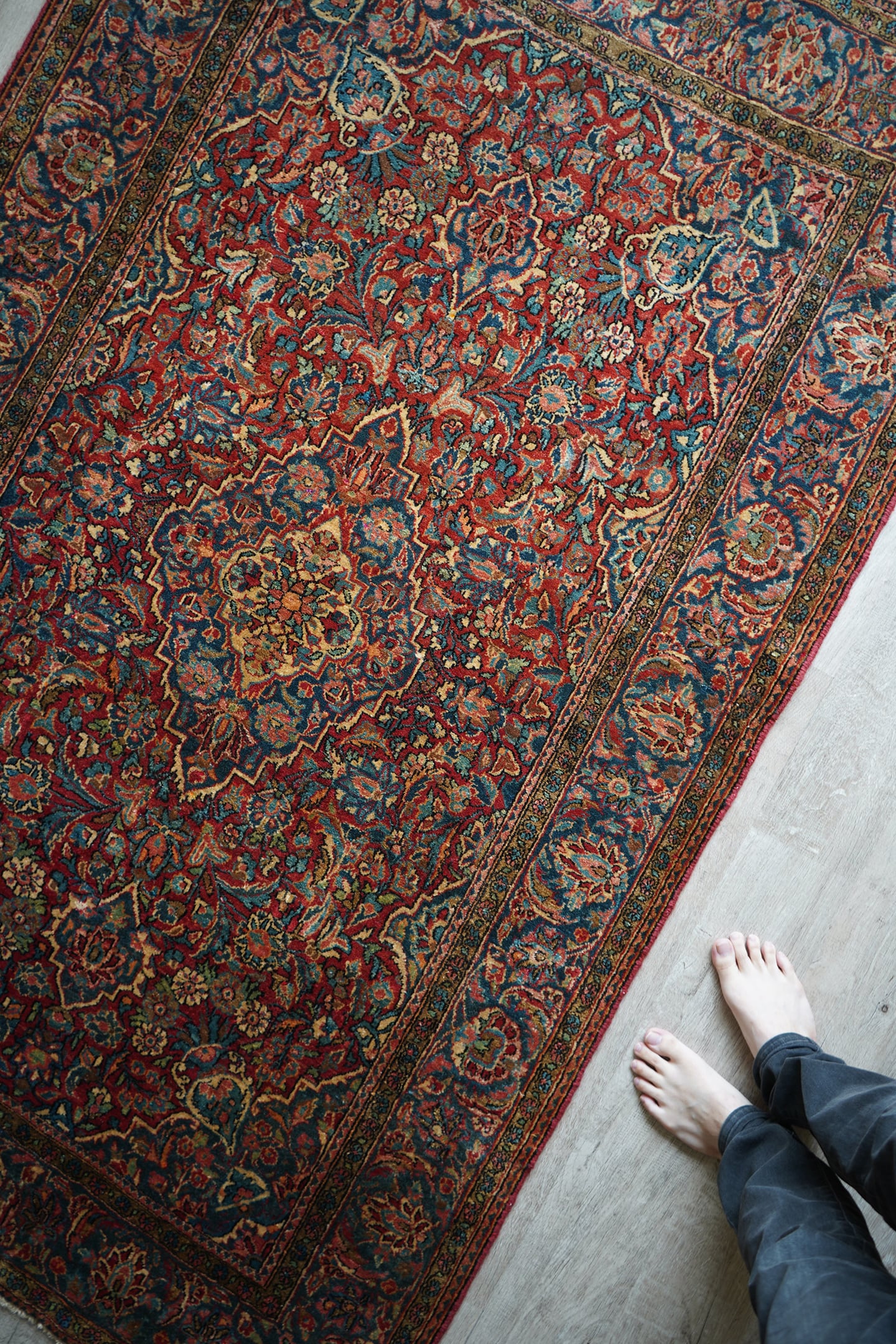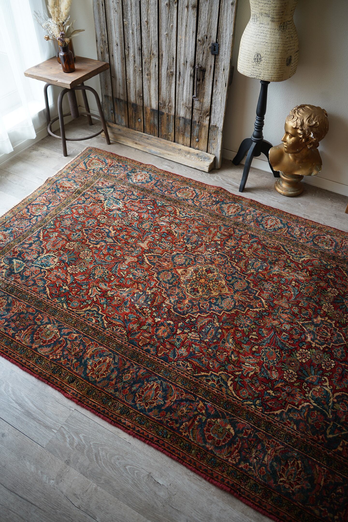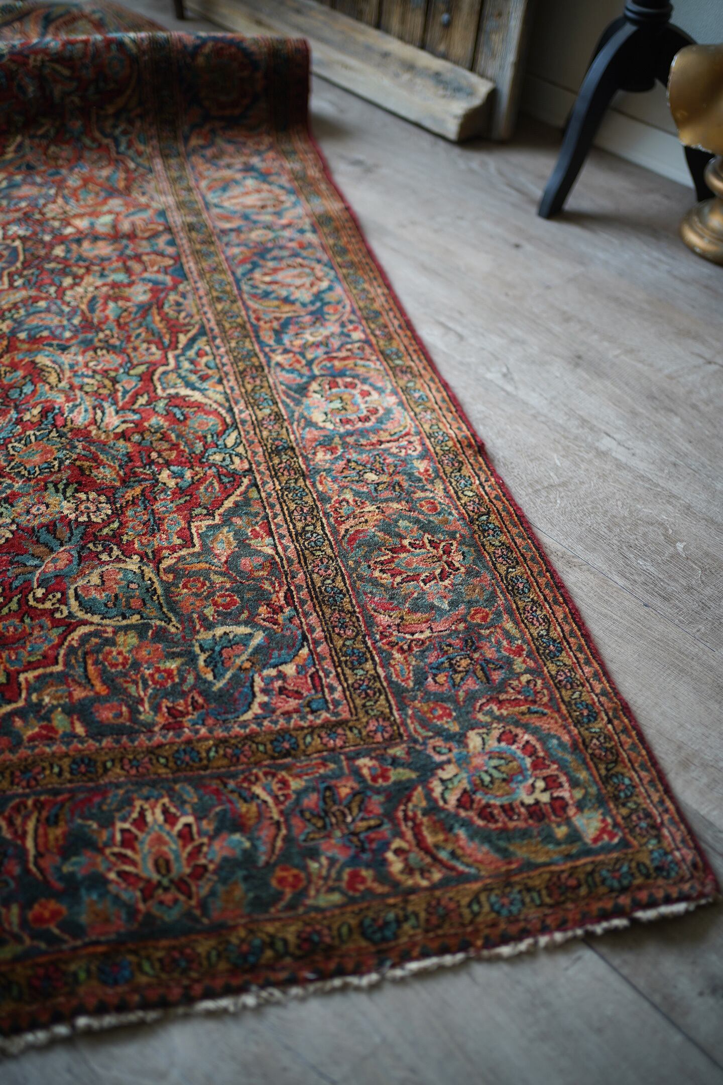 イランの北中央に位置するイスファハン州の都市カシャーンで織られたセミアンティークのラグです。このラグを広げた瞬間、クラシカルなTHE・ペルシャ絨毯感がありながらも統一感のある落ち着いた色味と、品のある花模様のデザインに一目惚れしました。ダークレッド × 深いブルーグリーンをベースカラーにベージュ、淡いピンク、ブラウンが使われた素晴らしい配色、パイルに艶もあり大変美しいです。ふわっと柔らかく気持ちの良い優しい肌触りで、通年で気持ちよく敷くことができる質感です。厚みは8mm程度、細い糸を使用した織りの詰まった作りで、耐久性にも優れています。ほとんど目立ちませんが、一部パイルが少し薄くなっている箇所がありますのでお写真最後をご参照ください。