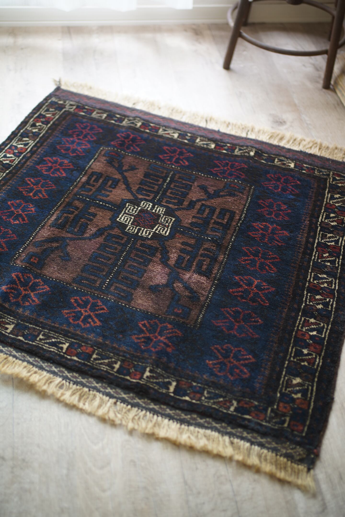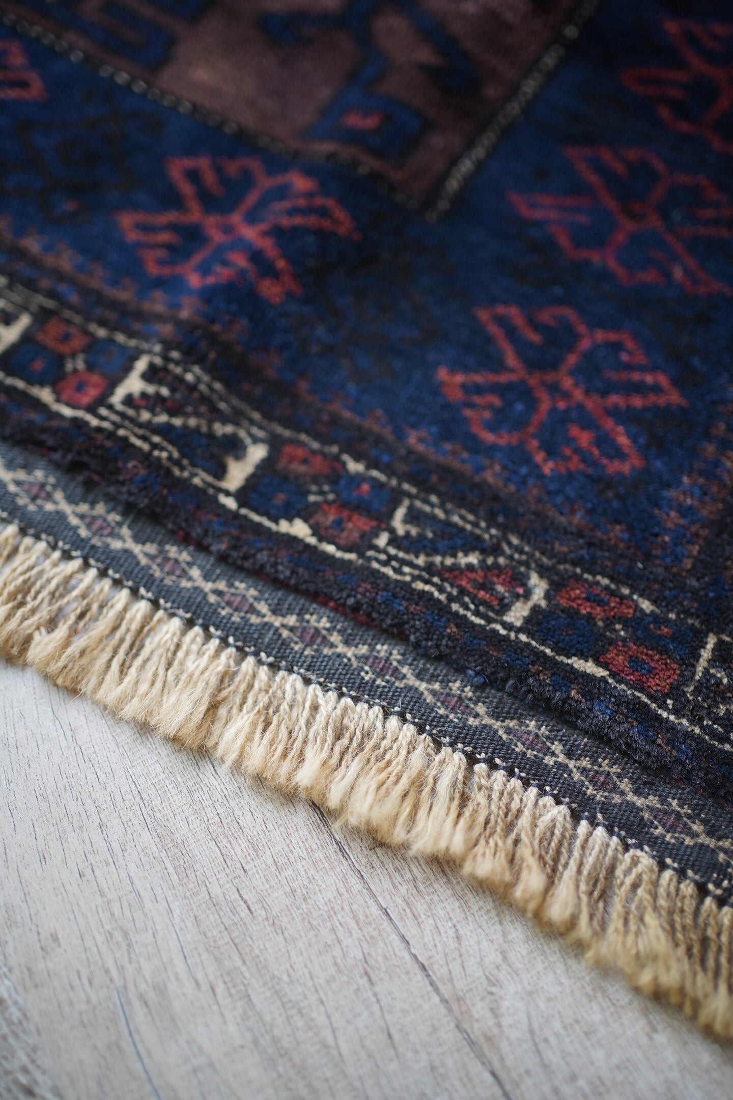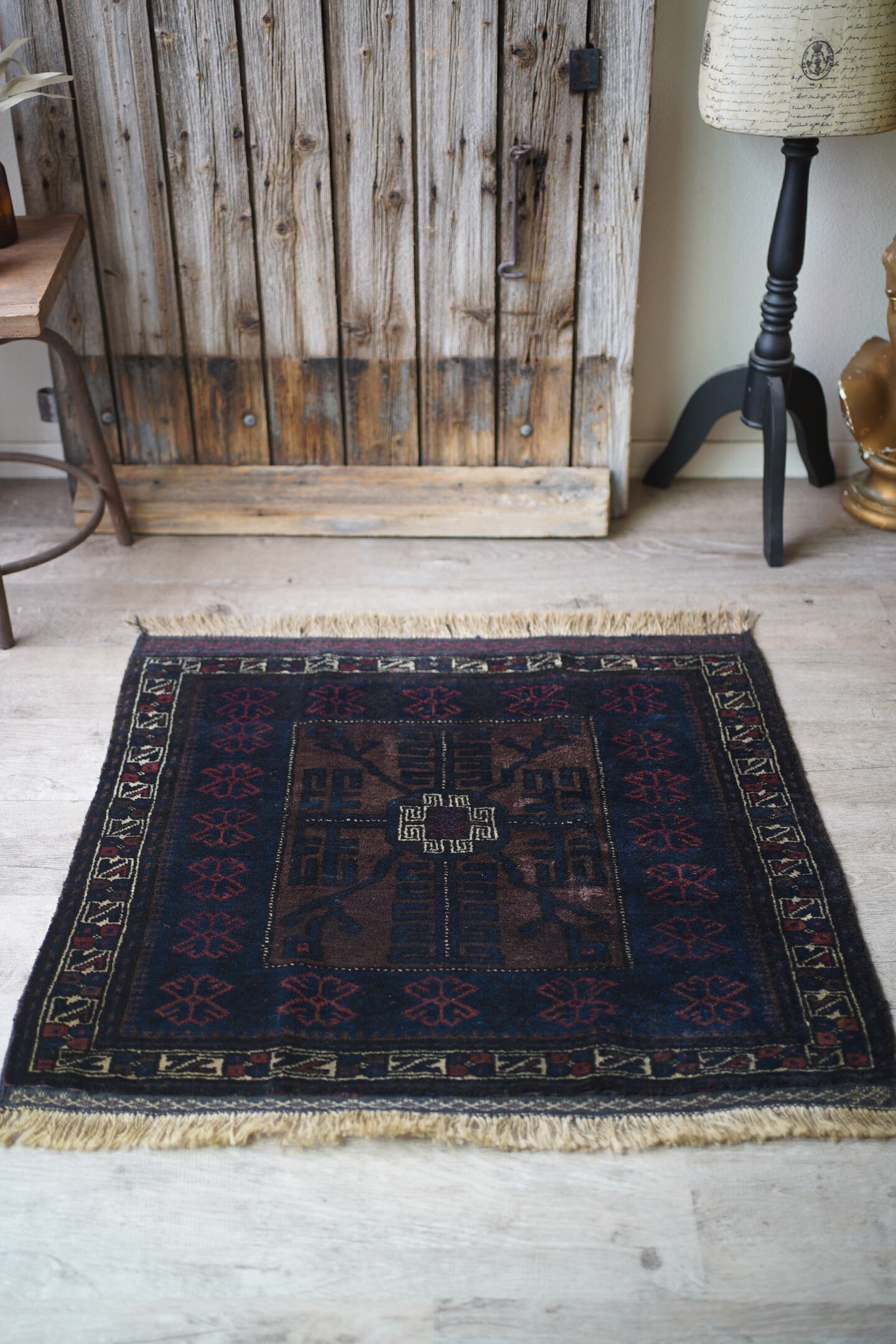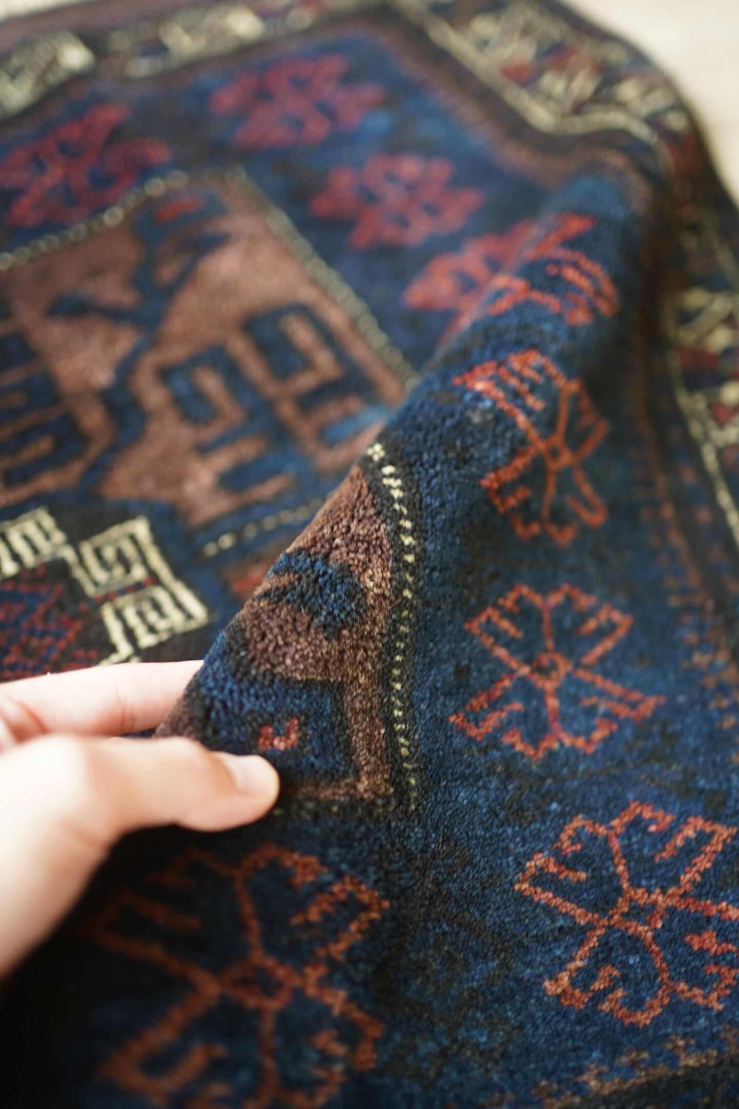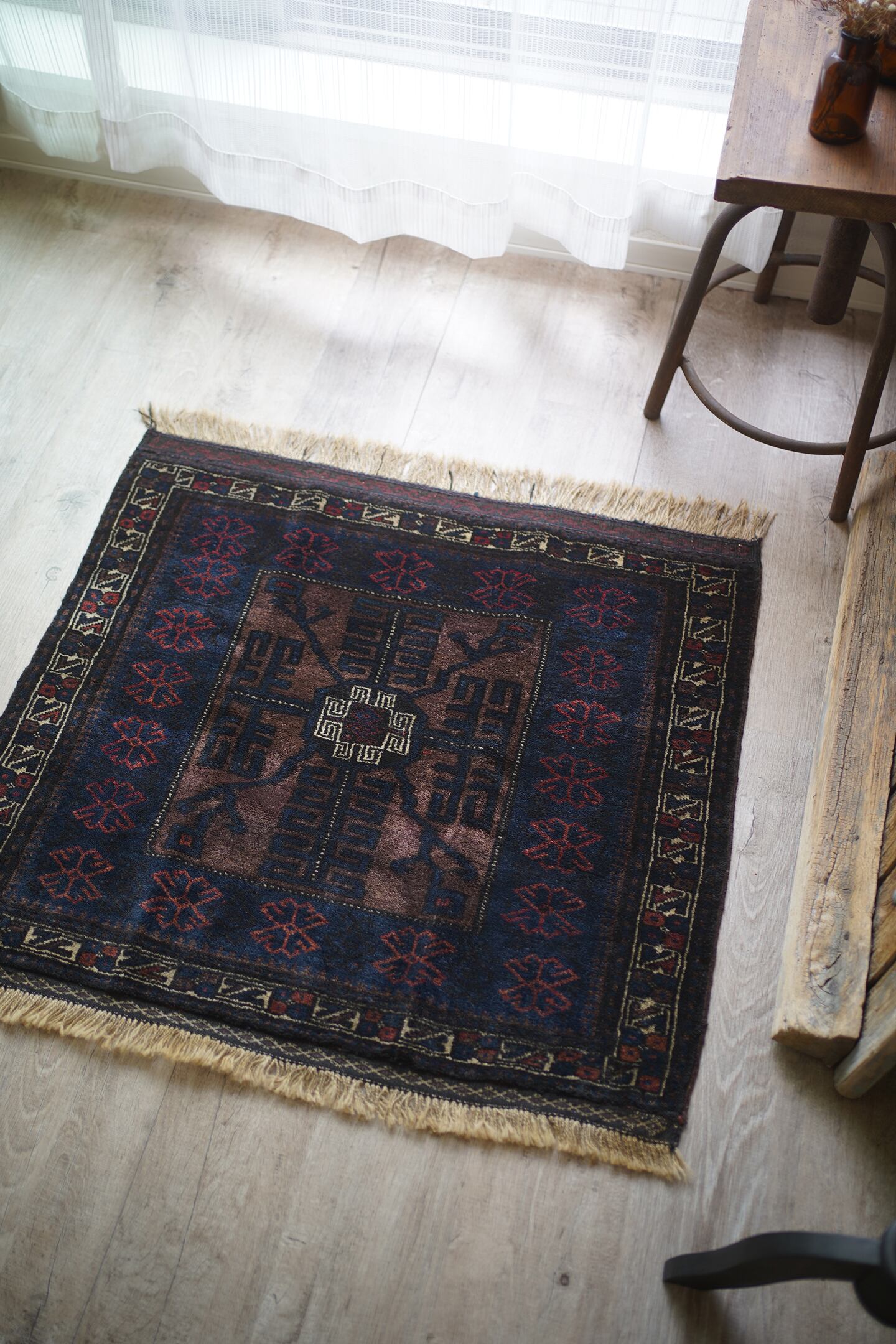 ふかふかの優しい肌触りのスクエアサイズのバルーチラグ。かなり暗いダークな色合いで濃紺に濃いブラウン、差し色に赤茶が使われた配色です(お部屋の照明や環境によって、もう少し暗く見えるかもしれません)。フリンジ部分は上下異なるキリムエンドのデザインになっているところも店主個人的には好きなポイントです。厚みは8mm程度。2箇所、フリンジが短くなっている箇所がございますので、お写真最後の2枚をご確認ください。暗めのシックなラグをお探しの方に。