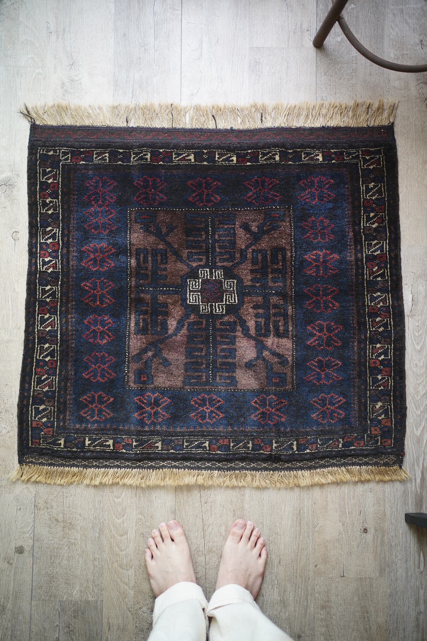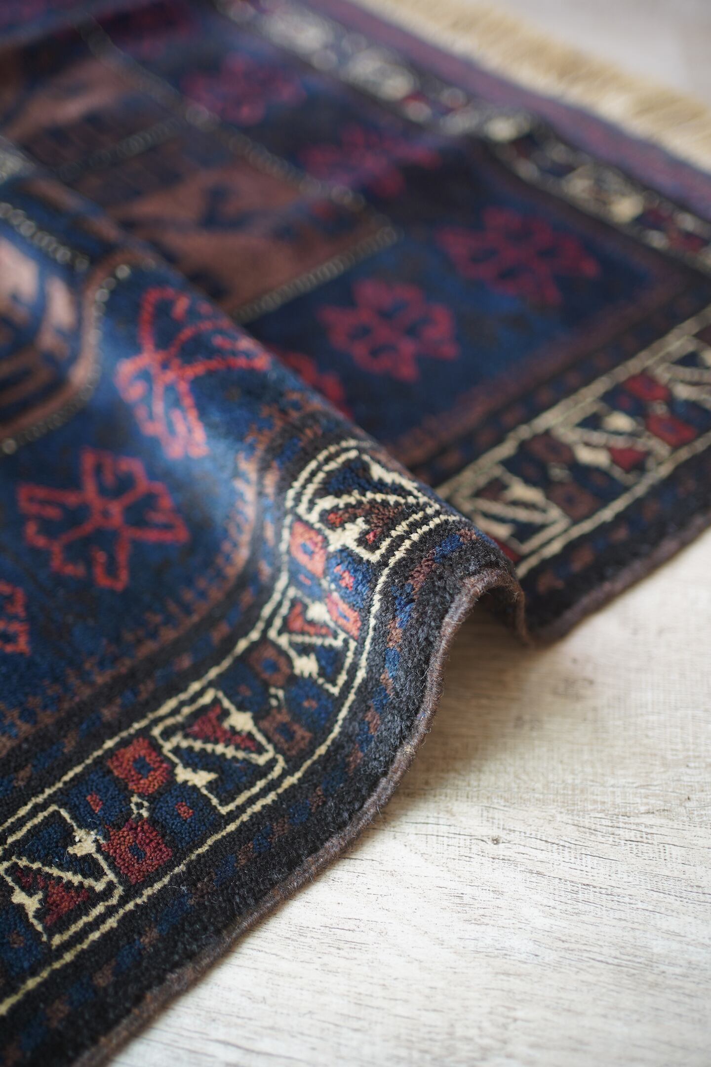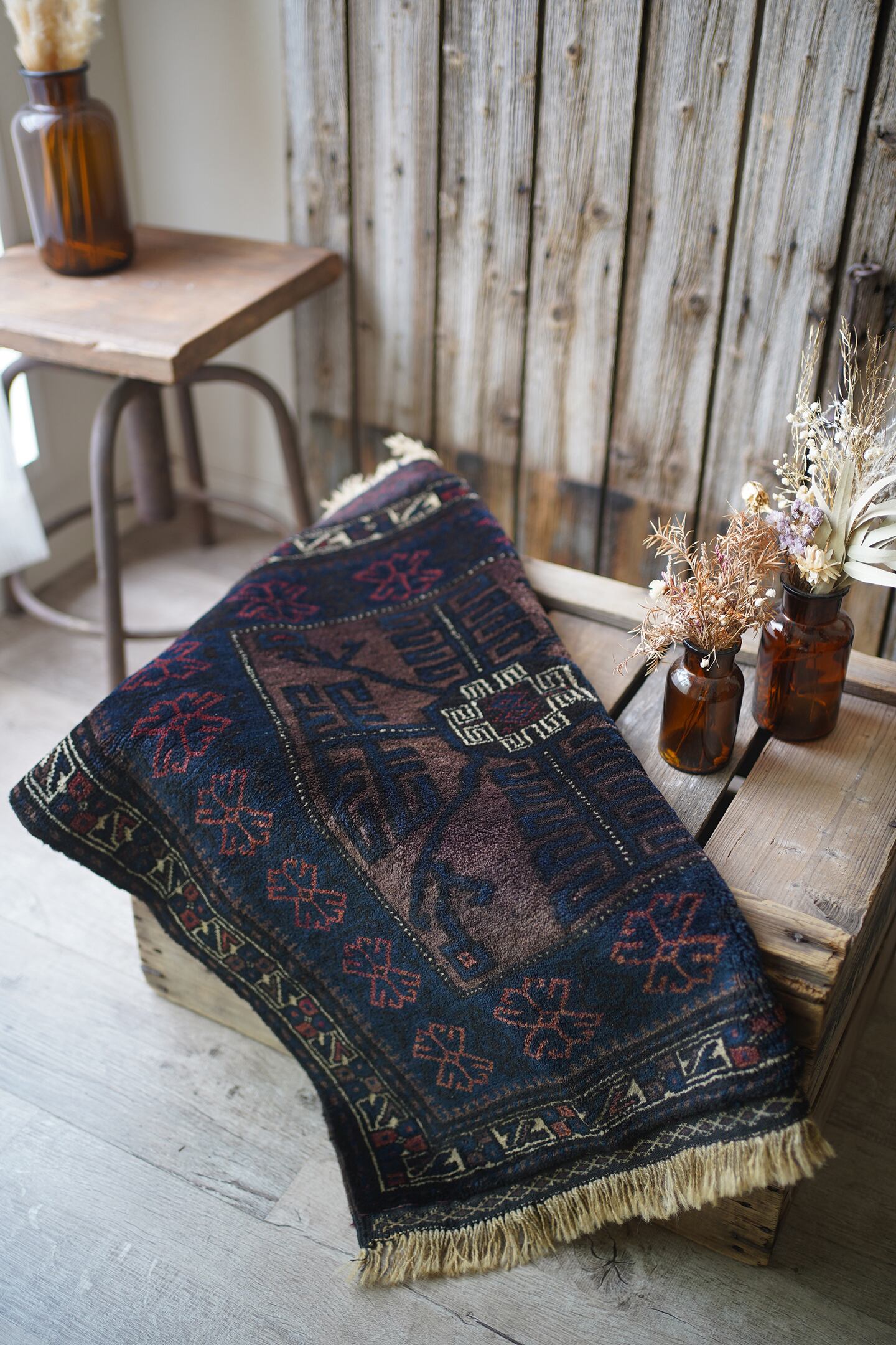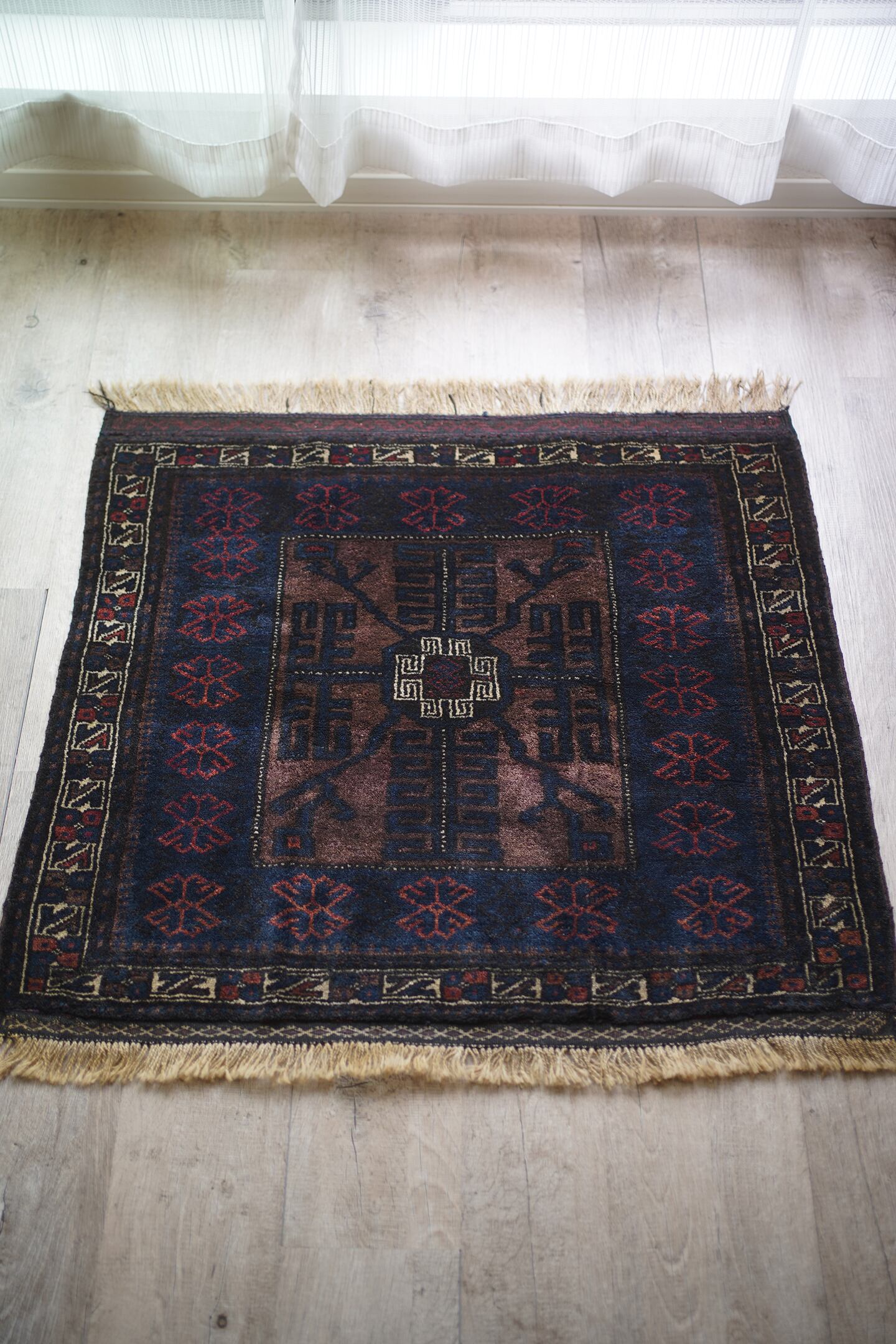 ふかふかの優しい肌触りのスクエアサイズのバルーチラグ。かなり暗いダークな色合いで濃紺に濃いブラウン、差し色に赤茶が使われた配色です(お部屋の照明や環境によって、もう少し暗く見えるかもしれません)。フリンジ部分は上下異なるキリムエンドのデザインになっているところも店主個人的には好きなポイントです。厚みは8mm程度。2箇所、フリンジが短くなっている箇所がございますので、お写真最後の2枚をご確認ください。暗めのシックなラグをお探しの方に。