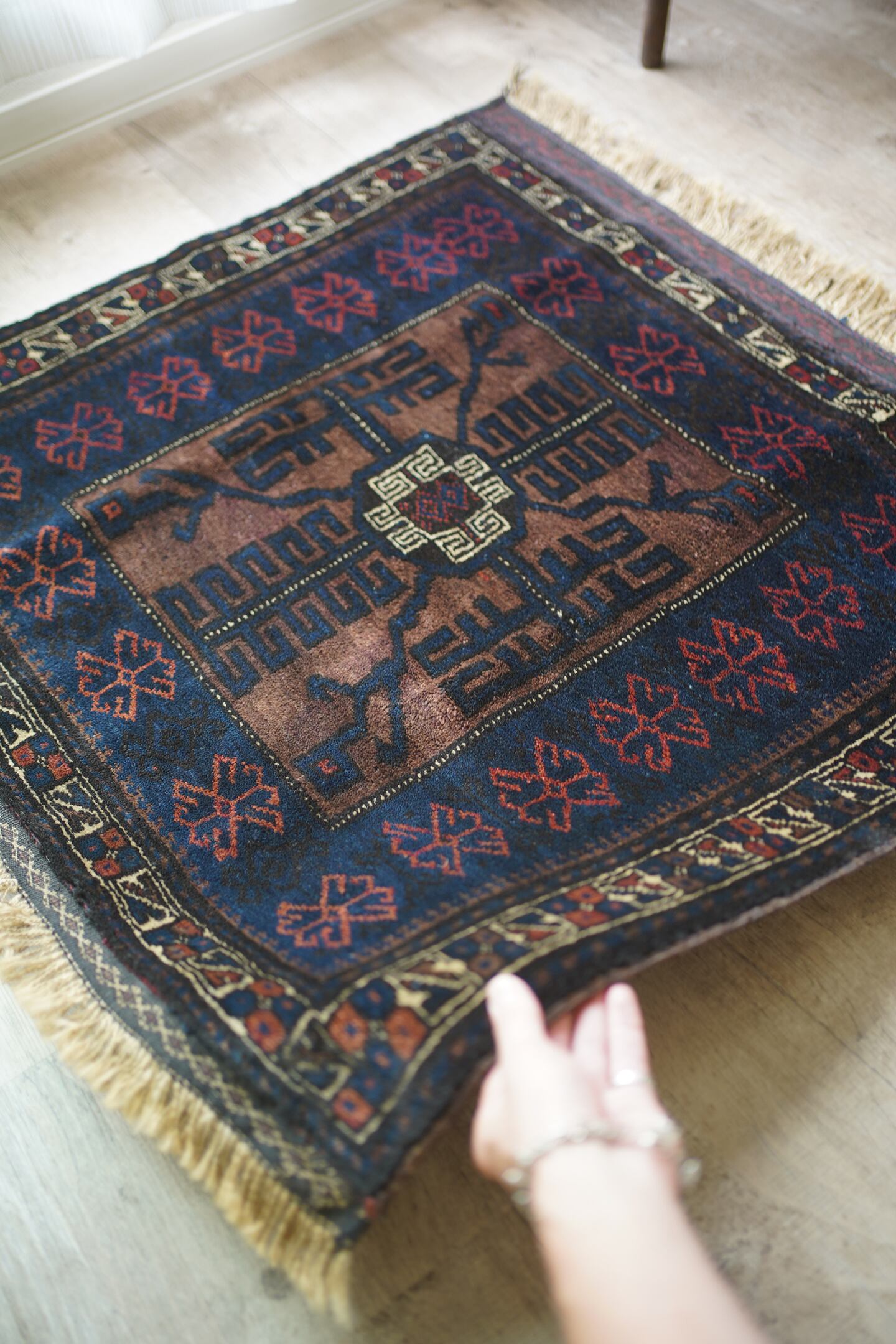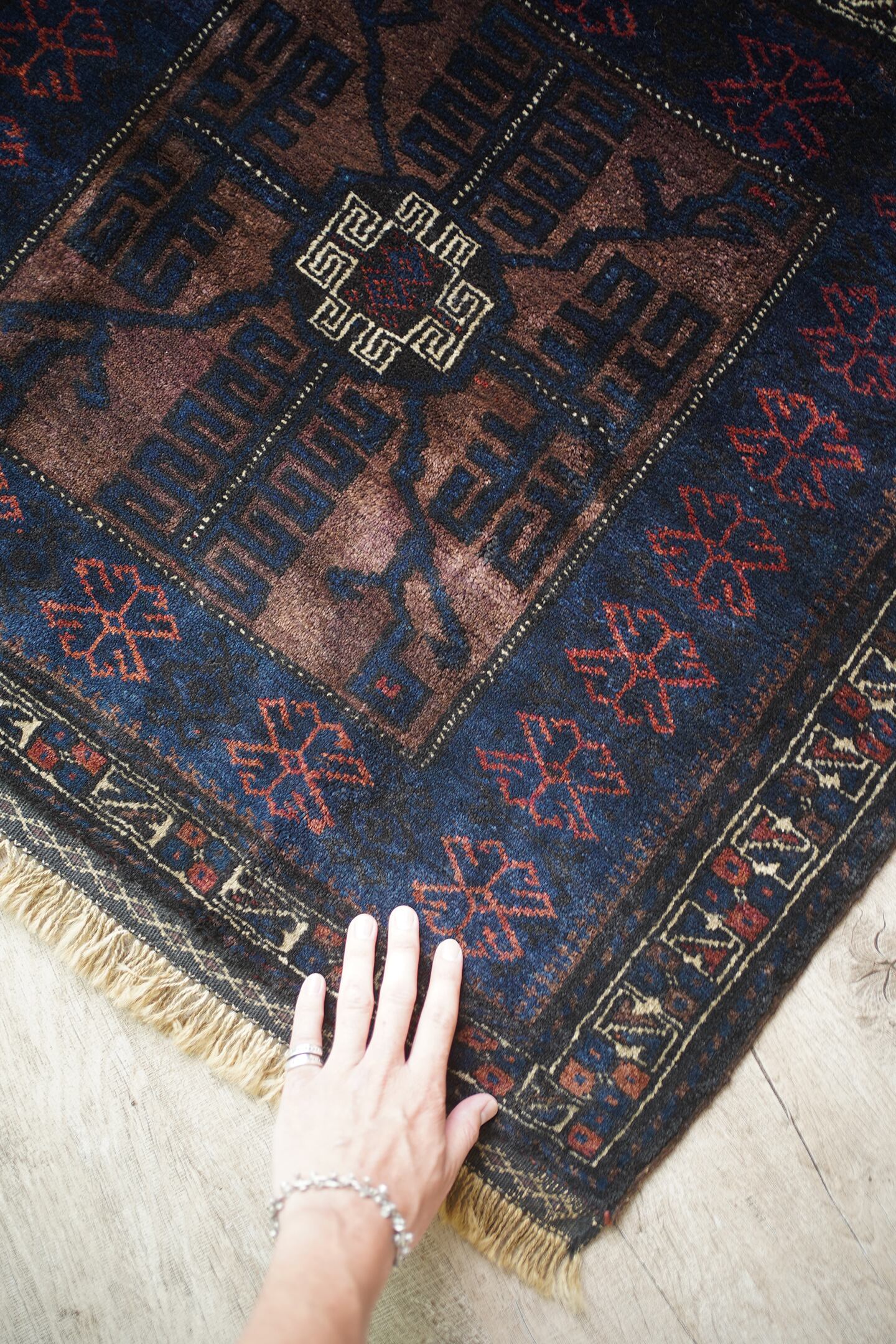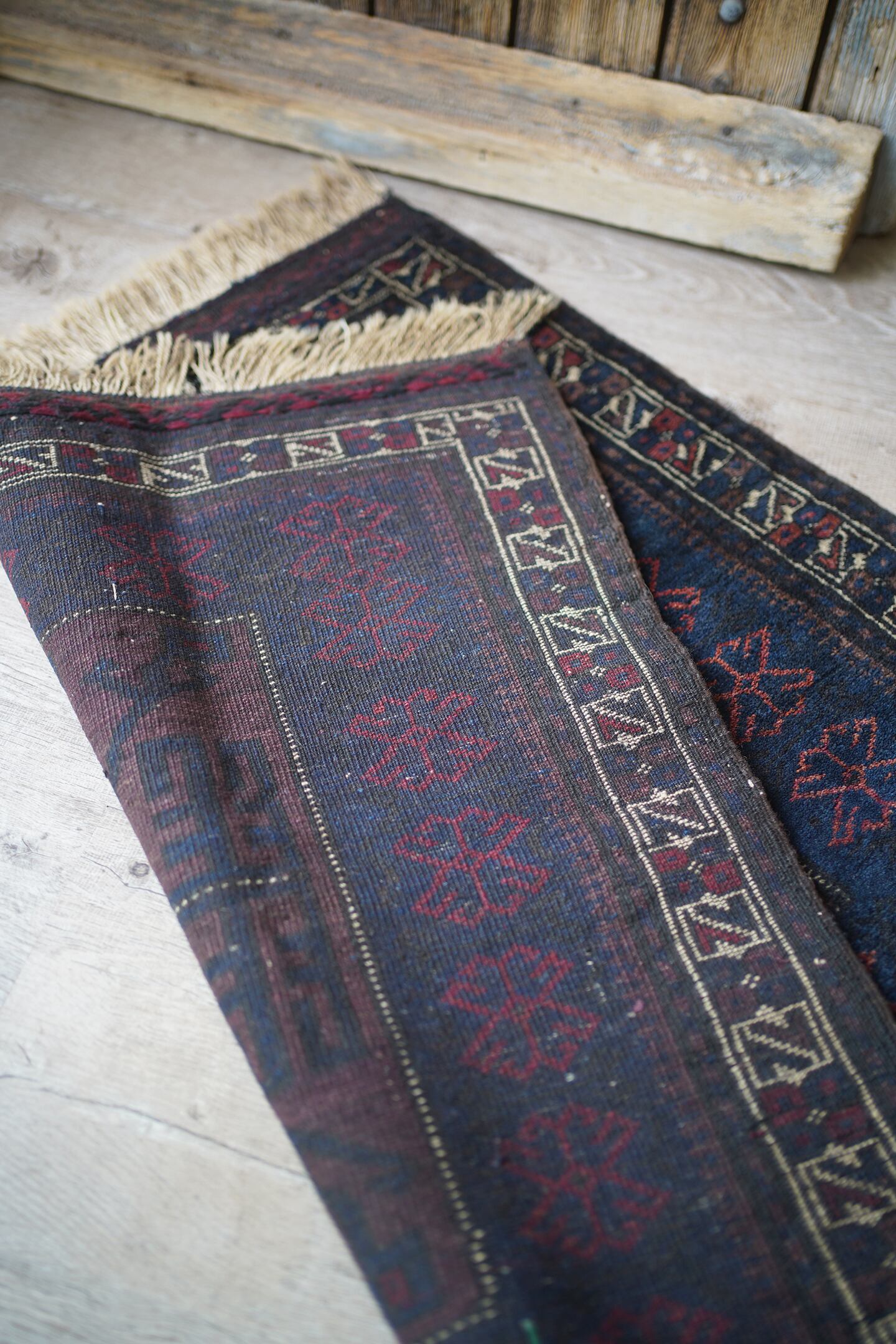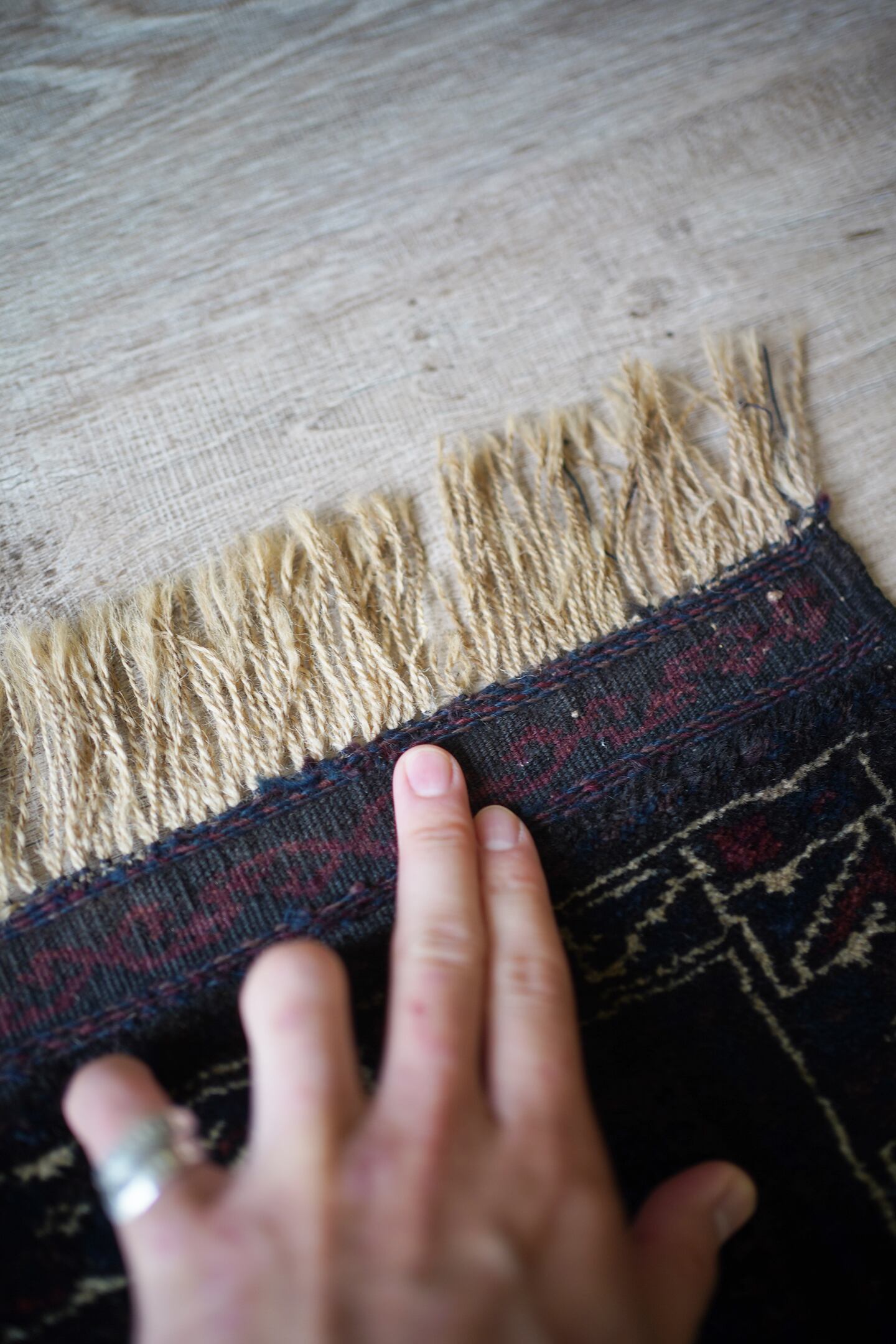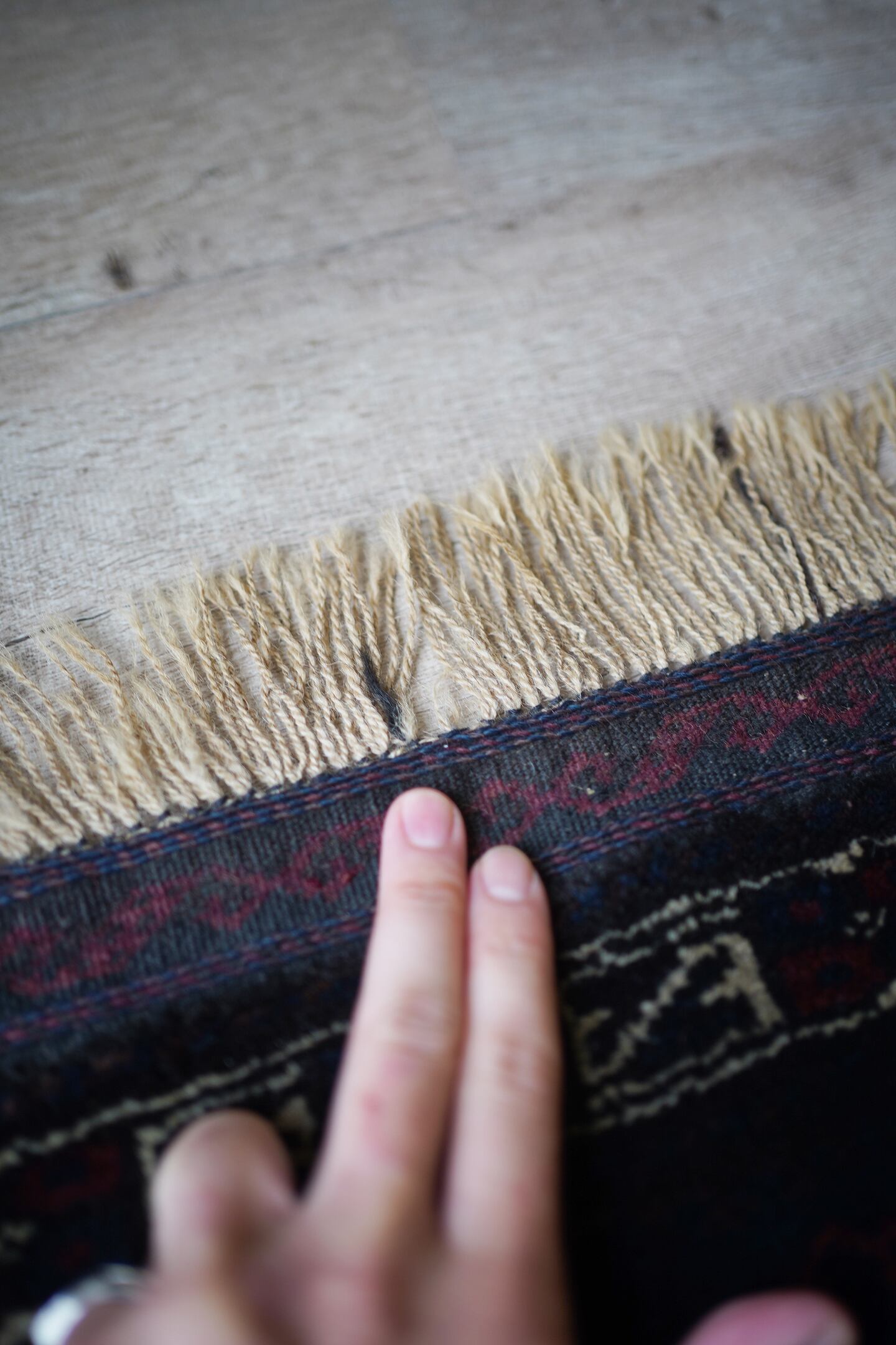 ふかふかの優しい肌触りのスクエアサイズのバルーチラグ。かなり暗いダークな色合いで濃紺に濃いブラウン、差し色に赤茶が使われた配色です(お部屋の照明や環境によって、もう少し暗く見えるかもしれません)。フリンジ部分は上下異なるキリムエンドのデザインになっているところも店主個人的には好きなポイントです。厚みは8mm程度。2箇所、フリンジが短くなっている箇所がございますので、お写真最後の2枚をご確認ください。暗めのシックなラグをお探しの方に。