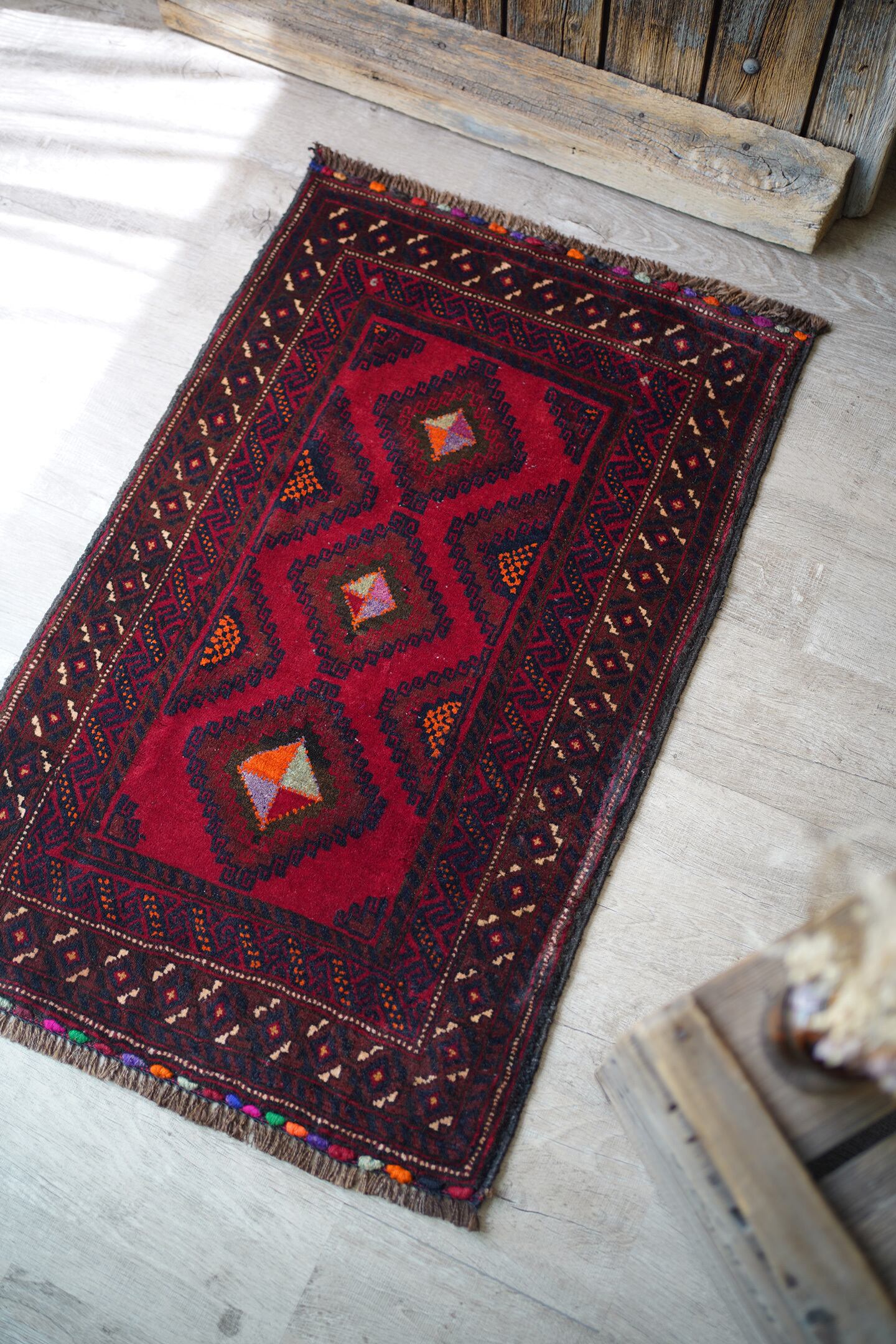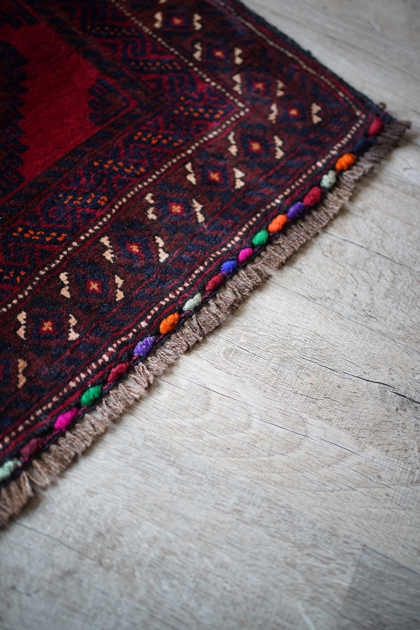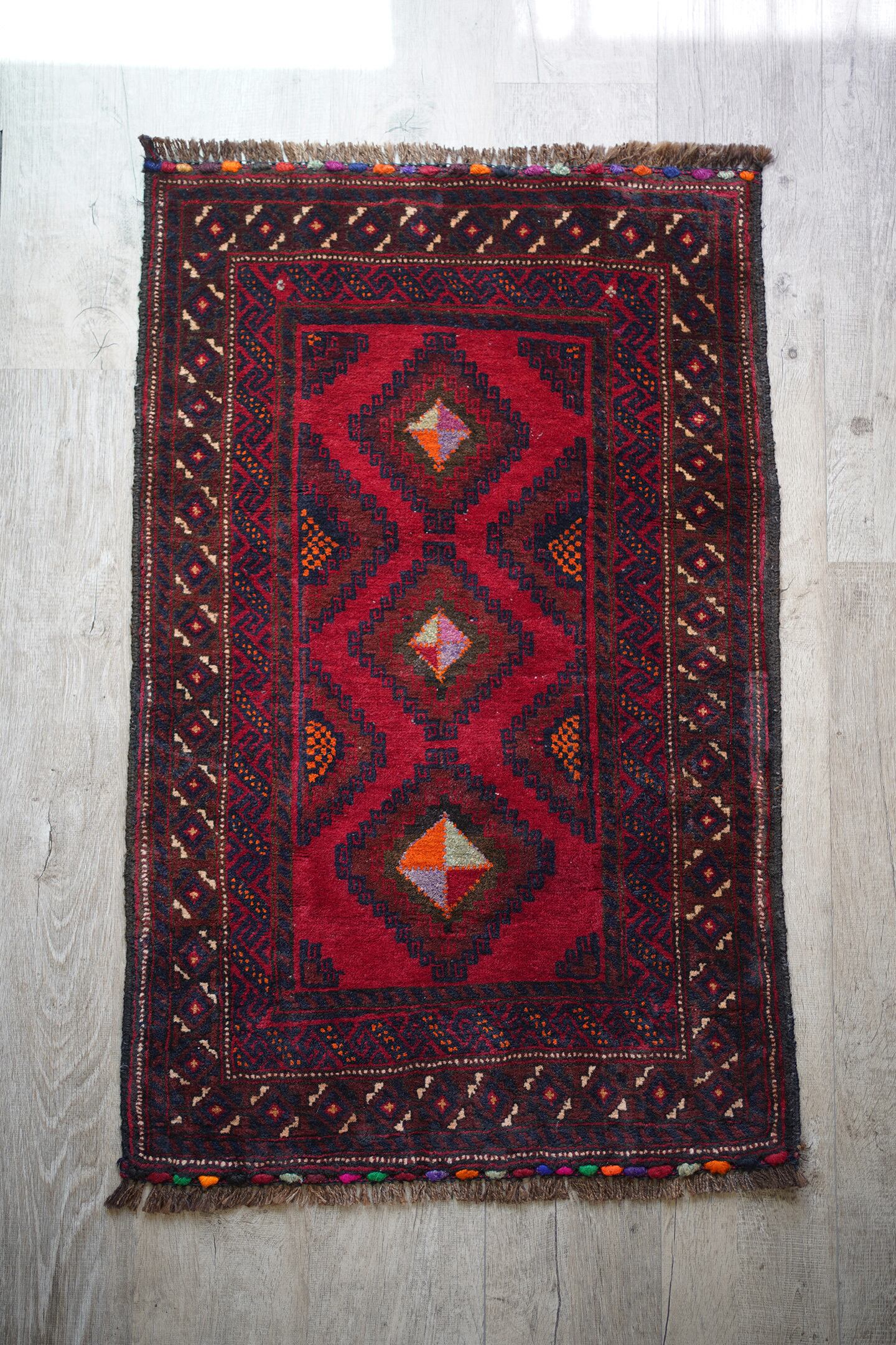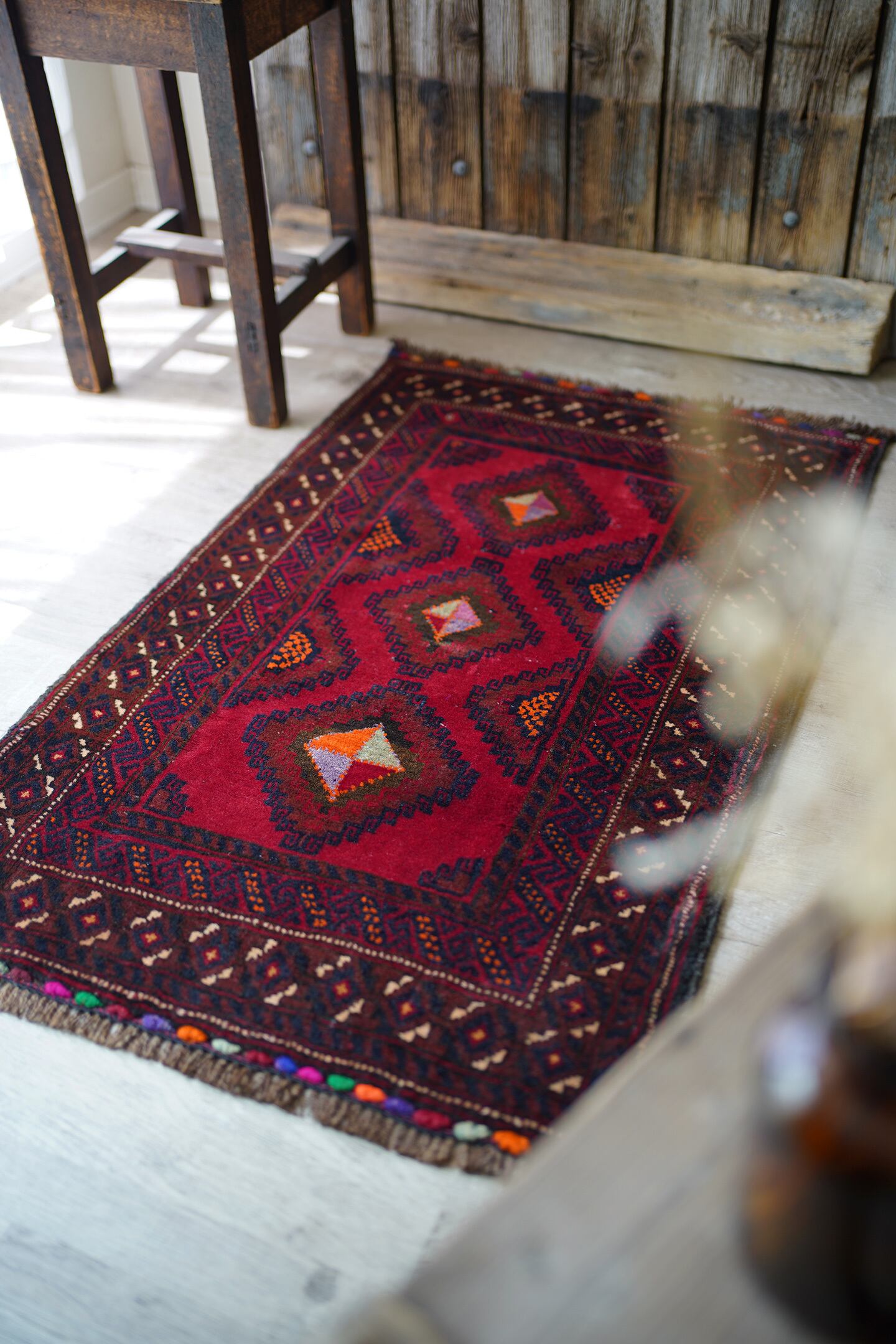 3連のカラフルな菱形紋様が可愛らしい経年約50年のバルーチラグ。濃いめの赤をベースとした配色に、フリンジ部分に付いた多彩な装飾の玉が素敵で、心ときめくキュートさを持ち合わせた一枚。ふわっと柔らかい優しい肌触りで、厚みは7mmほど。ほとんど気にならない程度ですが、一部補修により色味が薄くなっている箇所がございます(お写真最後をご参照ください)。チェストの前など、お家のちょっとしたスペースに♪
