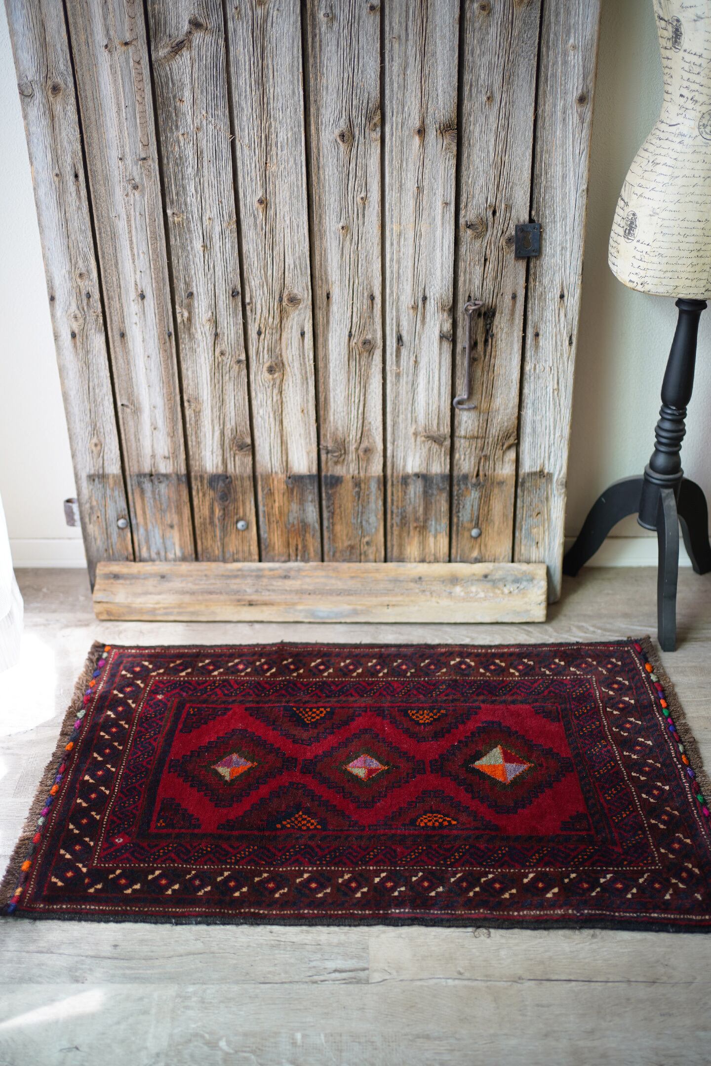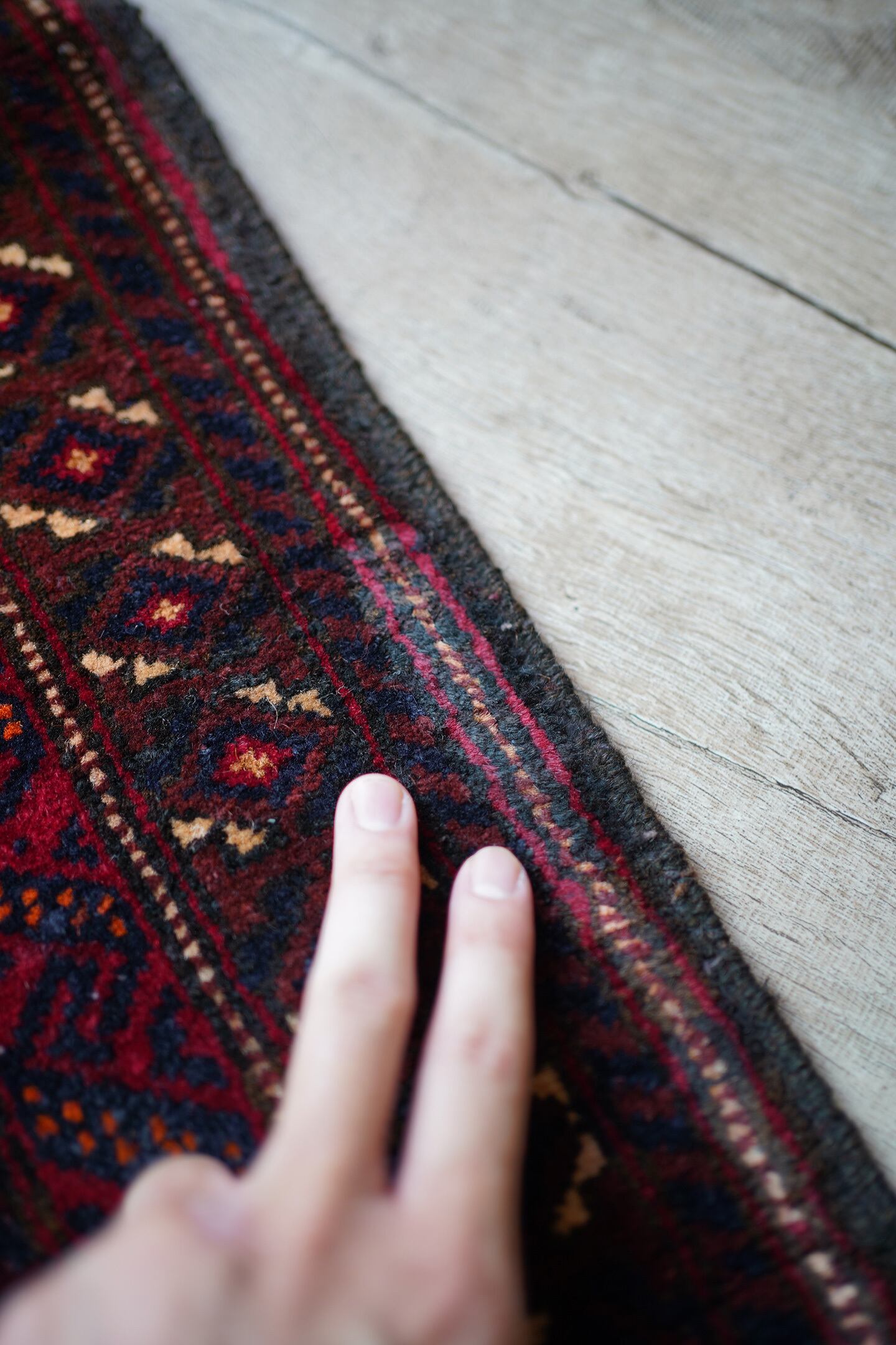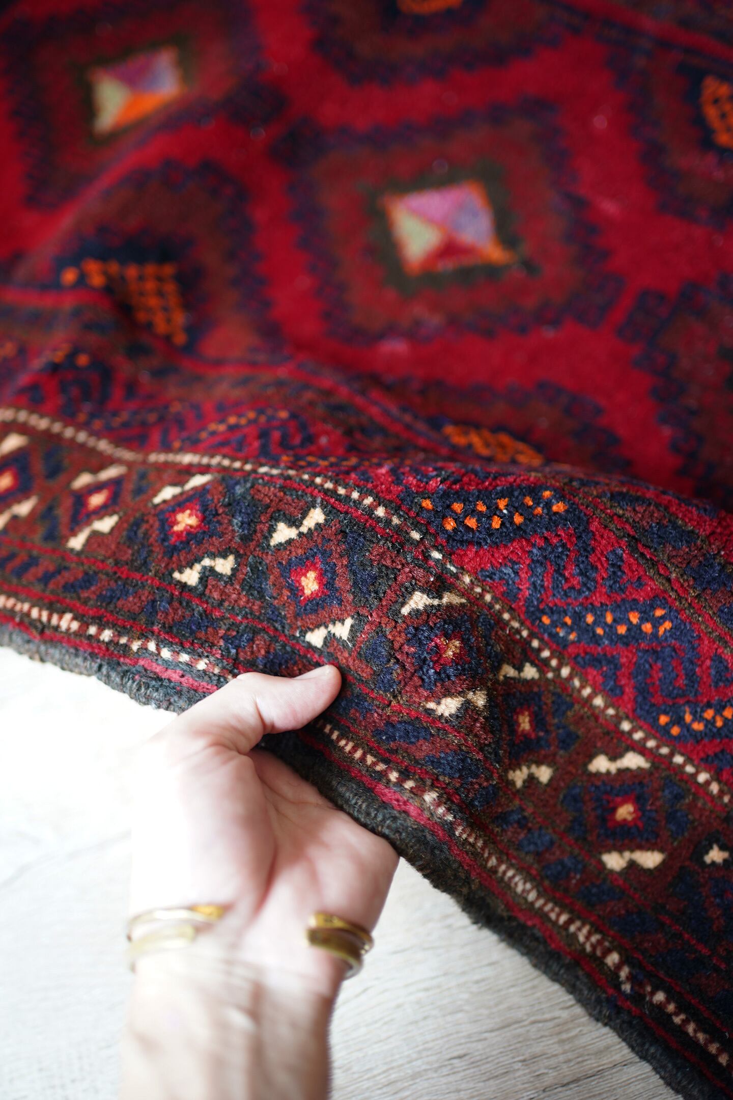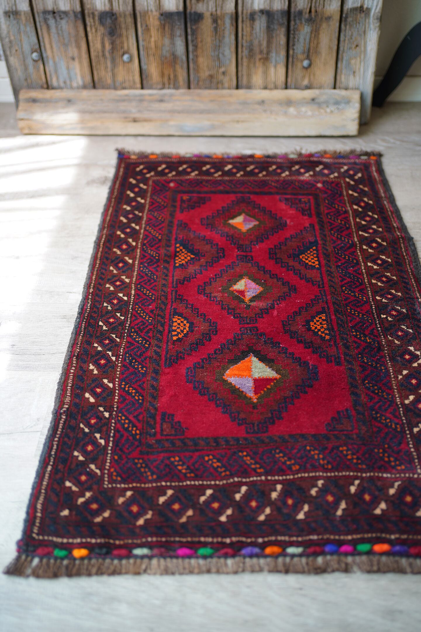 3連のカラフルな菱形紋様が可愛らしい経年約50年のバルーチラグ。濃いめの赤をベースとした配色に、フリンジ部分に付いた多彩な装飾の玉が素敵で、心ときめくキュートさを持ち合わせた一枚。ふわっと柔らかい優しい肌触りで、厚みは7mmほど。ほとんど気にならない程度ですが、一部補修により色味が薄くなっている箇所がございます(お写真最後をご参照ください)。チェストの前など、お家のちょっとしたスペースに♪