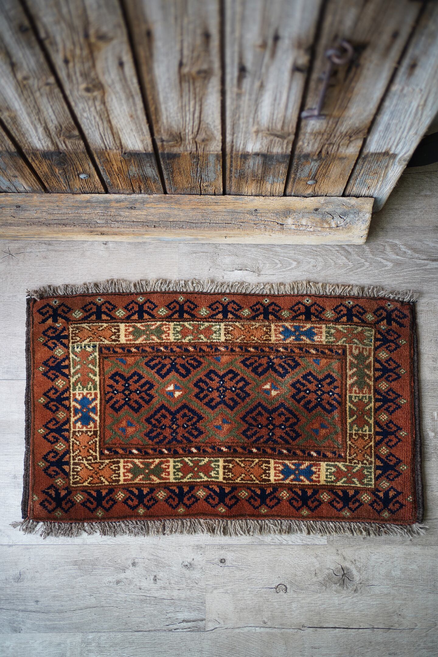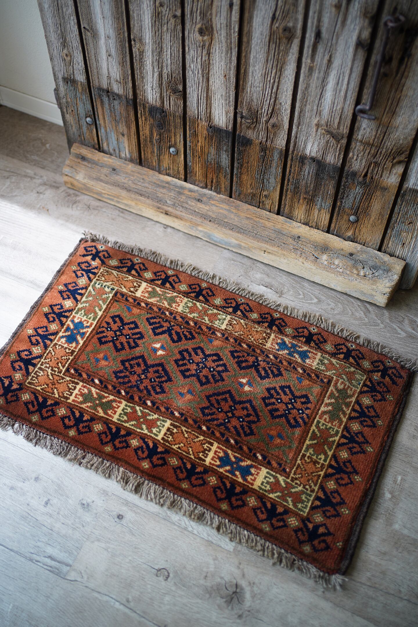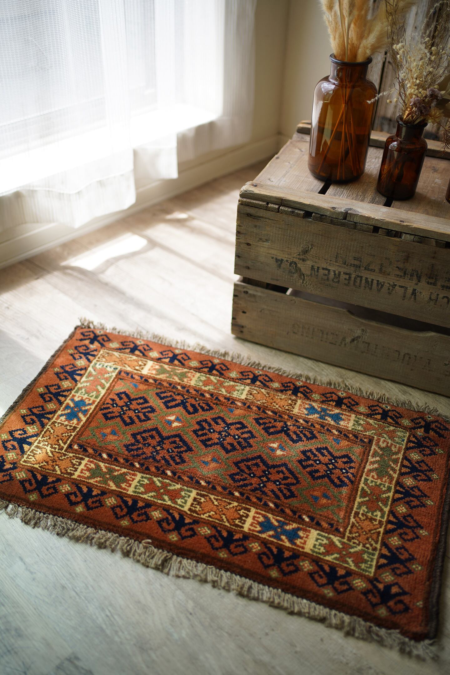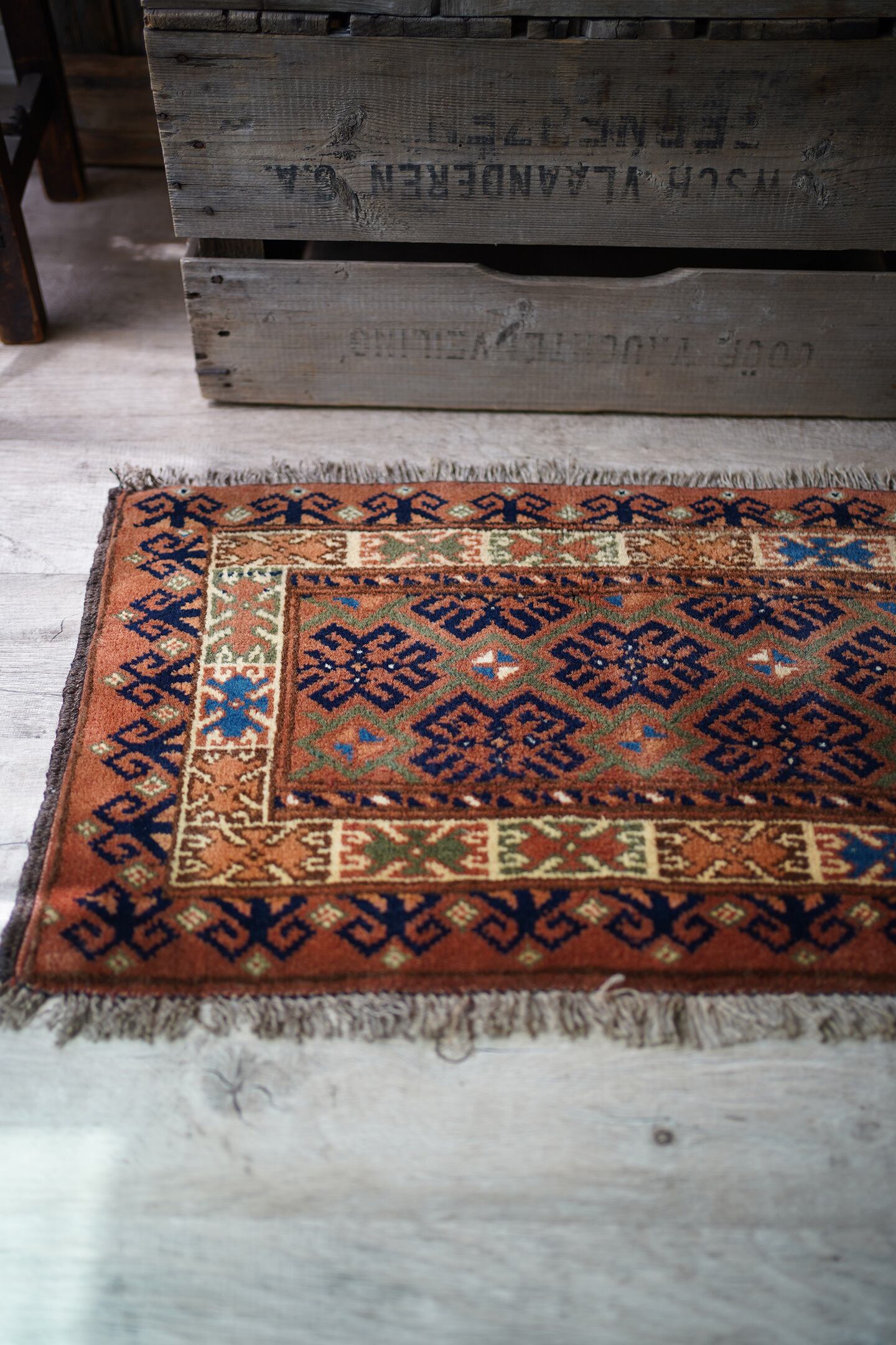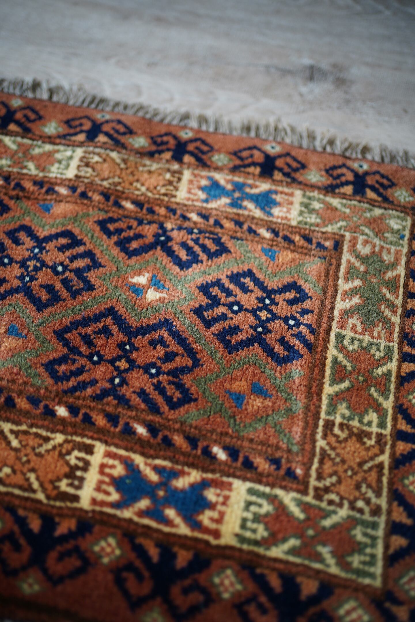 おおよそ30年前に織られたアフガニスタン産のトルクメンラグ。優しい雰囲気のブラウンカラーをベースに、濃紺、モスグリーン、ベージュなど落ち着いた色合いの組み合わせで、様々なインテリアに合わせやすいかと思います。厚みも1cm程度あり、毛足も長くふかふかの質感。目立った補修跡やダメージもなく、状態良好です。玄関や洗面所、全身鏡の前など様々な場所にどうぞ♫