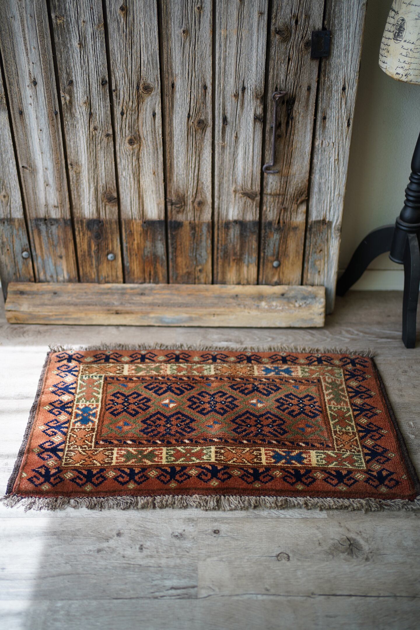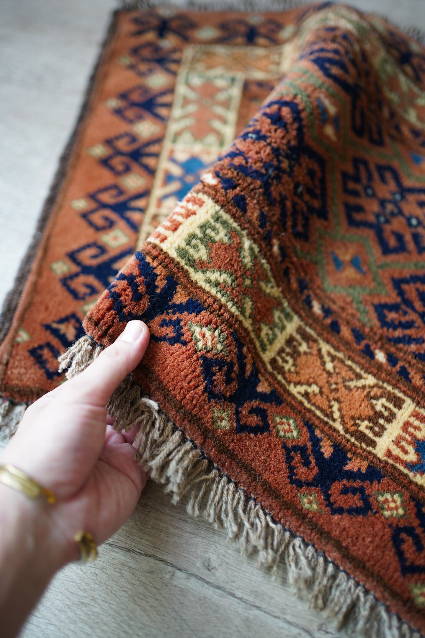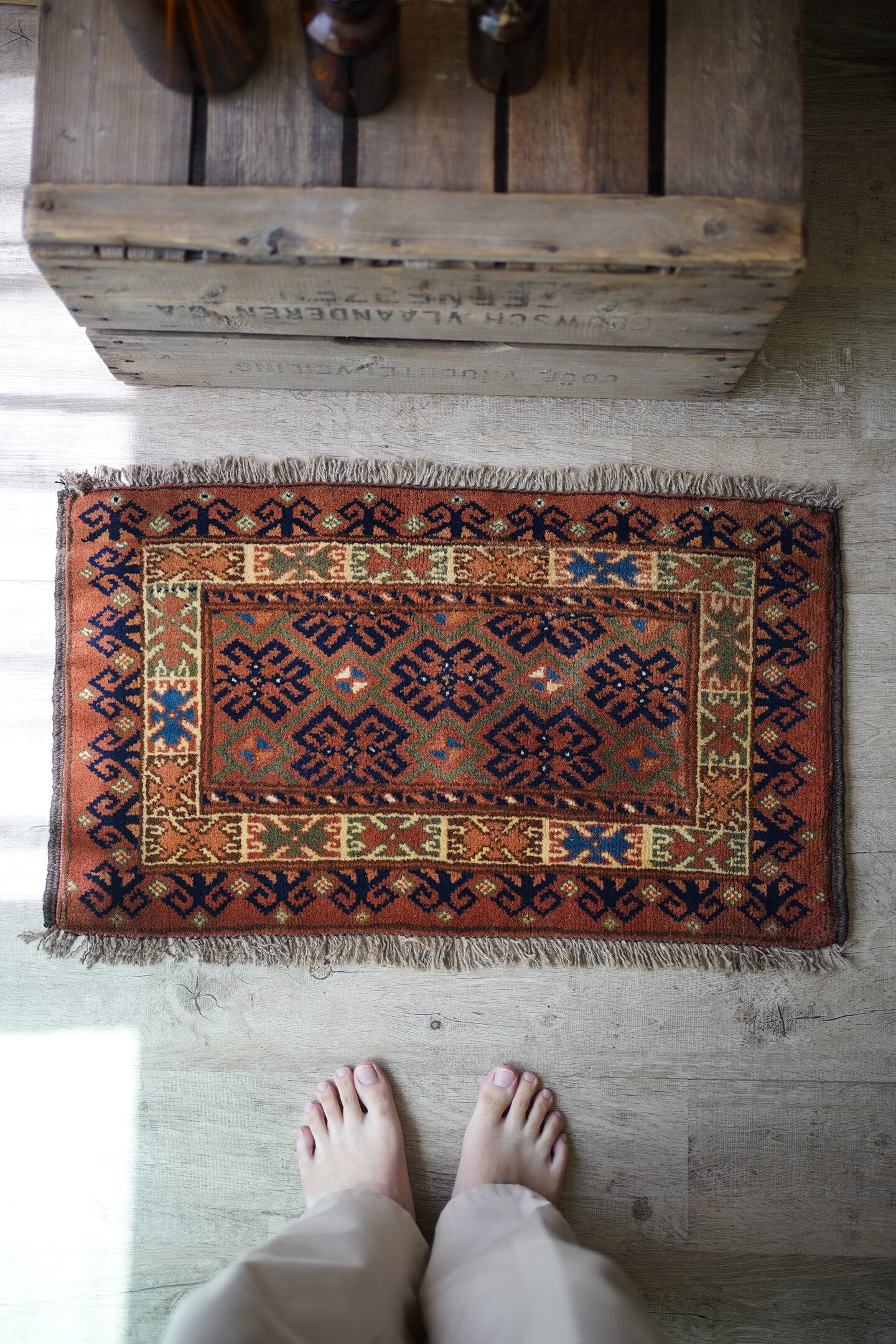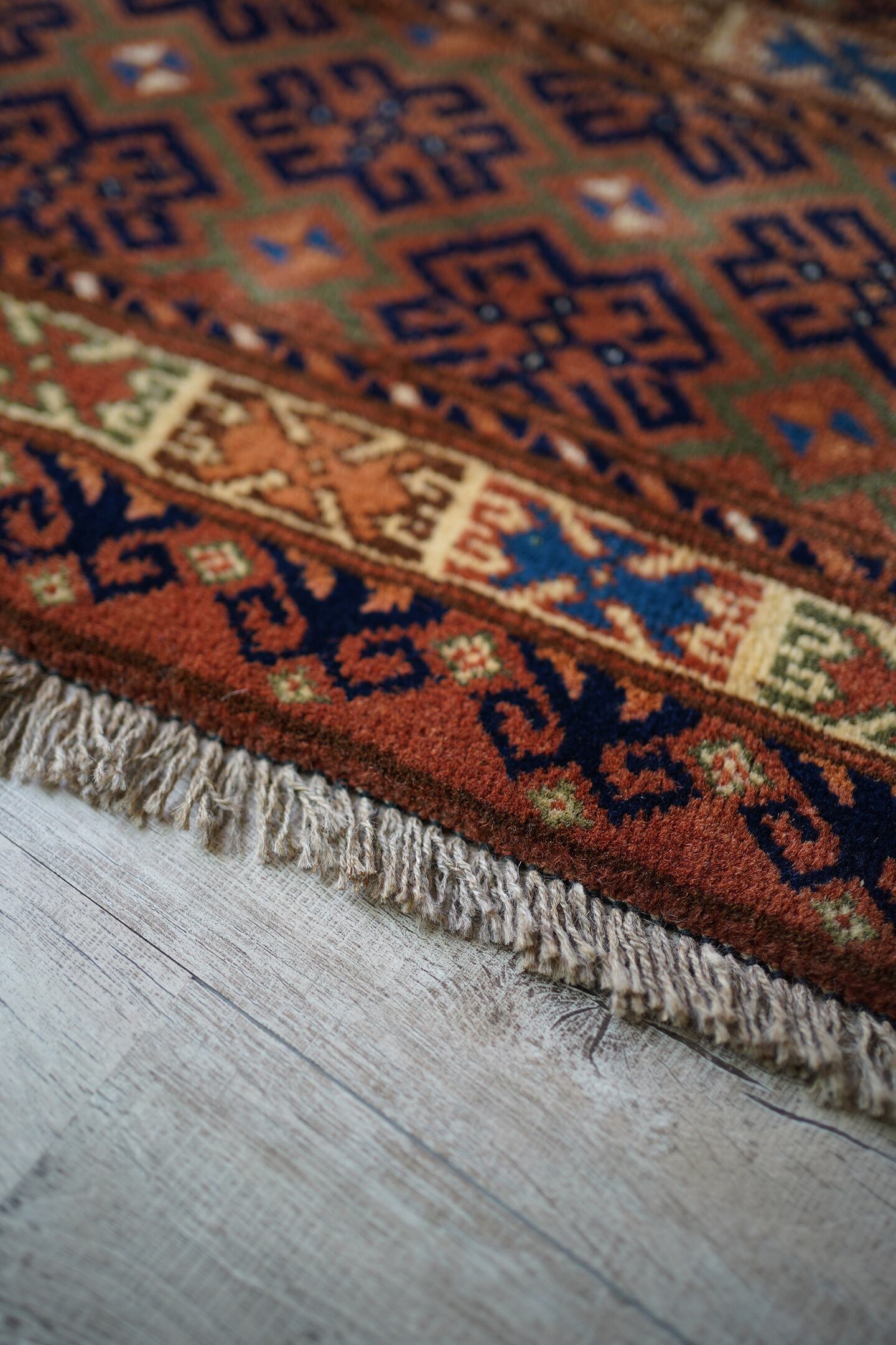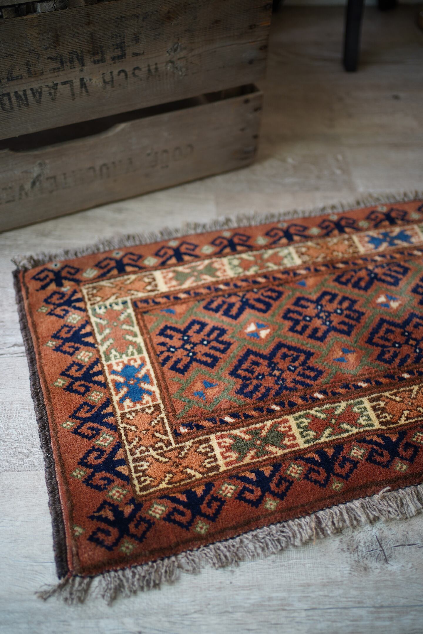 おおよそ30年前に織られたアフガニスタン産のトルクメンラグ。優しい雰囲気のブラウンカラーをベースに、濃紺、モスグリーン、ベージュなど落ち着いた色合いの組み合わせで、様々なインテリアに合わせやすいかと思います。厚みも1cm程度あり、毛足も長くふかふかの質感。目立った補修跡やダメージもなく、状態良好です。玄関や洗面所、全身鏡の前など様々な場所にどうぞ♫