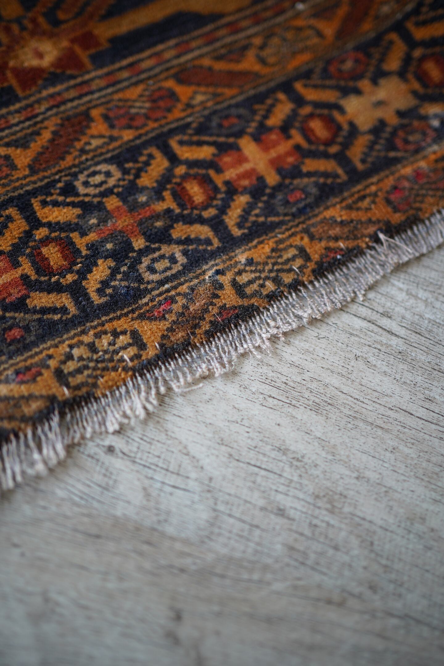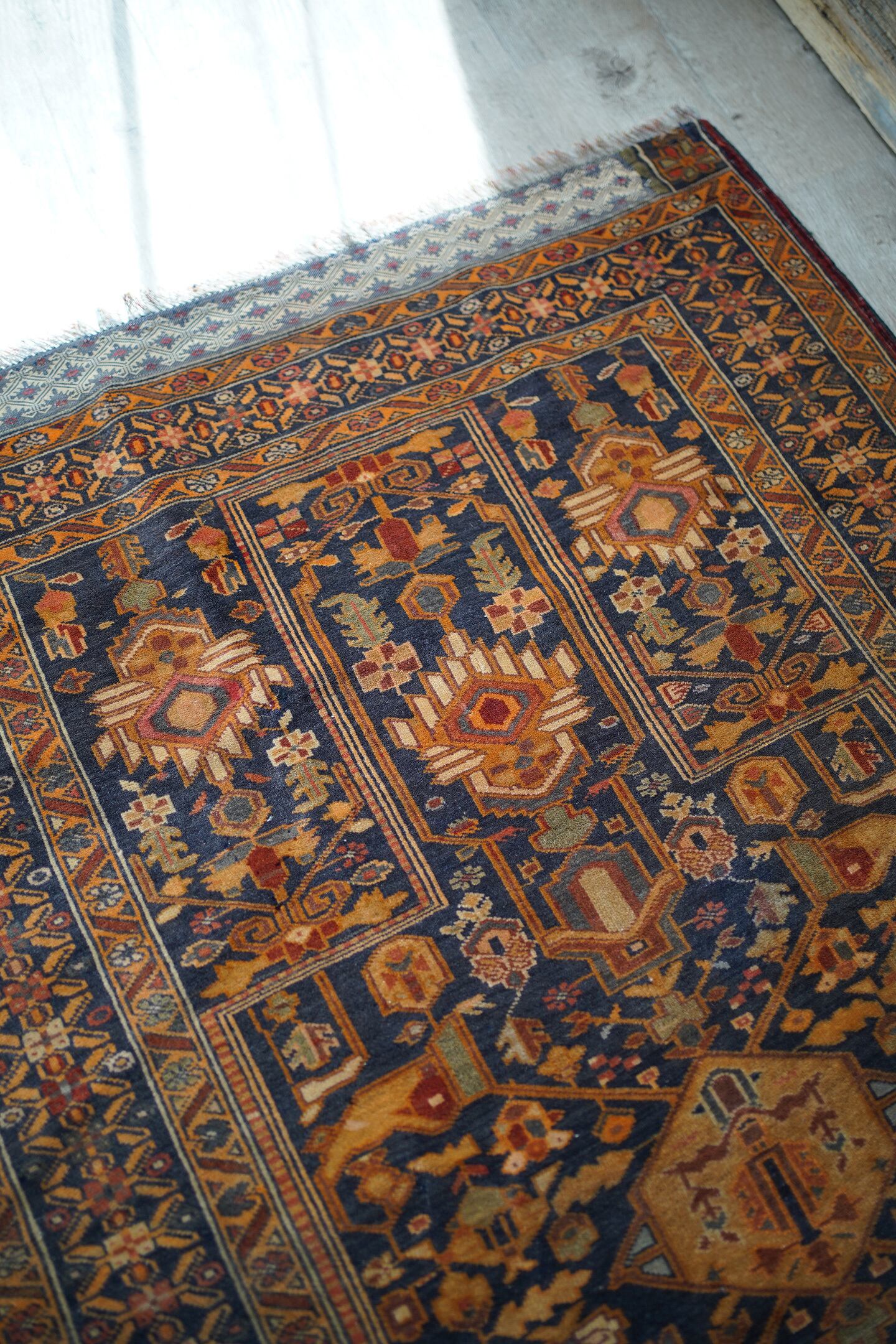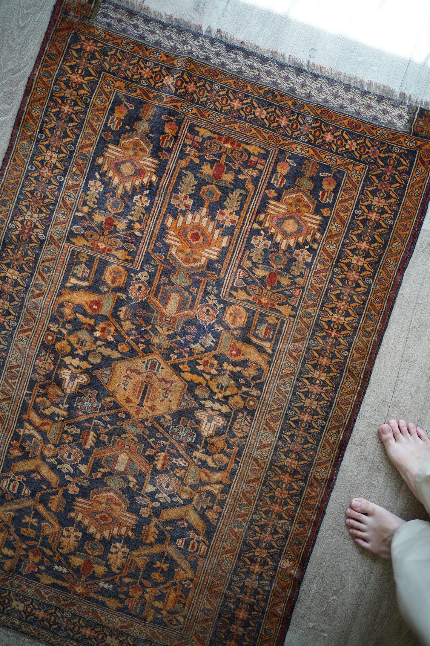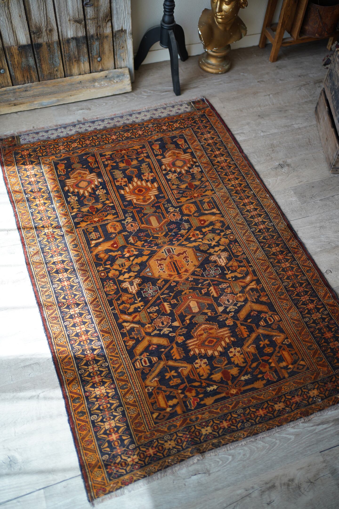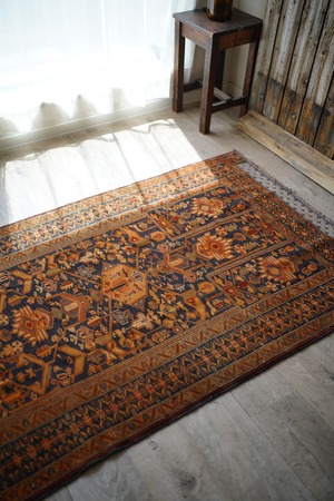 経年約40年のマリキバルーチラグ。花瓶に添えられた花をモチーフにしたようなデザインは、埋め尽くすように繊細な紋様が散りばめられています。褪せたオレンジとキャメルの間のような渋めの色味にブラックの配色で、艶もある関係で肉眼で見るとやや写真よりも色褪せて見える印象がございます。またフリンジは片側のみキリムエンドの作り。厚みは5mm程度で低めのパイルですが、毛並みの長さも綺麗に統一になっており、目の詰まったタイプ。表面はサラッとしつつも、しなやかな質感を感じる肌触りです。フリンジの片側に房止め加工が施されていますので、お写真最後の2枚をご参照ください。それ以外は目立ったダメージや補修跡もなく、状態も良好です。リビングのセカンドラグや小さめのワークデスクの下に敷いたりと色んな場所で活躍してくれそう♫