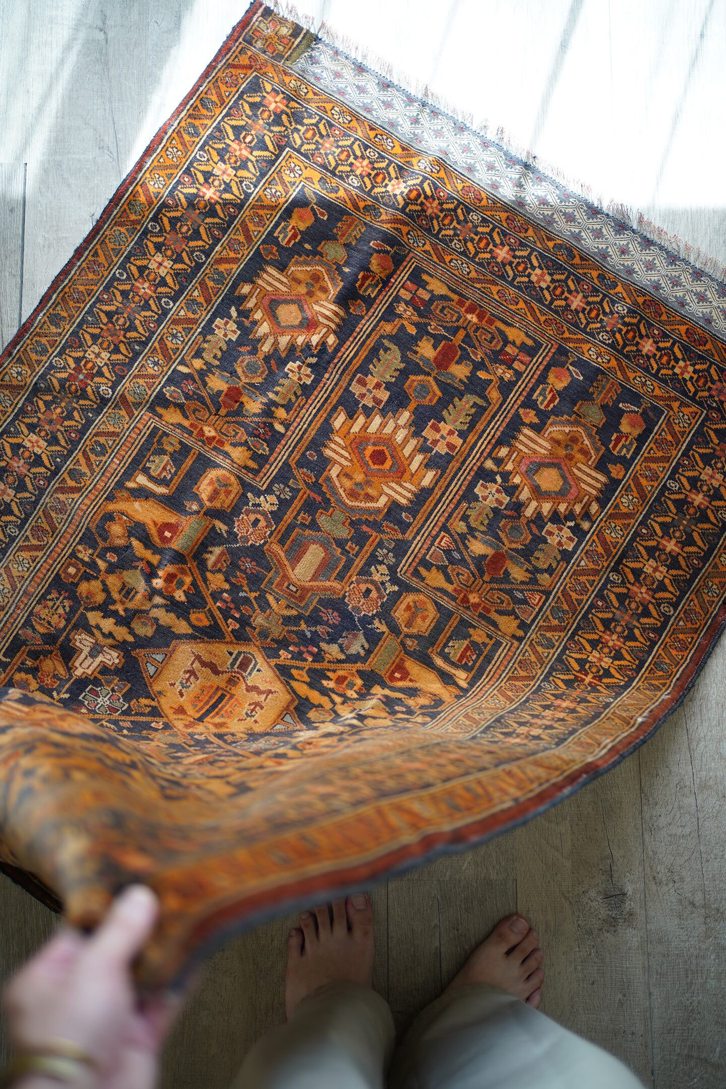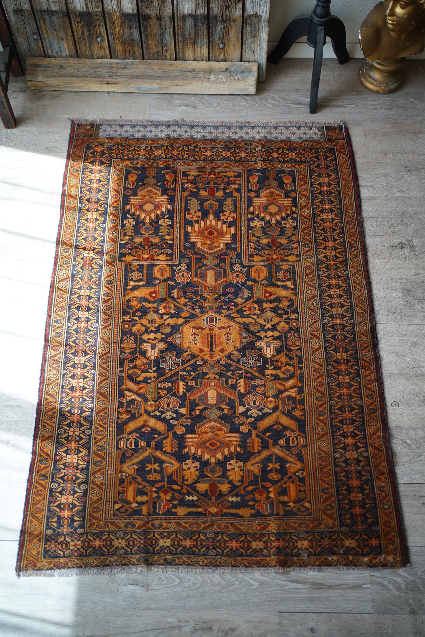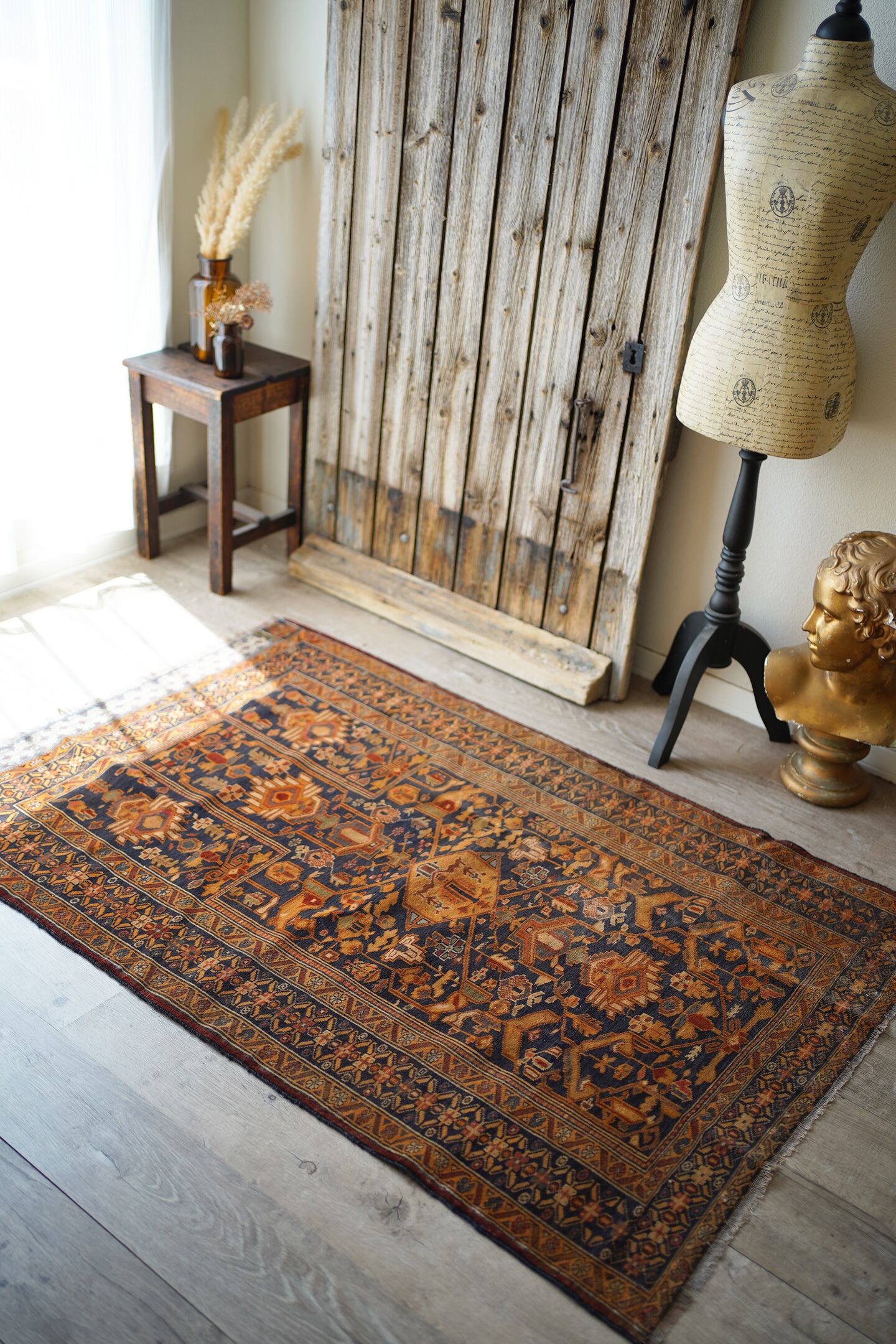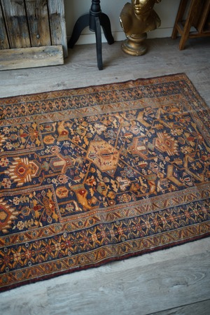 経年約40年のマリキバルーチラグ。花瓶に添えられた花をモチーフにしたようなデザインは、埋め尽くすように繊細な紋様が散りばめられています。褪せたオレンジとキャメルの間のような渋めの色味にブラックの配色で、艶もある関係で肉眼で見るとやや写真よりも色褪せて見える印象がございます。またフリンジは片側のみキリムエンドの作り。厚みは5mm程度で低めのパイルですが、毛並みの長さも綺麗に統一になっており、目の詰まったタイプ。表面はサラッとしつつも、しなやかな質感を感じる肌触りです。フリンジの片側に房止め加工が施されていますので、お写真最後の2枚をご参照ください。それ以外は目立ったダメージや補修跡もなく、状態も良好です。リビングのセカンドラグや小さめのワークデスクの下に敷いたりと色んな場所で活躍してくれそう♫
