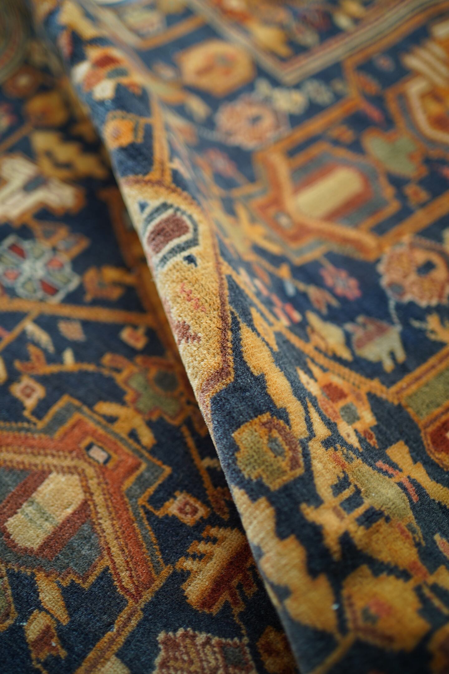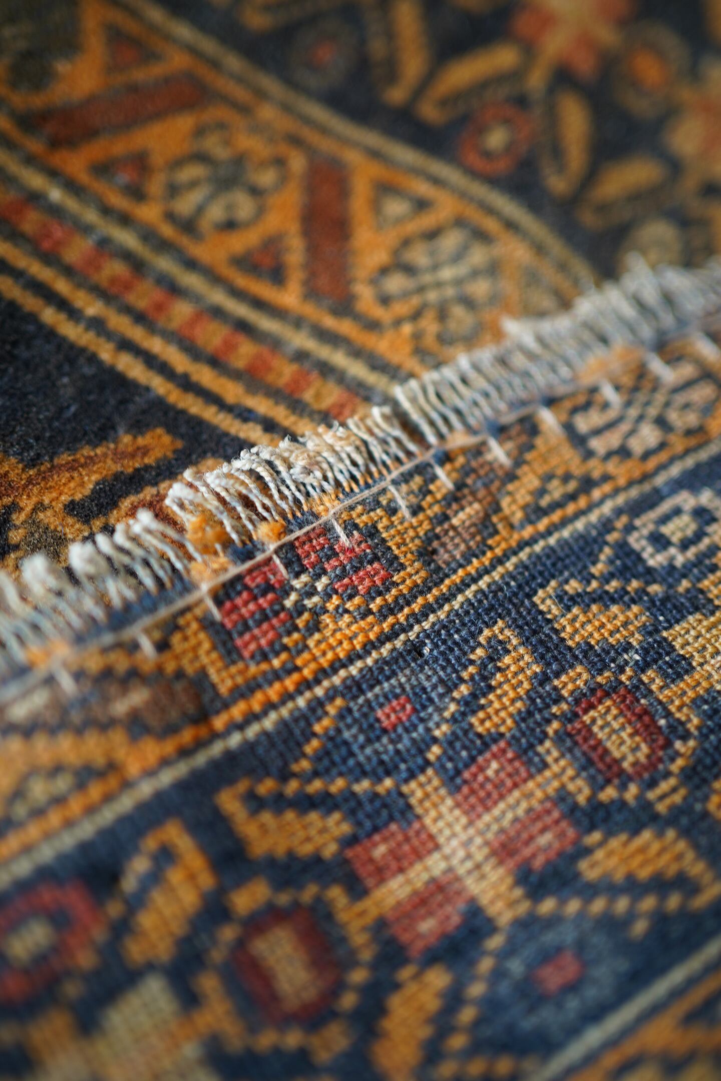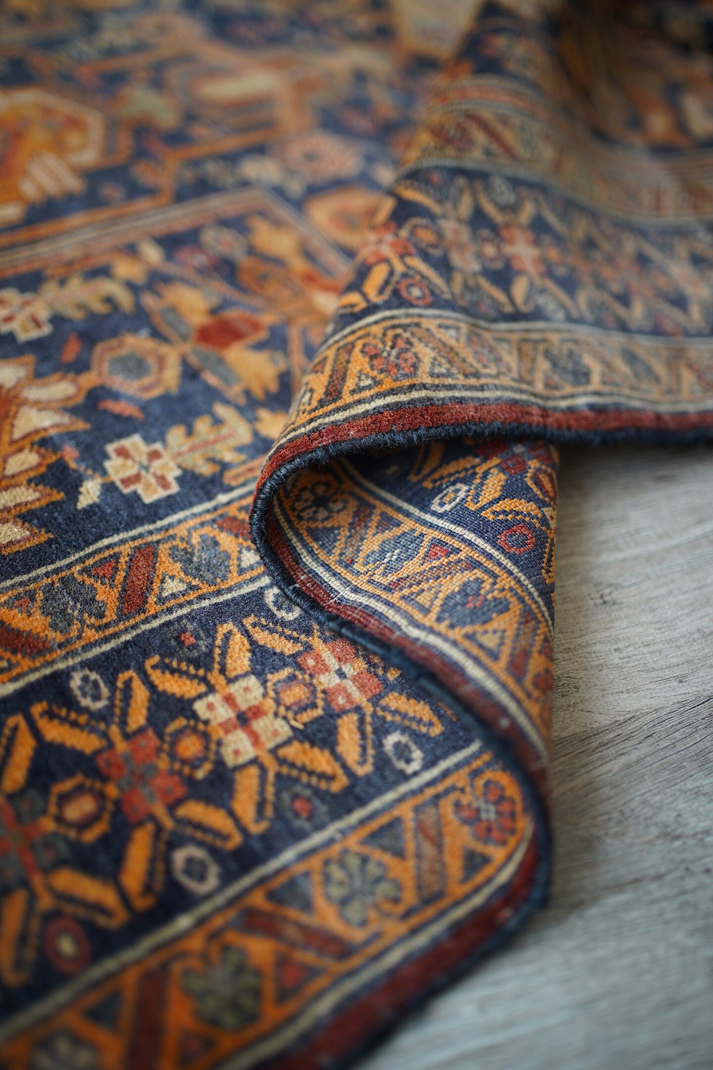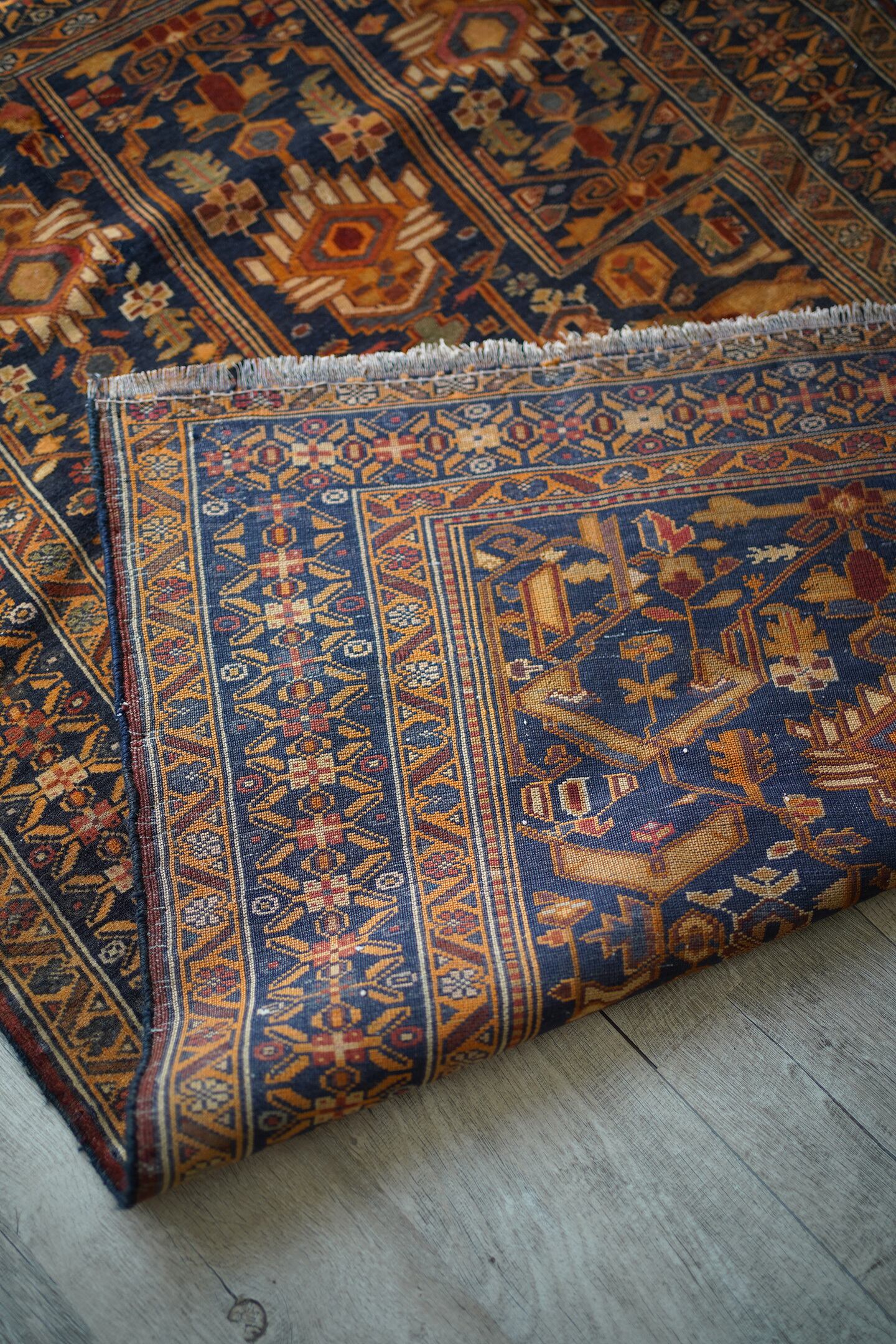 経年約40年のマリキバルーチラグ。花瓶に添えられた花をモチーフにしたようなデザインは、埋め尽くすように繊細な紋様が散りばめられています。褪せたオレンジとキャメルの間のような渋めの色味にブラックの配色で、艶もある関係で肉眼で見るとやや写真よりも色褪せて見える印象がございます。またフリンジは片側のみキリムエンドの作り。厚みは5mm程度で低めのパイルですが、毛並みの長さも綺麗に統一になっており、目の詰まったタイプ。表面はサラッとしつつも、しなやかな質感を感じる肌触りです。フリンジの片側に房止め加工が施されていますので、お写真最後の2枚をご参照ください。それ以外は目立ったダメージや補修跡もなく、状態も良好です。リビングのセカンドラグや小さめのワークデスクの下に敷いたりと色んな場所で活躍してくれそう♫
