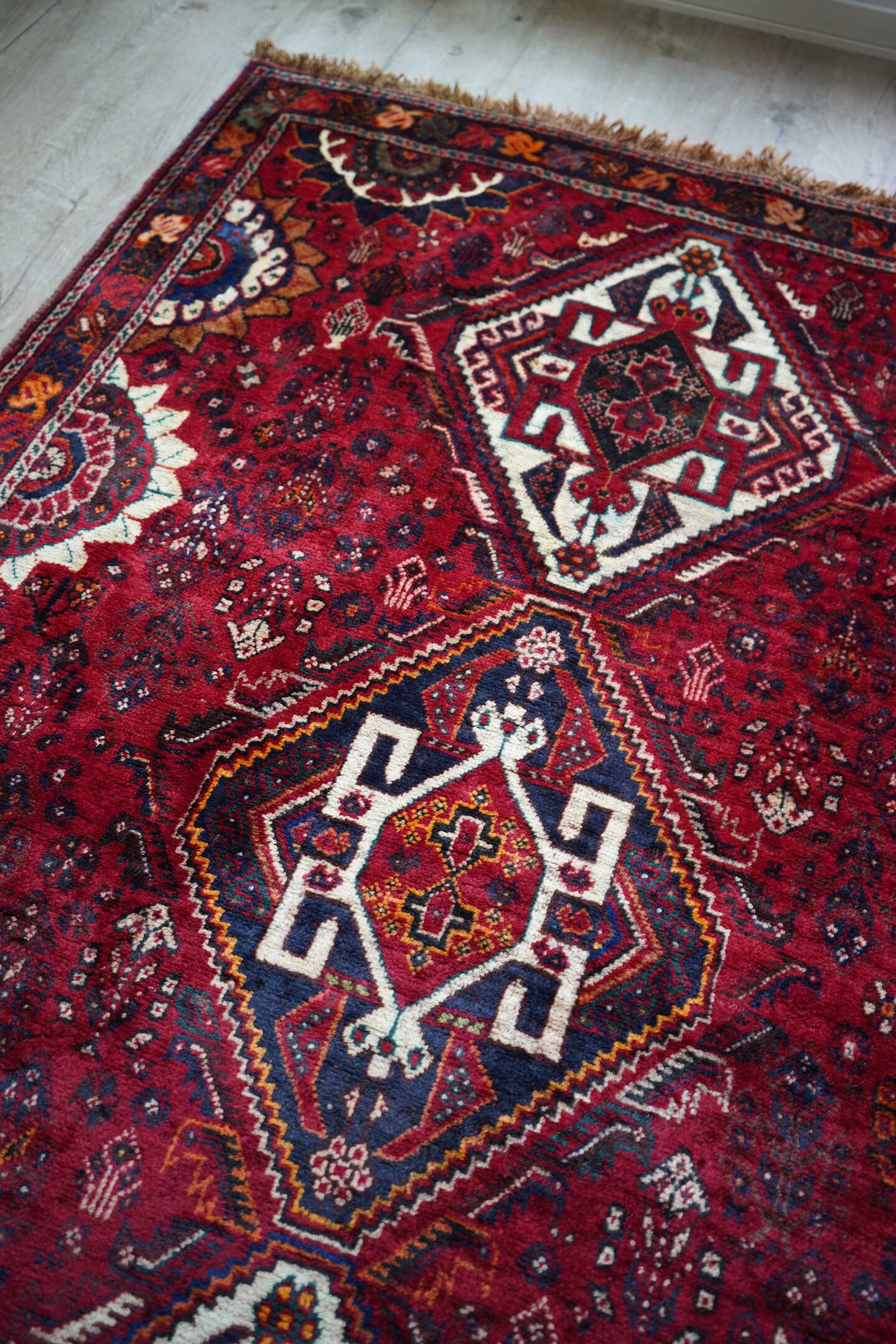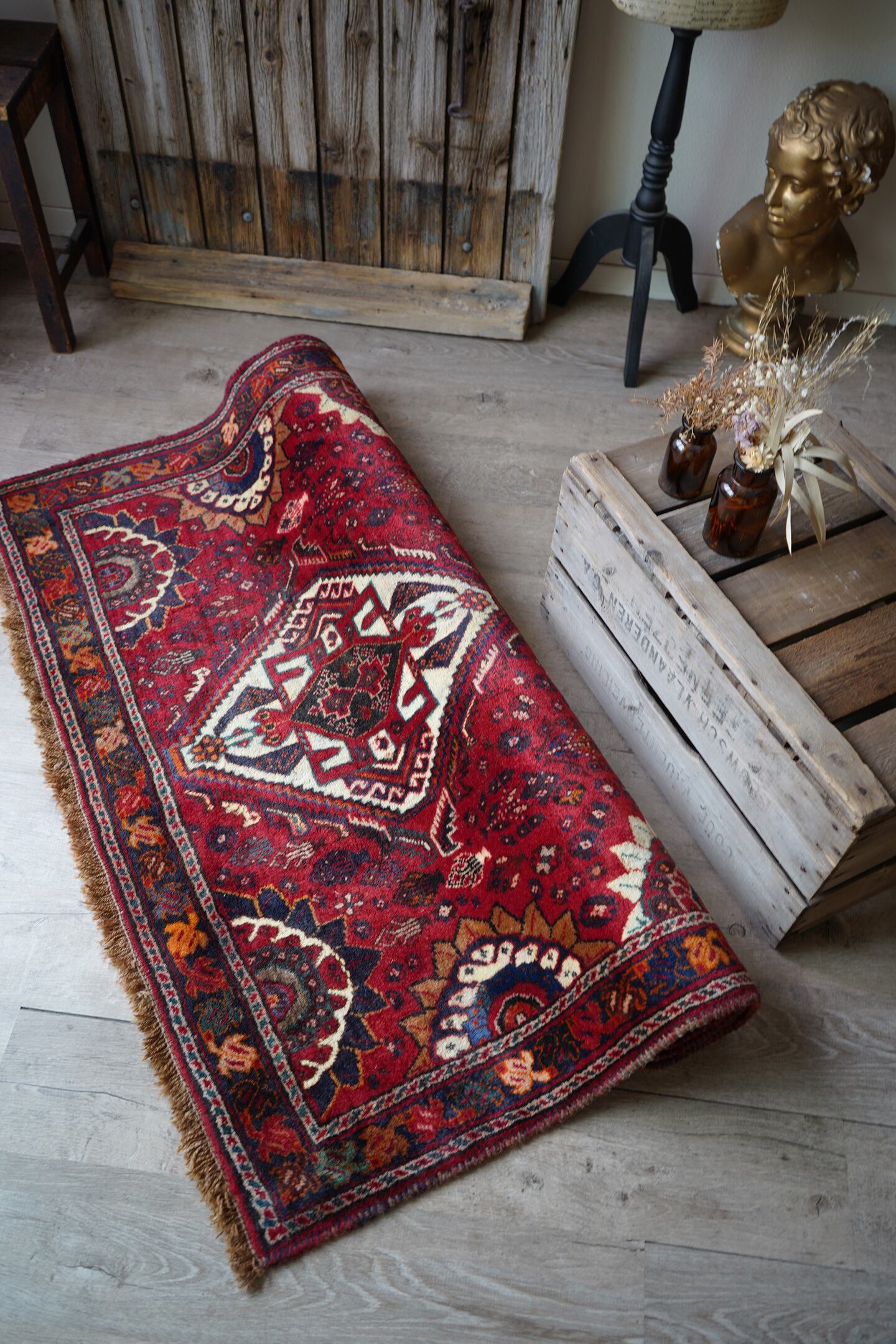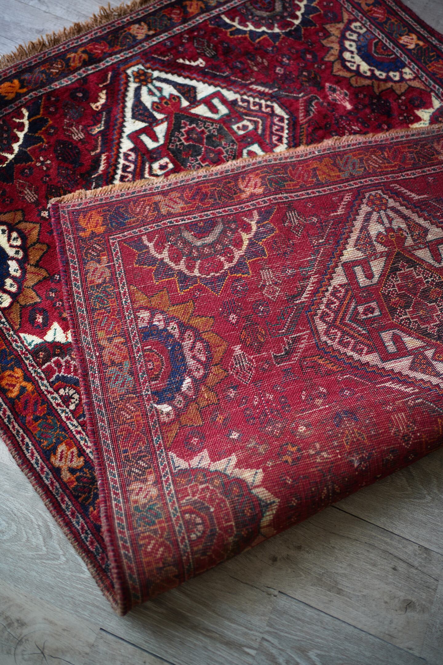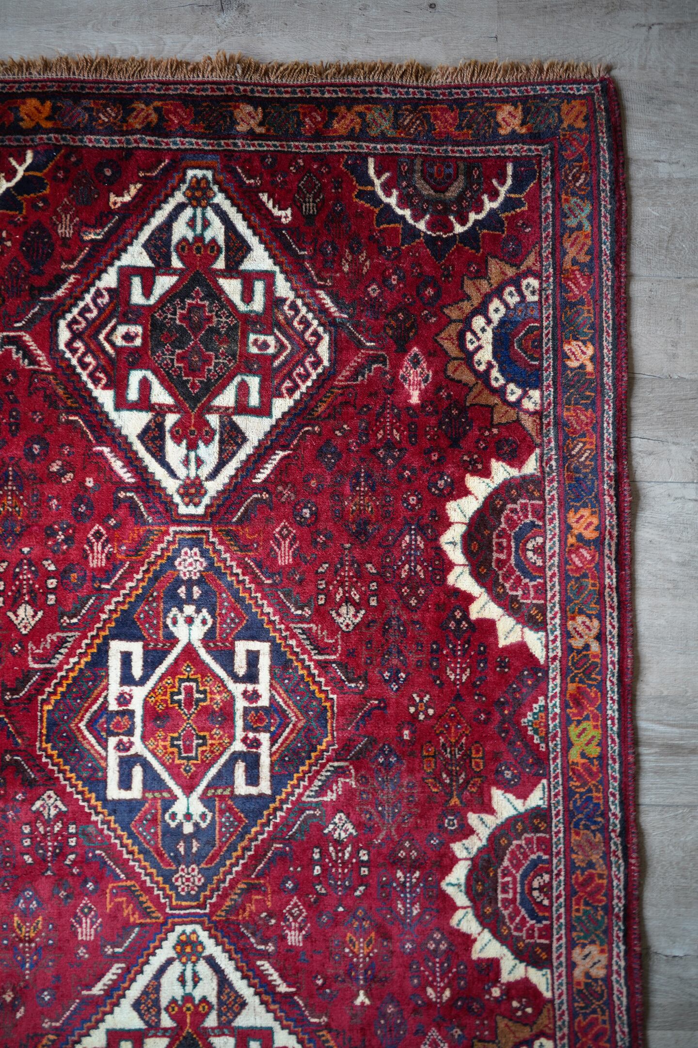 おおよそ60年前にカシュガイ族によって織られたヴィンテージのラグ。深い赤色に浮かび上がる三連のカシュガイメダリオンと半円の花紋様が特徴的で、フィールドやボーダーも花モチーフで作られており可愛らしい雰囲気。パイルに艶も見受けられ大変美しいです。厚みは9mm程度。ふわっとした滑らかな肌触りのパイル、統一感のある毛並みの長さ、厚みのある堅牢な作りと三拍子揃った高品質な一枚。数カ所パイルが少し薄くなっている箇所もありますが、馴染んでいるため、よく見ないとわからない程度で、それ以外は状態も良好です。リビングのソファ前やダイニングテーブルの下などにもオススメ♫