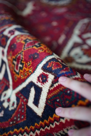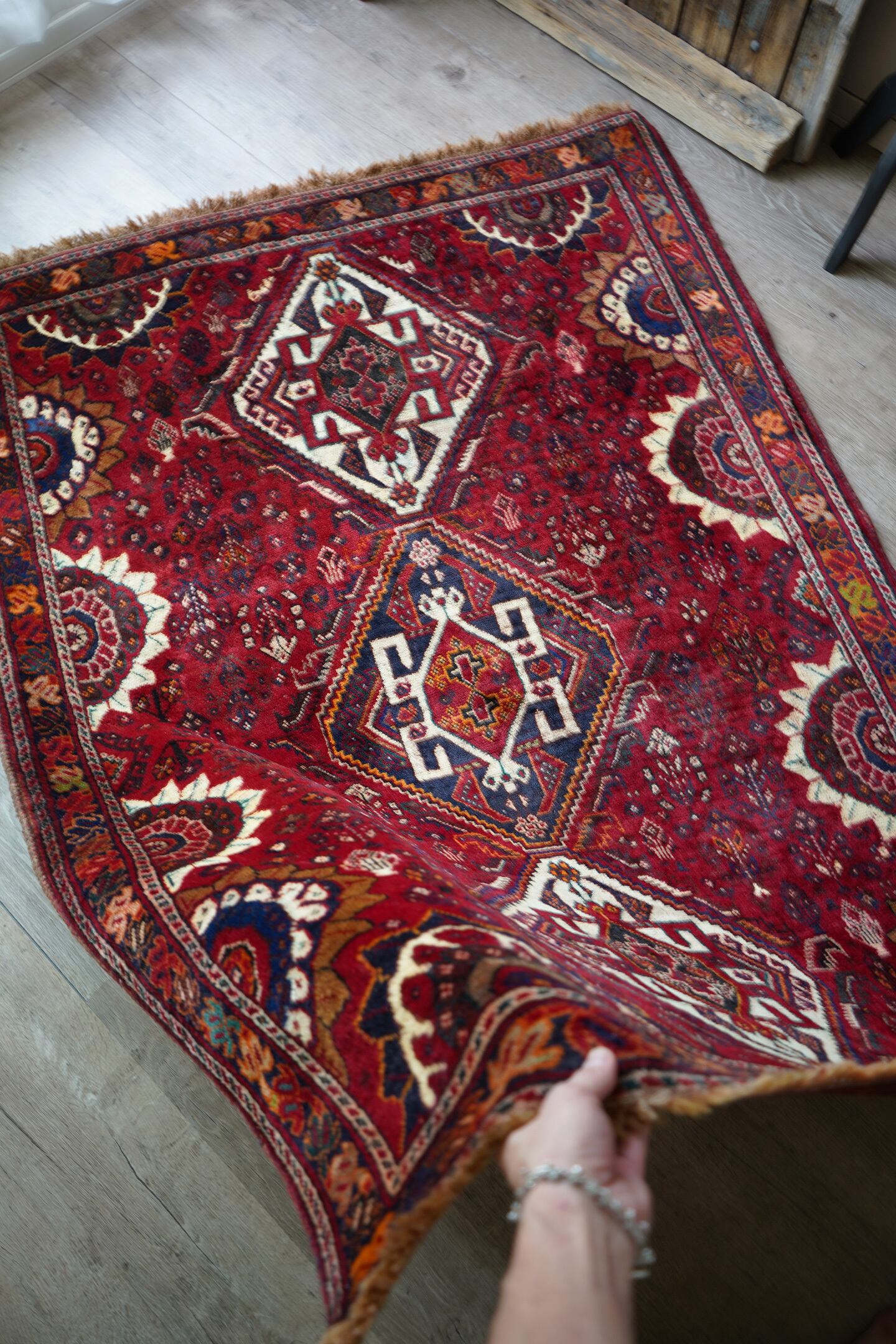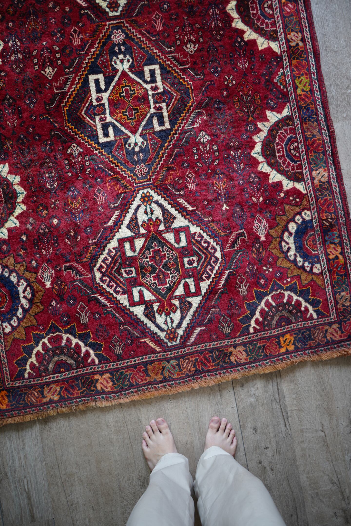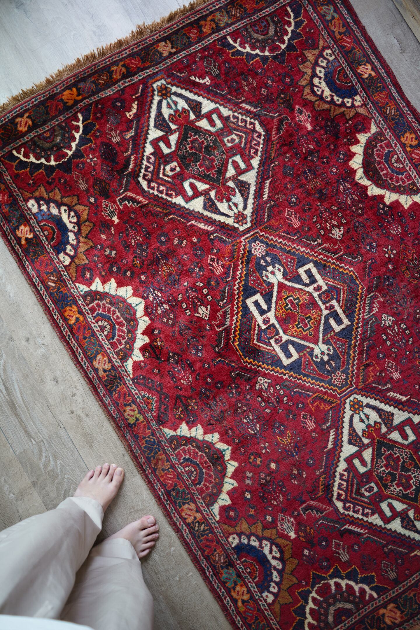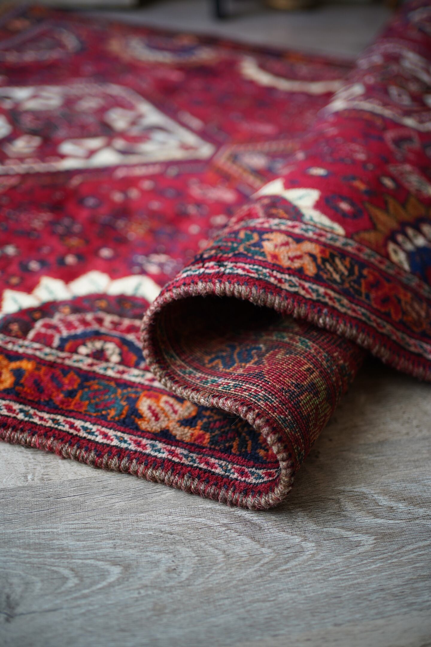 おおよそ60年前にカシュガイ族によって織られたヴィンテージのラグ。深い赤色に浮かび上がる三連のカシュガイメダリオンと半円の花紋様が特徴的で、フィールドやボーダーも花モチーフで作られており可愛らしい雰囲気。パイルに艶も見受けられ大変美しいです。厚みは9mm程度。ふわっとした滑らかな肌触りのパイル、統一感のある毛並みの長さ、厚みのある堅牢な作りと三拍子揃った高品質な一枚。数カ所パイルが少し薄くなっている箇所もありますが、馴染んでいるため、よく見ないとわからない程度で、それ以外は状態も良好です。リビングのソファ前やダイニングテーブルの下などにもオススメ♫