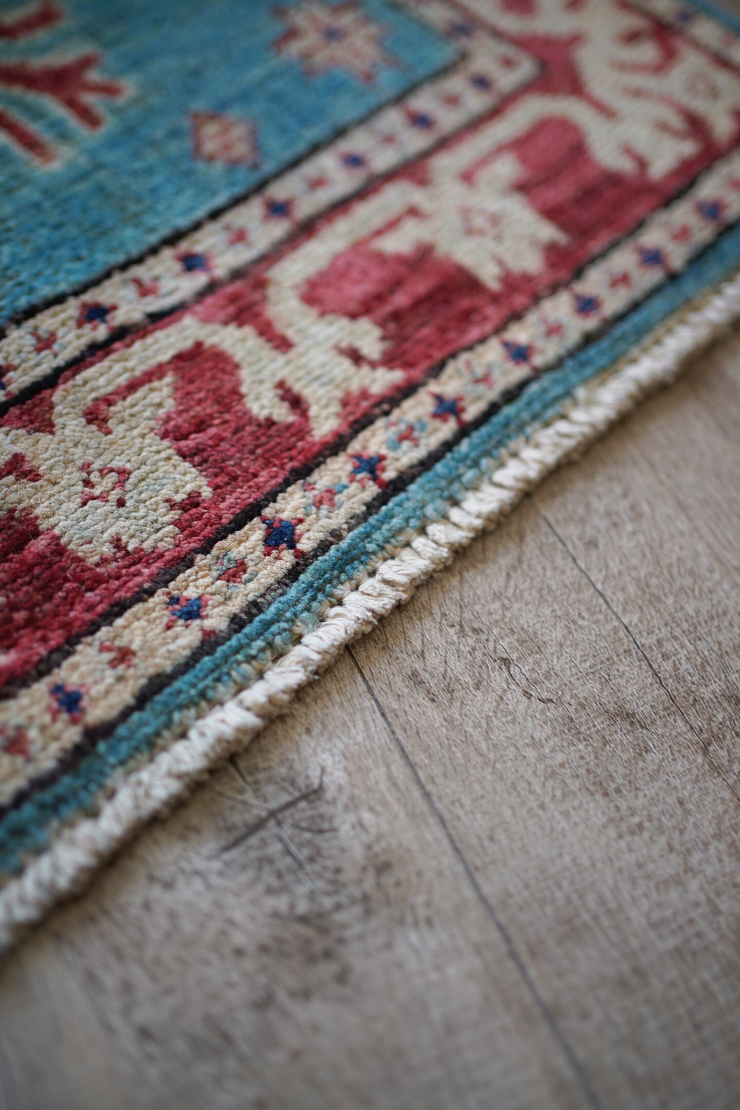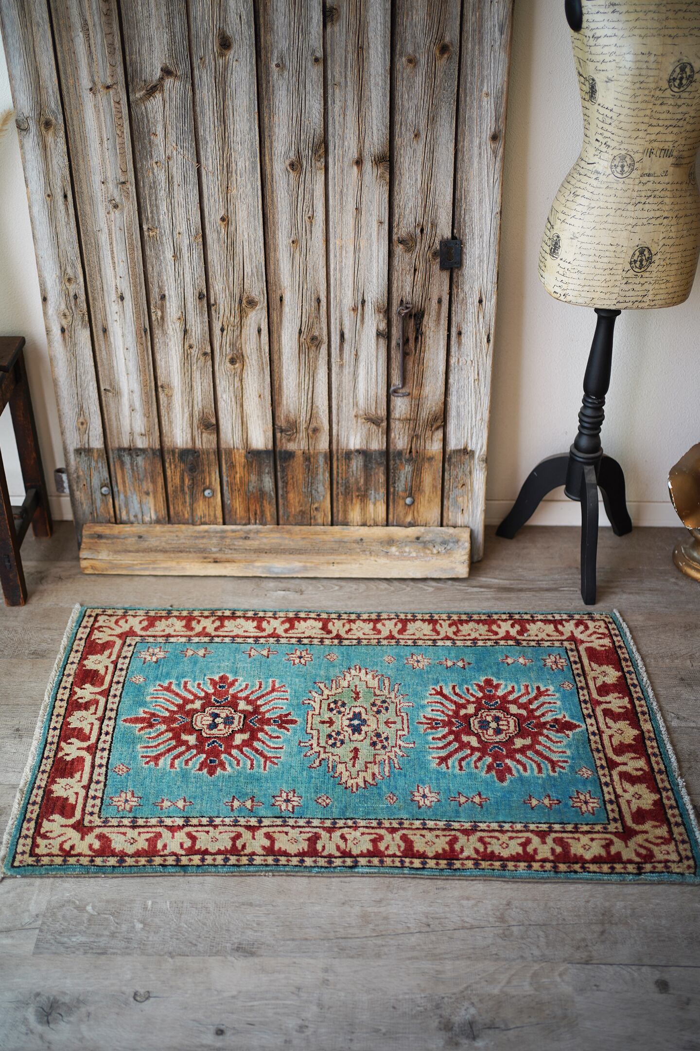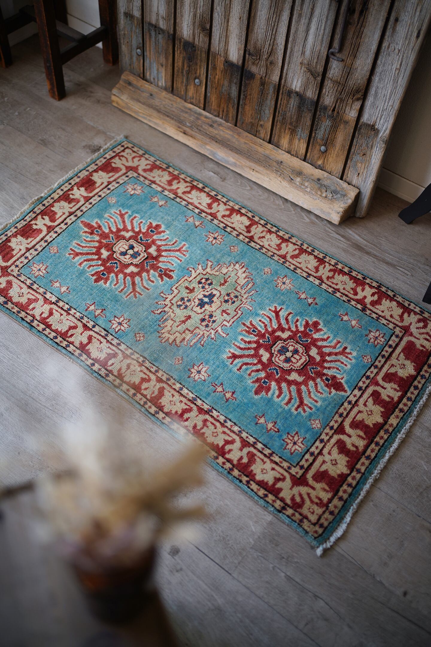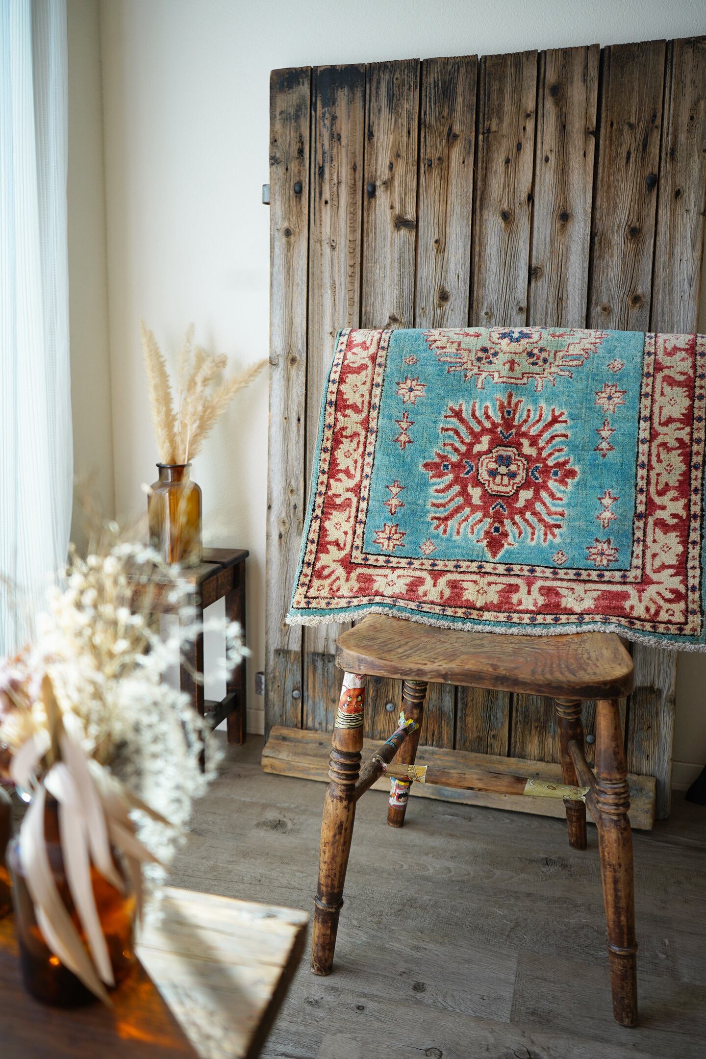 経年約25年〜30年のアフガンラグ。幾何学模様が特徴的なコーカサス地方のカザックラグを模したデザインで、使い込まれた色褪せた風合いが素敵な一枚です。配色は水色とエメラルドグリーンの中間のような珍しい色味に、退色した赤とベージュの組み合わせ。厚みは7mm〜8mmほどで、サラふわっとした肌触りをしています。目立った補修跡も見受けられず、コンディションも良好。ラックやチェストの前に敷いたり、玄関などにもオススメです。