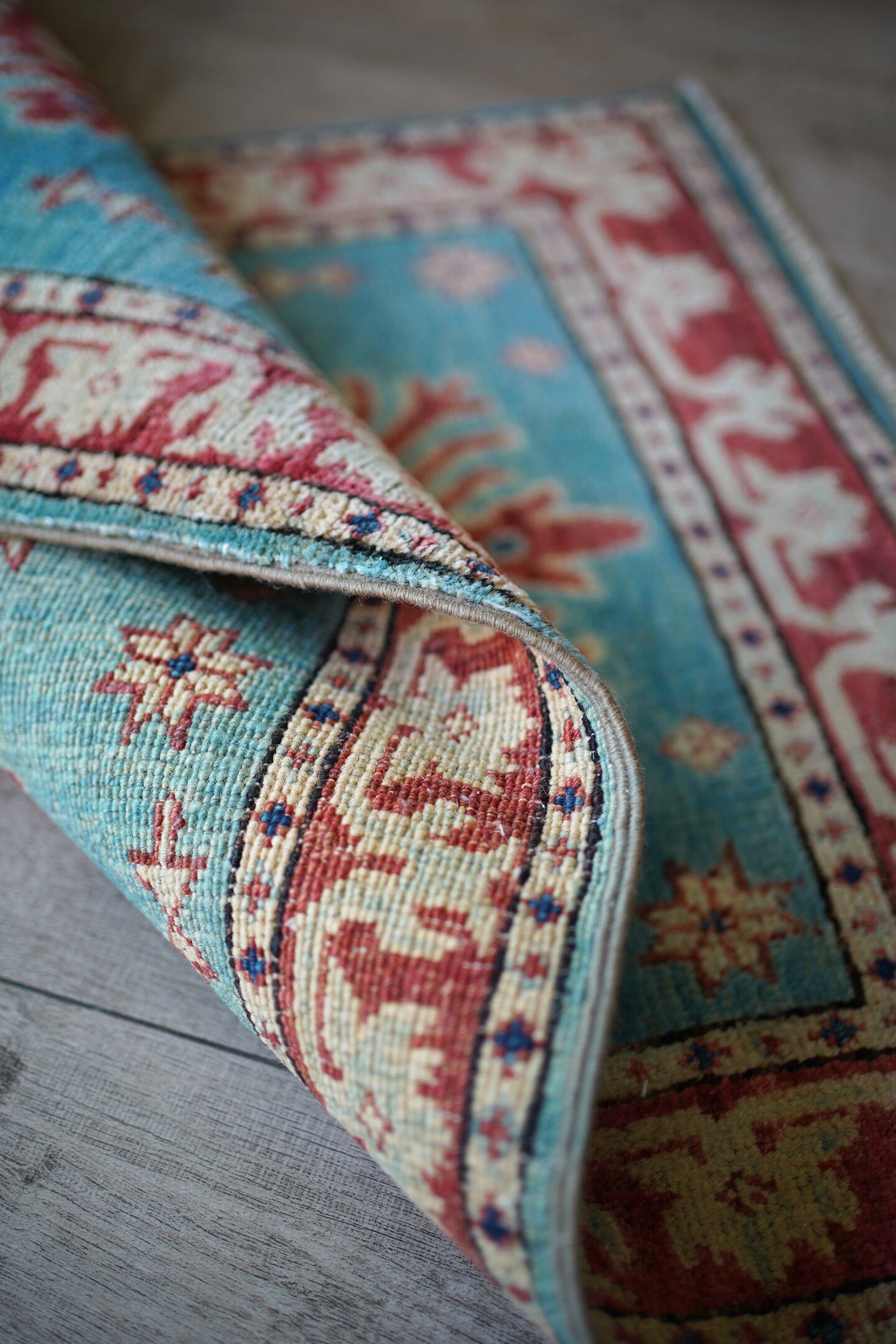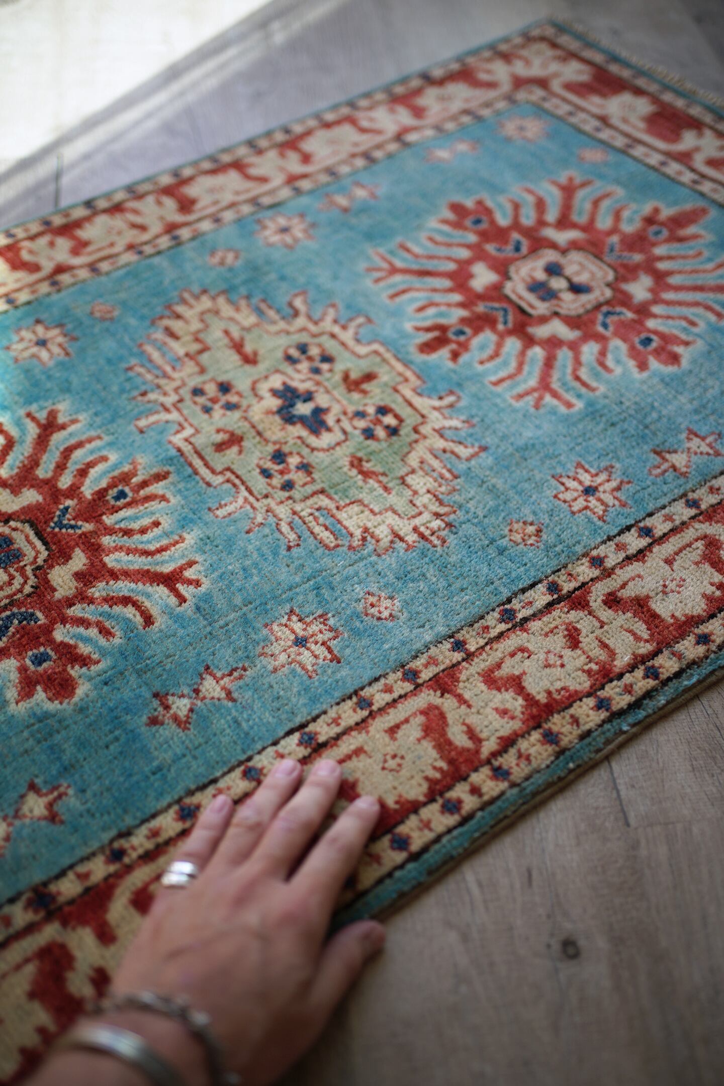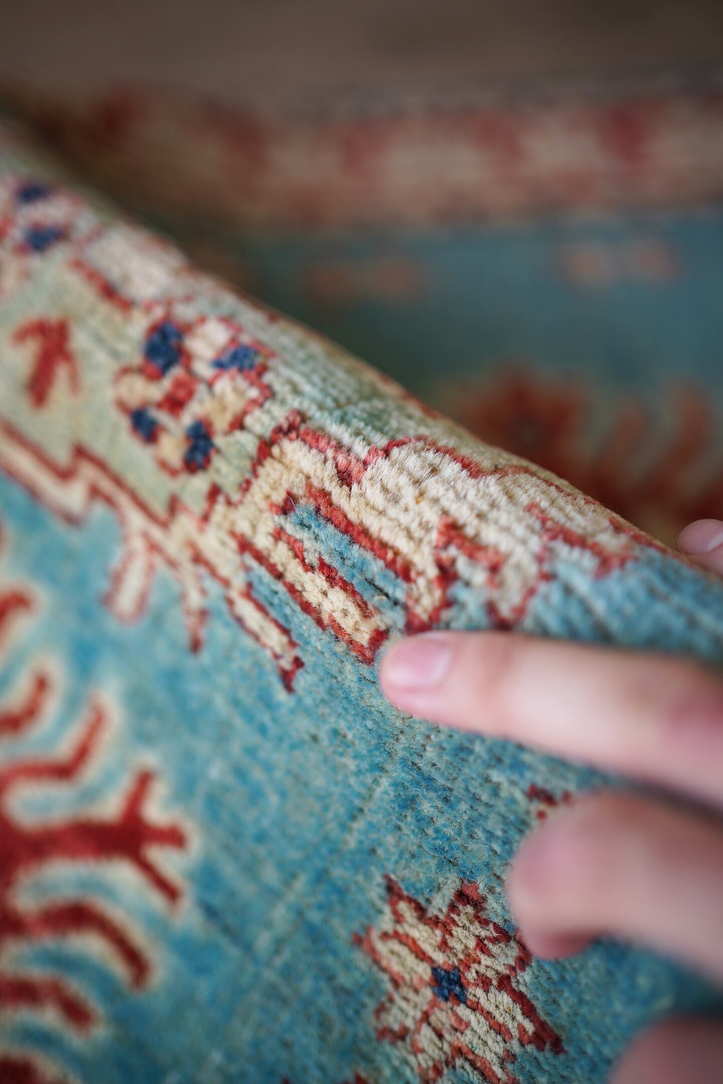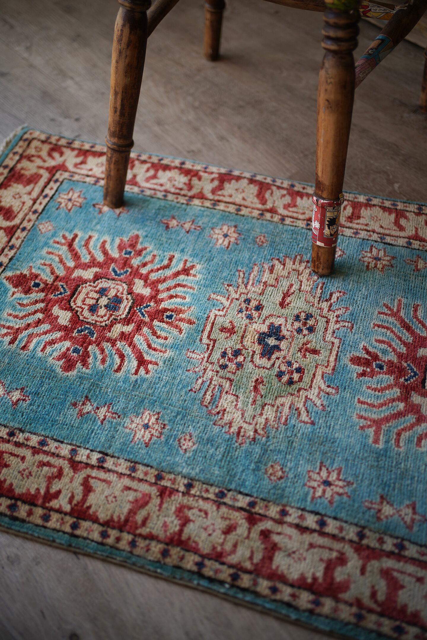 経年約25年〜30年のアフガンラグ。幾何学模様が特徴的なコーカサス地方のカザックラグを模したデザインで、使い込まれた色褪せた風合いが素敵な一枚です。配色は水色とエメラルドグリーンの中間のような珍しい色味に、退色した赤とベージュの組み合わせ。厚みは7mm〜8mmほどで、サラふわっとした肌触りをしています。目立った補修跡も見受けられず、コンディションも良好。ラックやチェストの前に敷いたり、玄関などにもオススメです。