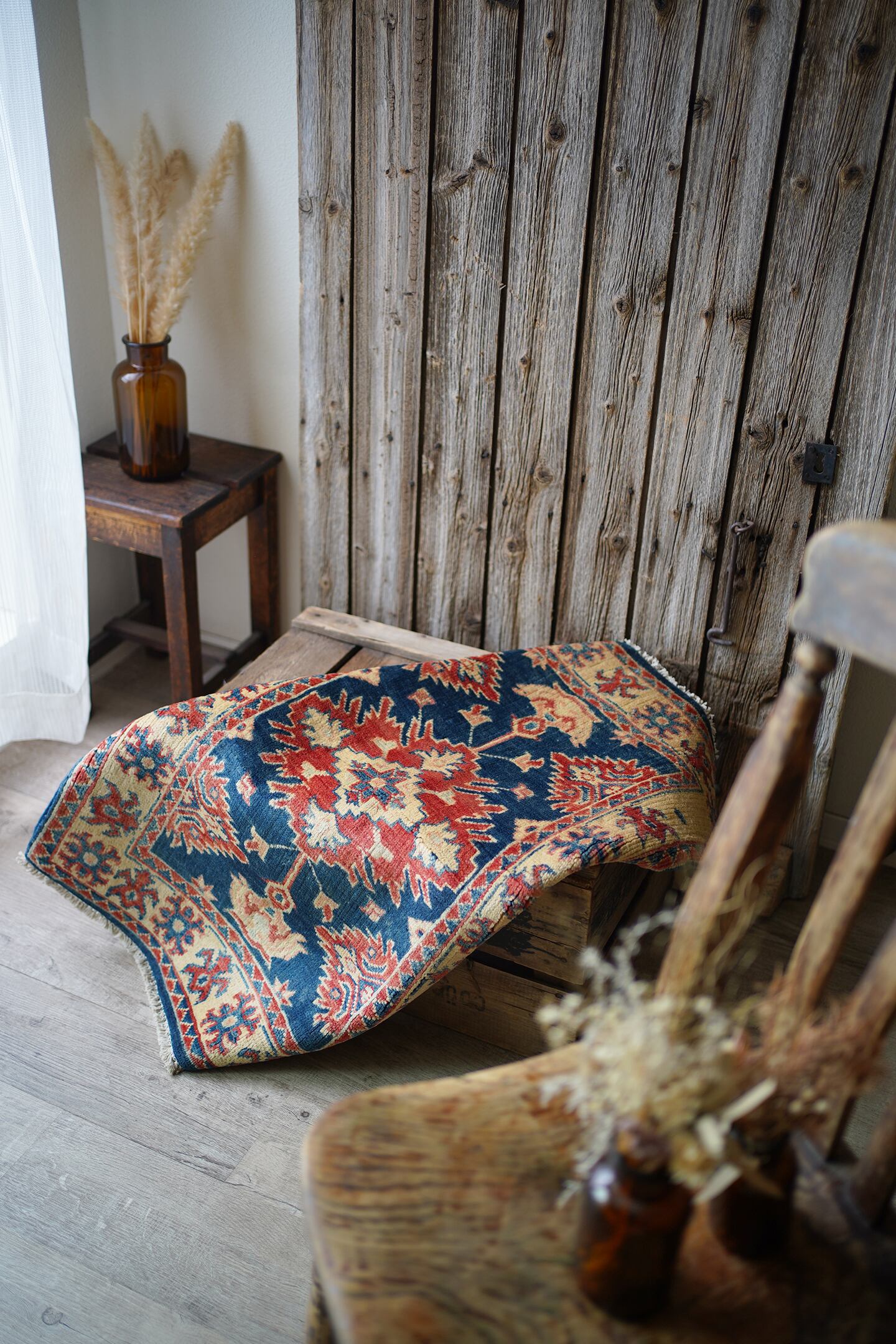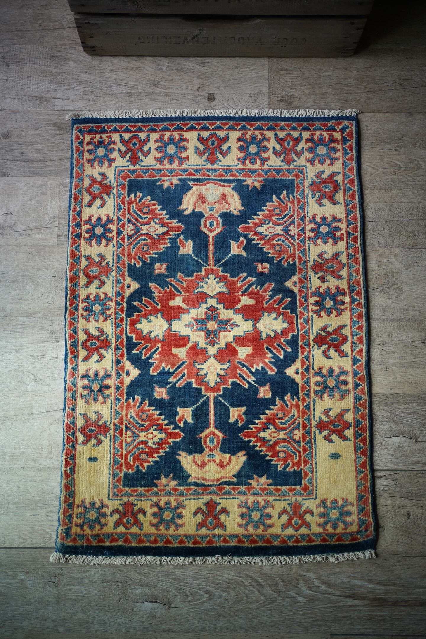 経年約25年〜30年のアフガンラグ。コーカサス地方のカザックラグで使われるサンバースト紋様(イーグルカザック紋様)を模したデザインが特徴的な一枚。お色味はネイビーとベージュに退色したレッドの配色で、パイルに少し艶も感じられます。表面はサラッと滑らかなパイルの質感で、厚みは8mmほど。色褪せた風合いのため、使い込まれたヴィンテージ感がありつつも、特に目立った補修跡は見受けられません。敷く方向、見る角度によって色味が薄く見えたり濃く見えたりするため、最後の画像2枚をご参照ください。全身鏡の前や玄関などにどうぞ♫