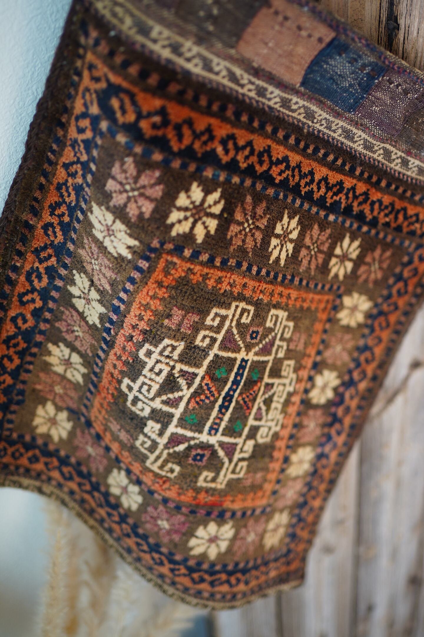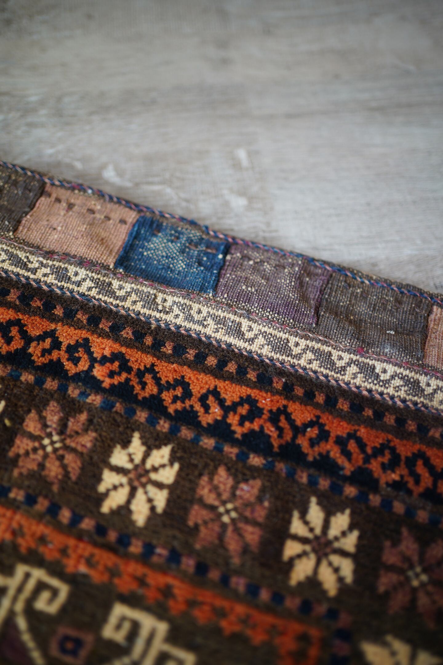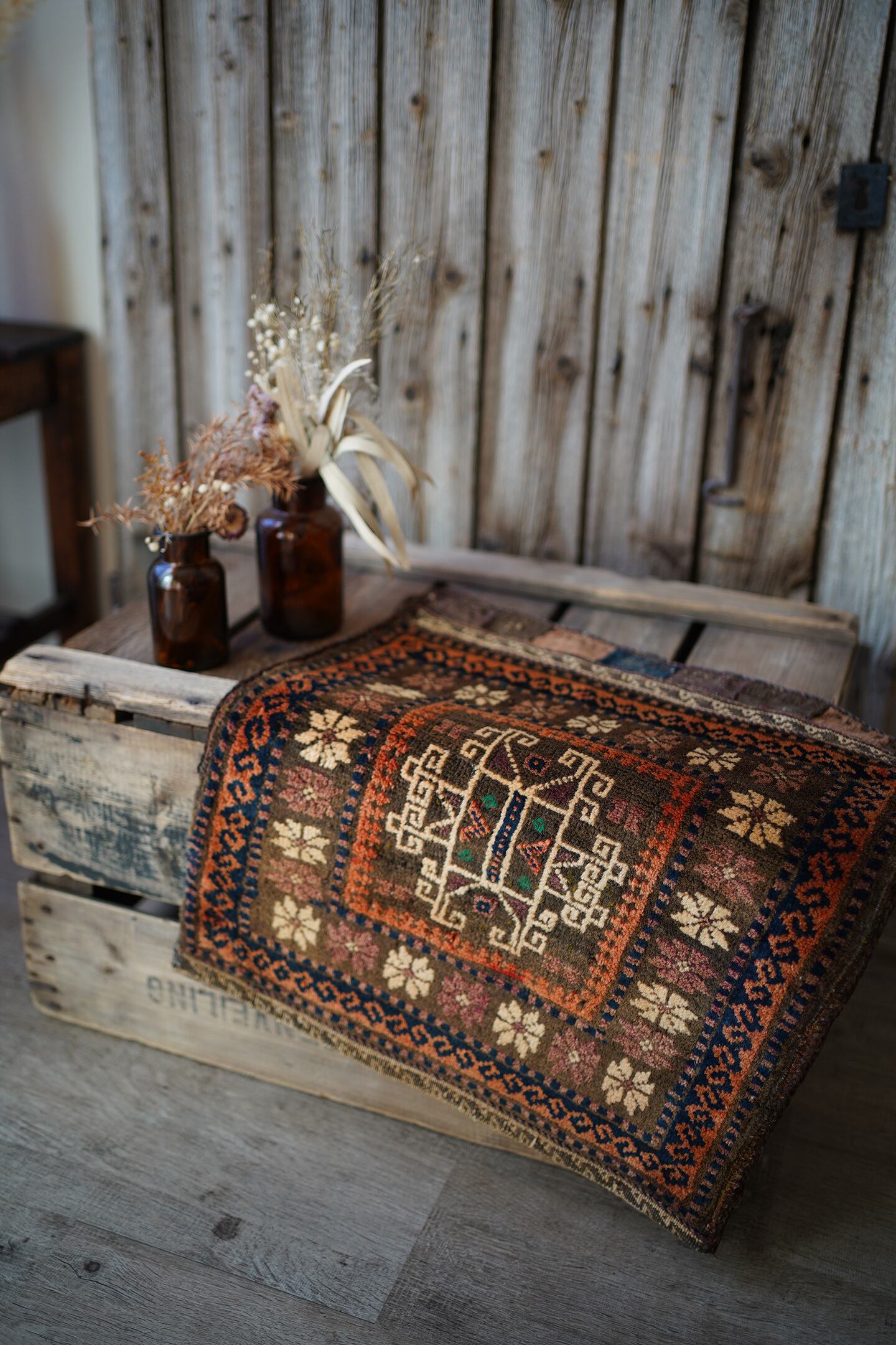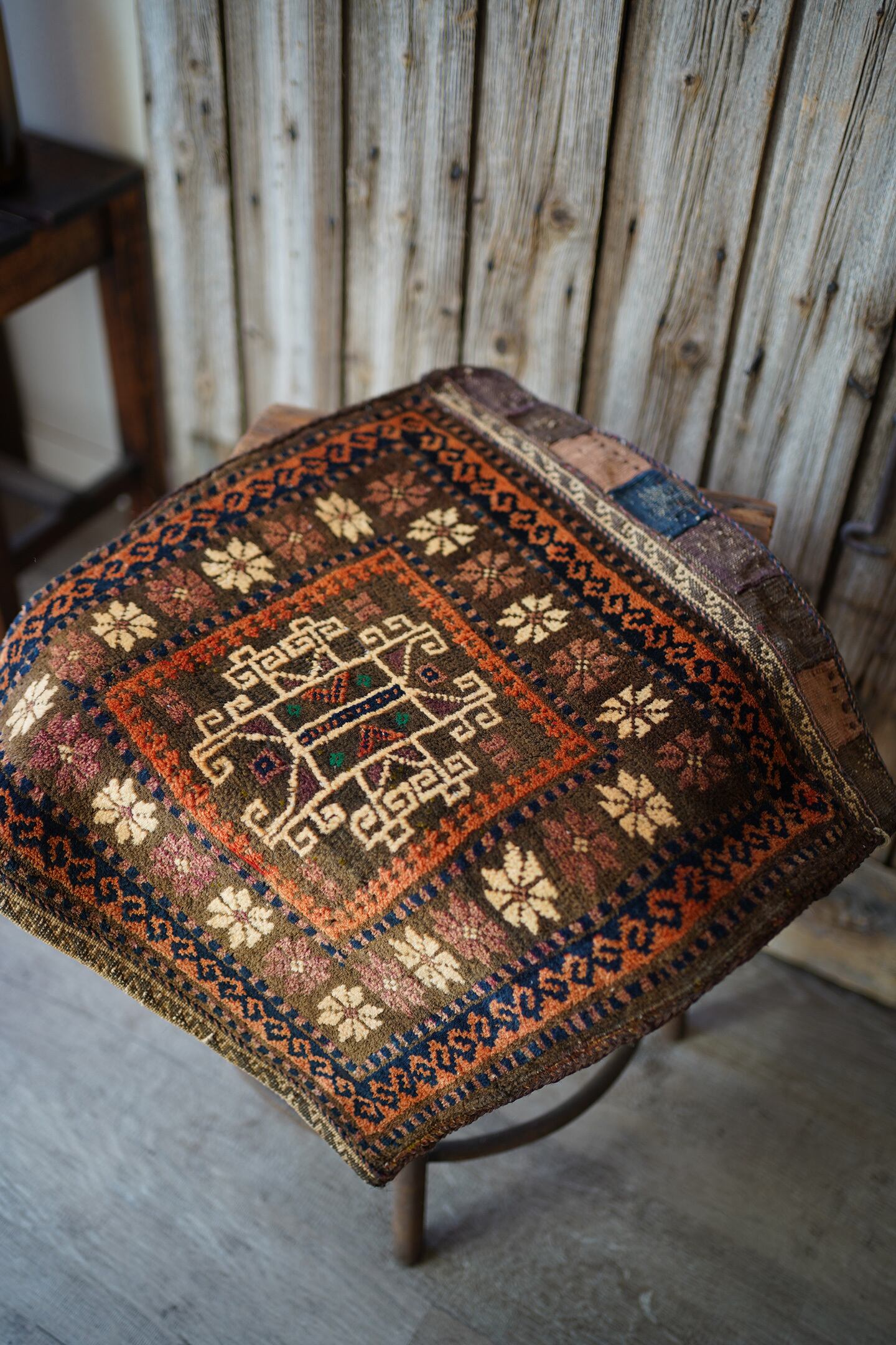 60年前にバルーチ族によって作られたホルジン(サドルバック)です。通常この手のタイプは表面のみに切り取ってミニラグに仕立ててもらうのですが、こちらのお品はそのままの風合いを楽しんでいただけるように装飾を少し取り除いたくらいで、大きな加工は行っておりません。そのため、お写真最後のような補修跡もございますが、ヴィンテージの風情がありのまま感じられ、ふとどんな風に使われてきたのか遠い異国の地に思いを馳せてしまうような魅力があります。八芒星のデザインで、お色味は統一感のある渋めのブラウン系の配色。パイルに光が差し込むと美しい艶を放ち、毛並みの長さも統一で上質感も兼ね備えています。表面はふわっとしなやかな優しい肌触りで、厚みは8mm程度。コンパクトなサイズ感ながら存在感がある一枚、タペストリーとして玄関やお部屋などを彩ってみてはいかがでしょうか。