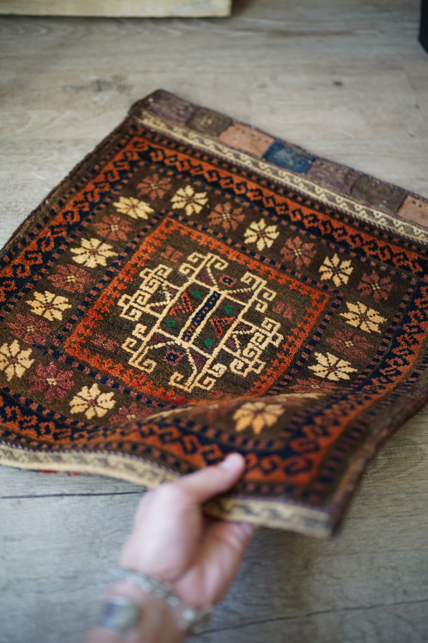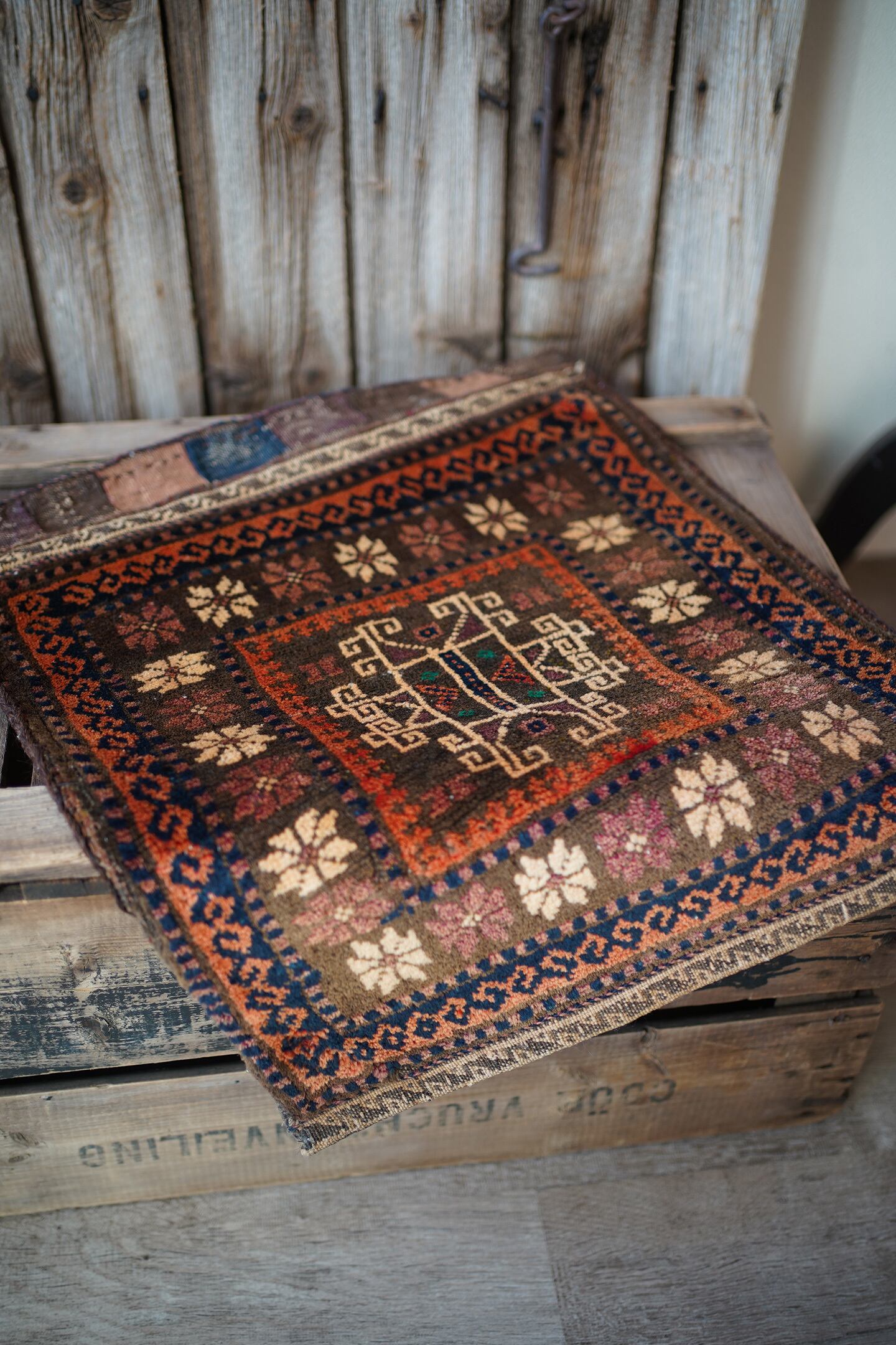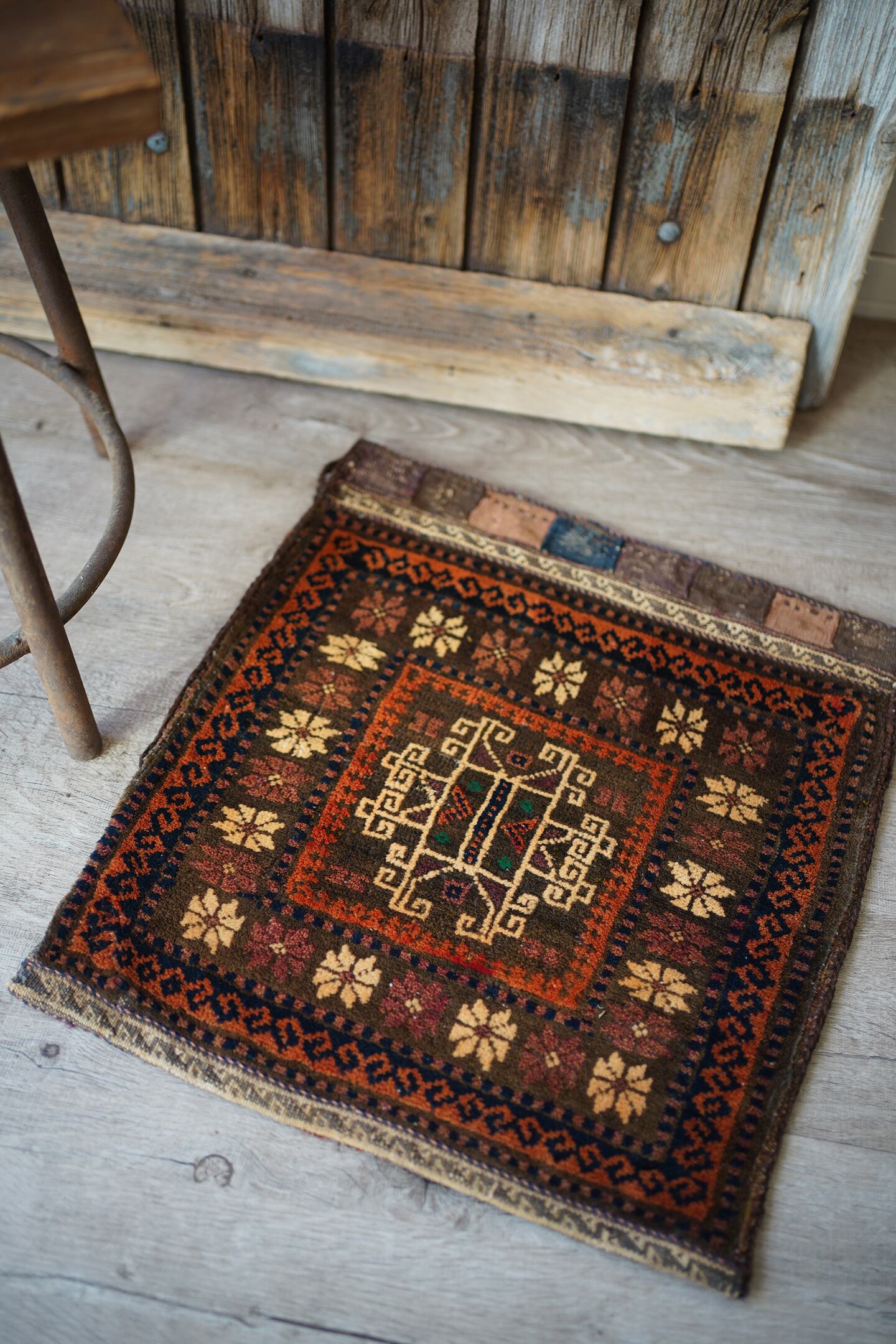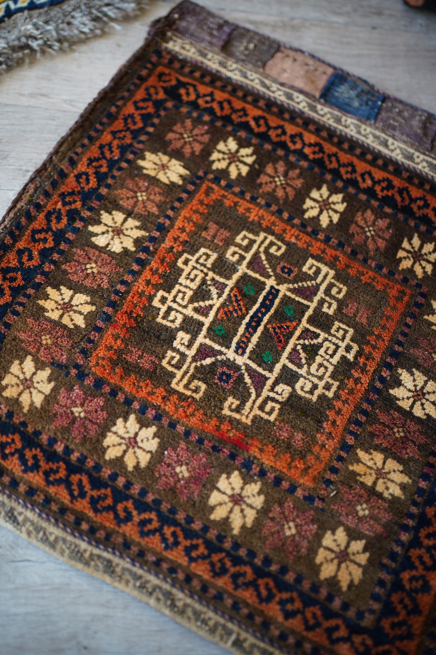 60年前にバルーチ族によって作られたホルジン(サドルバック)です。通常この手のタイプは表面のみに切り取ってミニラグに仕立ててもらうのですが、こちらのお品はそのままの風合いを楽しんでいただけるように装飾を少し取り除いたくらいで、大きな加工は行っておりません。そのため、お写真最後のような補修跡もございますが、ヴィンテージの風情がありのまま感じられ、ふとどんな風に使われてきたのか遠い異国の地に思いを馳せてしまうような魅力があります。八芒星のデザインで、お色味は統一感のある渋めのブラウン系の配色。パイルに光が差し込むと美しい艶を放ち、毛並みの長さも統一で上質感も兼ね備えています。表面はふわっとしなやかな優しい肌触りで、厚みは8mm程度。コンパクトなサイズ感ながら存在感がある一枚、タペストリーとして玄関やお部屋などを彩ってみてはいかがでしょうか。