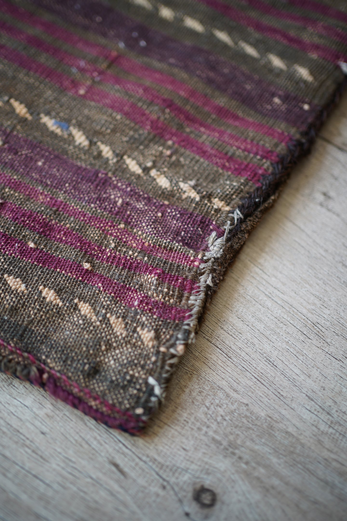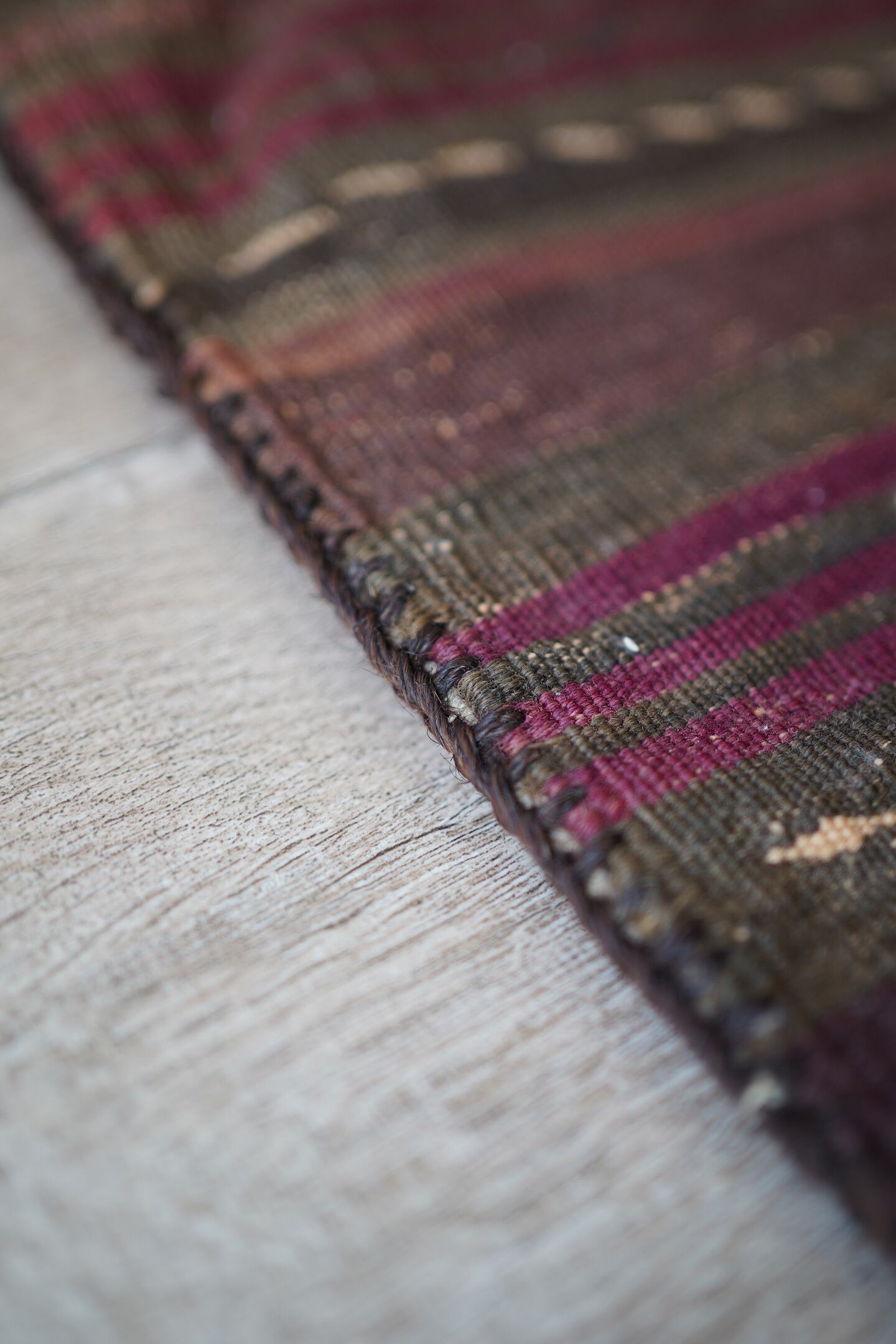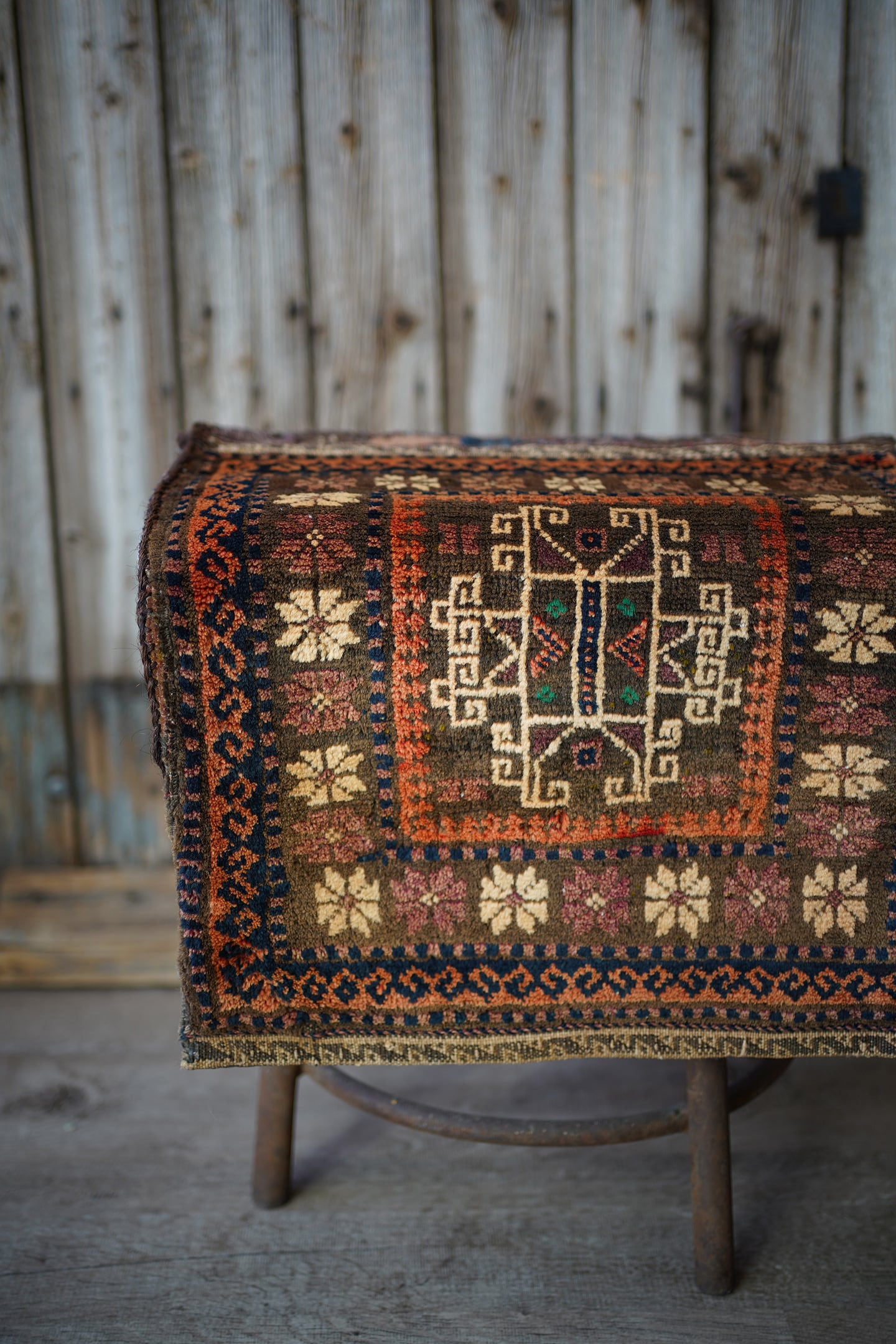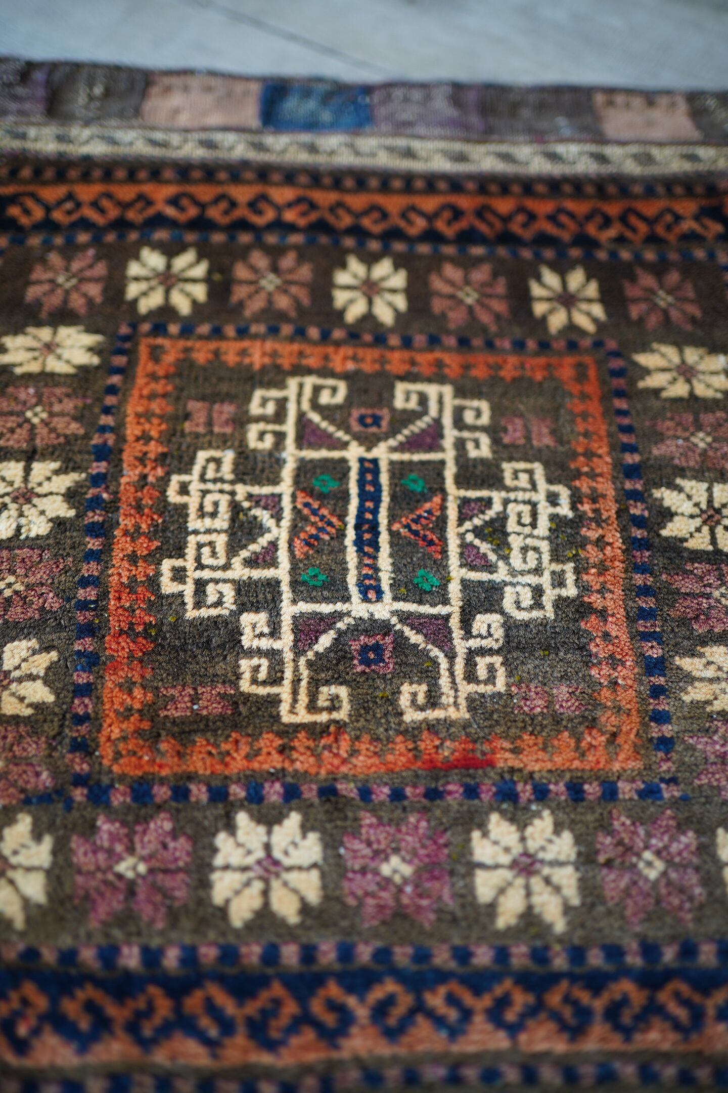 60年前にバルーチ族によって作られたホルジン(サドルバック)です。通常この手のタイプは表面のみに切り取ってミニラグに仕立ててもらうのですが、こちらのお品はそのままの風合いを楽しんでいただけるように装飾を少し取り除いたくらいで、大きな加工は行っておりません。そのため、お写真最後のような補修跡もございますが、ヴィンテージの風情がありのまま感じられ、ふとどんな風に使われてきたのか遠い異国の地に思いを馳せてしまうような魅力があります。八芒星のデザインで、お色味は統一感のある渋めのブラウン系の配色。パイルに光が差し込むと美しい艶を放ち、毛並みの長さも統一で上質感も兼ね備えています。表面はふわっとしなやかな優しい肌触りで、厚みは8mm程度。コンパクトなサイズ感ながら存在感がある一枚、タペストリーとして玄関やお部屋などを彩ってみてはいかがでしょうか。