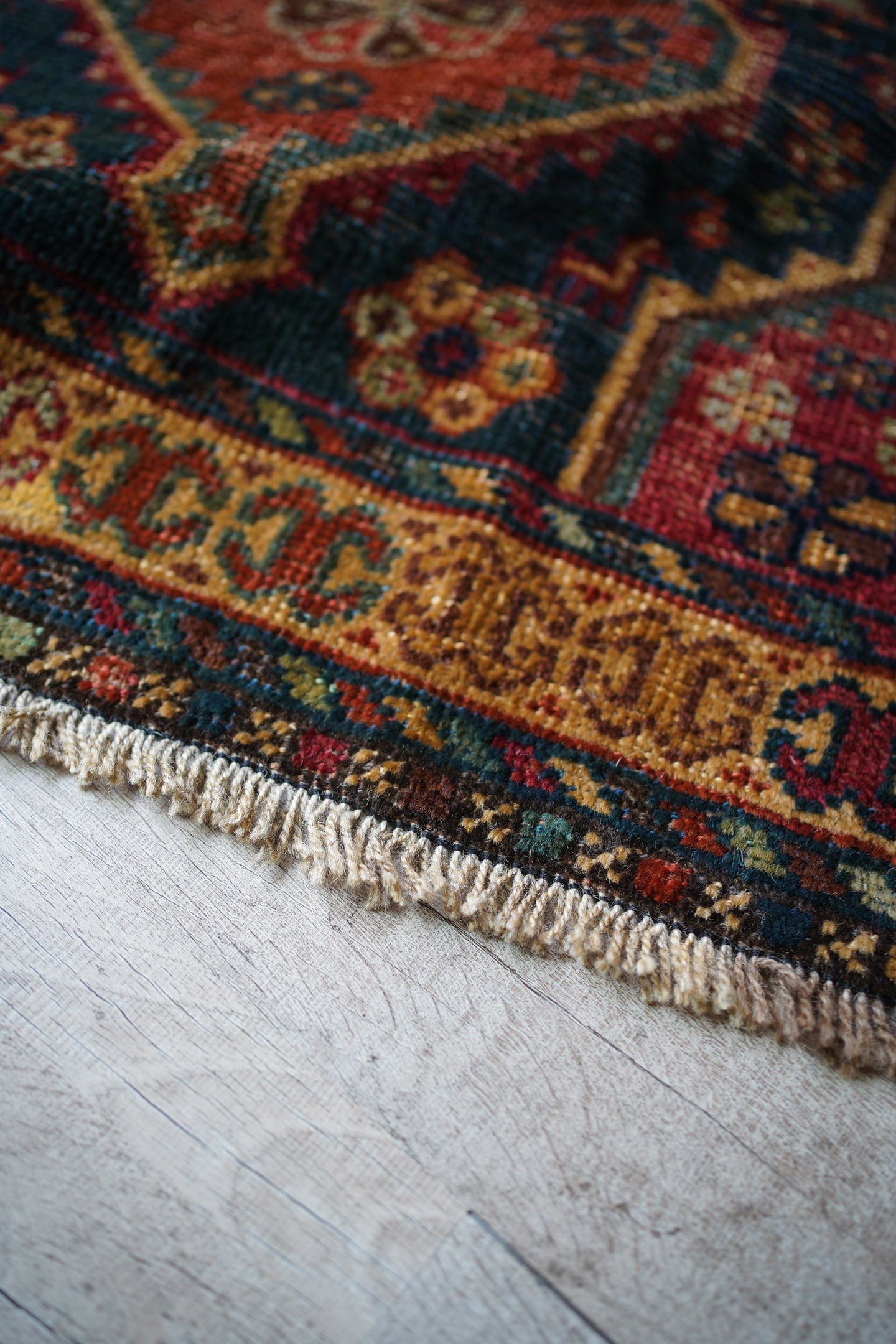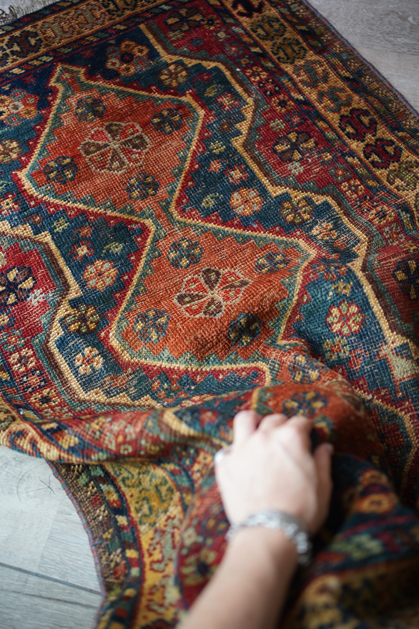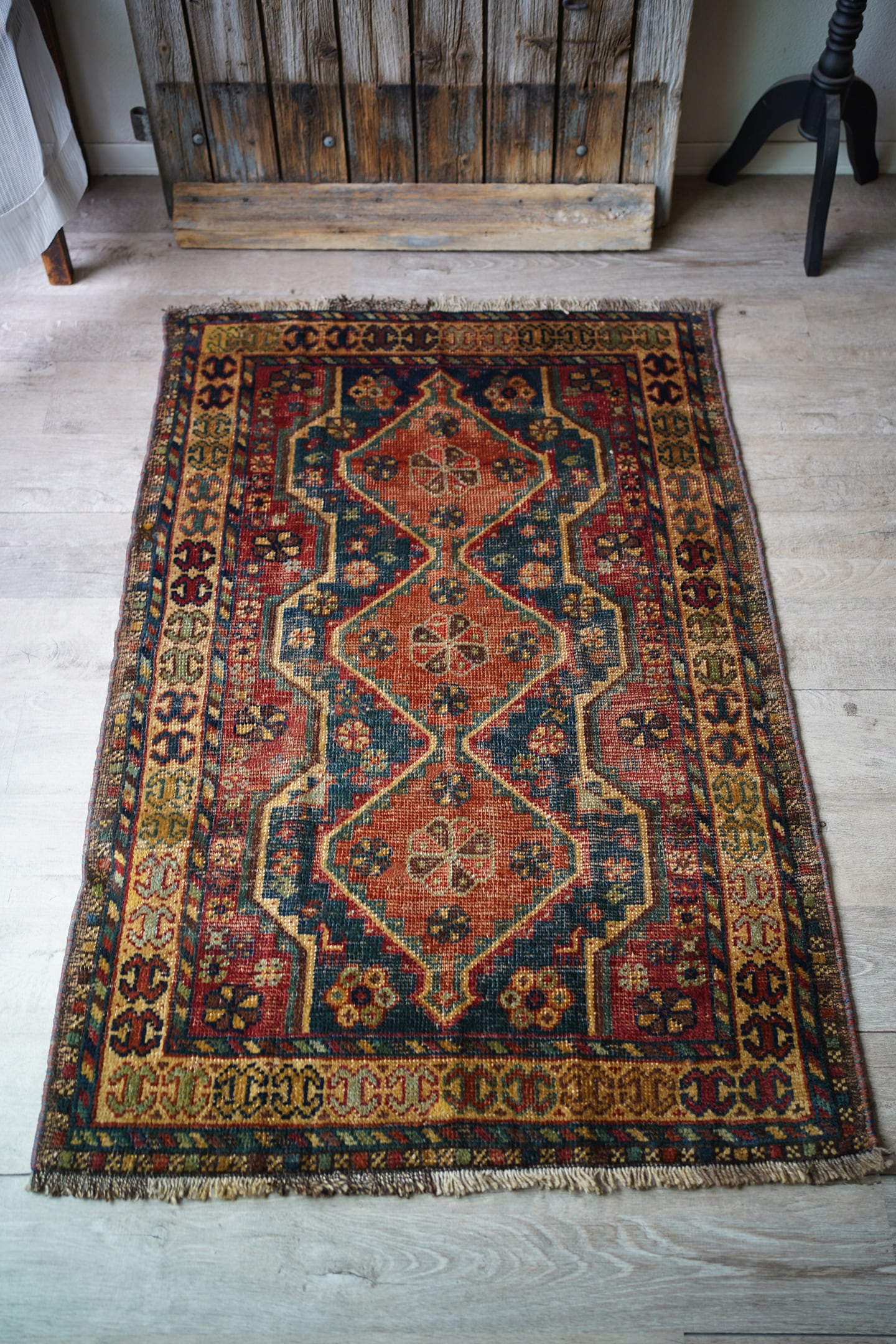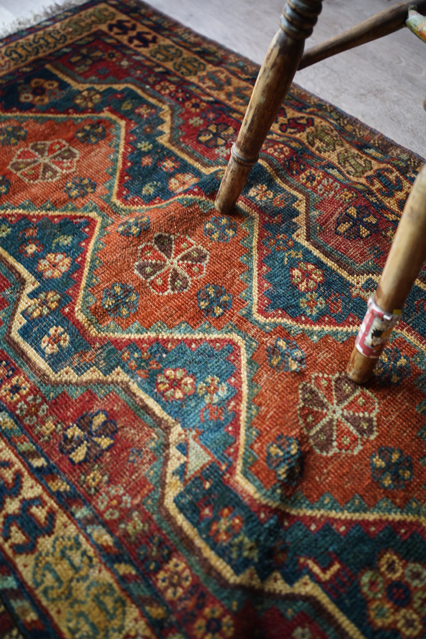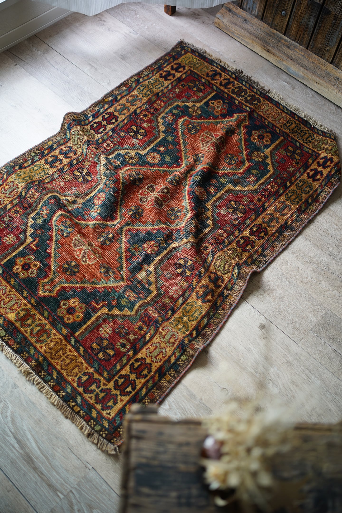 おおよそ80年前に織られたセミアンティークのカシュガイラグ。ダークオレンジ、暗めのブルーグリーン、朱色、ベージュとシックな渋い色合いが素晴らしく、三連のメダリオンやフィールドなどには花模様にも似た魔除けを意味する"狼の足跡"の紋様がたくさん織り込まれています。パイルが低くなっているところも多いですが、全体的にうっすらと毛並みも感じられ、サラふわっとした肌触りをしています。厚みは4mm〜5mm程度で、クタッとした質感です。コンディションとしては特に目立った補修跡は見受けられません。心を揺さぶるラグと共に時を重ね、ぜひ100年もののアンティークまで育ててあげてください♫