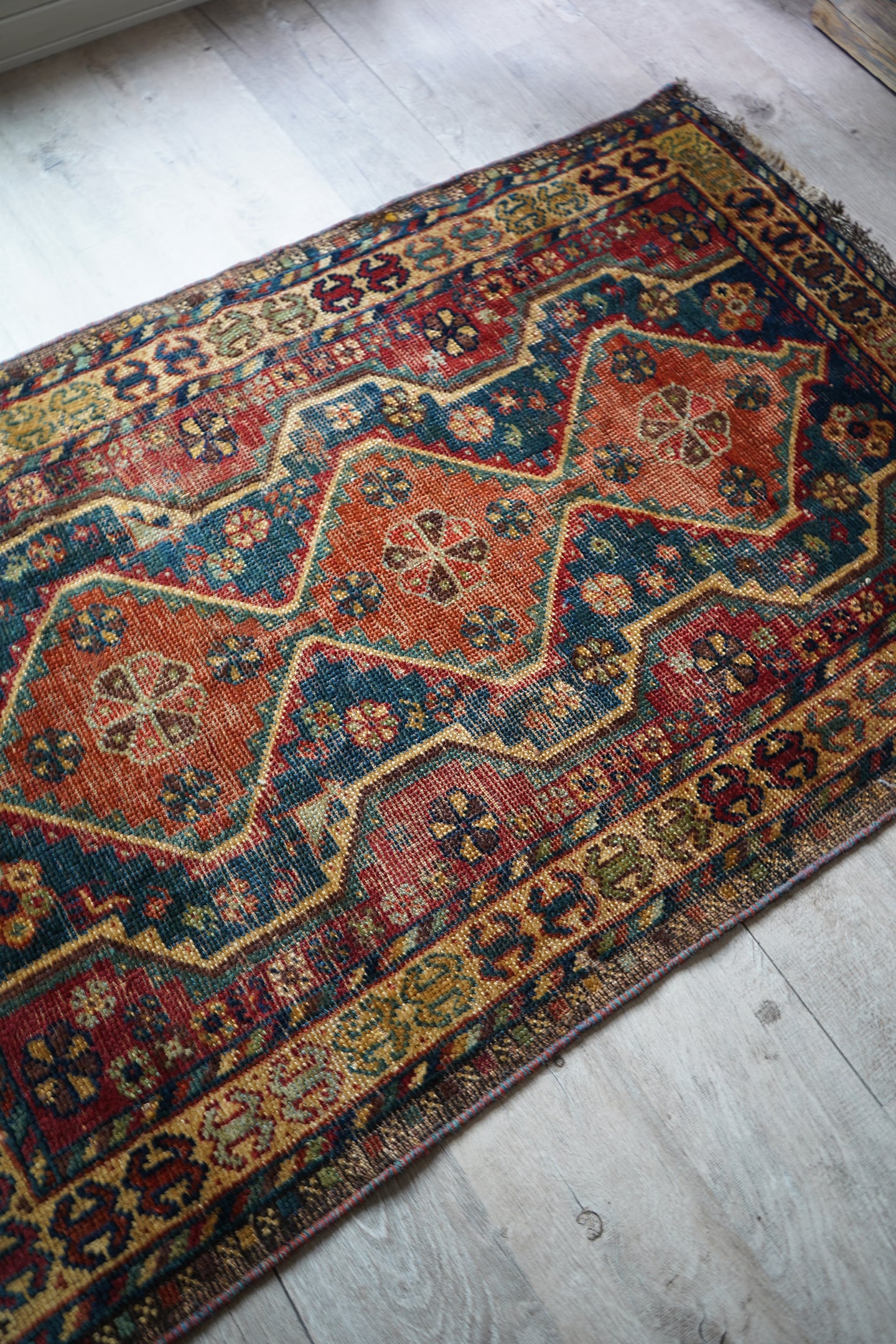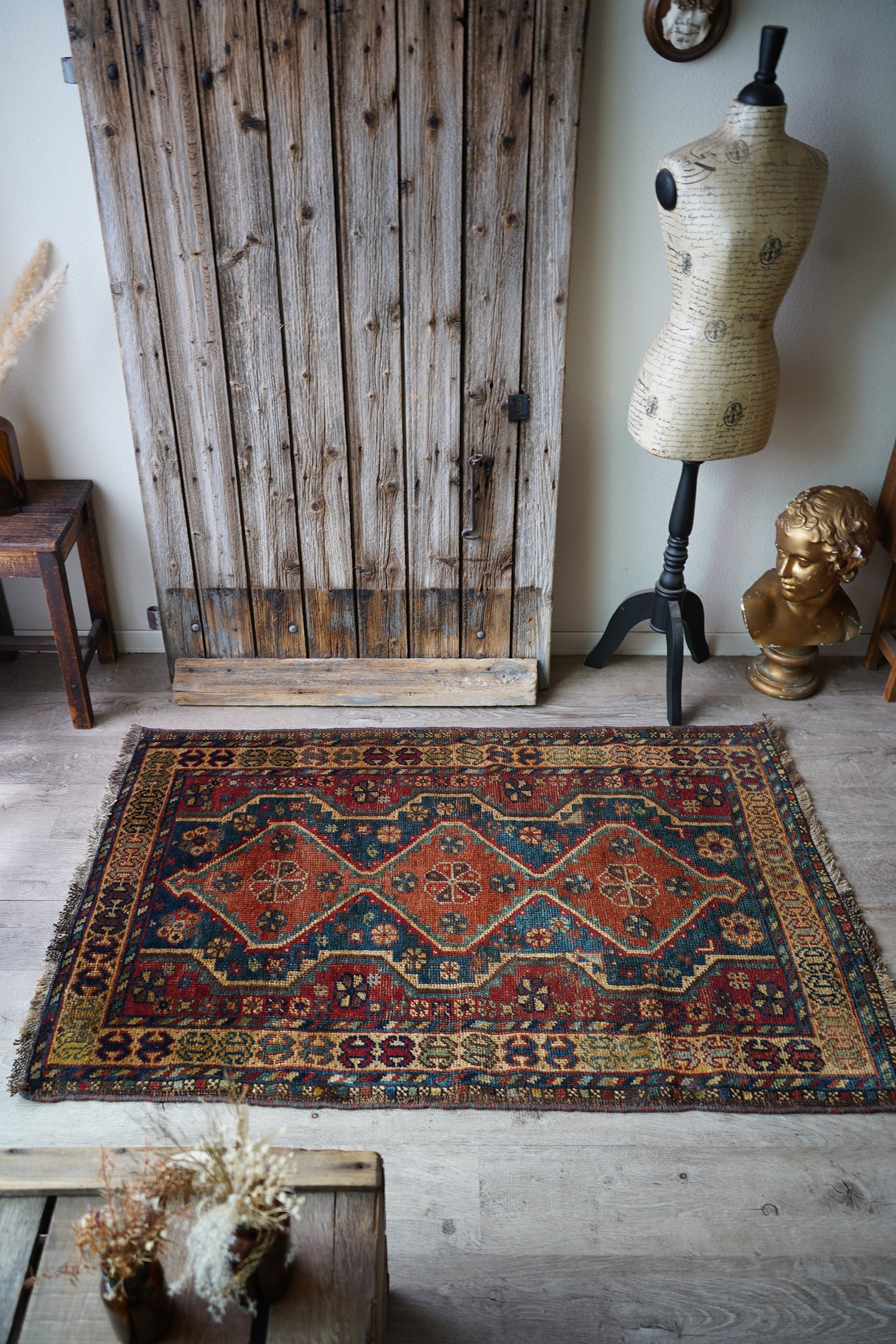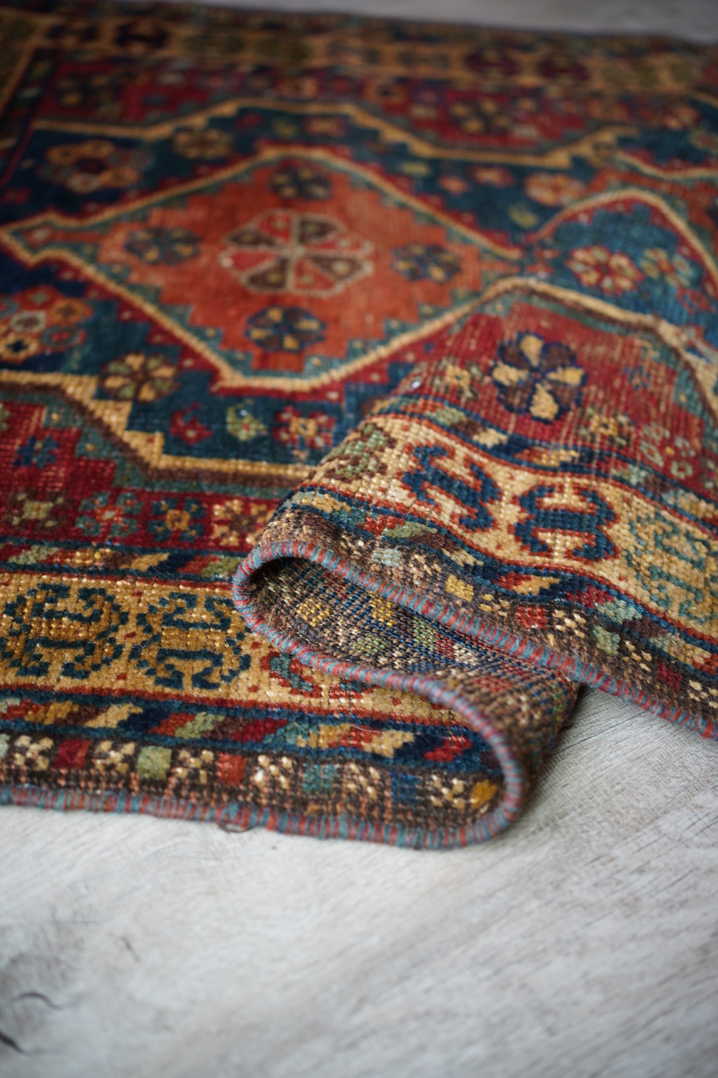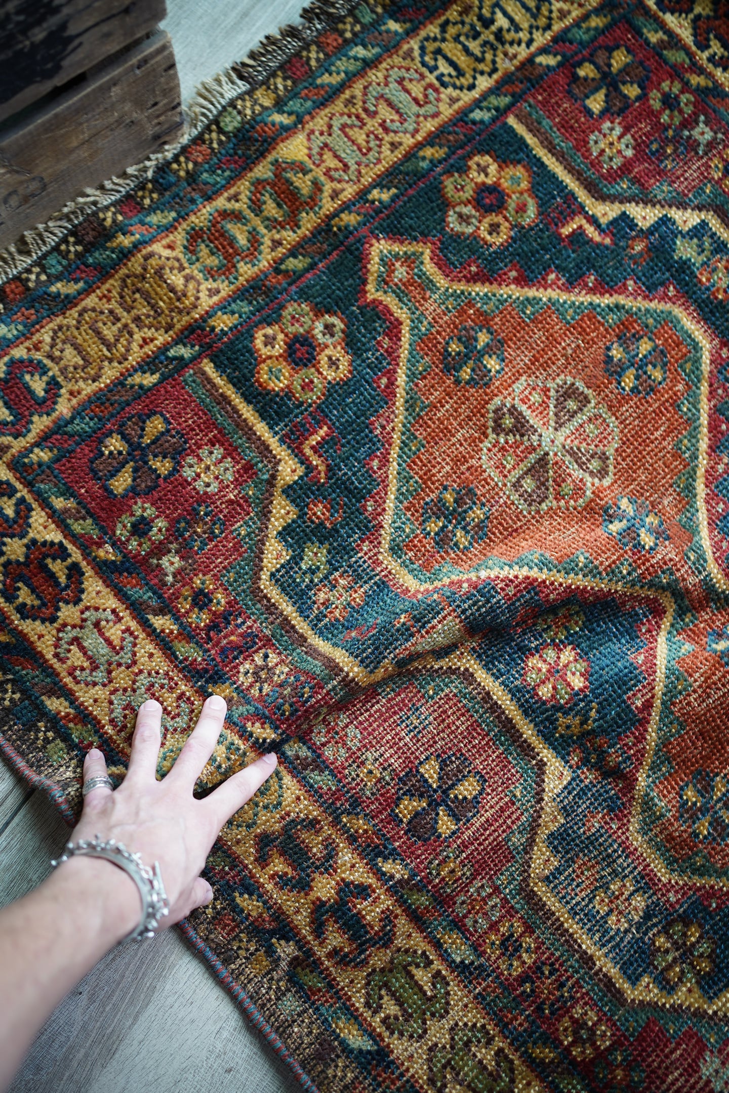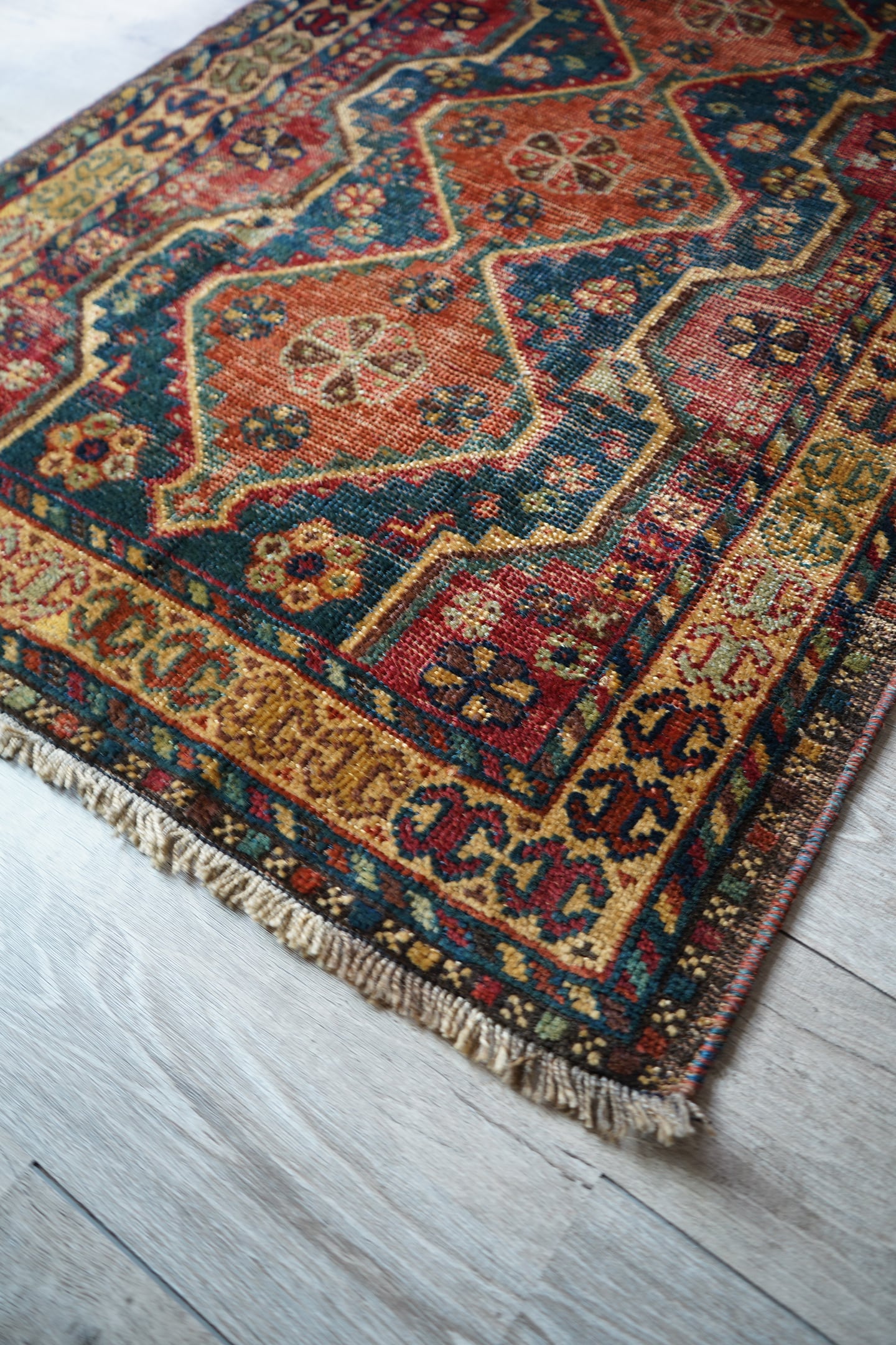 おおよそ80年前に織られたセミアンティークのカシュガイラグ。ダークオレンジ、暗めのブルーグリーン、朱色、ベージュとシックな渋い色合いが素晴らしく、三連のメダリオンやフィールドなどには花模様にも似た魔除けを意味する"狼の足跡"の紋様がたくさん織り込まれています。パイルが低くなっているところも多いですが、全体的にうっすらと毛並みも感じられ、サラふわっとした肌触りをしています。厚みは4mm〜5mm程度で、クタッとした質感です。コンディションとしては特に目立った補修跡は見受けられません。心を揺さぶるラグと共に時を重ね、ぜひ100年もののアンティークまで育ててあげてください♫