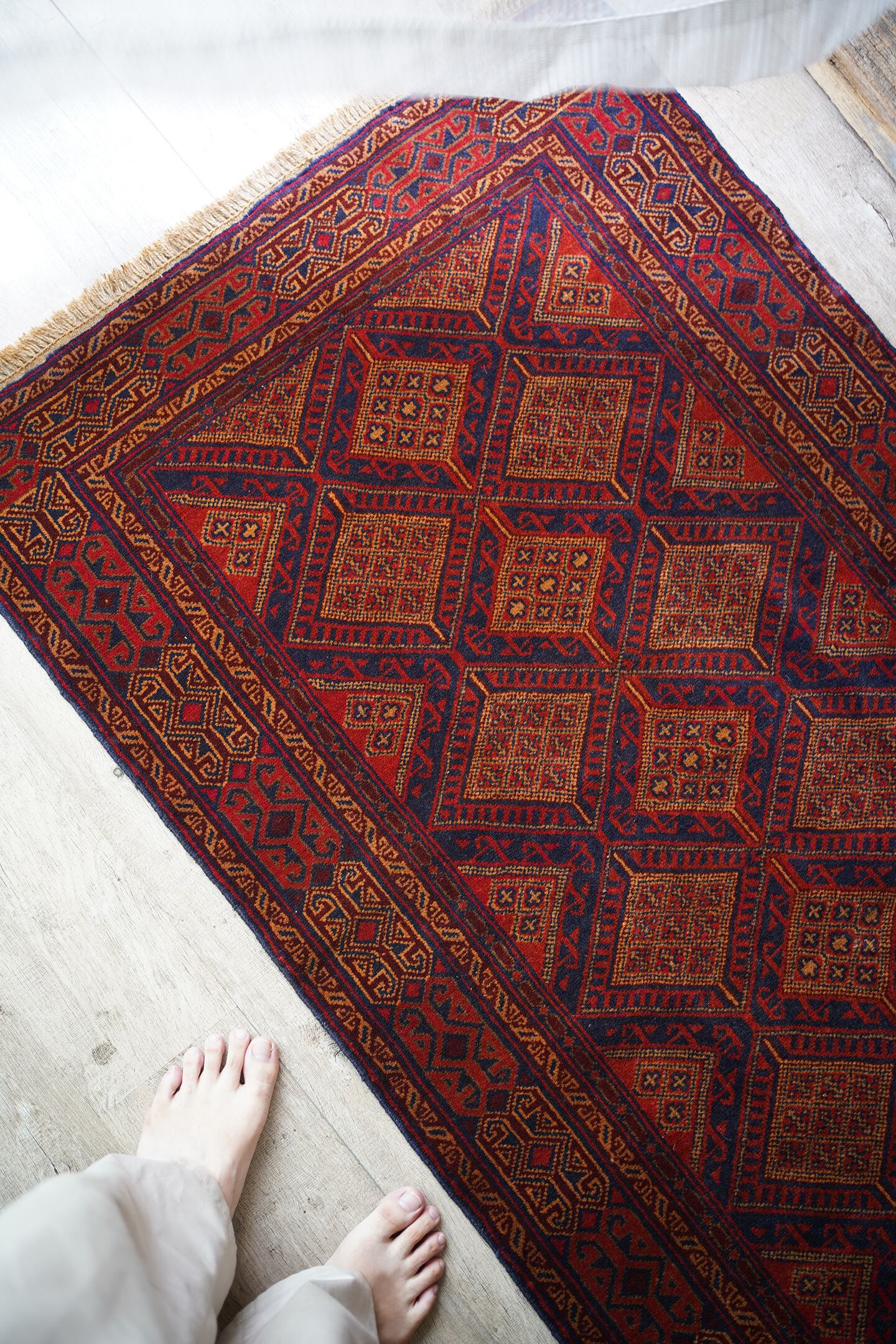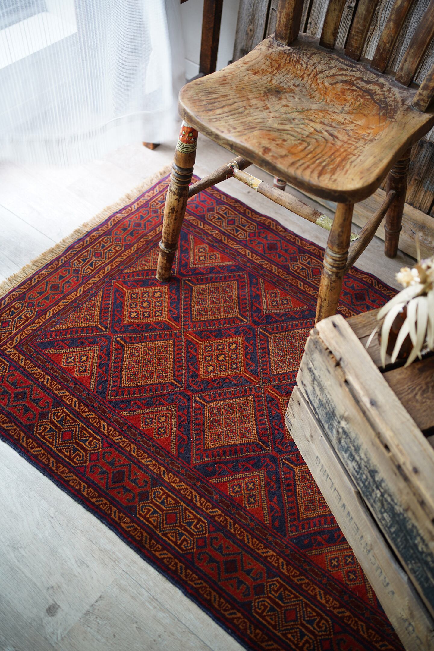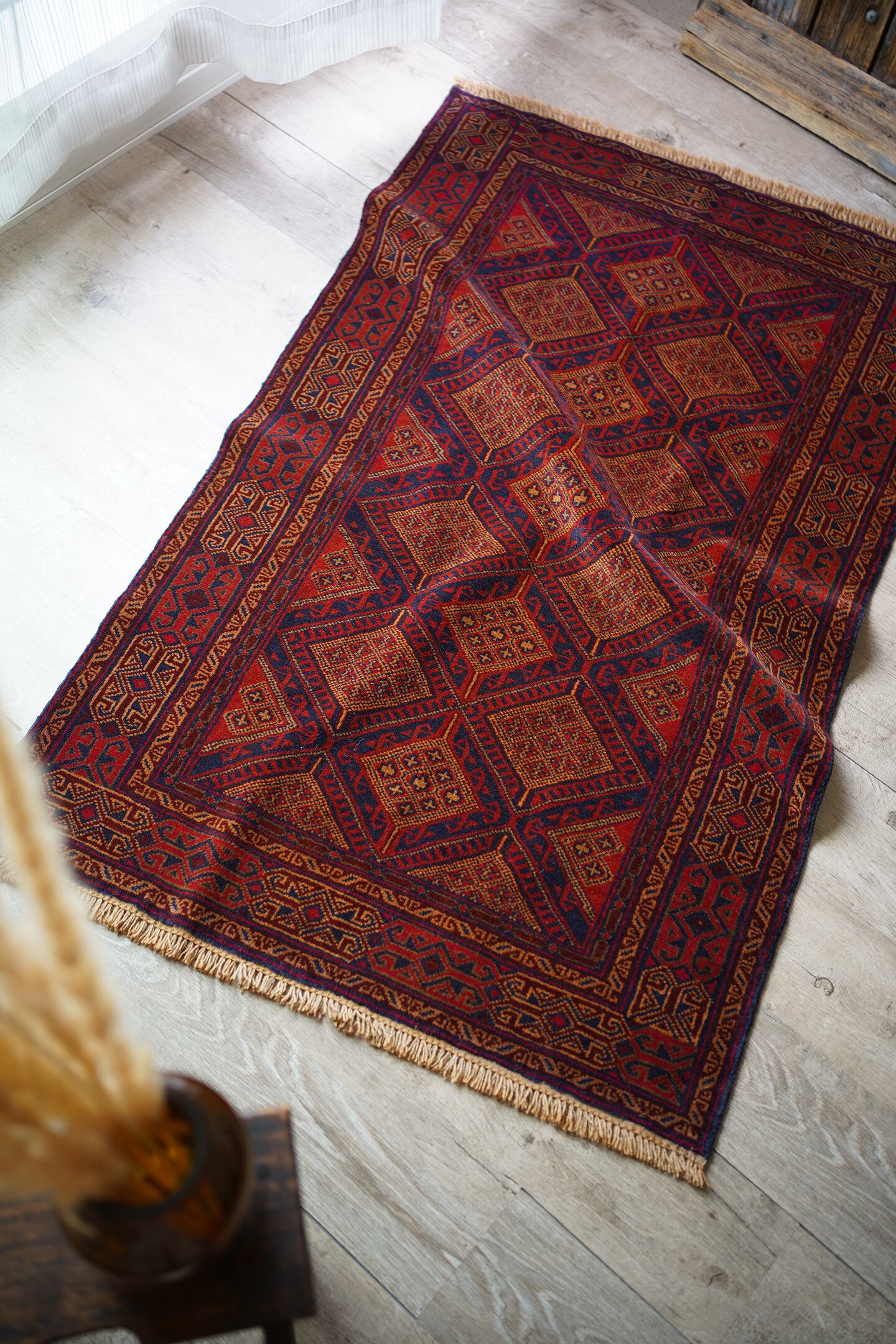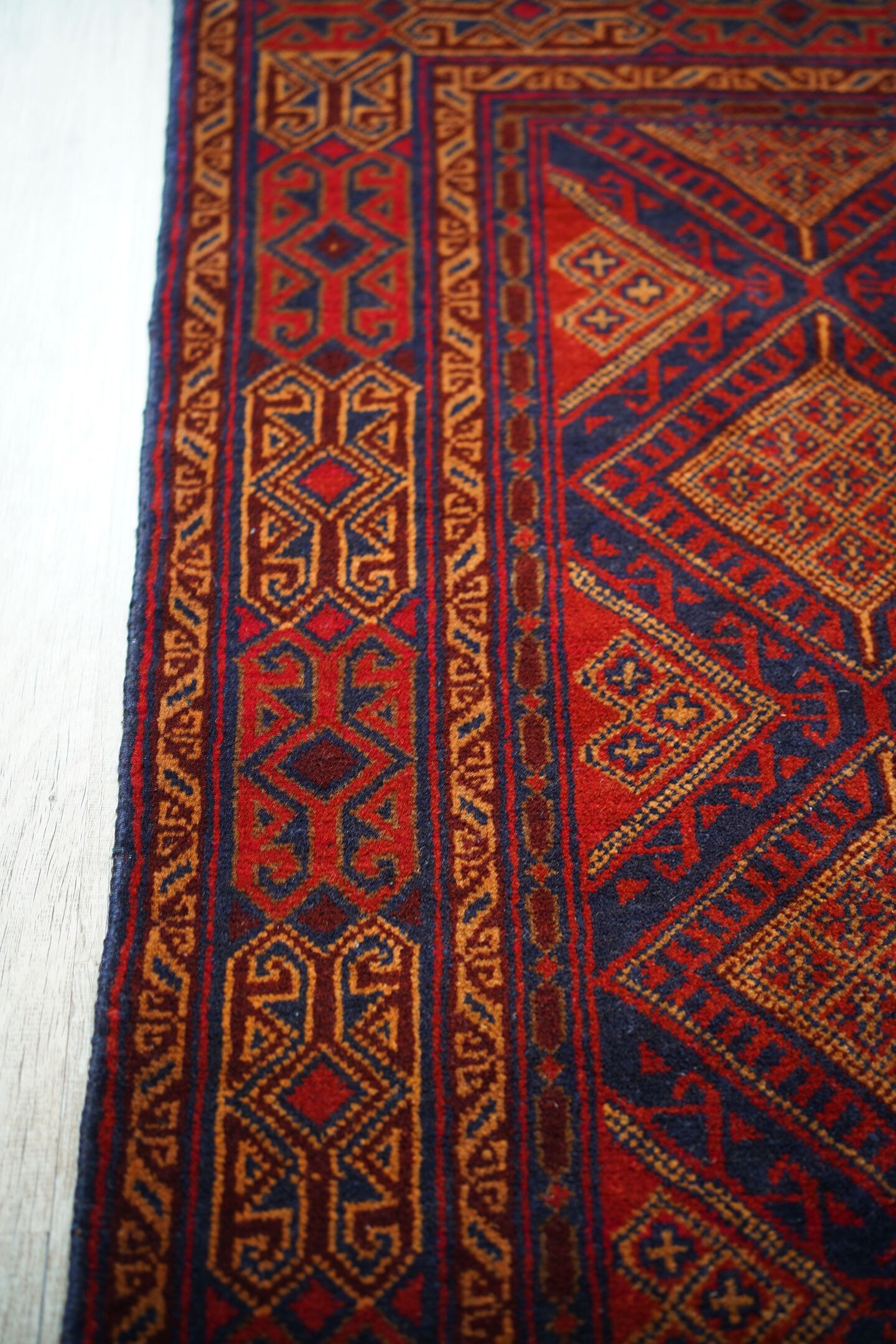 美しいデザインの菱形紋様が特徴的なマシュワニラグ。マシュワニラグはキリム織とパイル織をMIXしたポコポコと凹凸のあるタイプが主流ですが、こちらは平坦なパイル織りのラグとなります。濃いめの赤に濃紺、くすんだベージュのシックな配色。統一感のある整った長さのパイル、サラッと柔らかい気持ちの良い肌触りのソフトウールで大変高品質なラグです。年代も浅く新品のような綺麗な状態で、コンディションもパーフェクト。リビングや寝室はもちろん、ウォークインクローゼットなどにも良さそうです♫