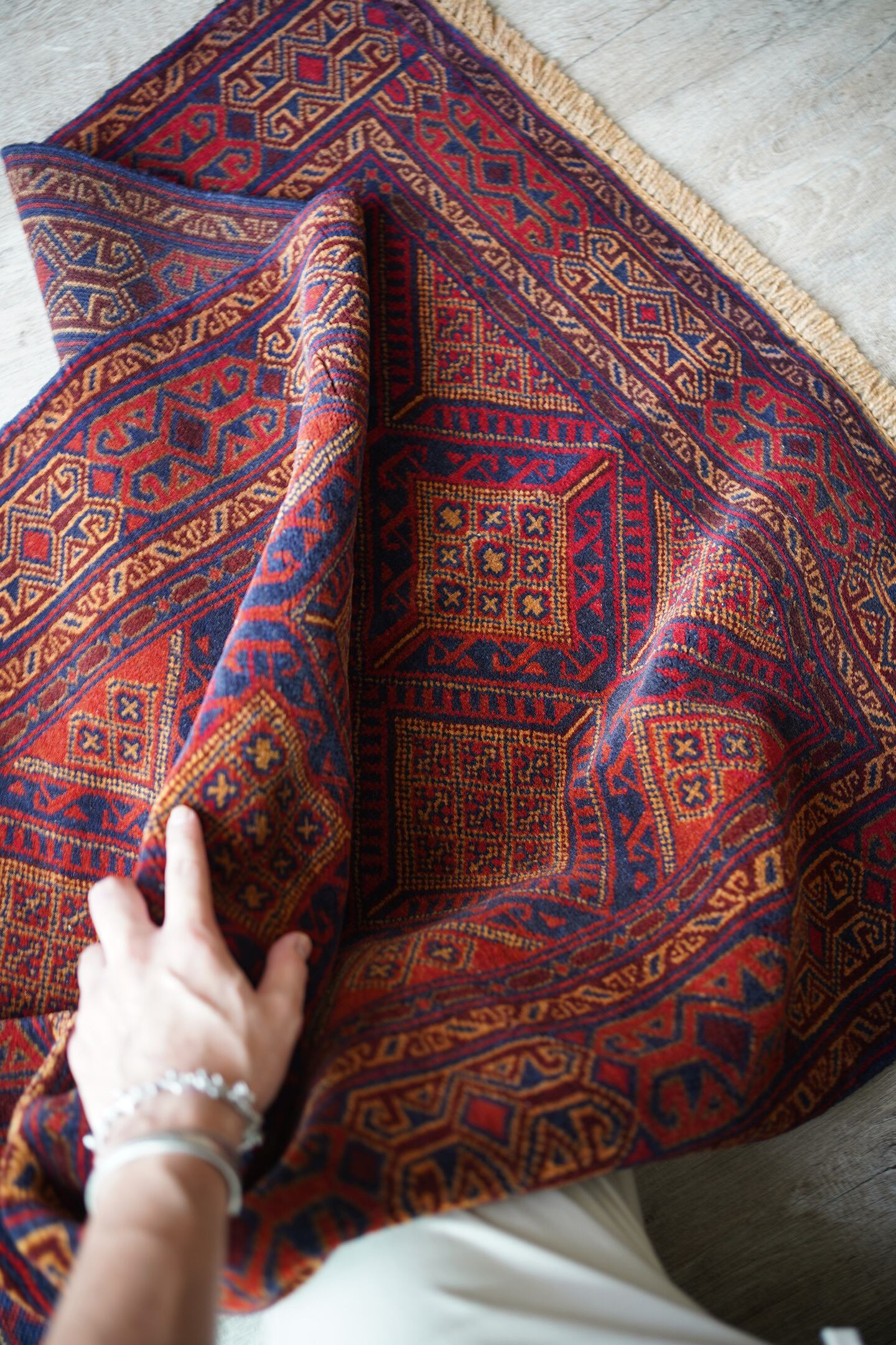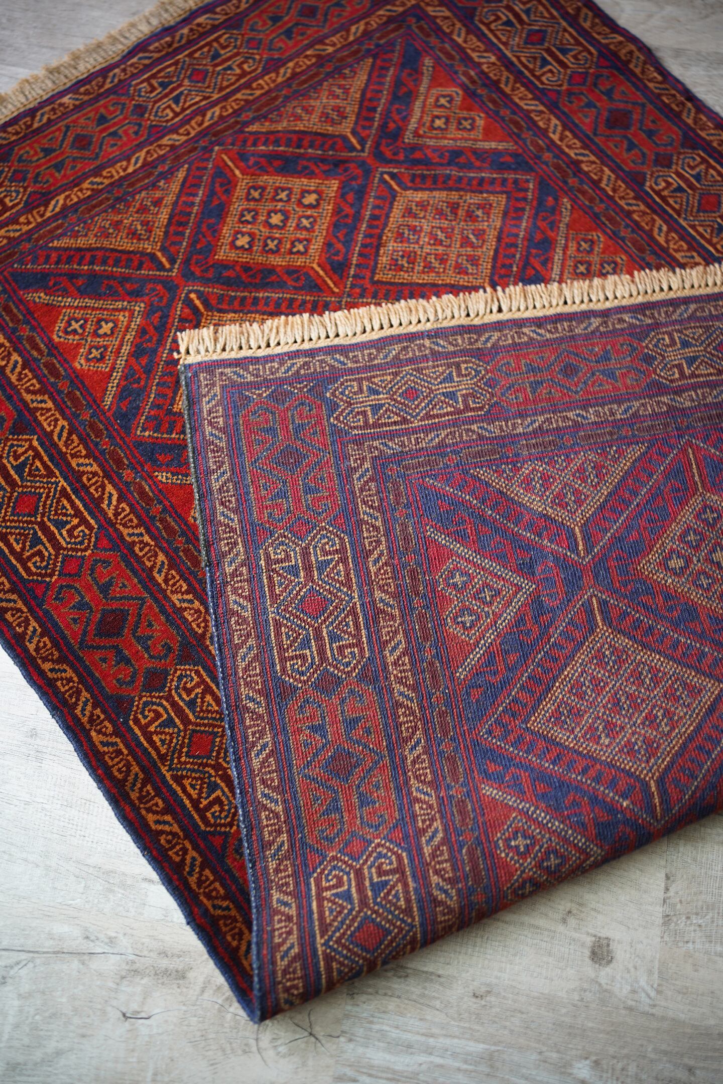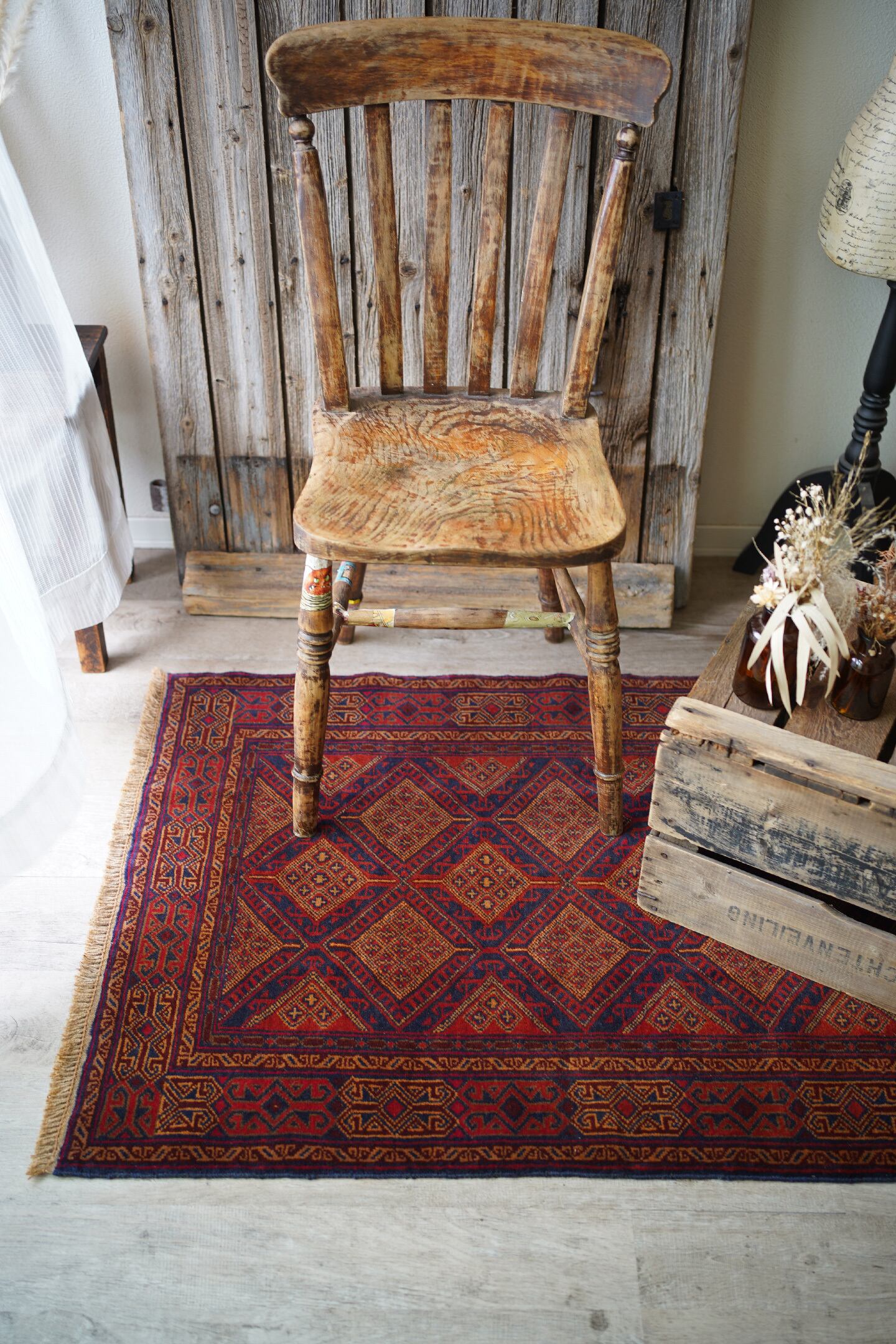 美しいデザインの菱形紋様が特徴的なマシュワニラグ。マシュワニラグはキリム織とパイル織をMIXしたポコポコと凹凸のあるタイプが主流ですが、こちらは平坦なパイル織りのラグとなります。濃いめの赤に濃紺、くすんだベージュのシックな配色。統一感のある整った長さのパイル、サラッと柔らかい気持ちの良い肌触りのソフトウールで大変高品質なラグです。年代も浅く新品のような綺麗な状態で、コンディションもパーフェクト。リビングや寝室はもちろん、ウォークインクローゼットなどにも良さそうです♫