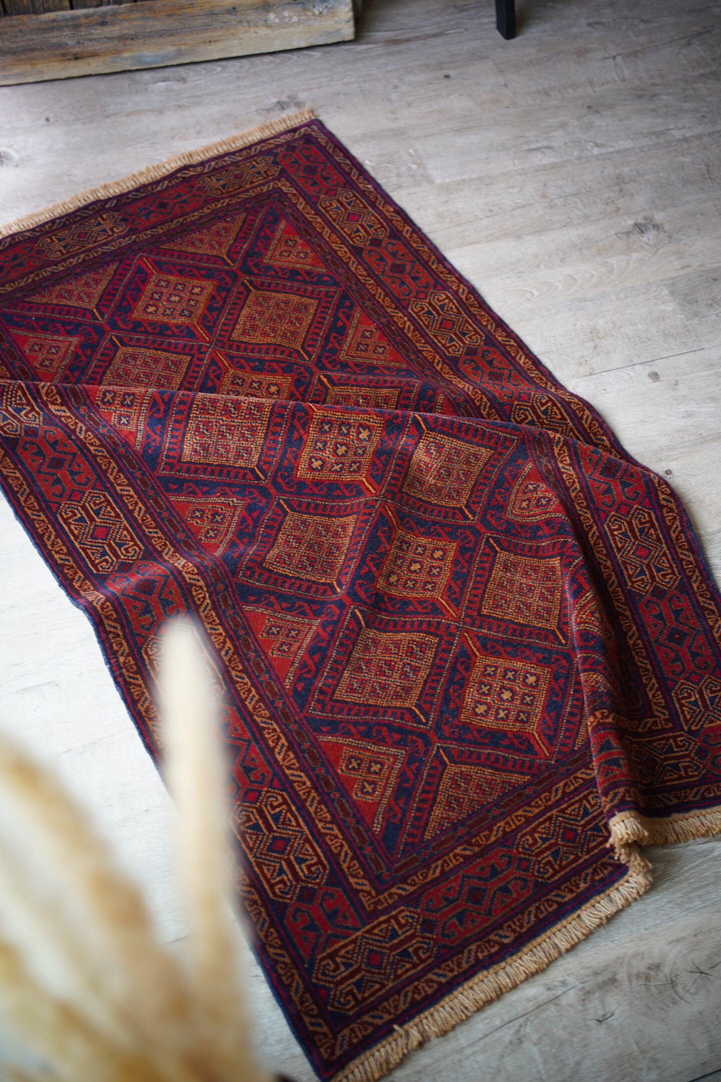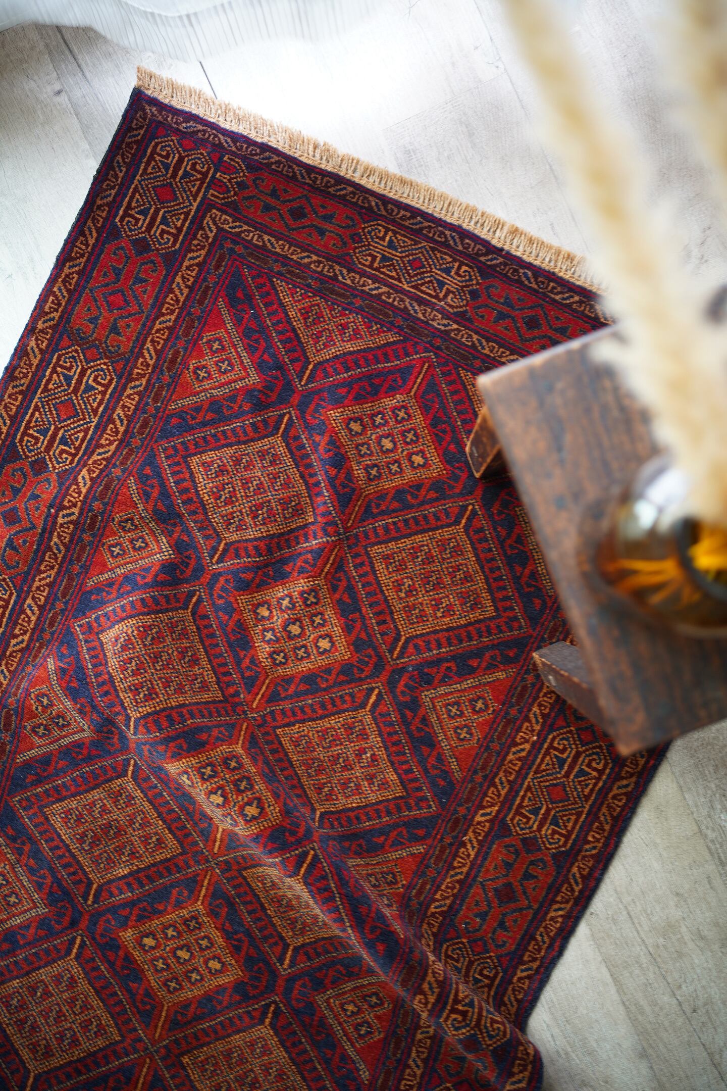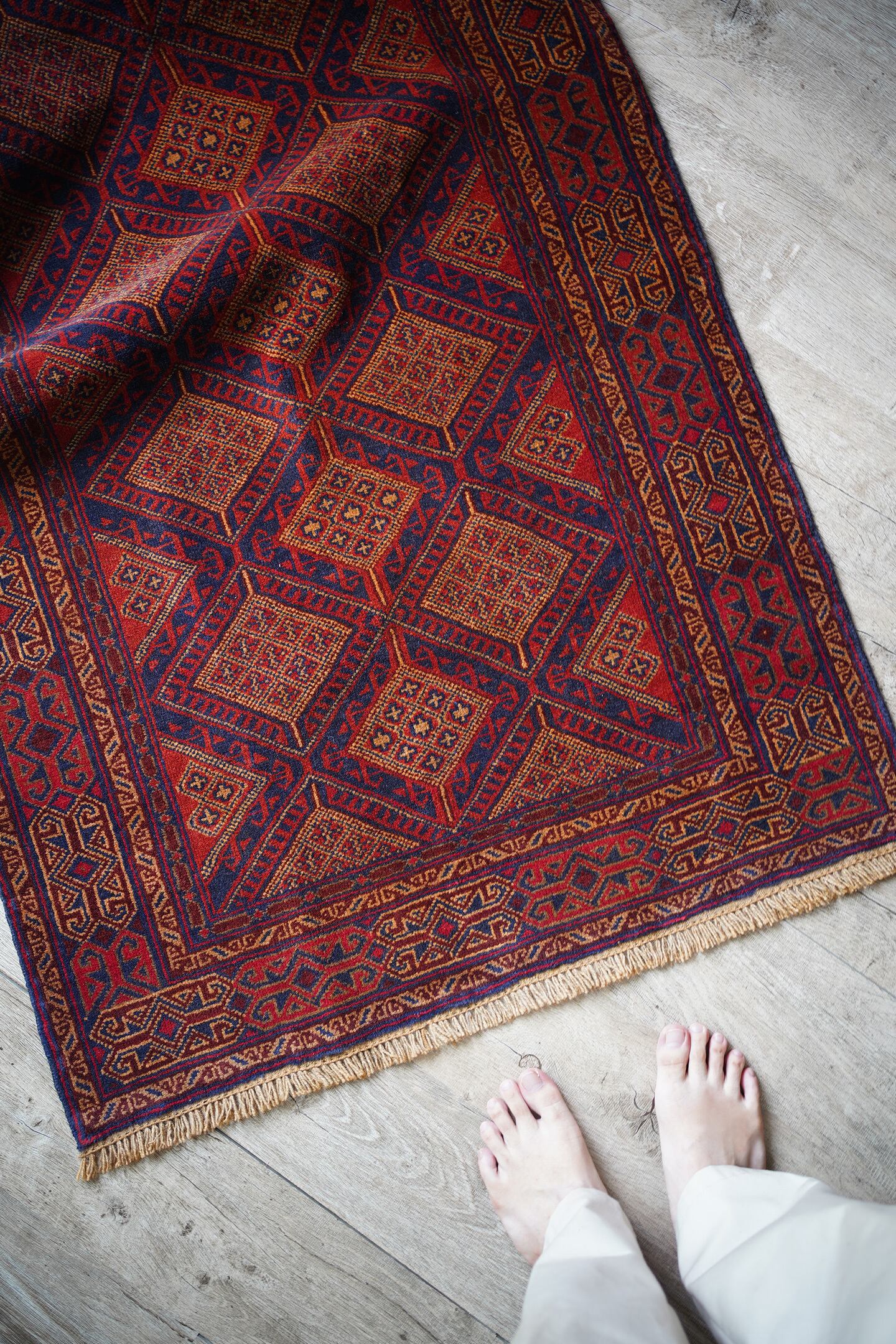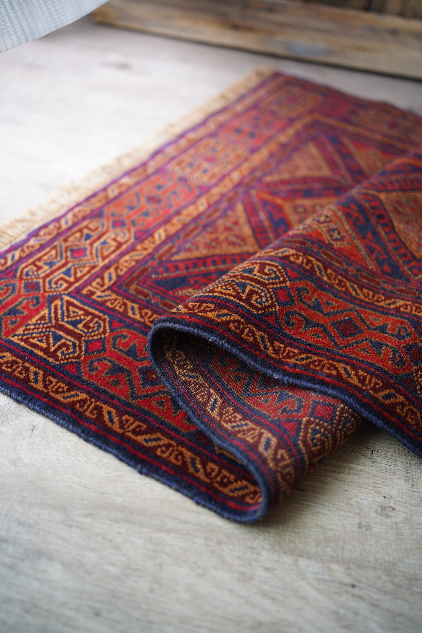 美しいデザインの菱形紋様が特徴的なマシュワニラグ。マシュワニラグはキリム織とパイル織をMIXしたポコポコと凹凸のあるタイプが主流ですが、こちらは平坦なパイル織りのラグとなります。濃いめの赤に濃紺、くすんだベージュのシックな配色。統一感のある整った長さのパイル、サラッと柔らかい気持ちの良い肌触りのソフトウールで大変高品質なラグです。年代も浅く新品のような綺麗な状態で、コンディションもパーフェクト。リビングや寝室はもちろん、ウォークインクローゼットなどにも良さそうです♫