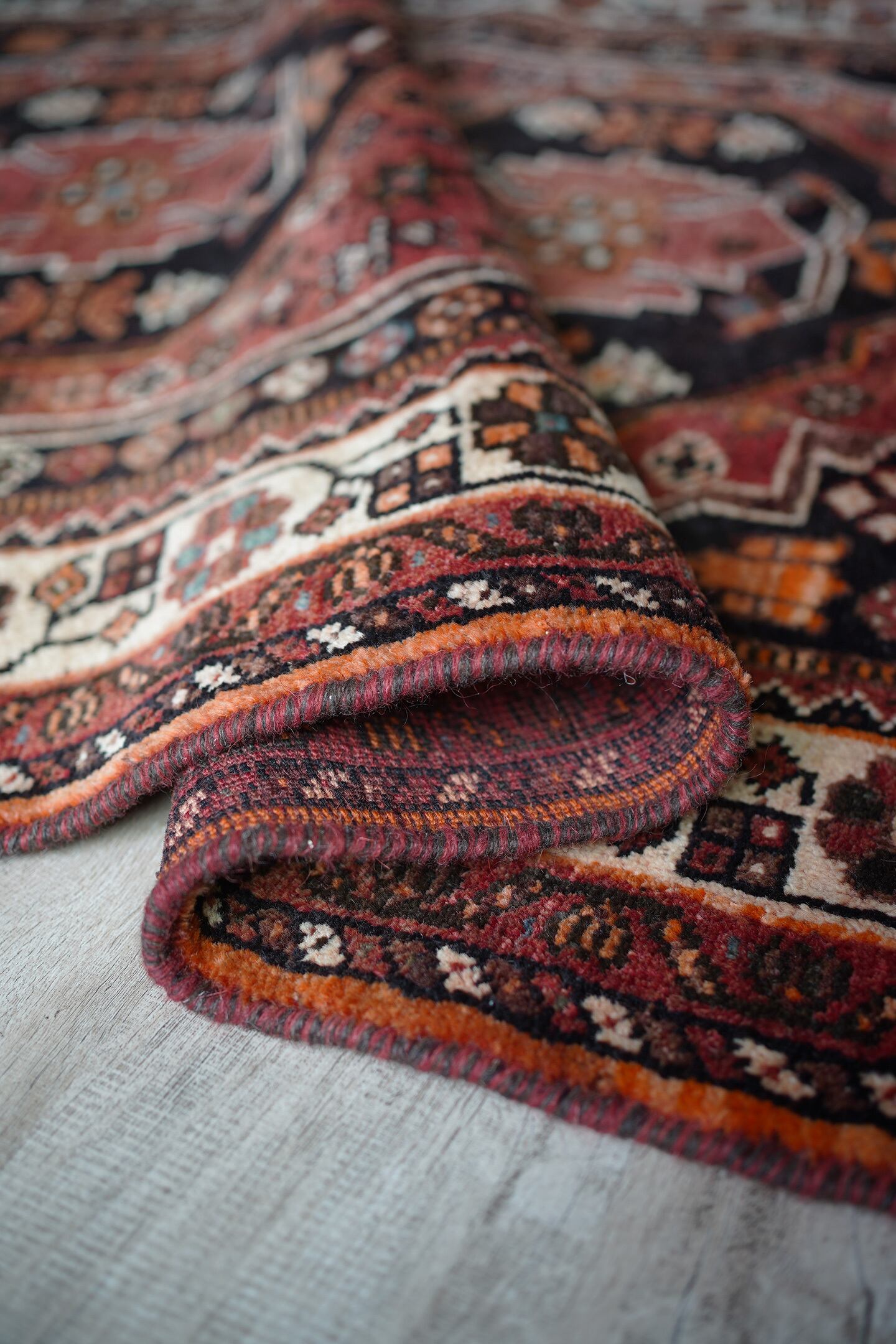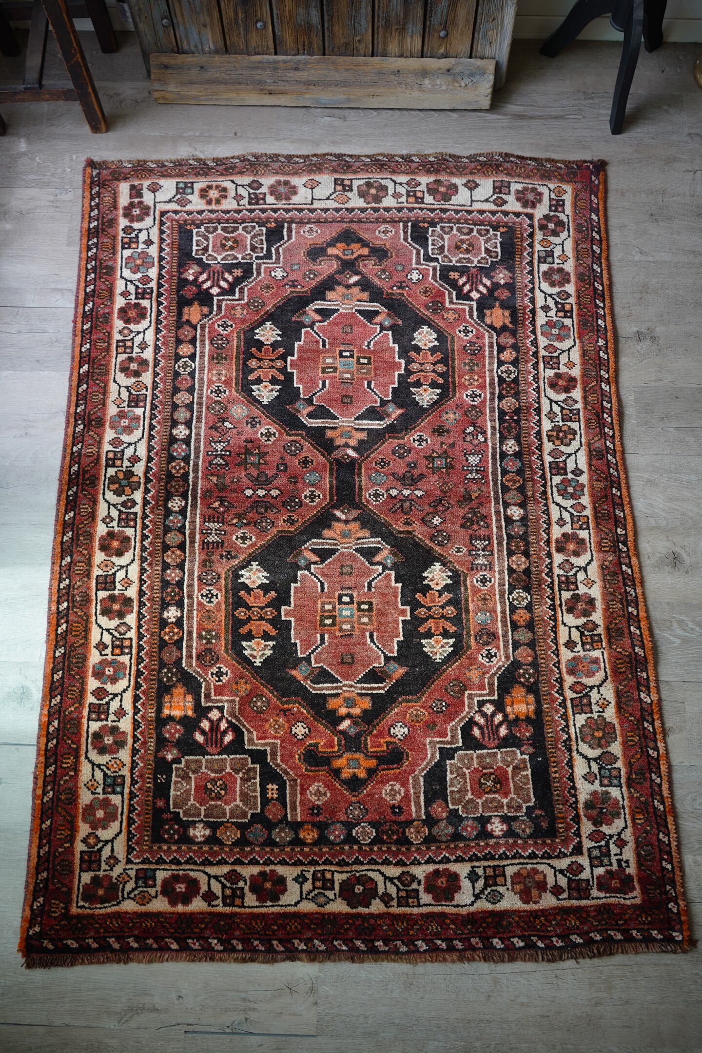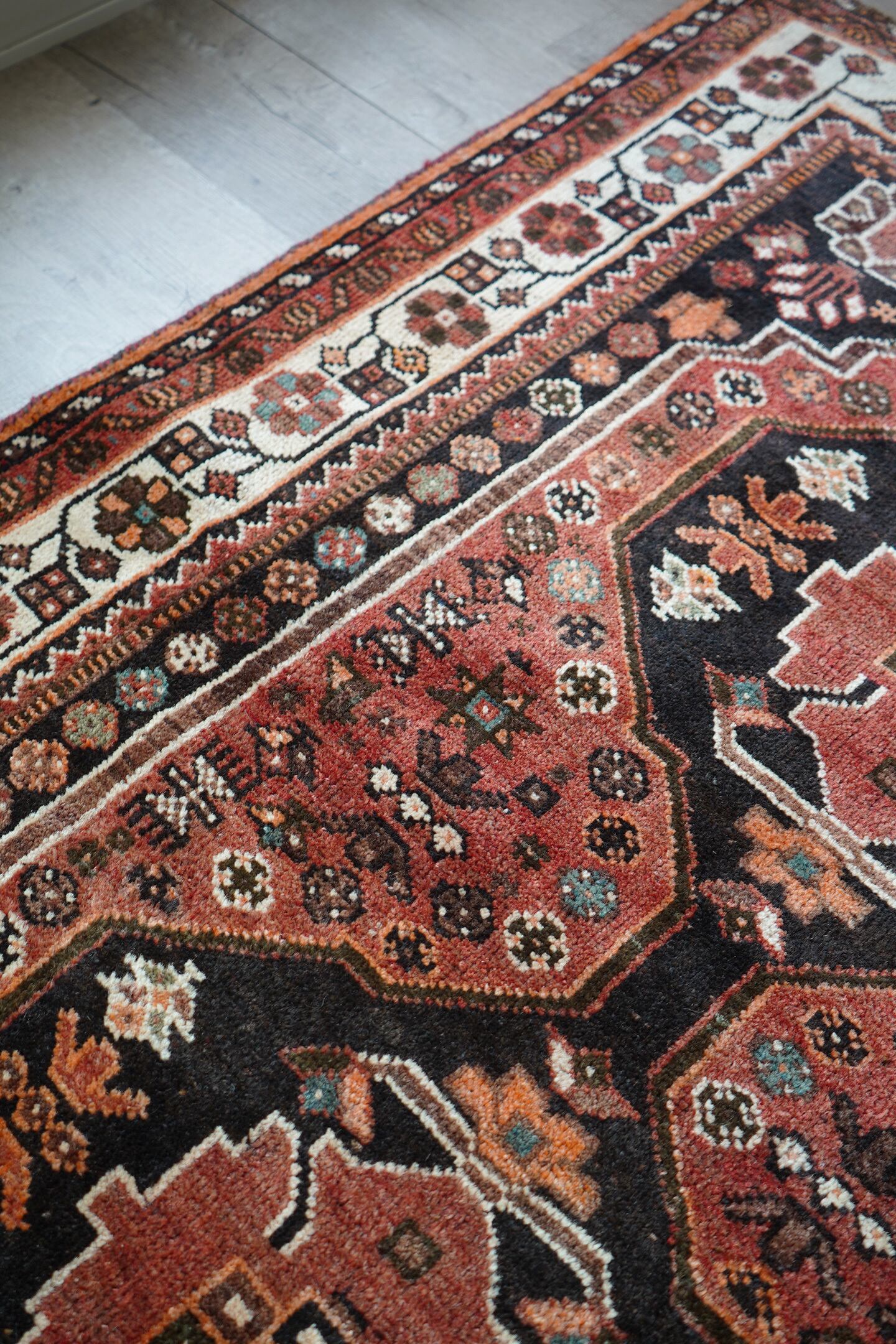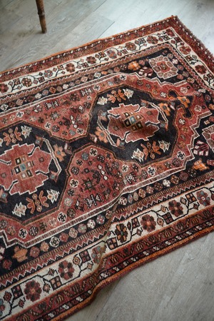 珍しいタイプのメダリオンが可愛らしい経年約50年のカシュガイラグ。全体的に赤のように見える色味は、くすんだ赤茶色のような柔らかい雰囲気の優しい色味をしています。差し色で使われたエメラルドグリーンが素敵で、本当に素晴らしい配色にうっとりしてしまうほど。メダリオンの周りには花紋様をはじめとした、可愛いフォルムの紋様が織り込まれています。表面はふわっと滑らかで優しい肌触り、8mm程度の程よい厚みです。補修跡もなく、コンディションも大変良好。寝室やリビングなどにどうぞ♫