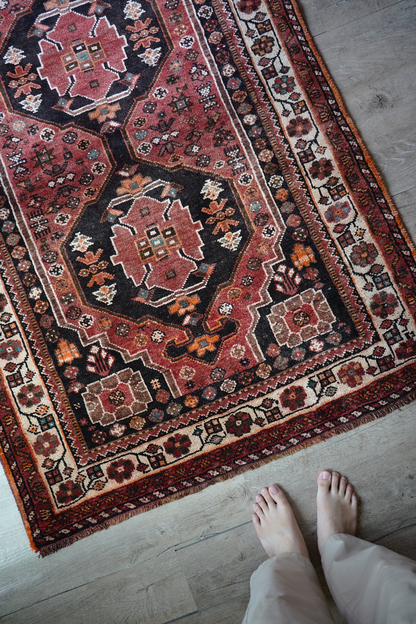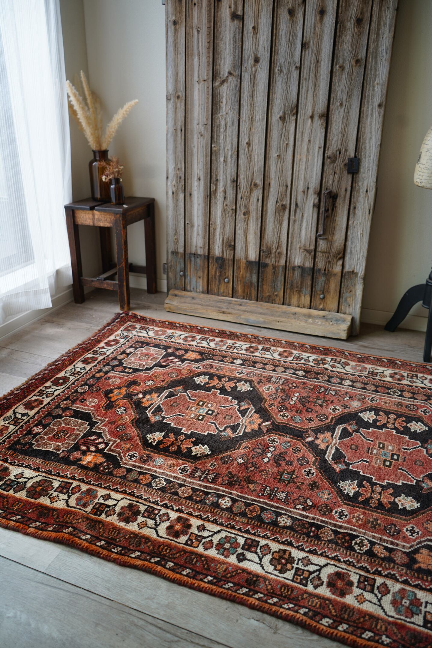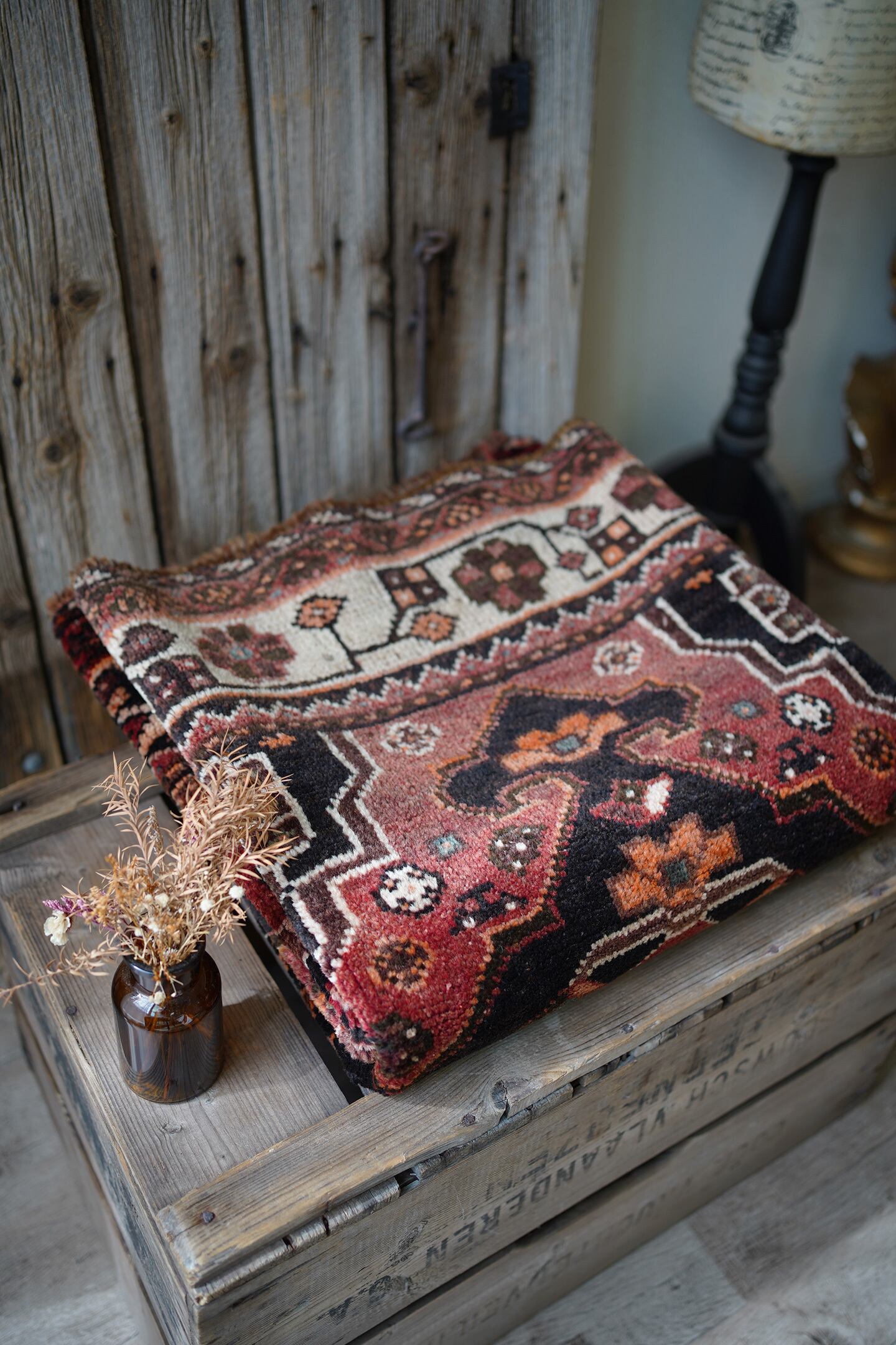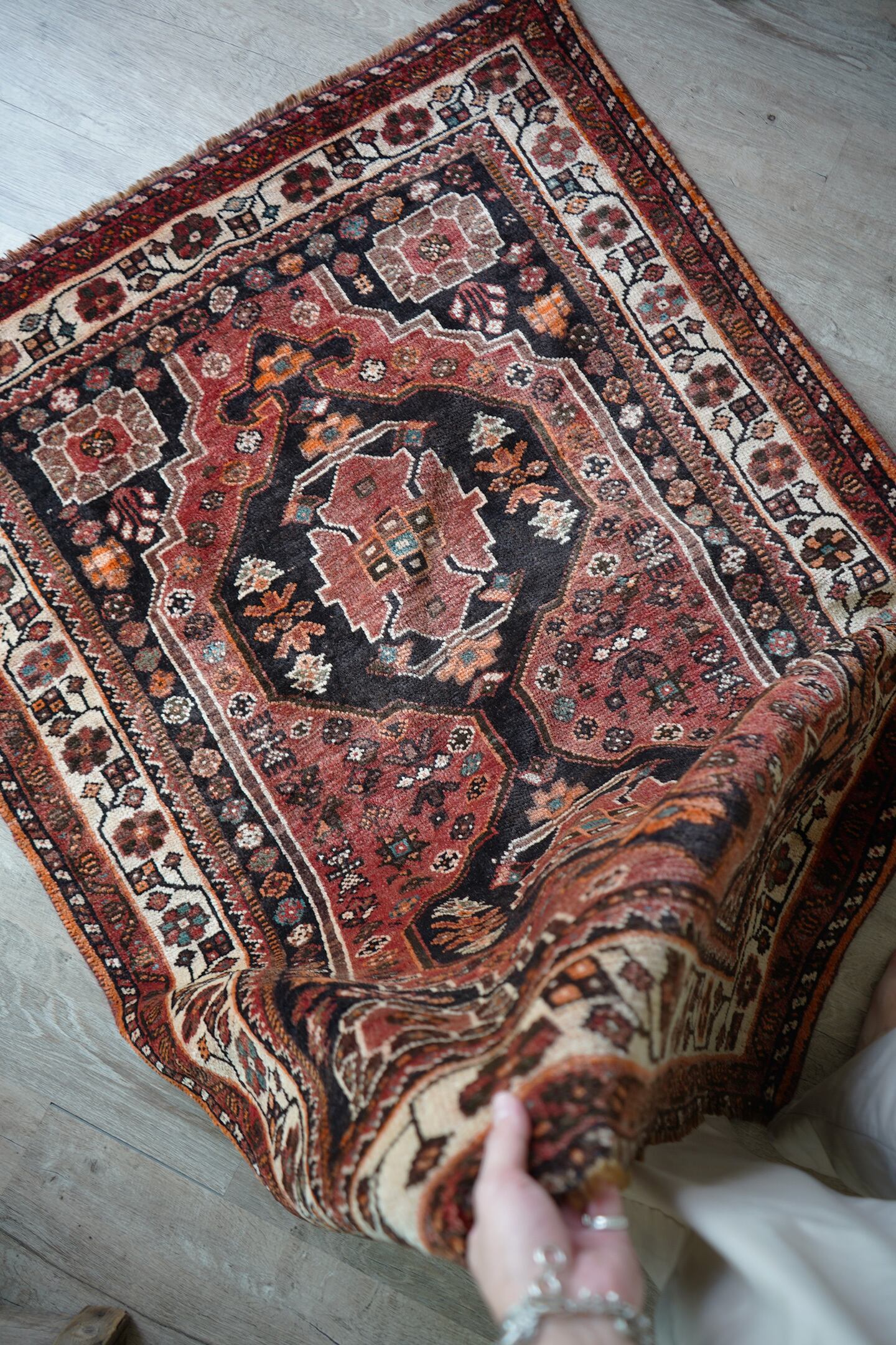 珍しいタイプのメダリオンが可愛らしい経年約50年のカシュガイラグ。全体的に赤のように見える色味は、くすんだ赤茶色のような柔らかい雰囲気の優しい色味をしています。差し色で使われたエメラルドグリーンが素敵で、本当に素晴らしい配色にうっとりしてしまうほど。メダリオンの周りには花紋様をはじめとした、可愛いフォルムの紋様が織り込まれています。表面はふわっと滑らかで優しい肌触り、8mm程度の程よい厚みです。補修跡もなく、コンディションも大変良好。寝室やリビングなどにどうぞ♫