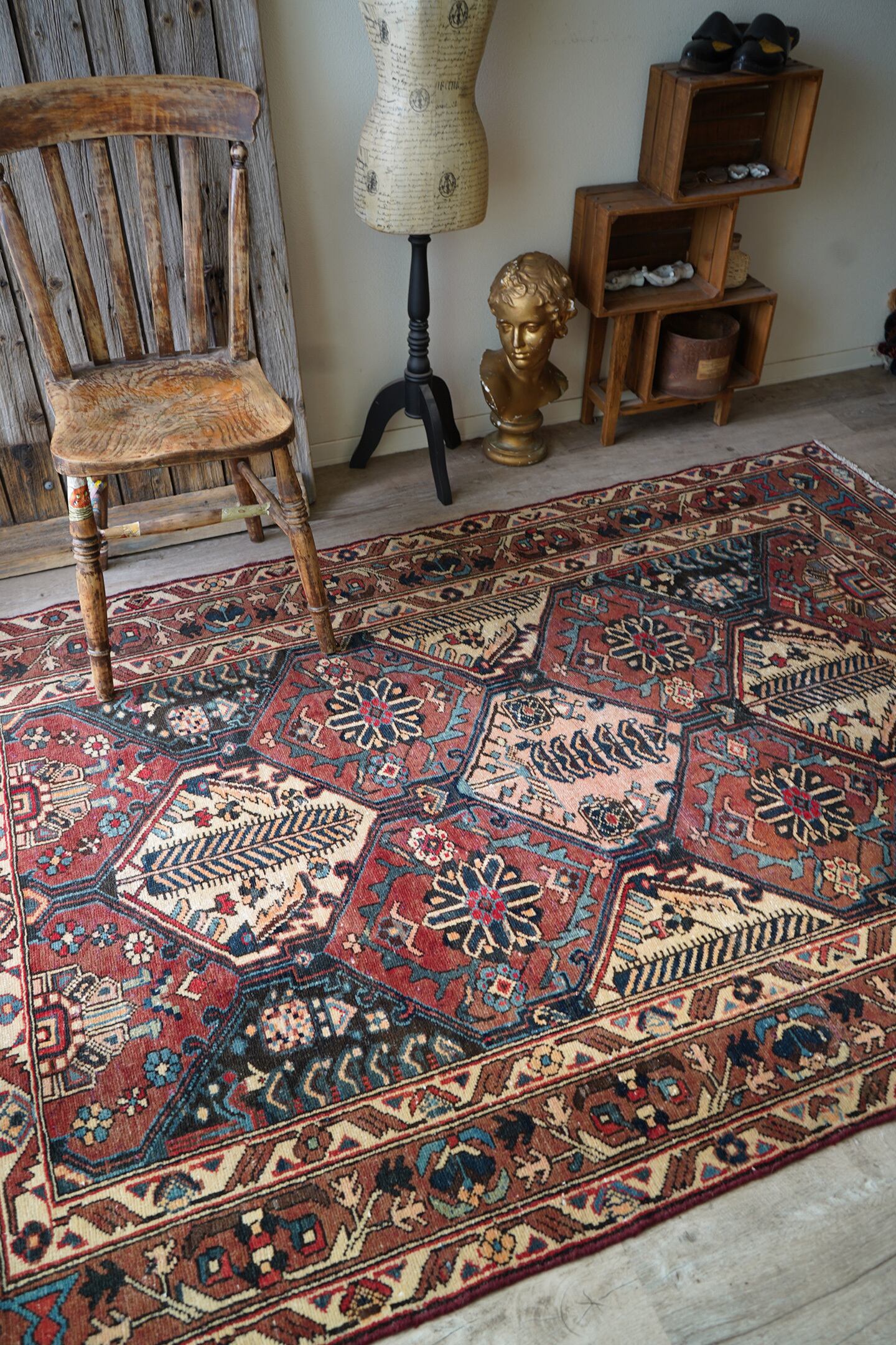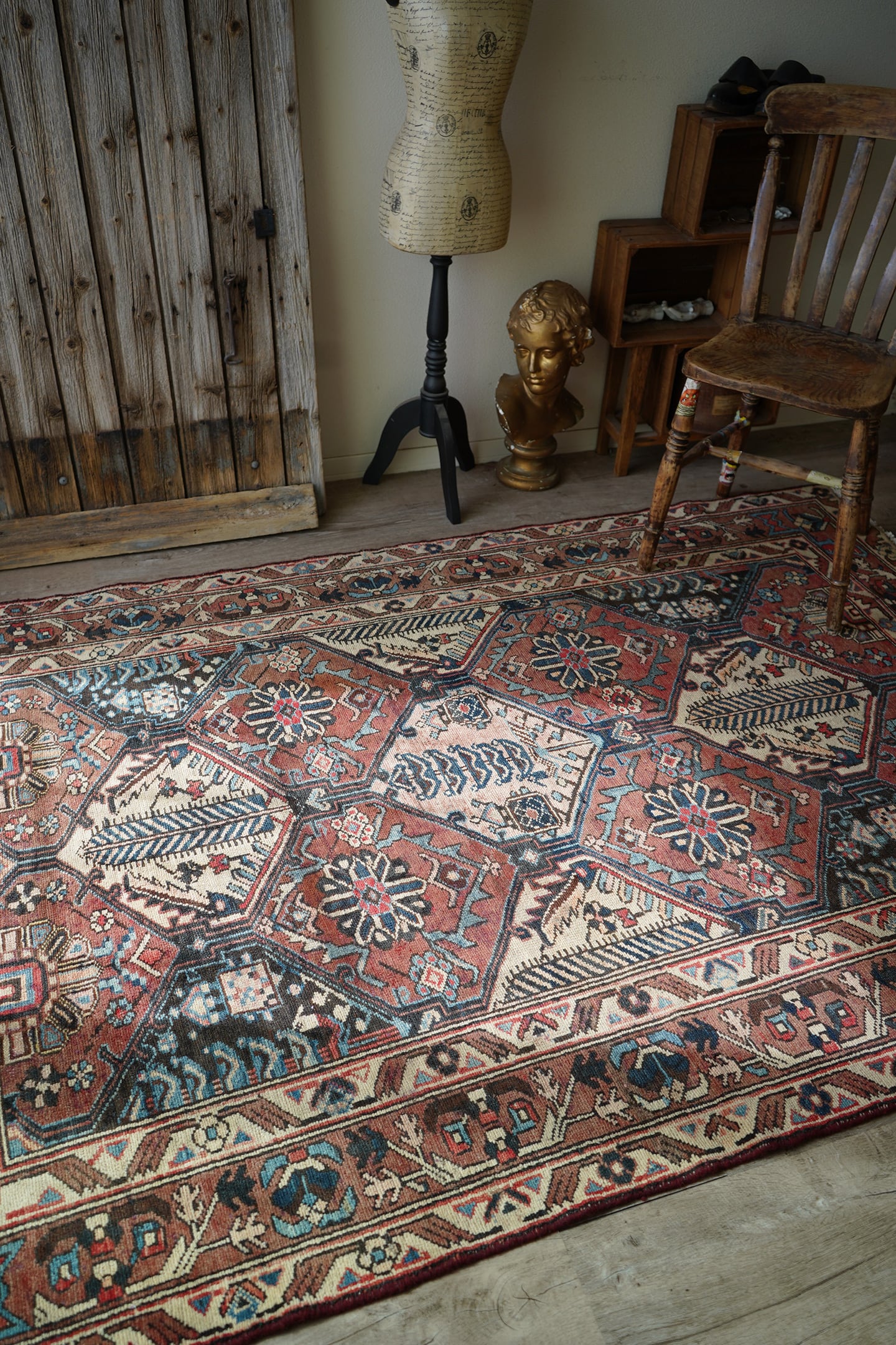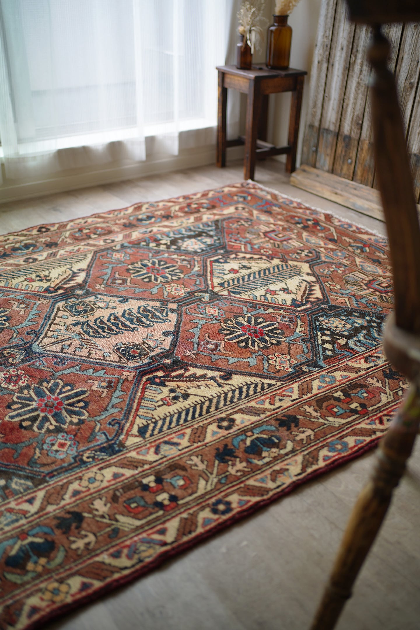 イラン西部、ザクロス山脈周辺の高原地域に住むバクティアリ族によって織られたラグです。糸杉や花の模様が織り込まれたバクティアリ族の伝統柄デザイン。ブラウン・ベージュ・淡いピンク・ブルーグリーンなどのカラーリングで、毛並みの性質上、見る角度や方向によって色味が濃く見えたり薄く見えたりしますので、お好みの色合いの向きで敷いていただければと思います(画像最後の2枚をご参照ください)。厚みは6mm〜7mm程度、全体的にパイルが低めになっており、表面はサラッとさっぱりとした肌触りをしています。目立った補修跡もなく、状態良好です。大きめのサイズ感のため、ダイニングテーブルの下にオススメな一枚♫