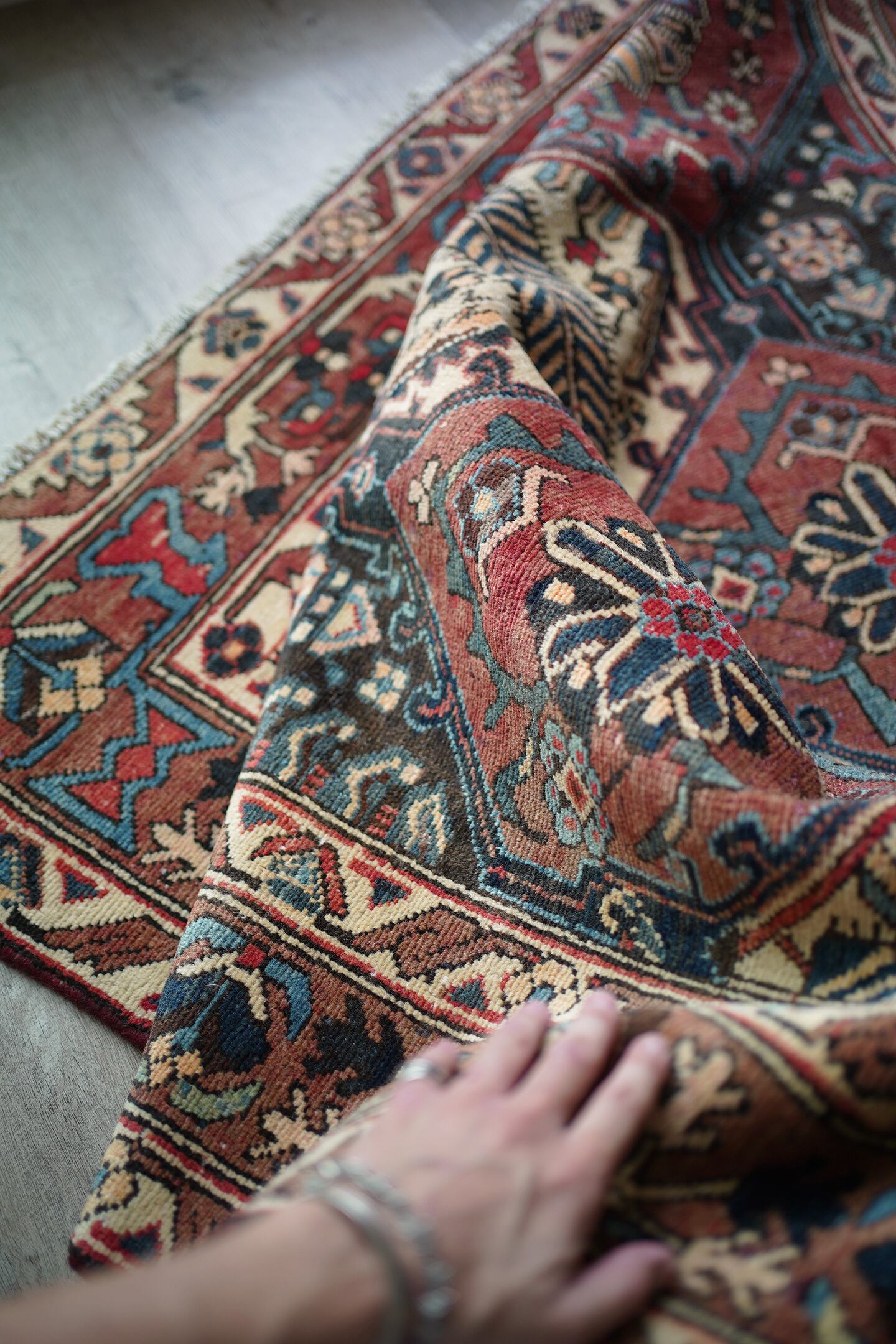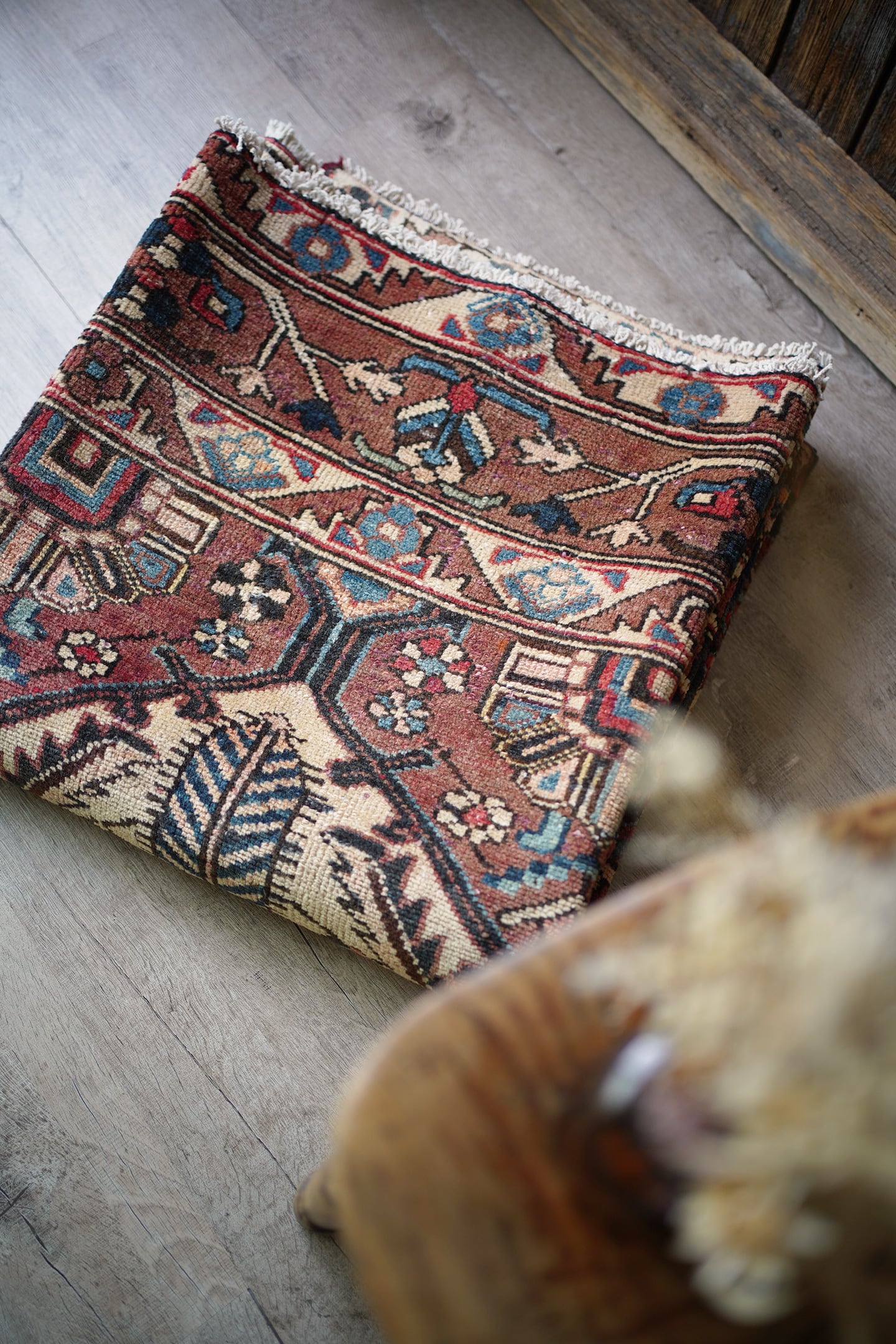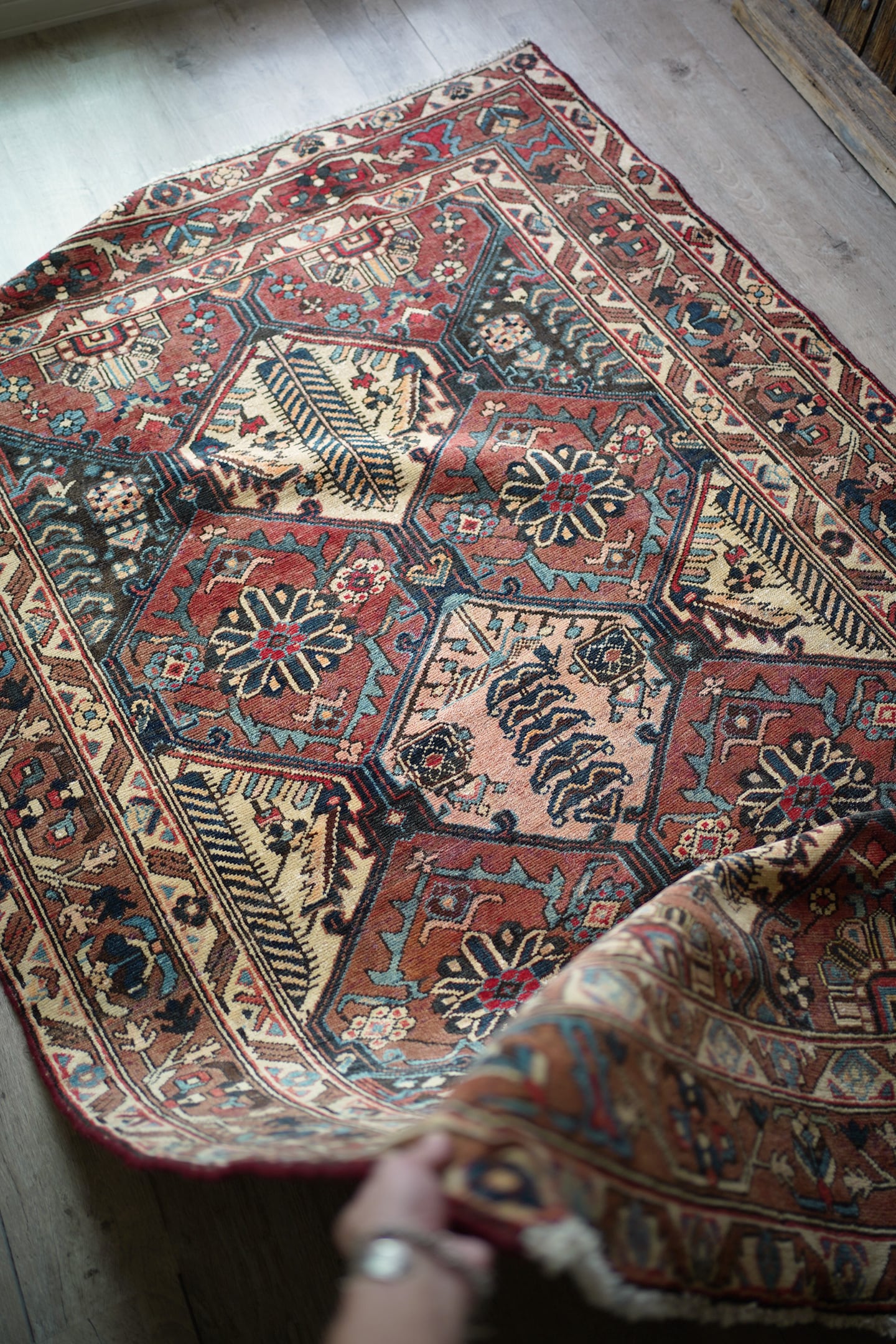 イラン西部、ザクロス山脈周辺の高原地域に住むバクティアリ族によって織られたラグです。糸杉や花の模様が織り込まれたバクティアリ族の伝統柄デザイン。ブラウン・ベージュ・淡いピンク・ブルーグリーンなどのカラーリングで、毛並みの性質上、見る角度や方向によって色味が濃く見えたり薄く見えたりしますので、お好みの色合いの向きで敷いていただければと思います(画像最後の2枚をご参照ください)。厚みは6mm〜7mm程度、全体的にパイルが低めになっており、表面はサラッとさっぱりとした肌触りをしています。目立った補修跡もなく、状態良好です。大きめのサイズ感のため、ダイニングテーブルの下にオススメな一枚♫